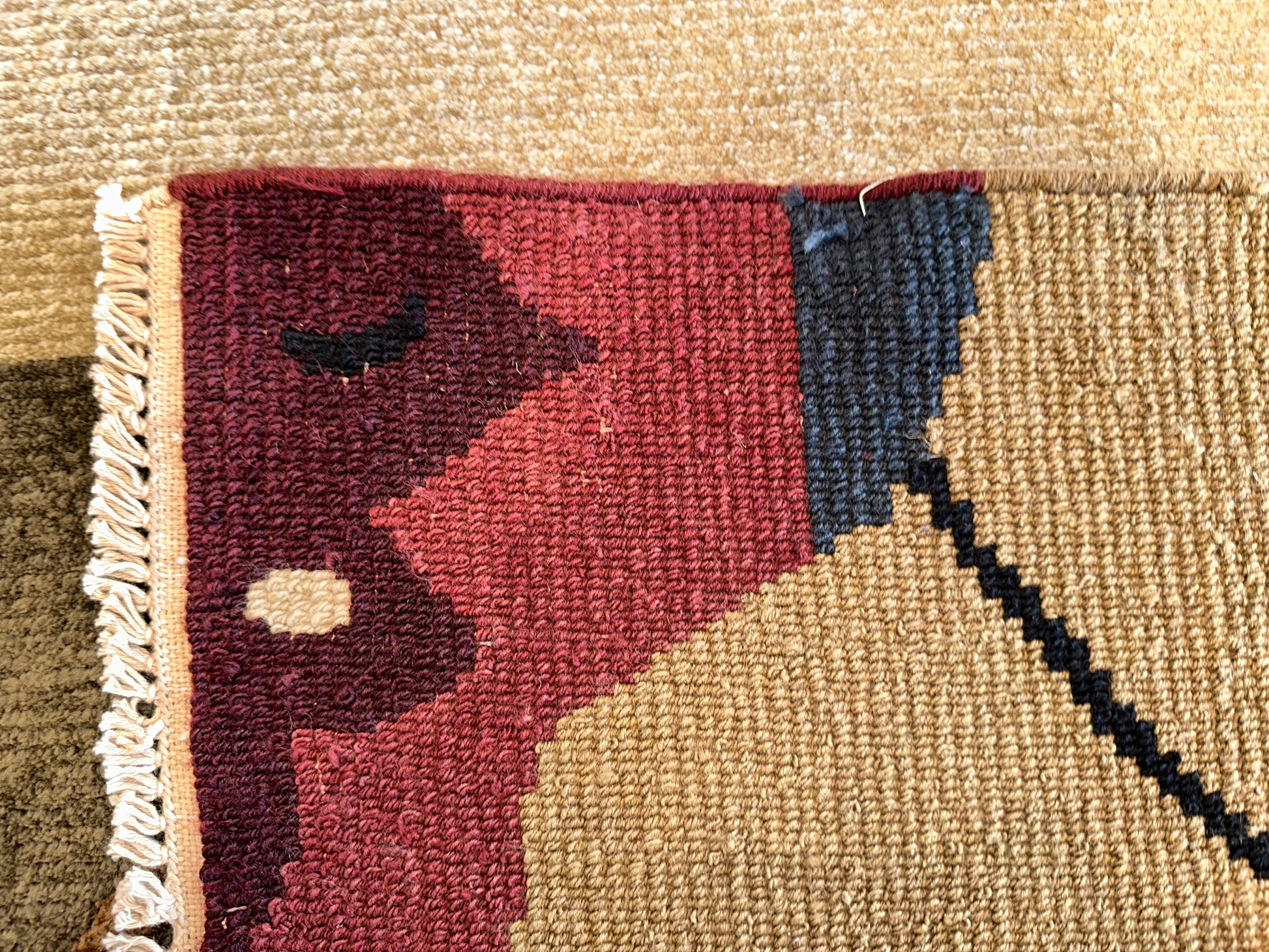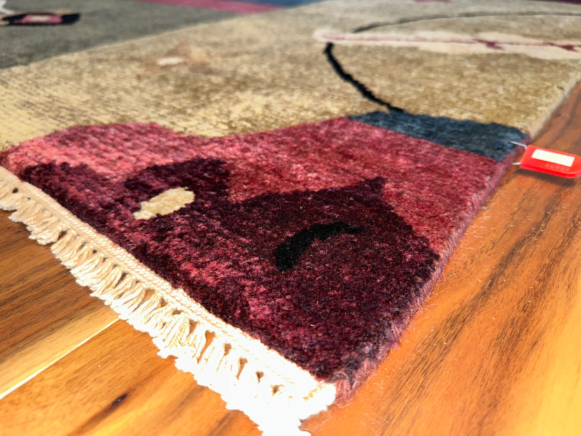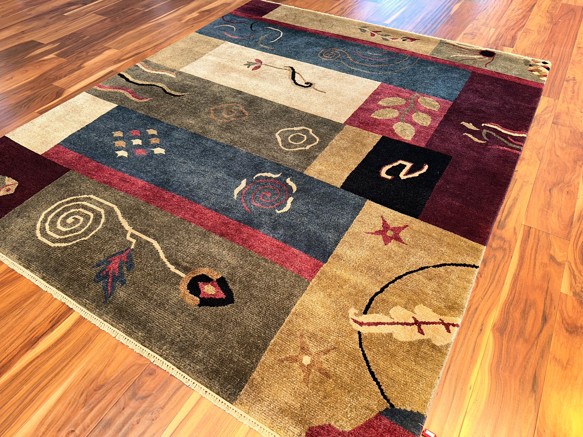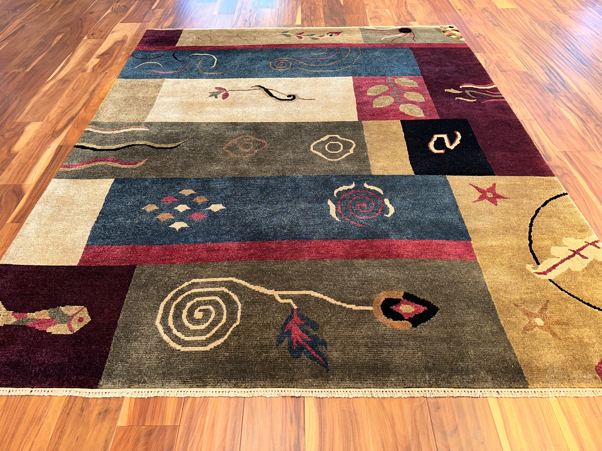 A tapestry of organic movement and earthy tones, this handwoven rug presents a collage of symbolic motifs across softly textured horizontal bands. From spirals to florals, fish to leaf shapes, each element feels drawn from nature or storybook dreams, unfolding across a palette of olive, navy, ivory, and warm rust. The asymmetrical layout brings a free-spirited rhythm, perfect for those who appreciate design with a touch of the whimsical.