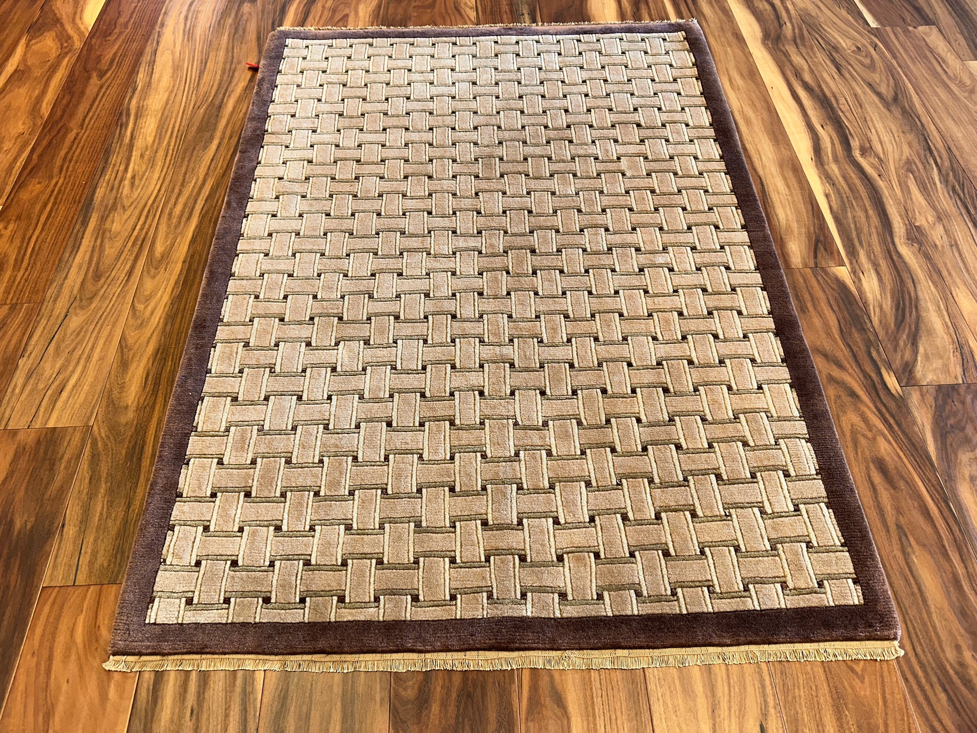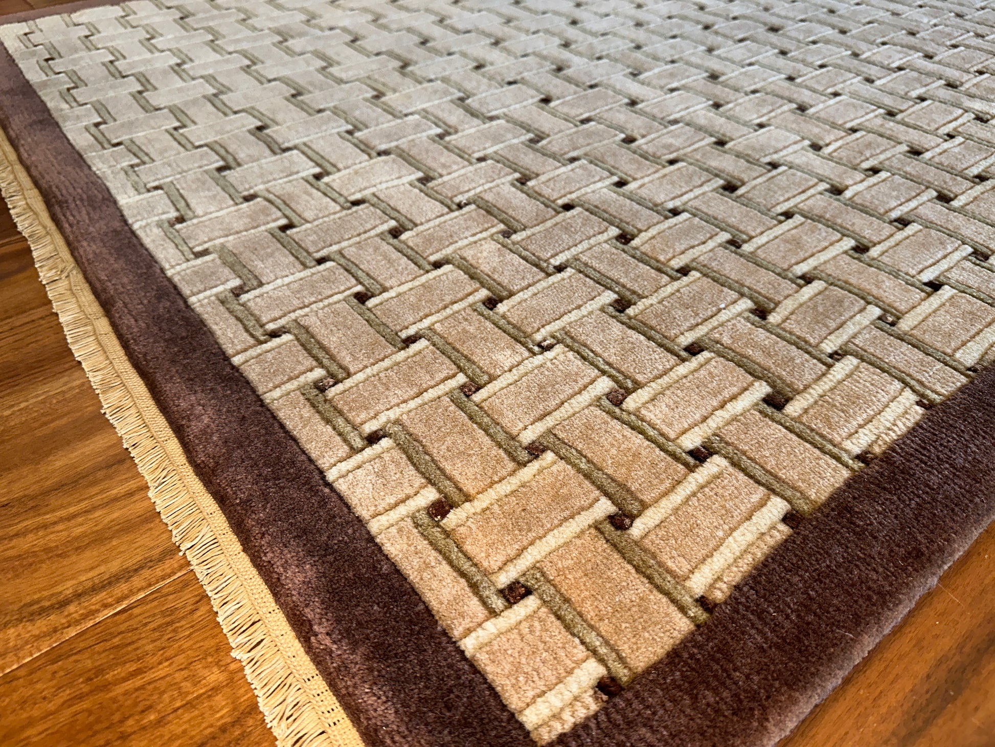 This hand-knotted rug presents a unique basketweave pattern, brought to life by soft tonal shifts in neutral beige with a bold cocoa border. The interlocking motif creates a subtle texture that adds depth and visual interest while maintaining a minimalist aesthetic. A refined yet distinctive choice for modern interiors.