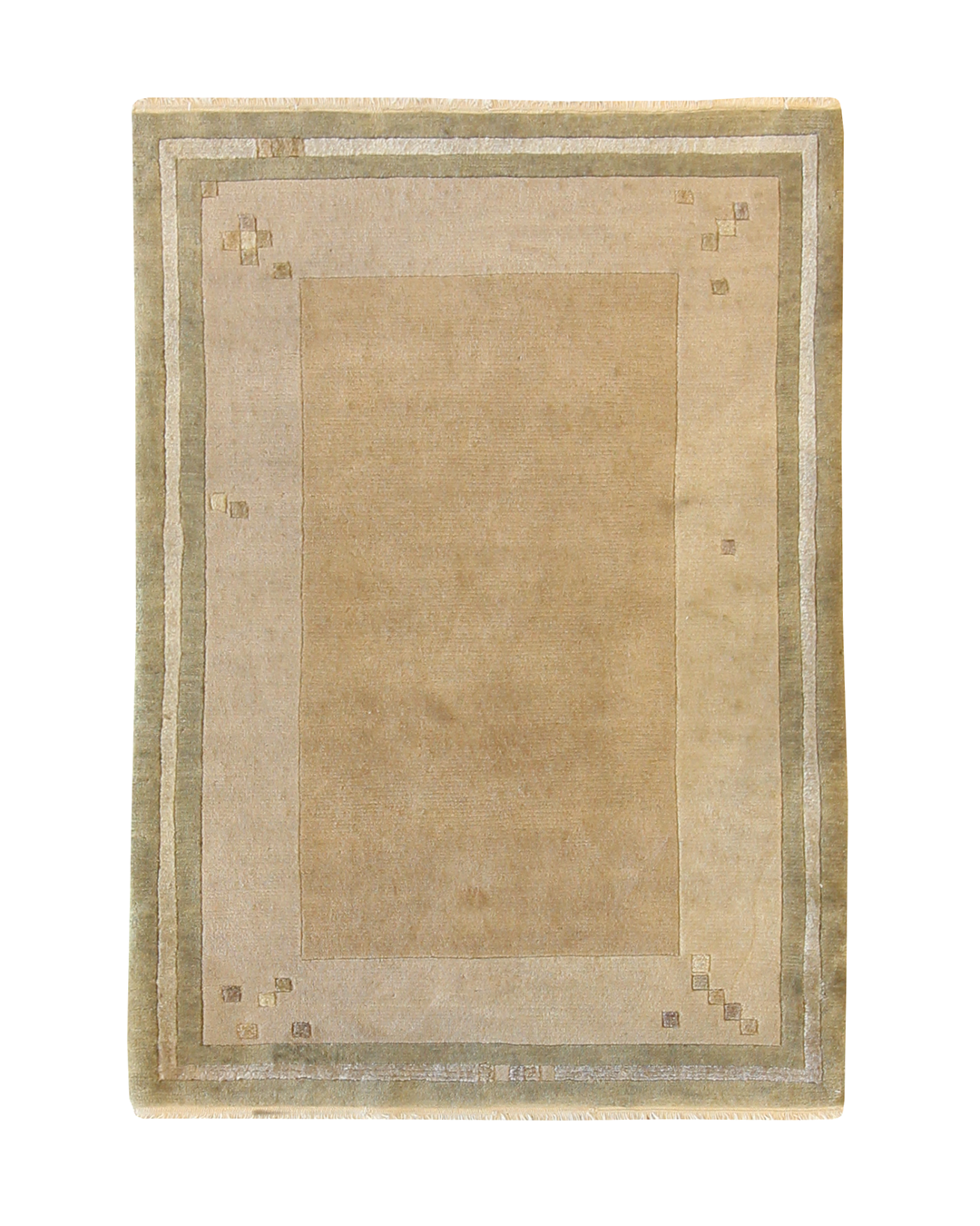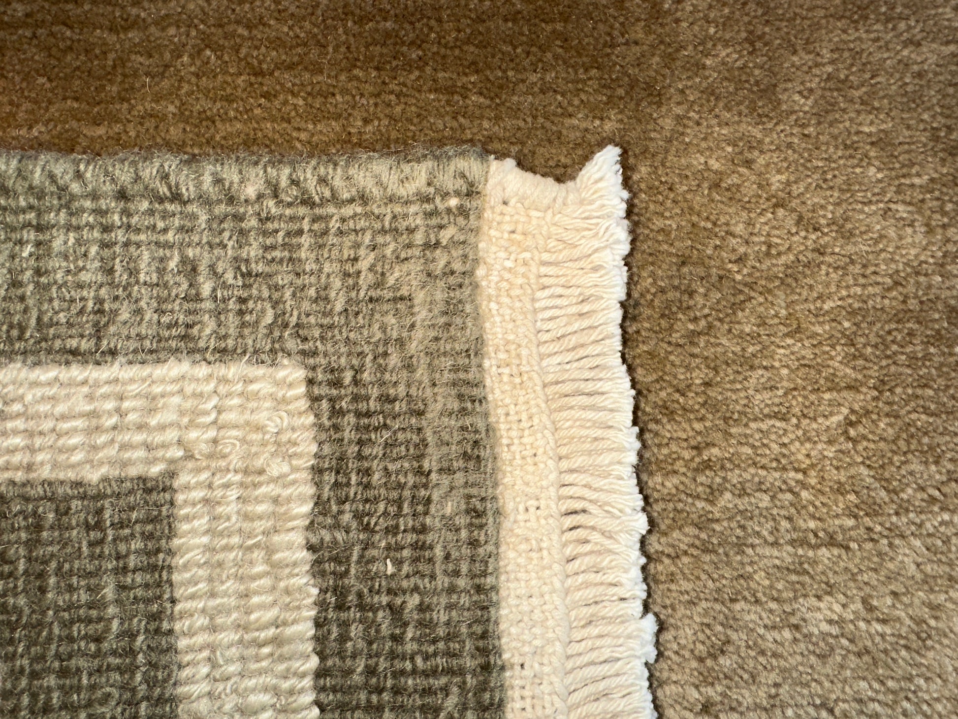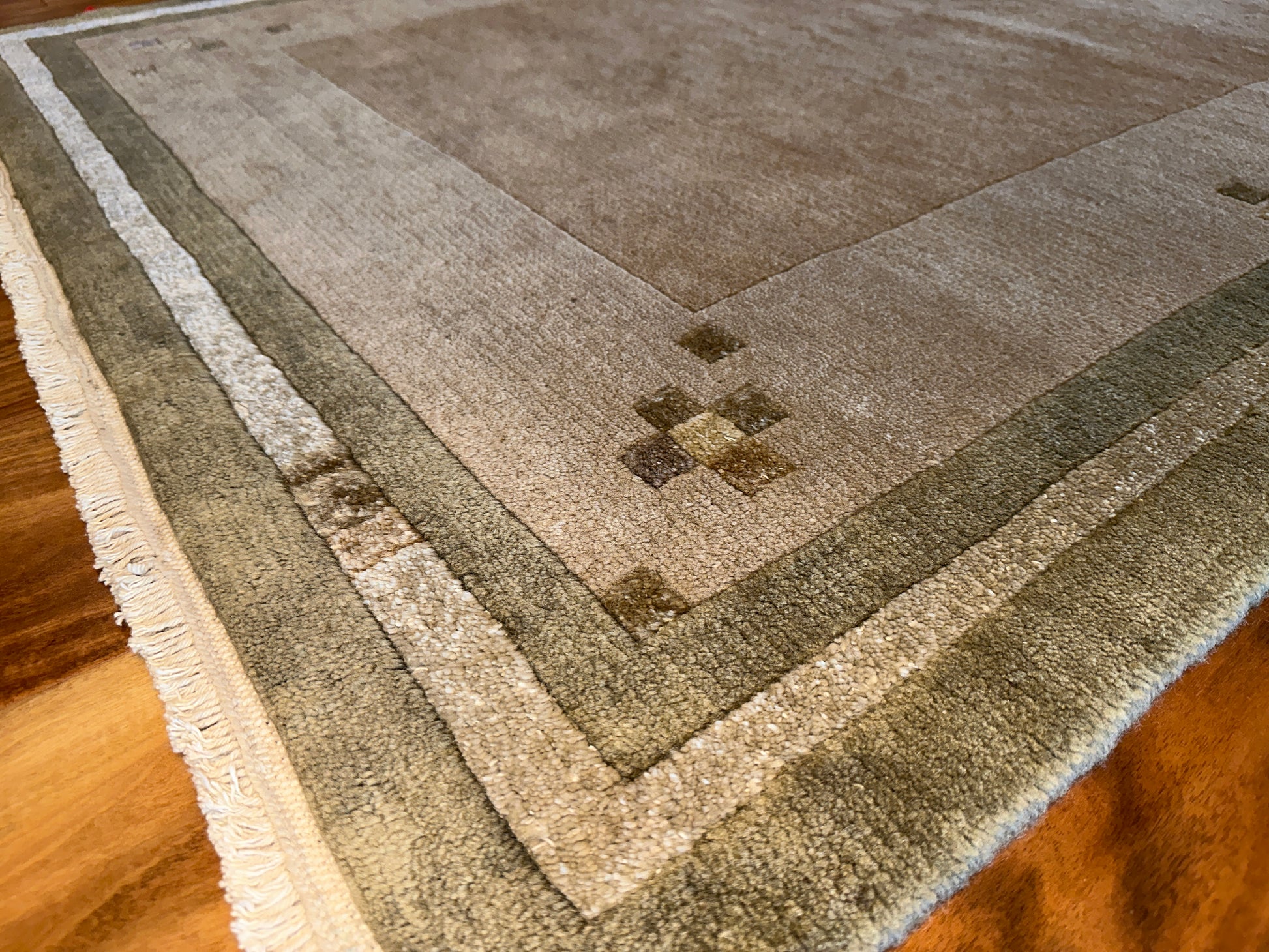 This understated handmade rug presents a minimalist border composition with a softly tonal palette of beige and pale sage. The subtle stepped corner motifs add a quiet rhythm to the design without overwhelming its tranquil simplicity. Its refined structure and calm color story make it a serene foundation for interiors that value openness and restraint, particularly well suited to bedrooms, offices, or Scandinavian-inspired living rooms.