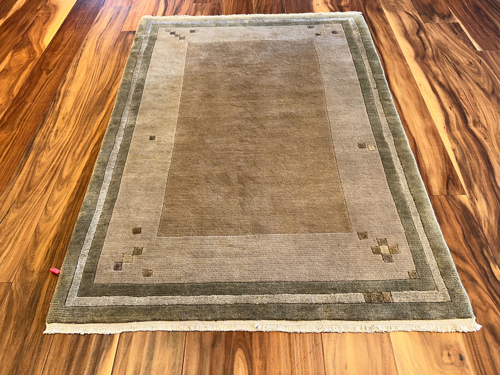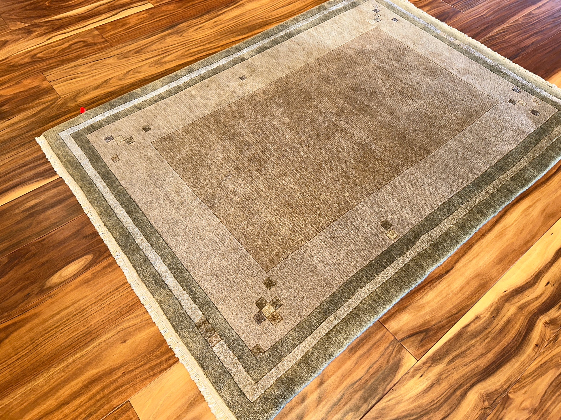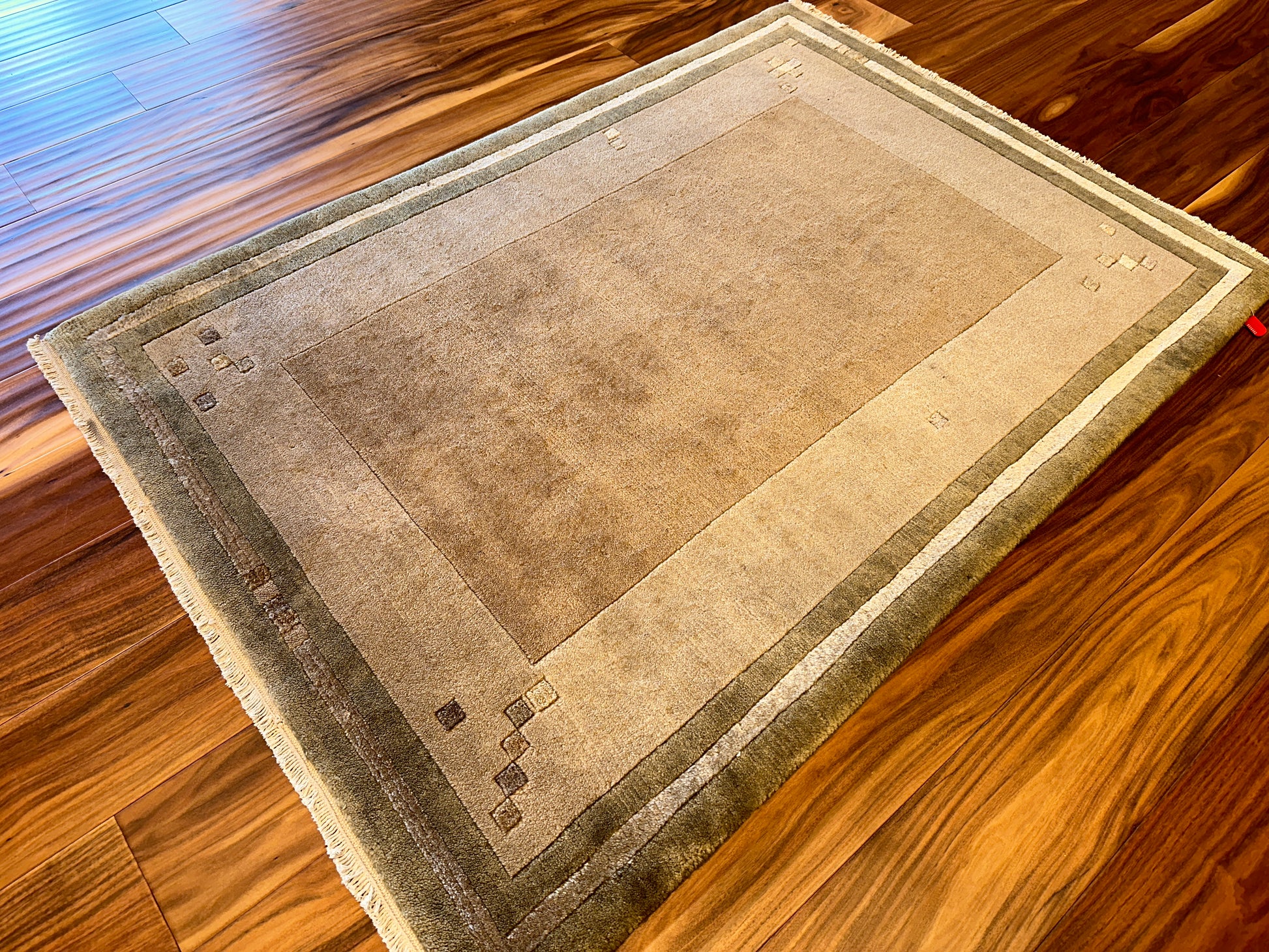 This understated handmade rug presents a minimalist border composition with a softly tonal palette of beige and pale sage. The subtle stepped corner motifs add a quiet rhythm to the design without overwhelming its tranquil simplicity. Its refined structure and calm color story make it a serene foundation for interiors that value openness and restraint, particularly well suited to bedrooms, offices, or Scandinavian-inspired living rooms.