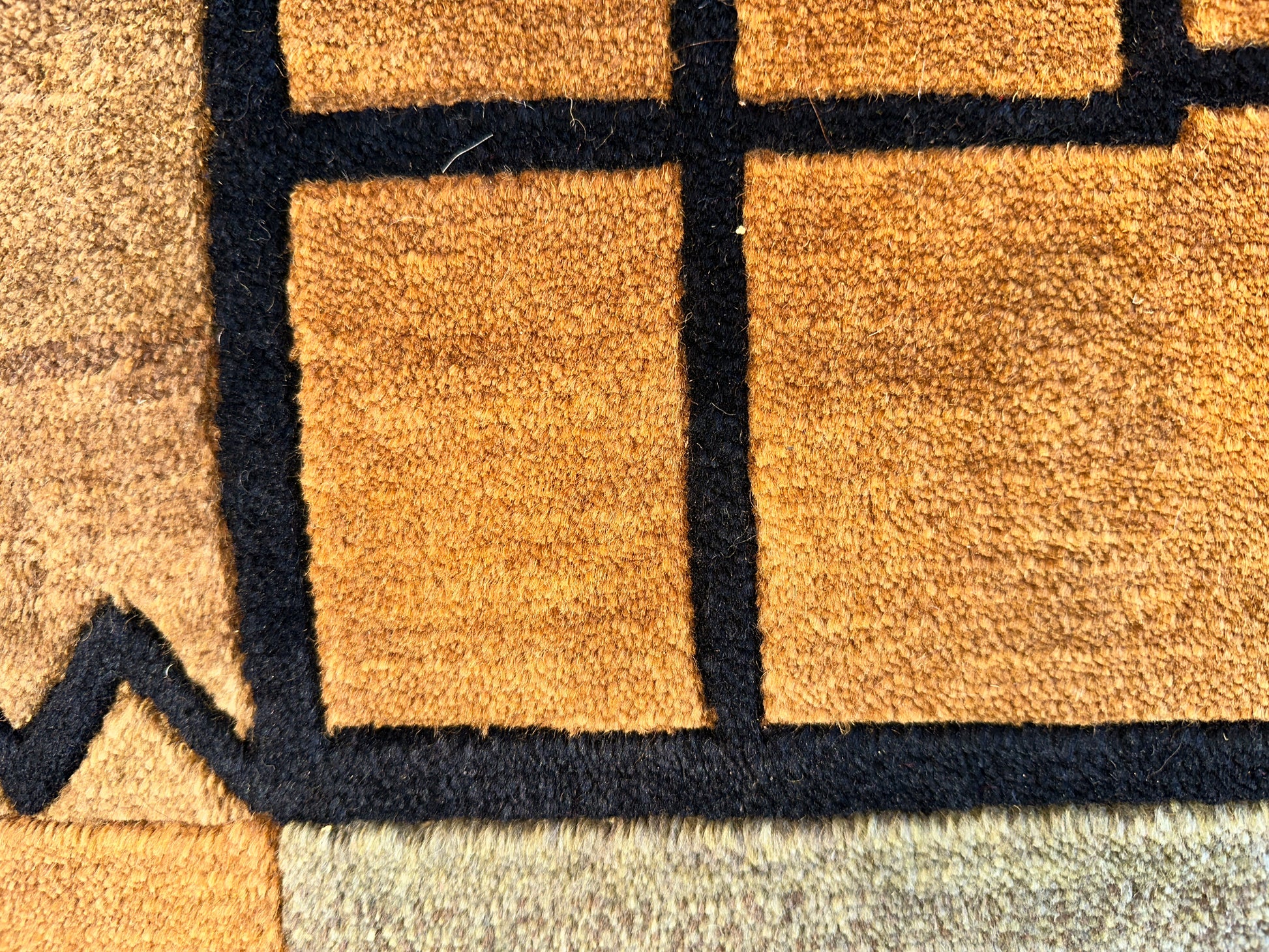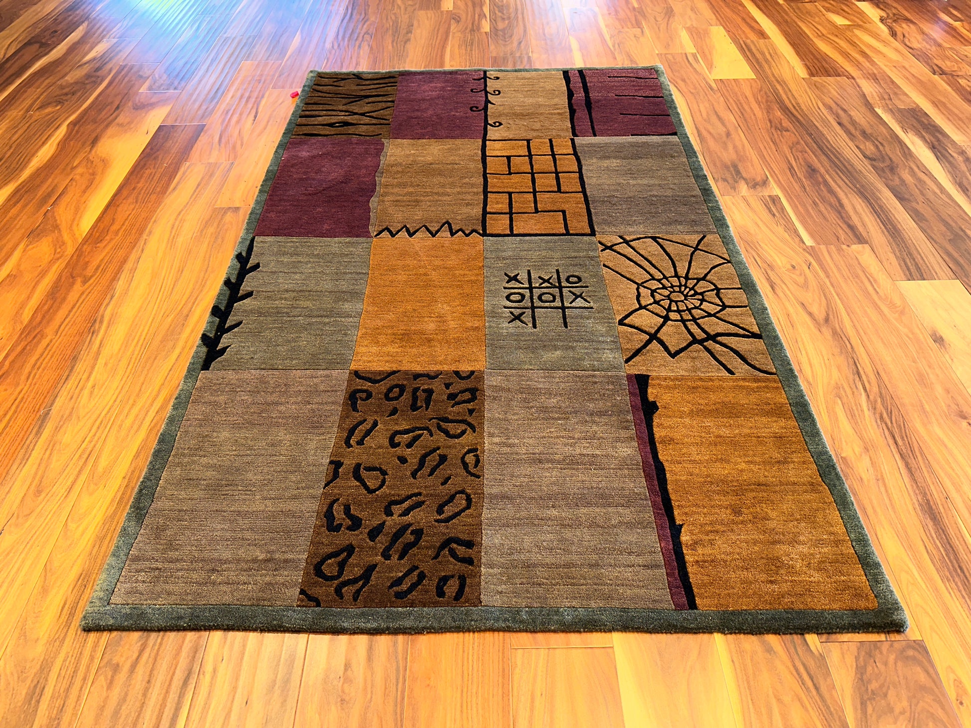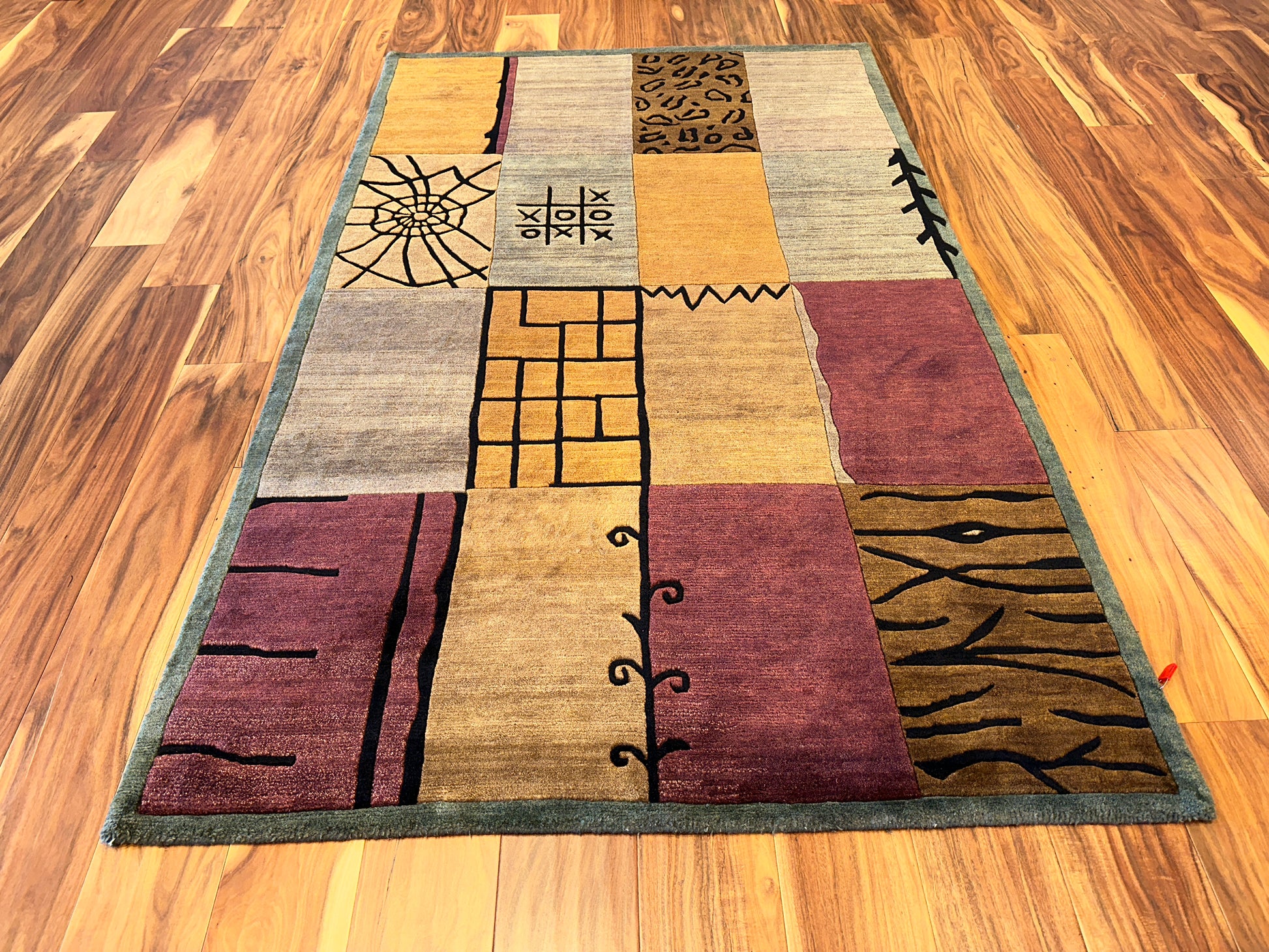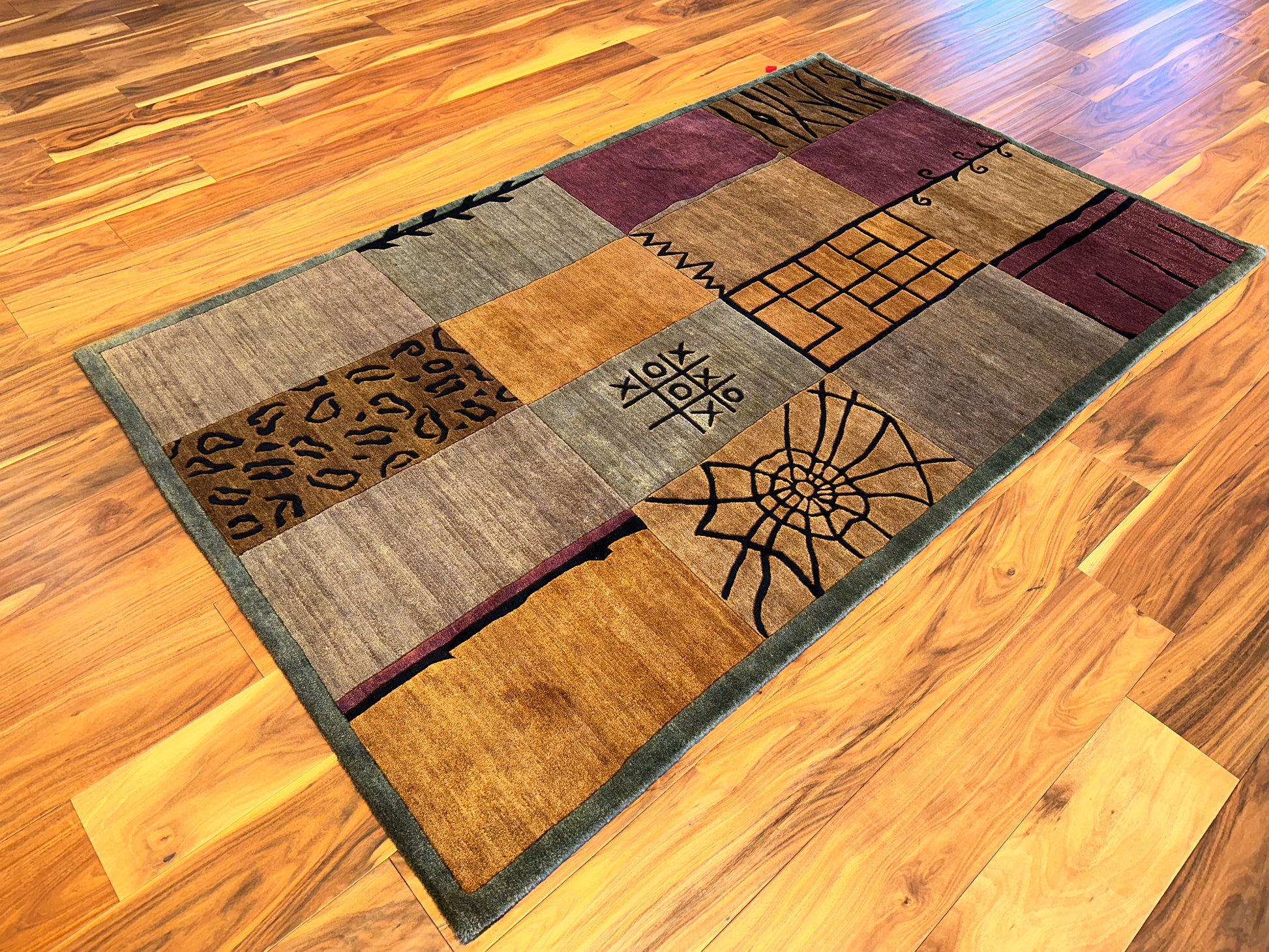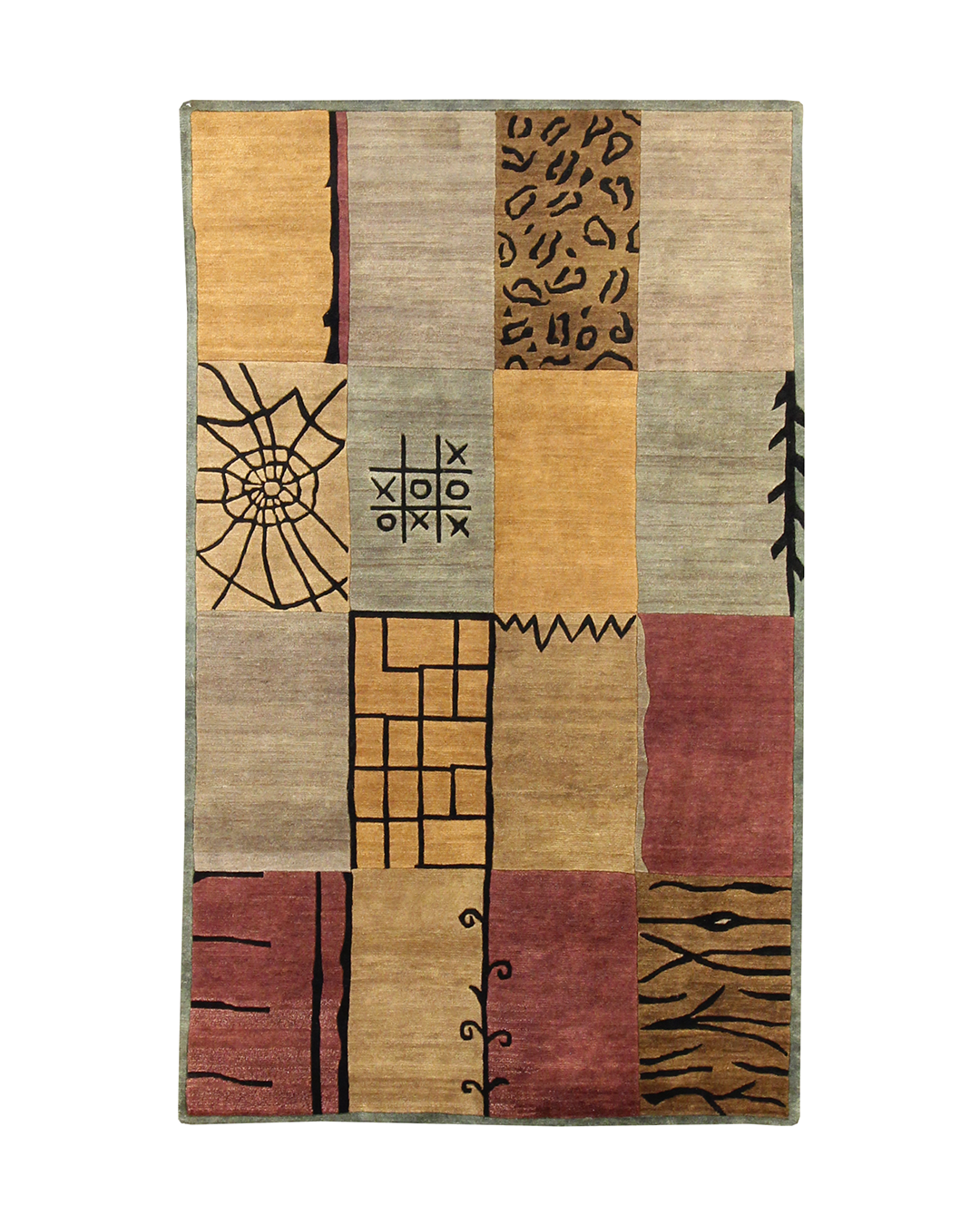 Playful and eclectic, this patchwork-inspired rug brings together a series of tribal, abstract, and nature-influenced motifs, each square telling its own story through bold black linework and earthy tones. Warm gold, rust, burgundy, and slate hues combine to create a contemporary design full of movement and personality.