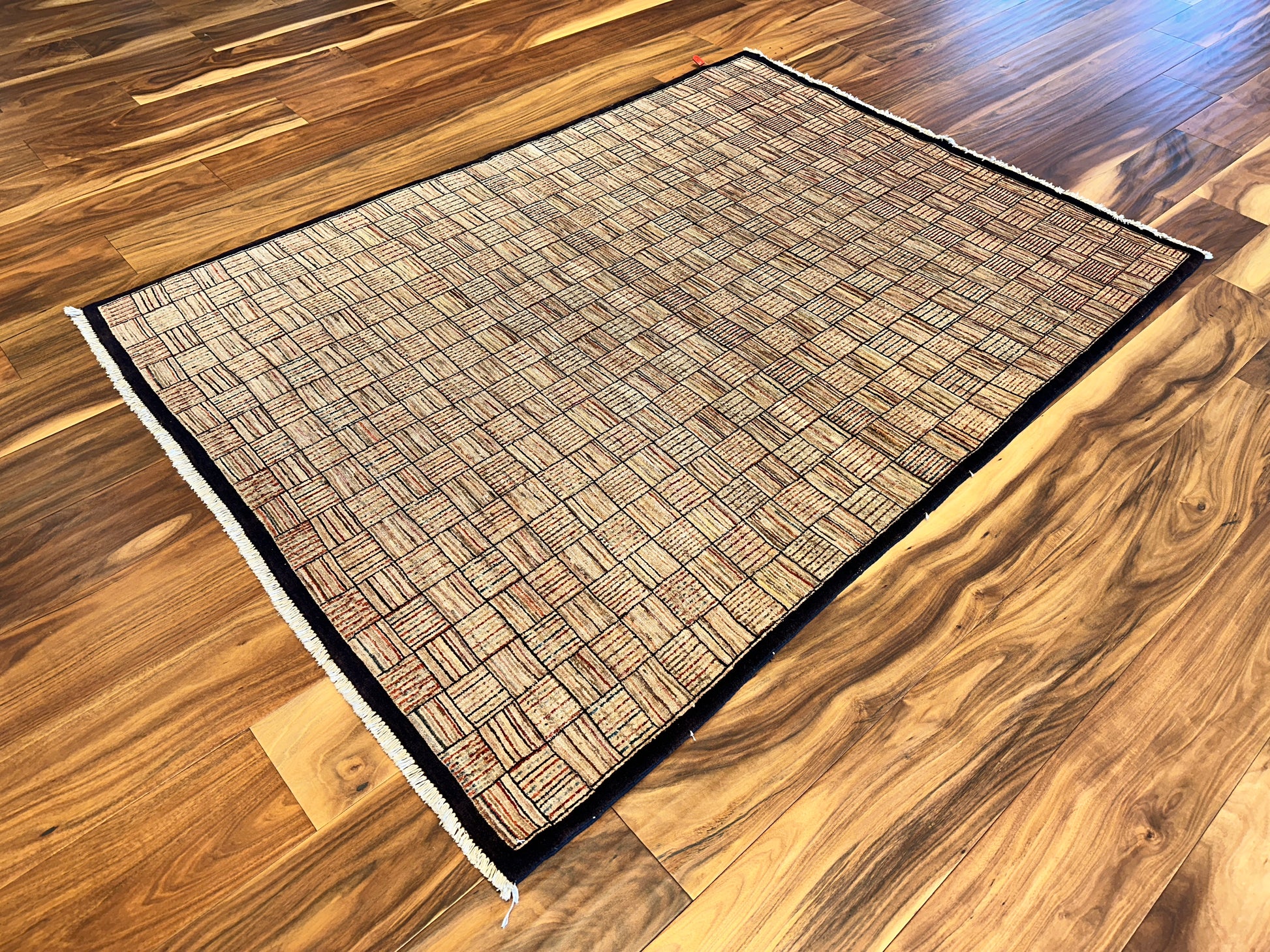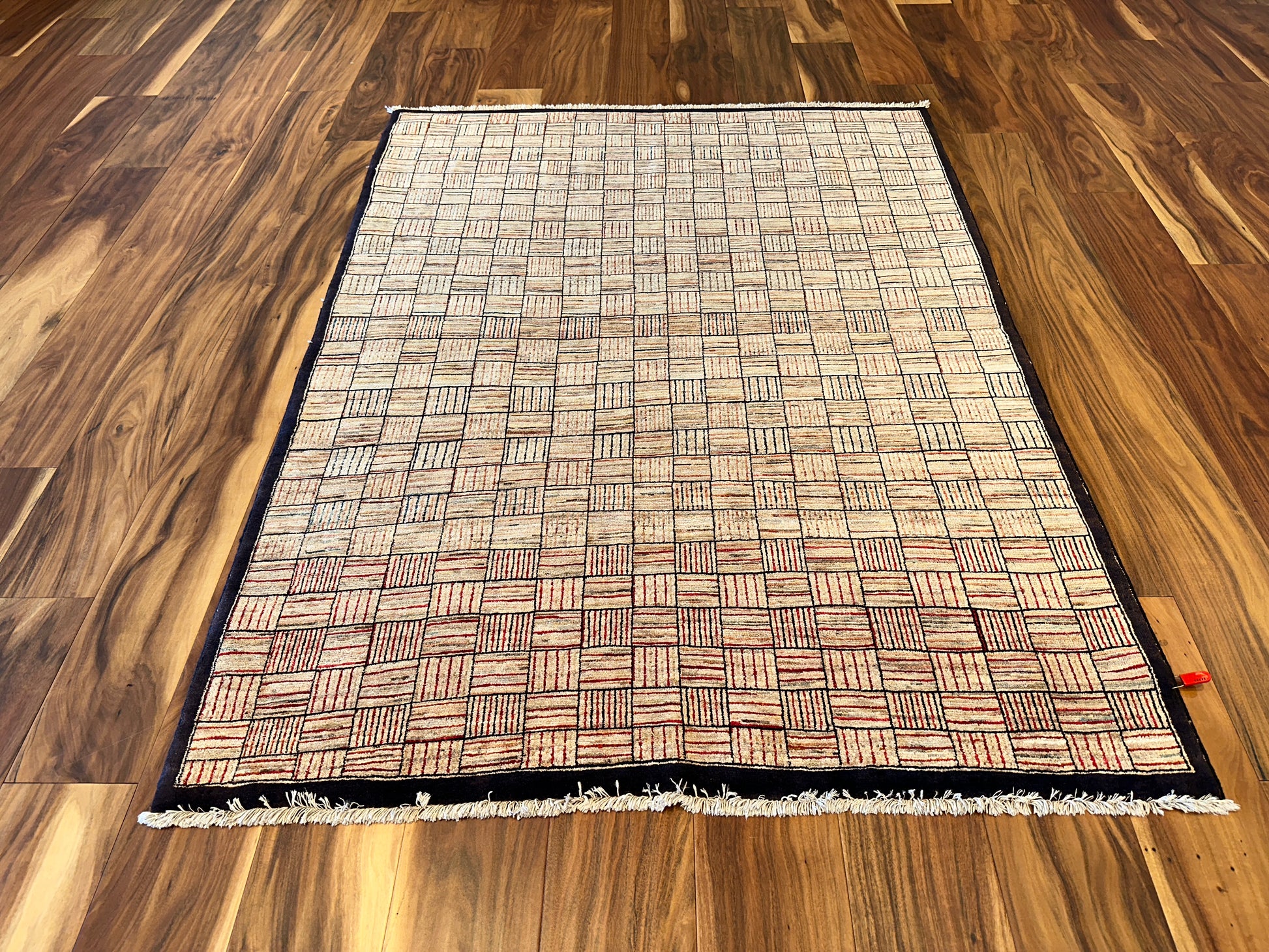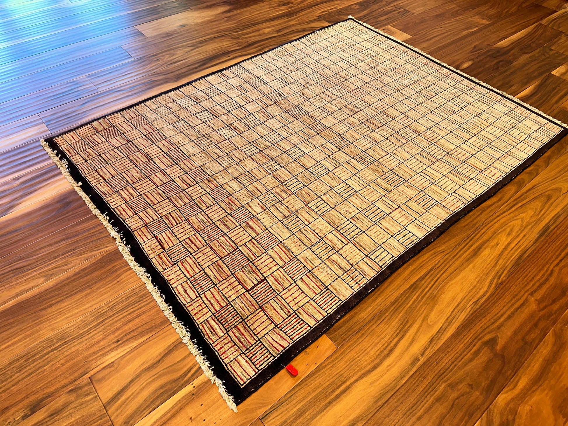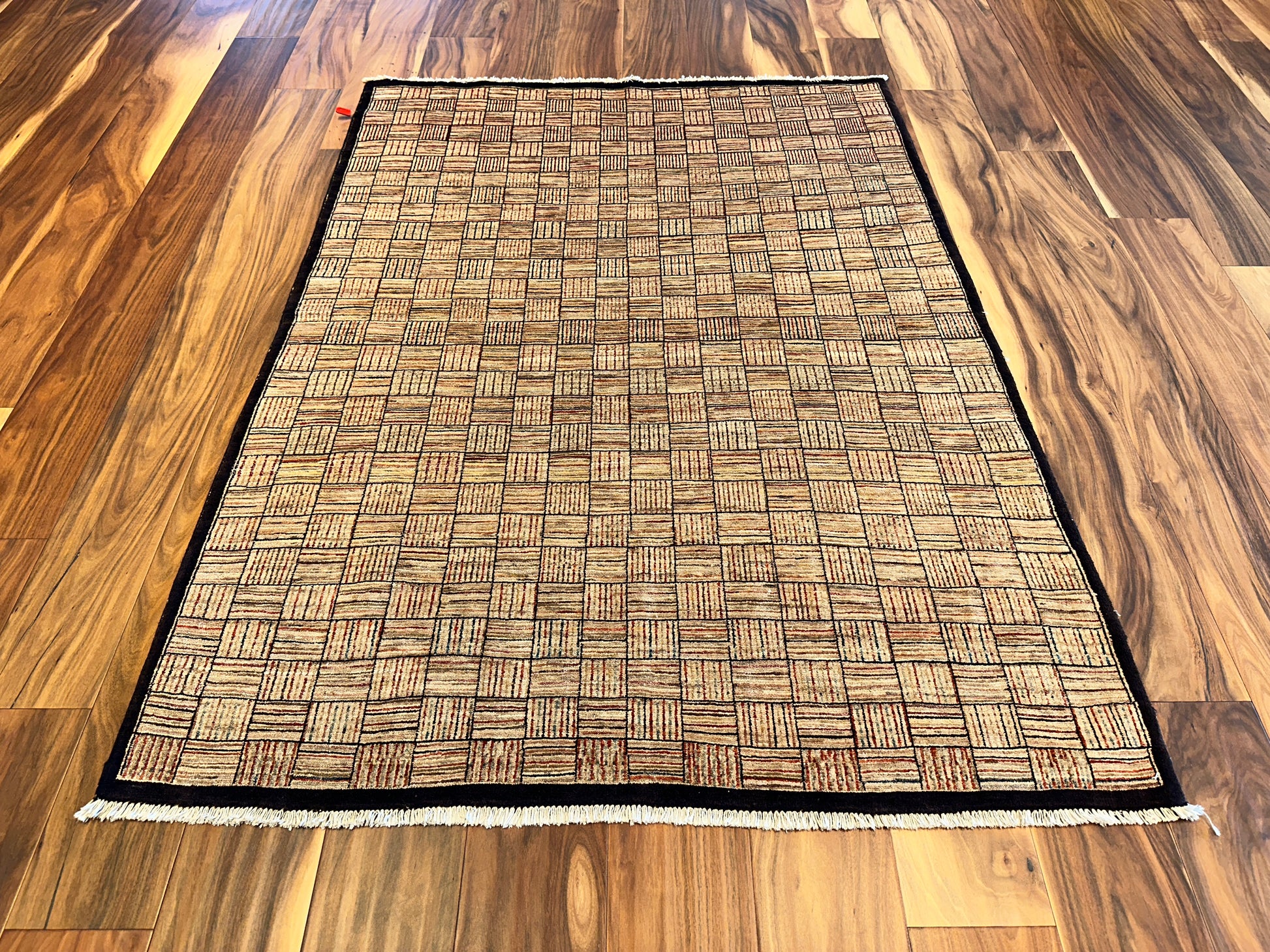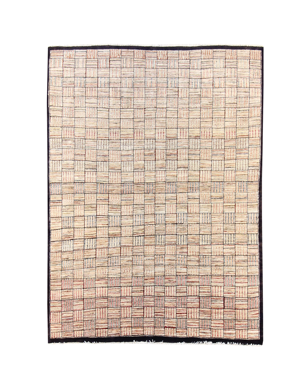 This modern rug presents a visually engaging checkered motif, composed of alternating squares filled with subtle linework that shifts in orientation. The warm beige and tan tones are delicately highlighted with muted reds and soft browns, giving the surface a hand-drawn texture and dynamic depth. A deep brown border frames the pattern with a bold yet understated edge, making it ideal for both minimalist and contemporary interiors.