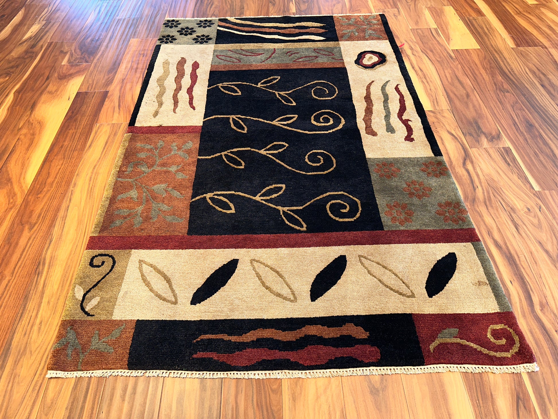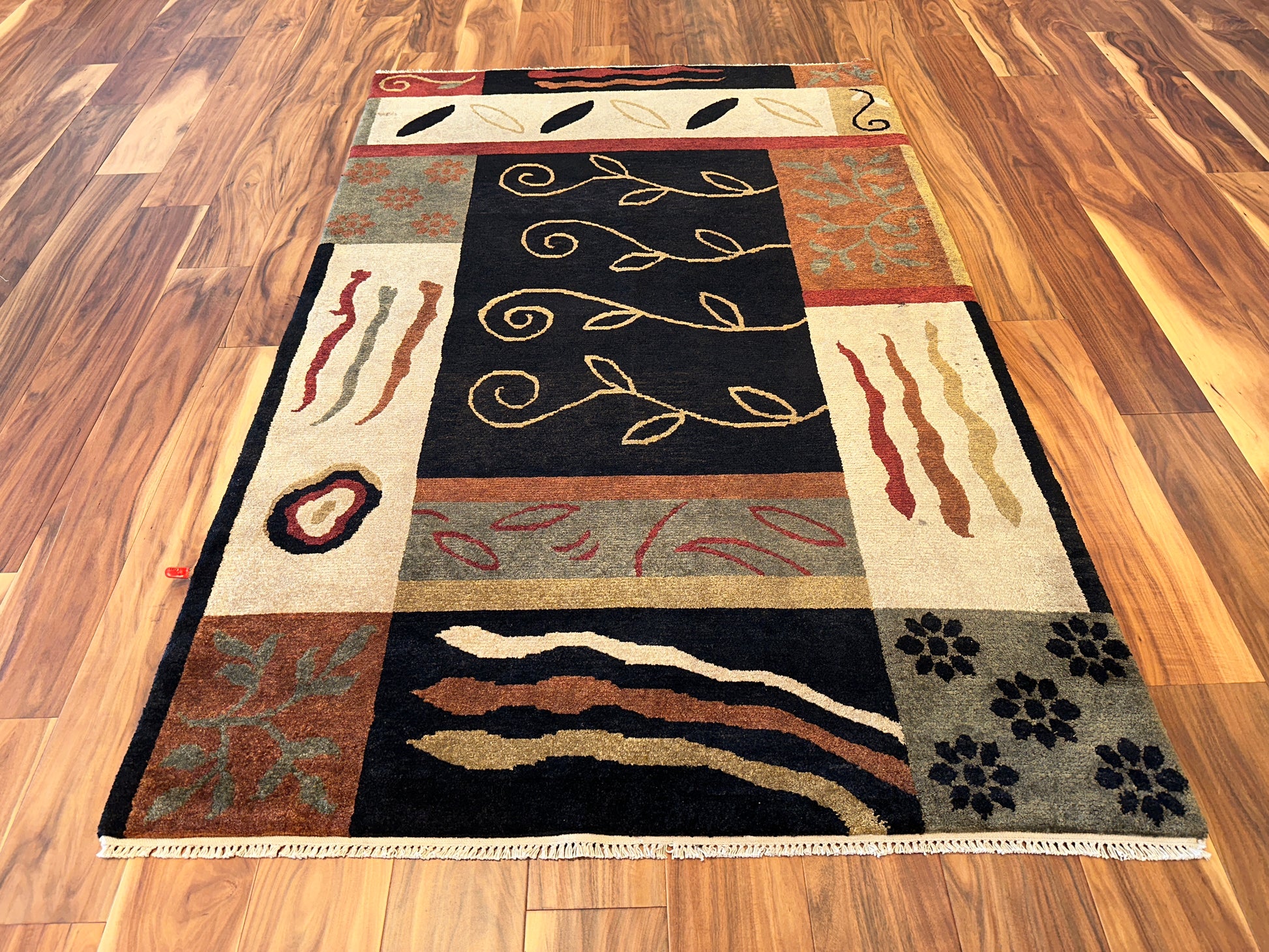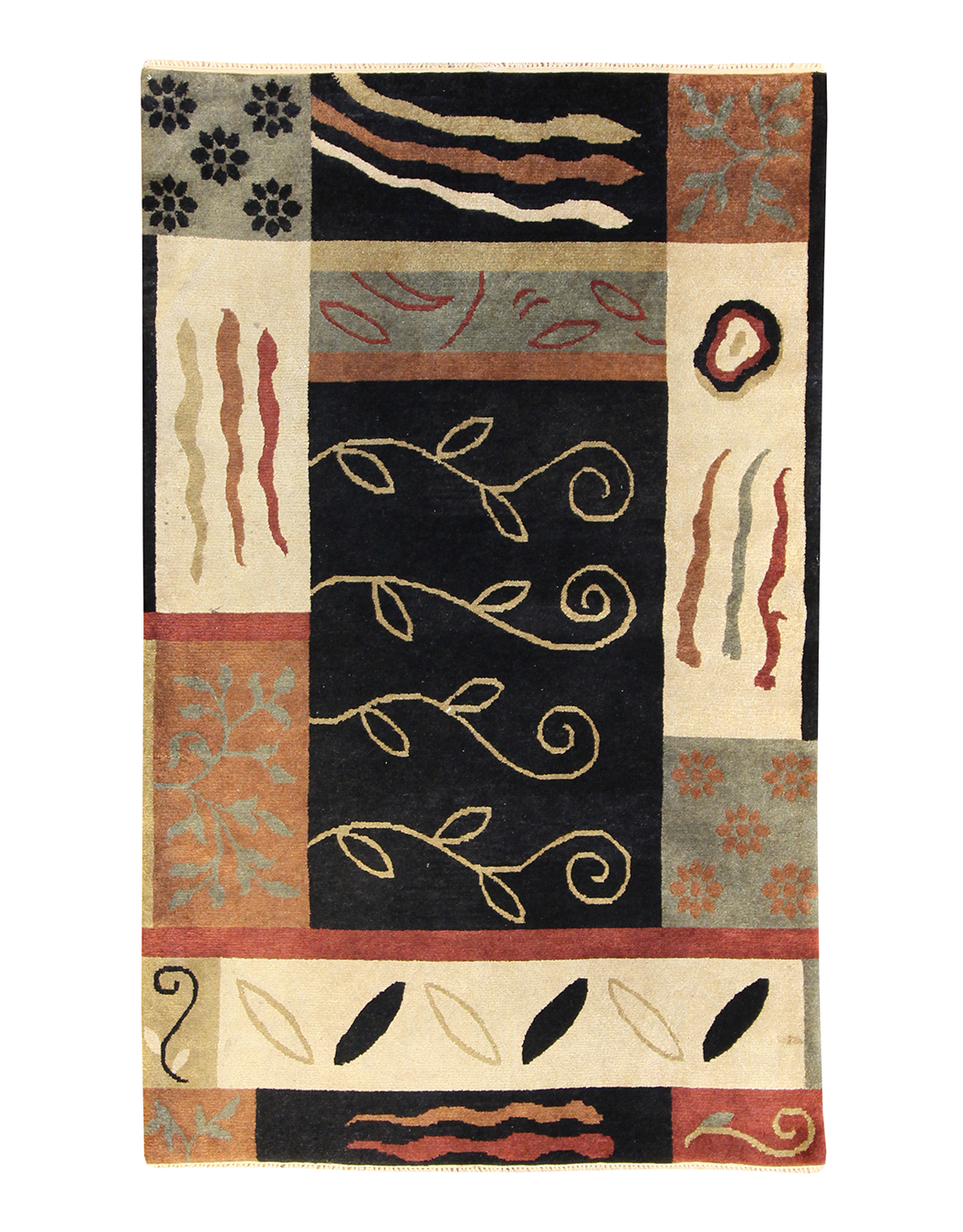 This artistic hand-knotted rug features a lively patchwork of abstract and botanical motifs, arranged in a modern grid format. Soft shades of black, beige, terracotta, sage, and ochre are layered in playful contrast, while swirling vines, floral bursts, and leaf patterns give the piece a whimsical and expressive energy. The asymmetry and texture lend it a handmade, painterly quality that feels both contemporary and warm.