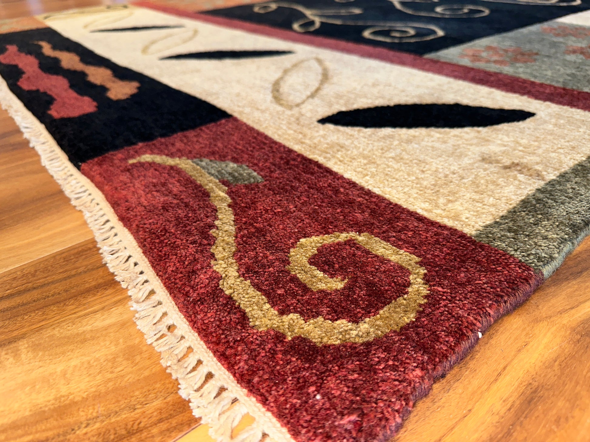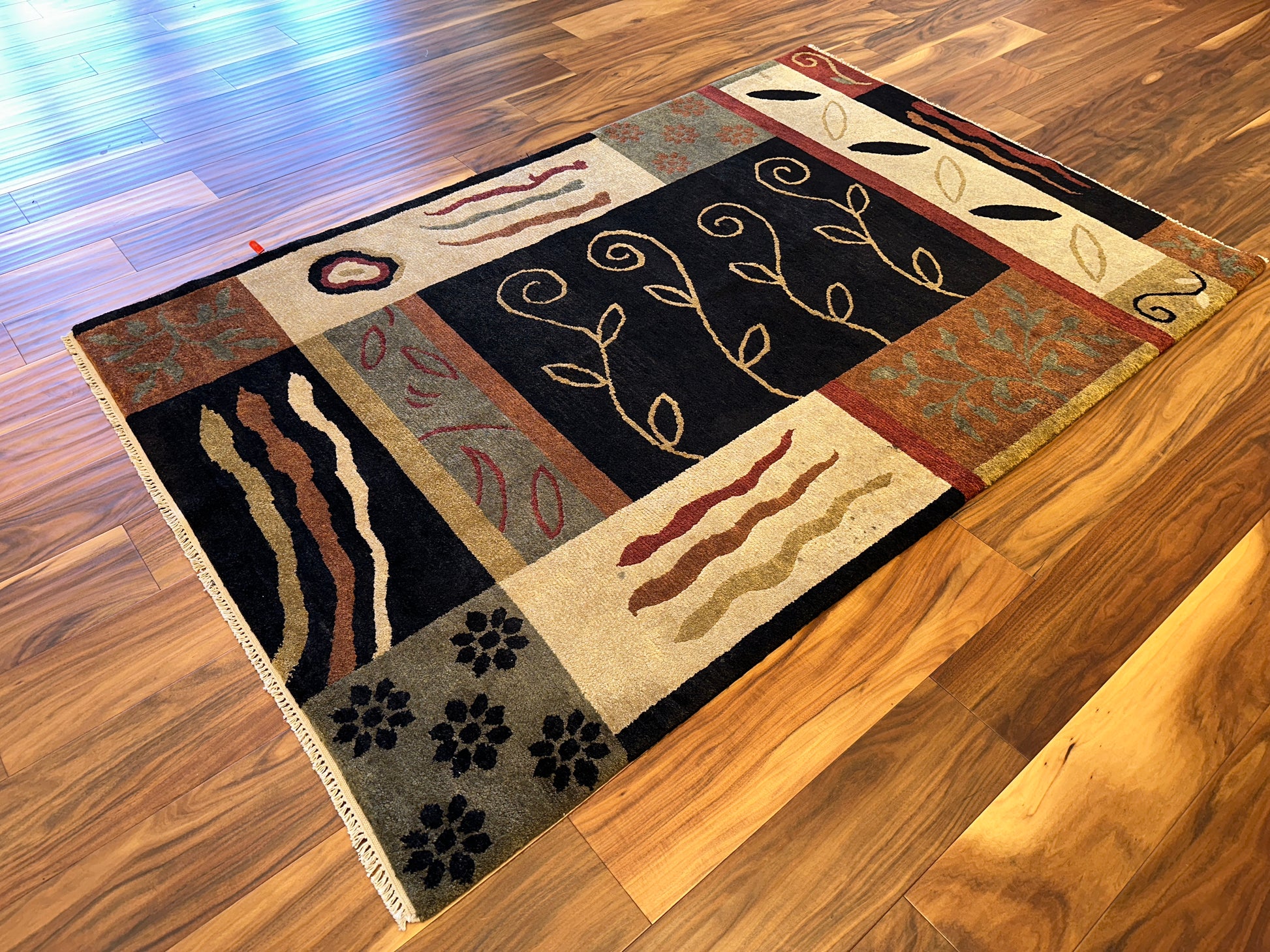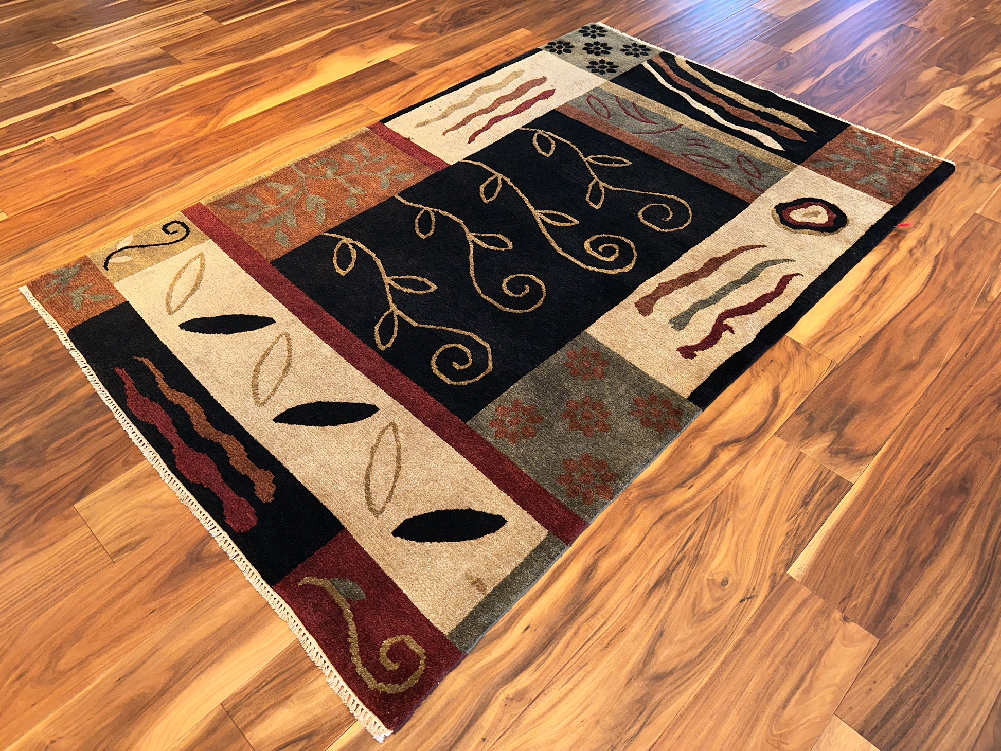 This artistic hand-knotted rug features a lively patchwork of abstract and botanical motifs, arranged in a modern grid format. Soft shades of black, beige, terracotta, sage, and ochre are layered in playful contrast, while swirling vines, floral bursts, and leaf patterns give the piece a whimsical and expressive energy. The asymmetry and texture lend it a handmade, painterly quality that feels both contemporary and warm.