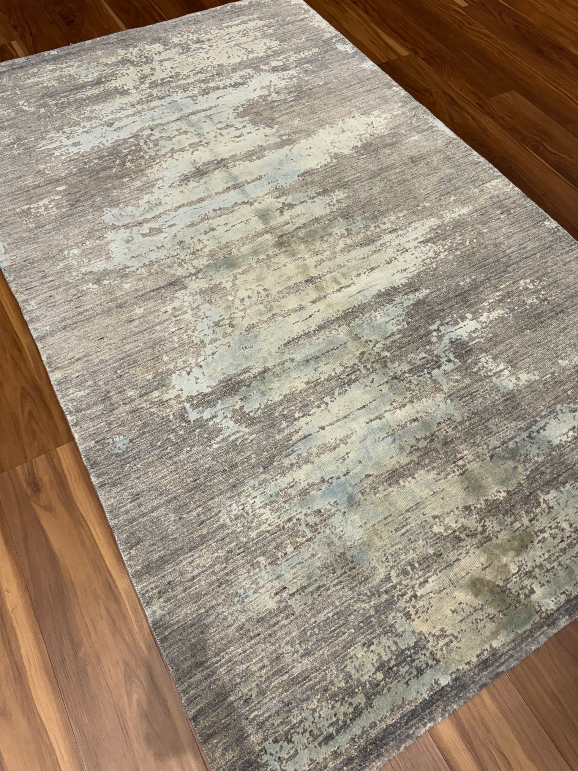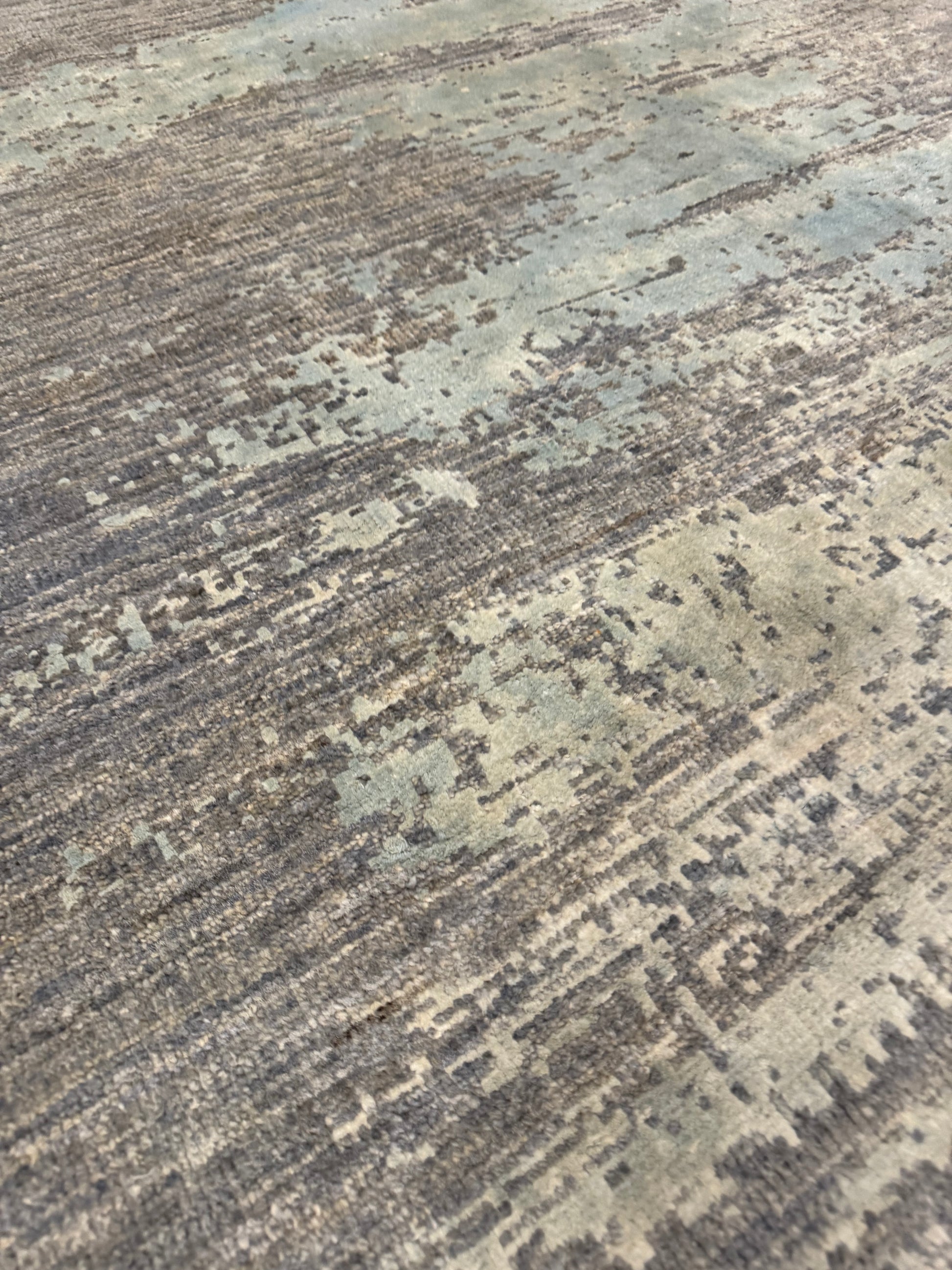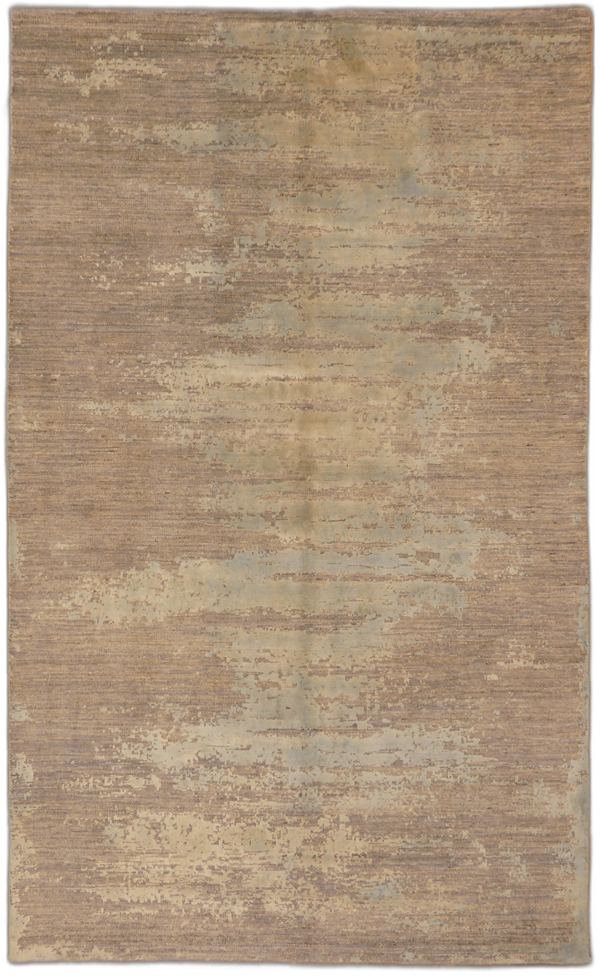 This contemporary rug features a textured design with a harmonious blend of beige, brown, taupe, and ivory hues. The subtle variations in color create an elegant, understated look that evokes a sense of calm and sophistication. Ideal for modern and minimalist spaces, this rug adds a touch of luxury with its soft wool and silk blend, providing both comfort and durability. Whether placed in a living room or a bedroom, it harmoniously complements a variety of decors while being plush underfoot.