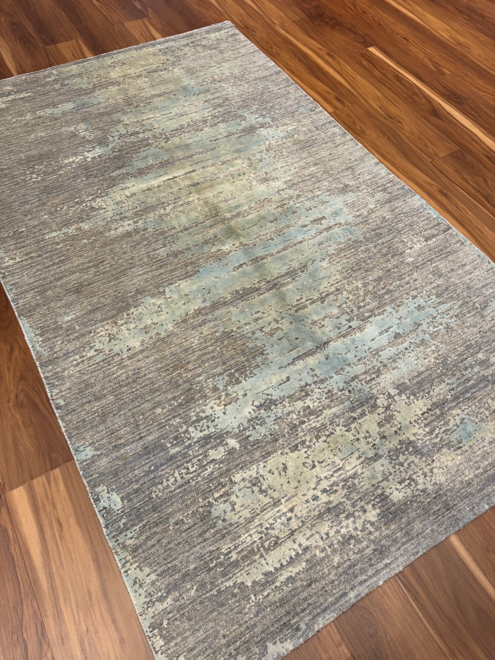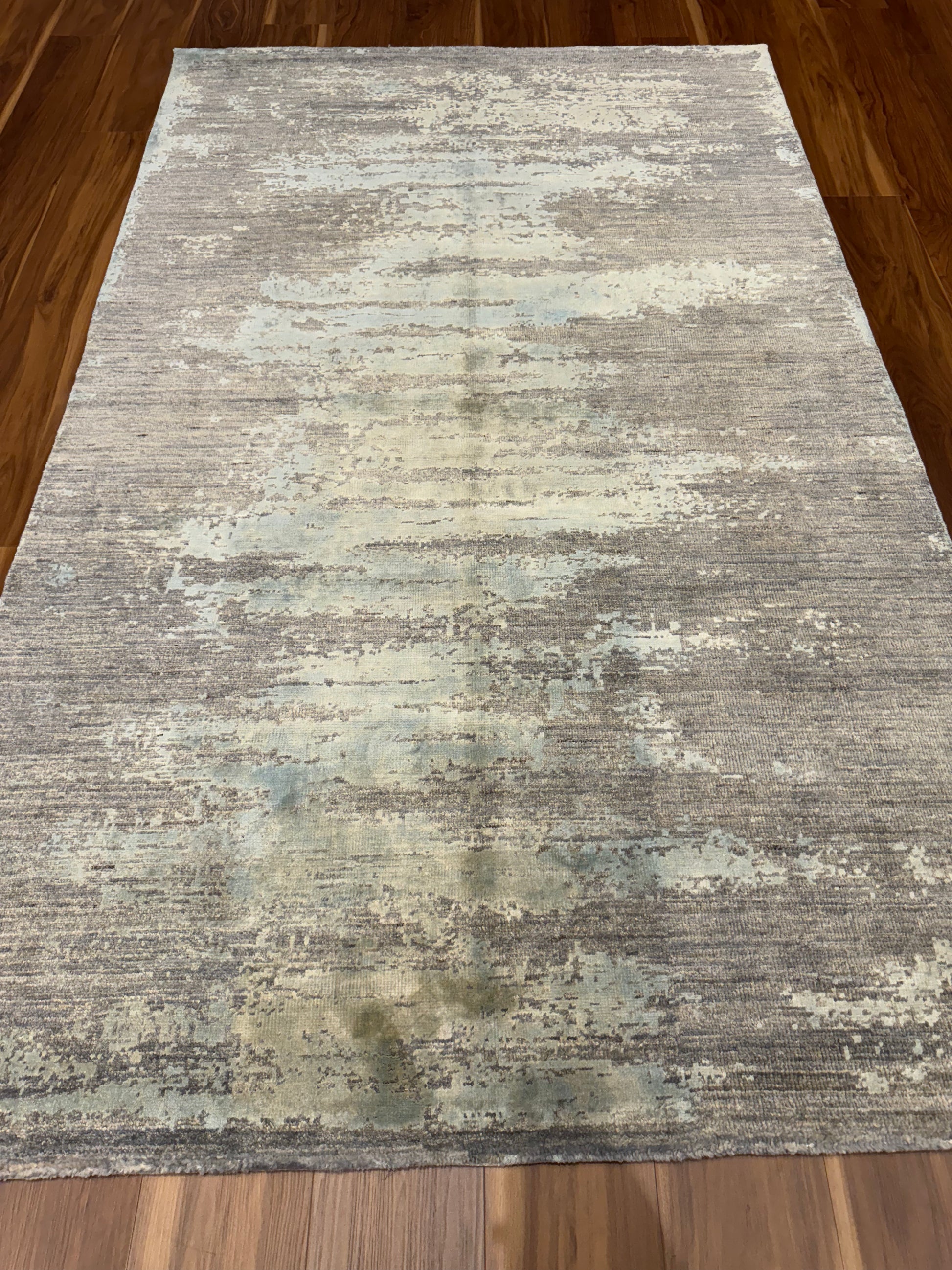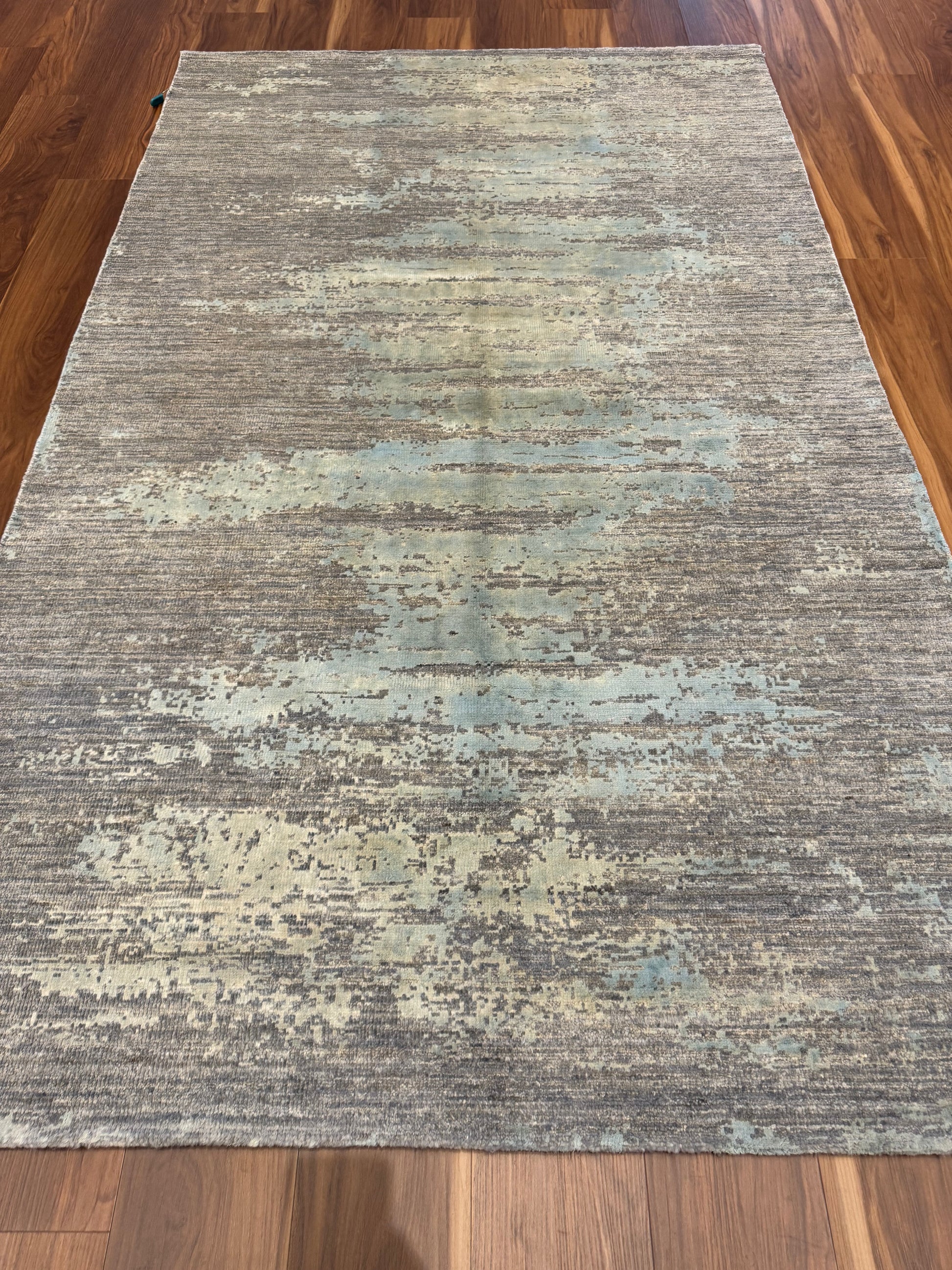 This contemporary rug features a textured design with a harmonious blend of beige, brown, taupe, and ivory hues. The subtle variations in color create an elegant, understated look that evokes a sense of calm and sophistication. Ideal for modern and minimalist spaces, this rug adds a touch of luxury with its soft wool and silk blend, providing both comfort and durability. Whether placed in a living room or a bedroom, it harmoniously complements a variety of decors while being plush underfoot.