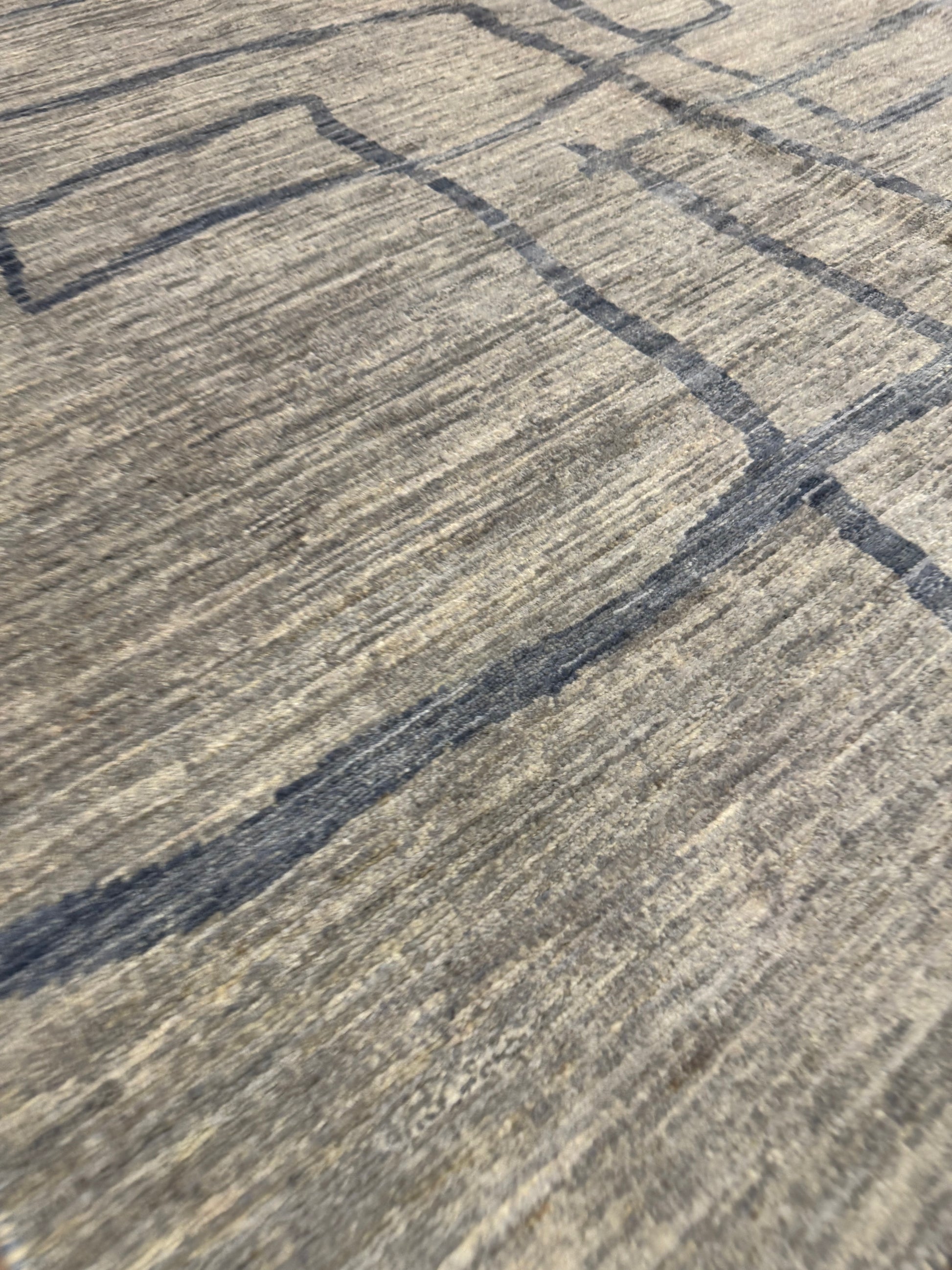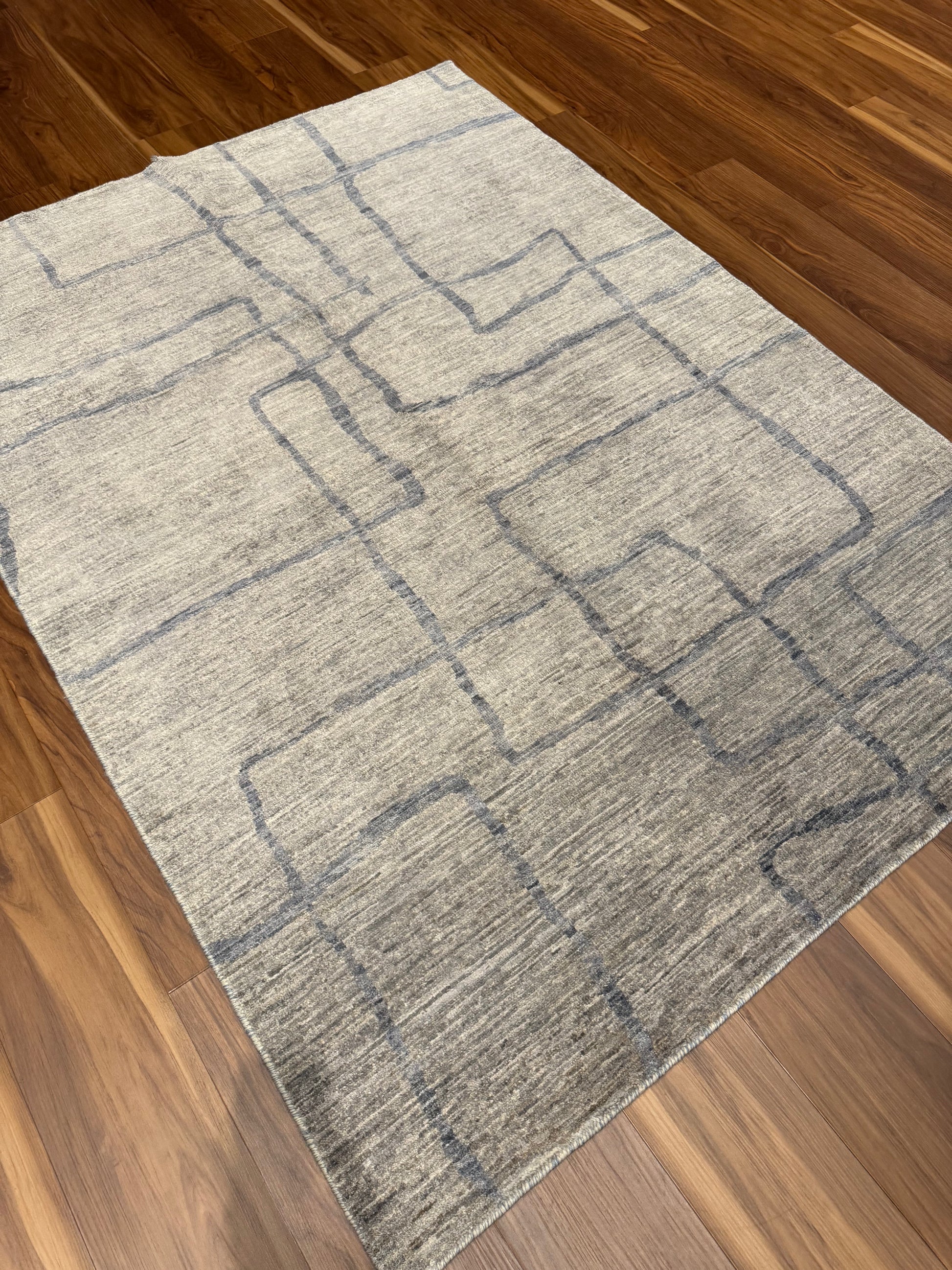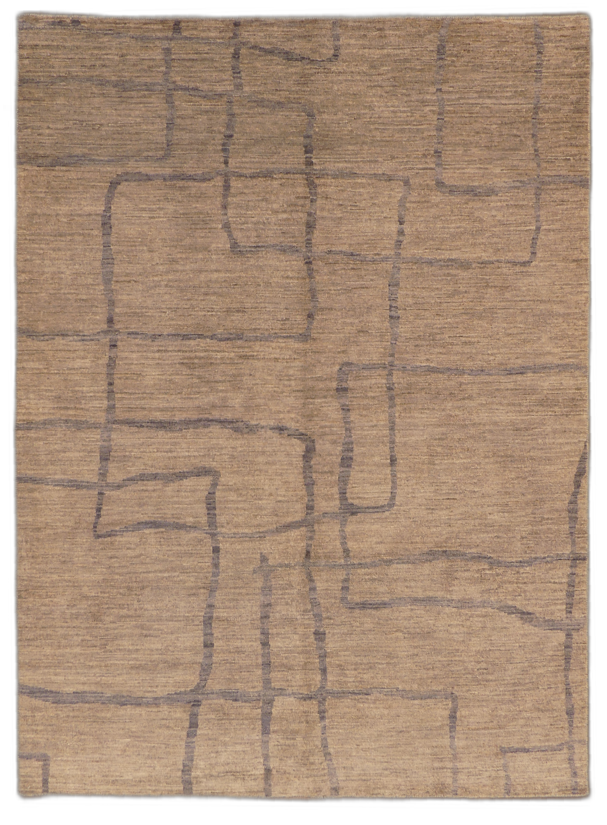 This elegant modern rug is crafted from the finest wool, featuring a minimalist abstract design that adds a touch of sophistication to any room. The understated beige and taupe color palette is accented with subtle grey lines that create an illusion of texture and depth. This piece is perfect for adding a contemporary feel to your living space while maintaining a warm and inviting atmosphere.