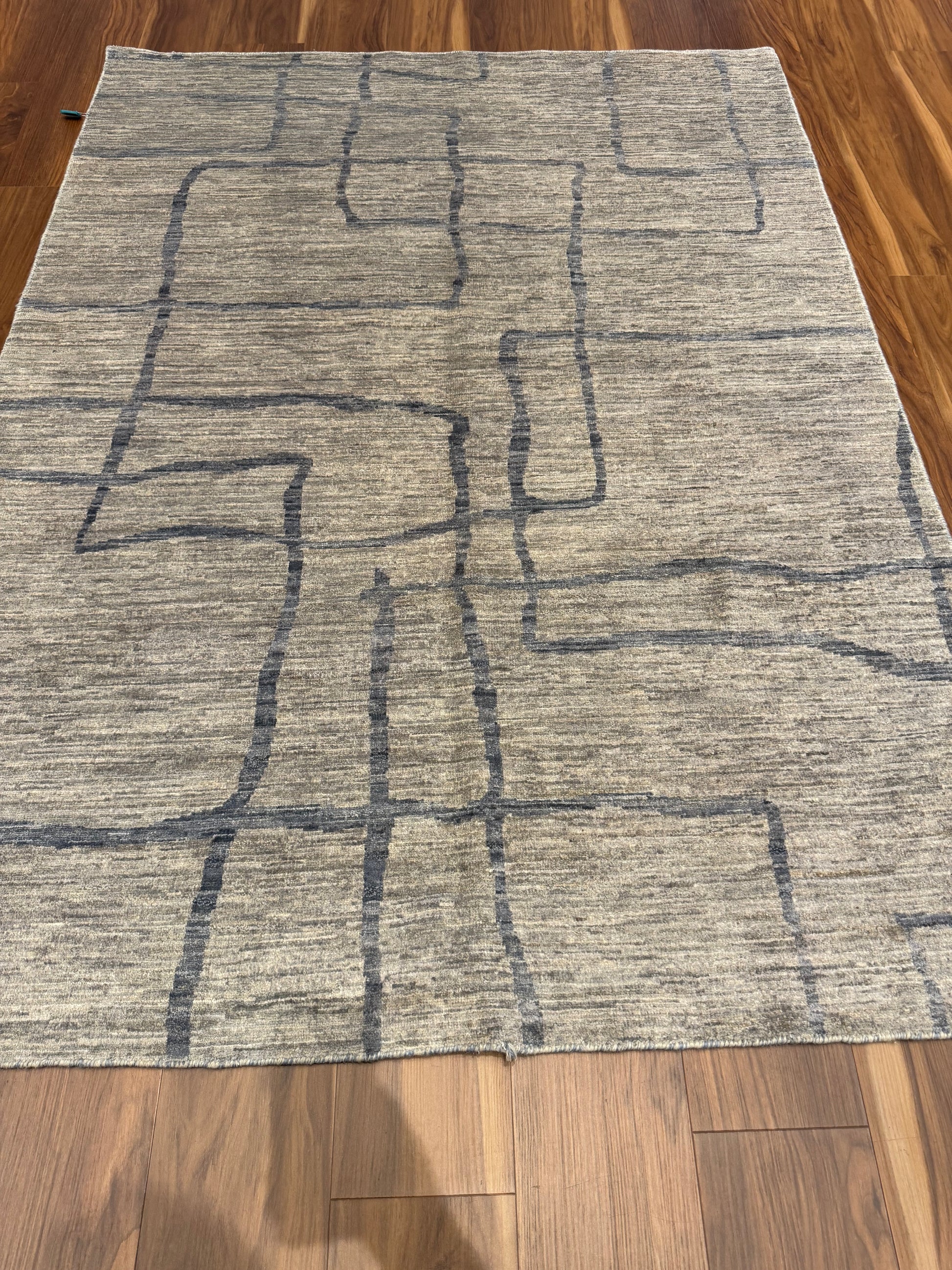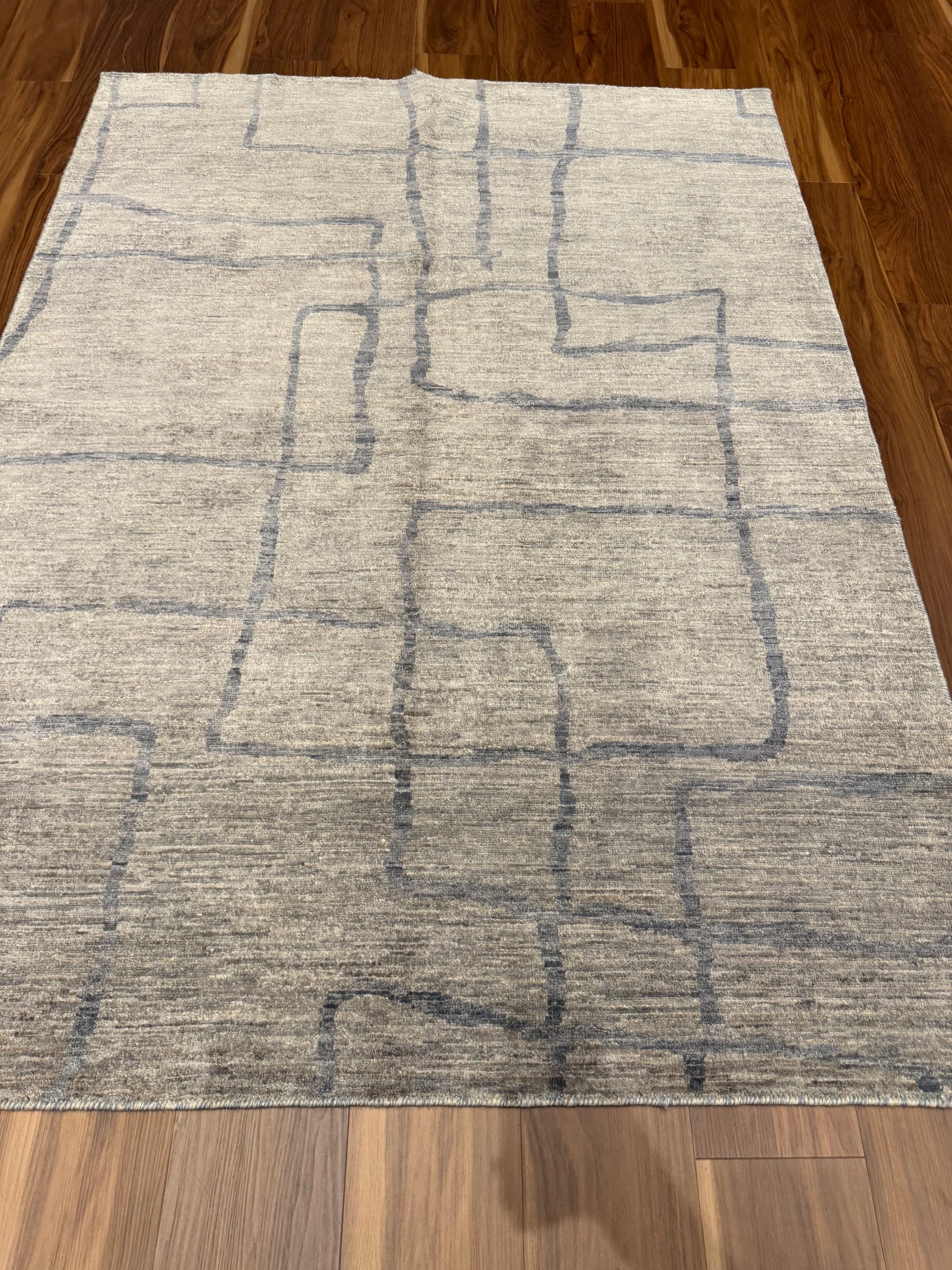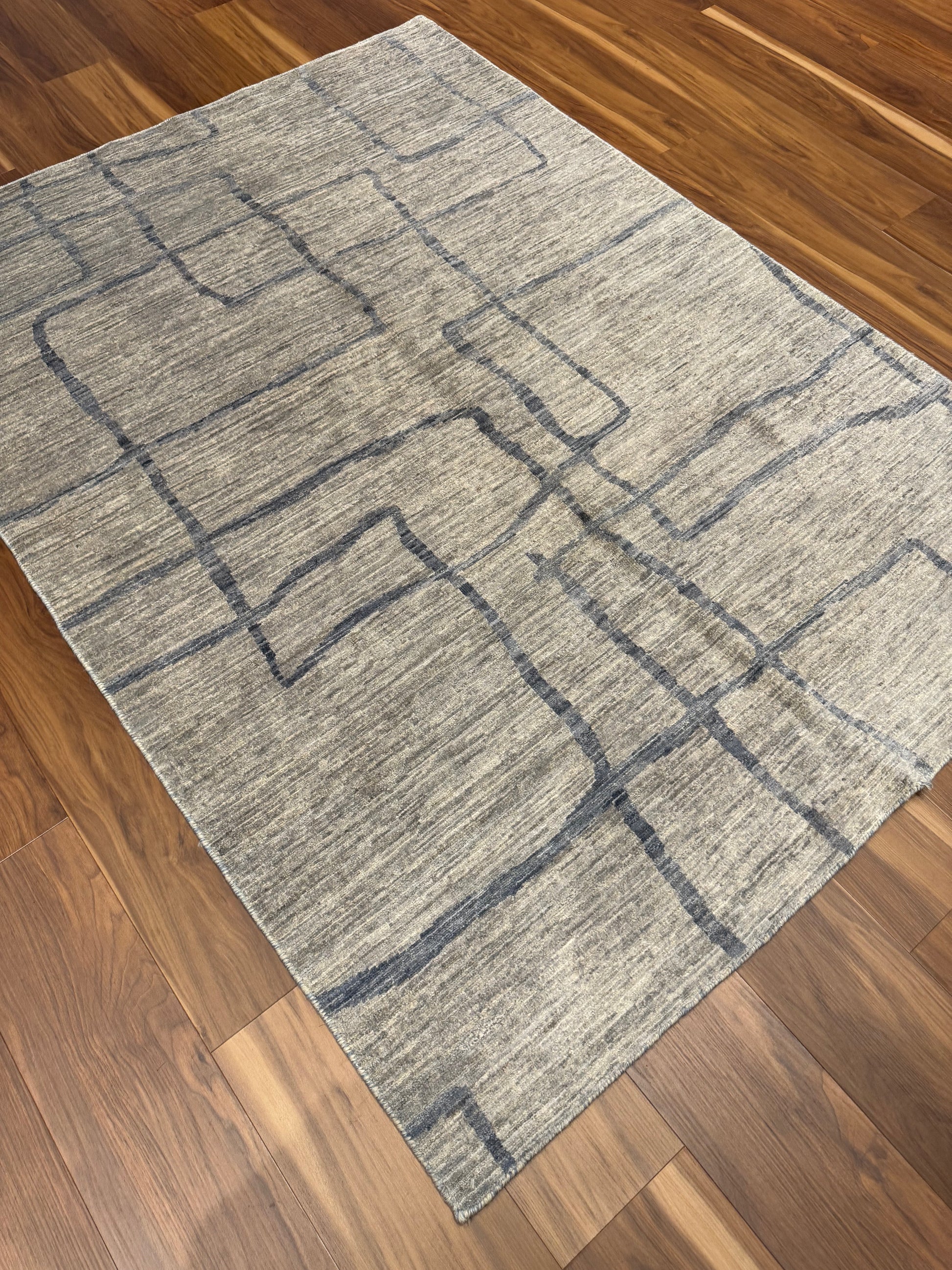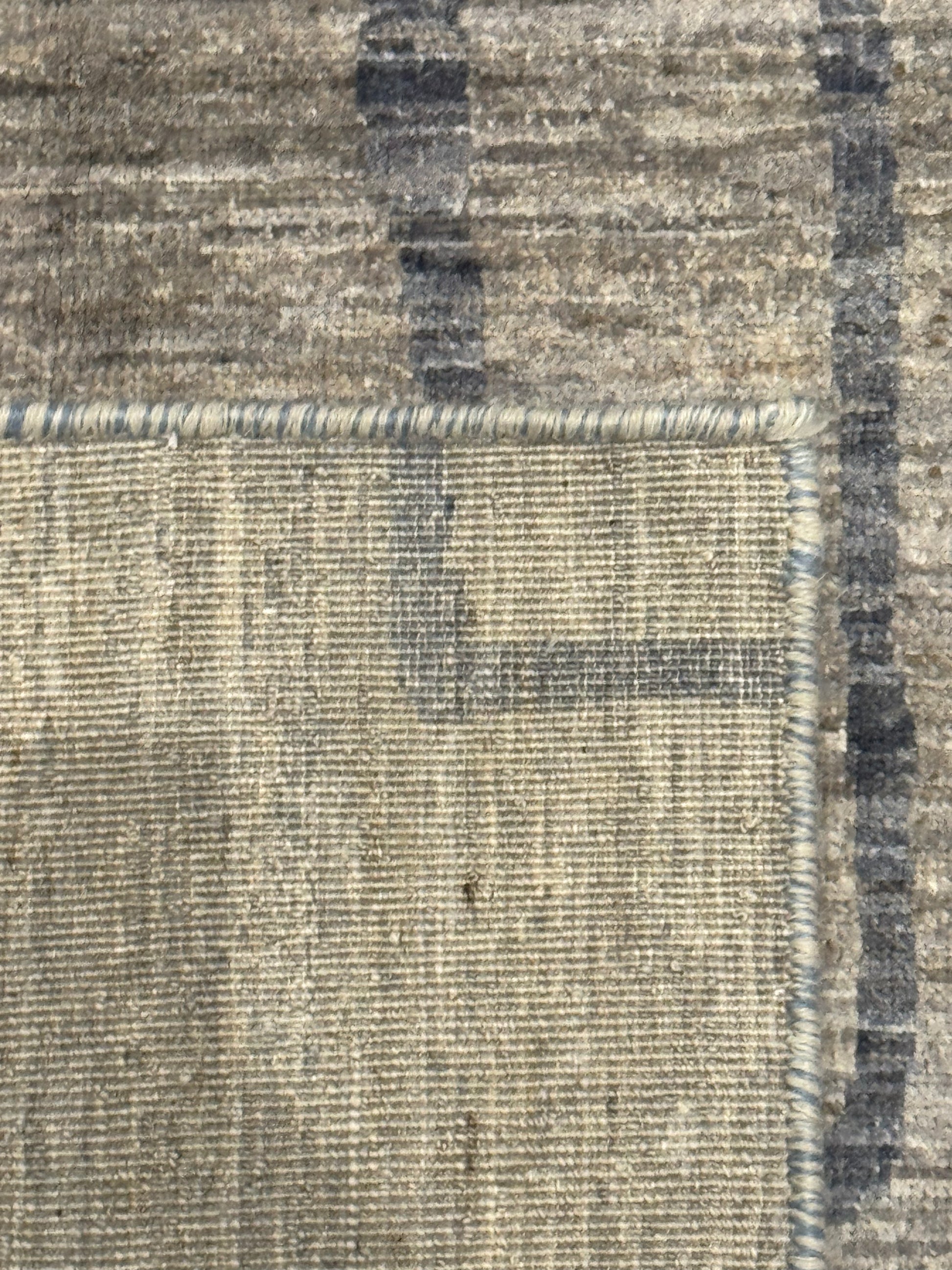 This elegant modern rug is crafted from the finest wool, featuring a minimalist abstract design that adds a touch of sophistication to any room. The understated beige and taupe color palette is accented with subtle grey lines that create an illusion of texture and depth. This piece is perfect for adding a contemporary feel to your living space while maintaining a warm and inviting atmosphere.