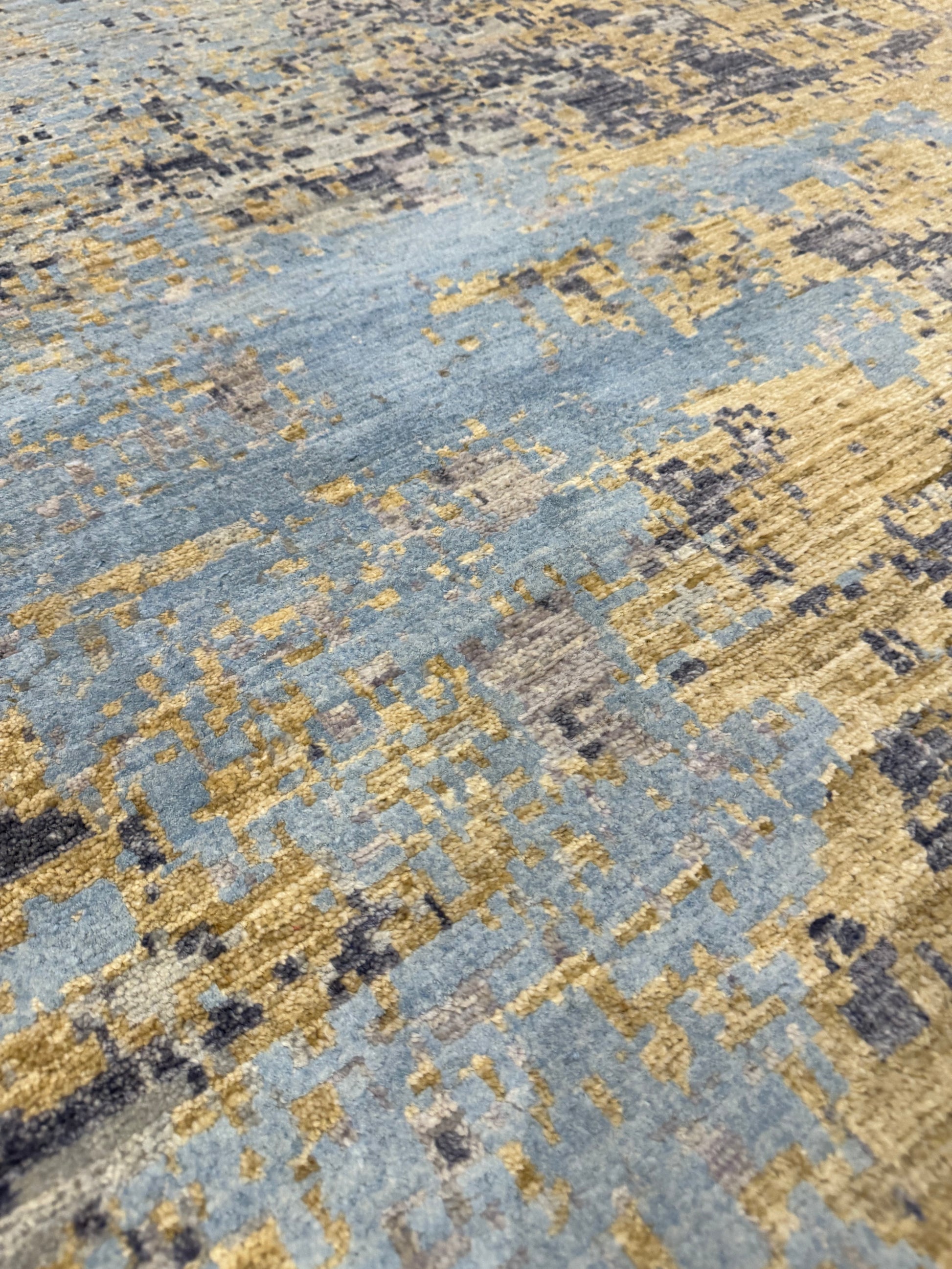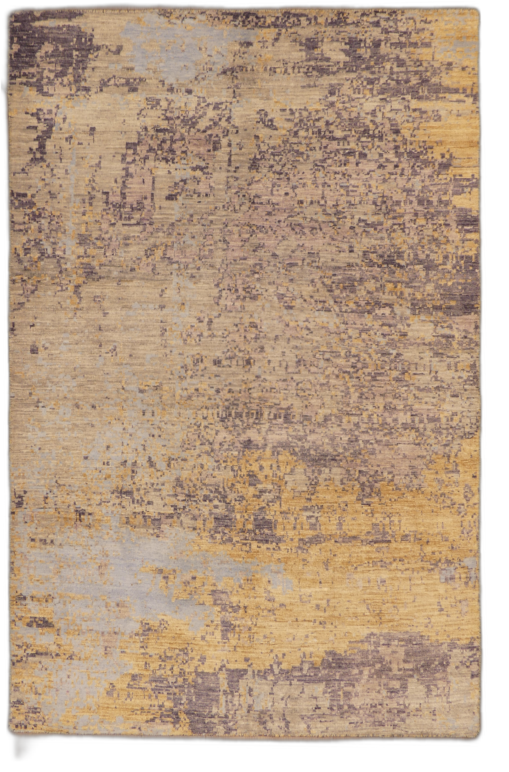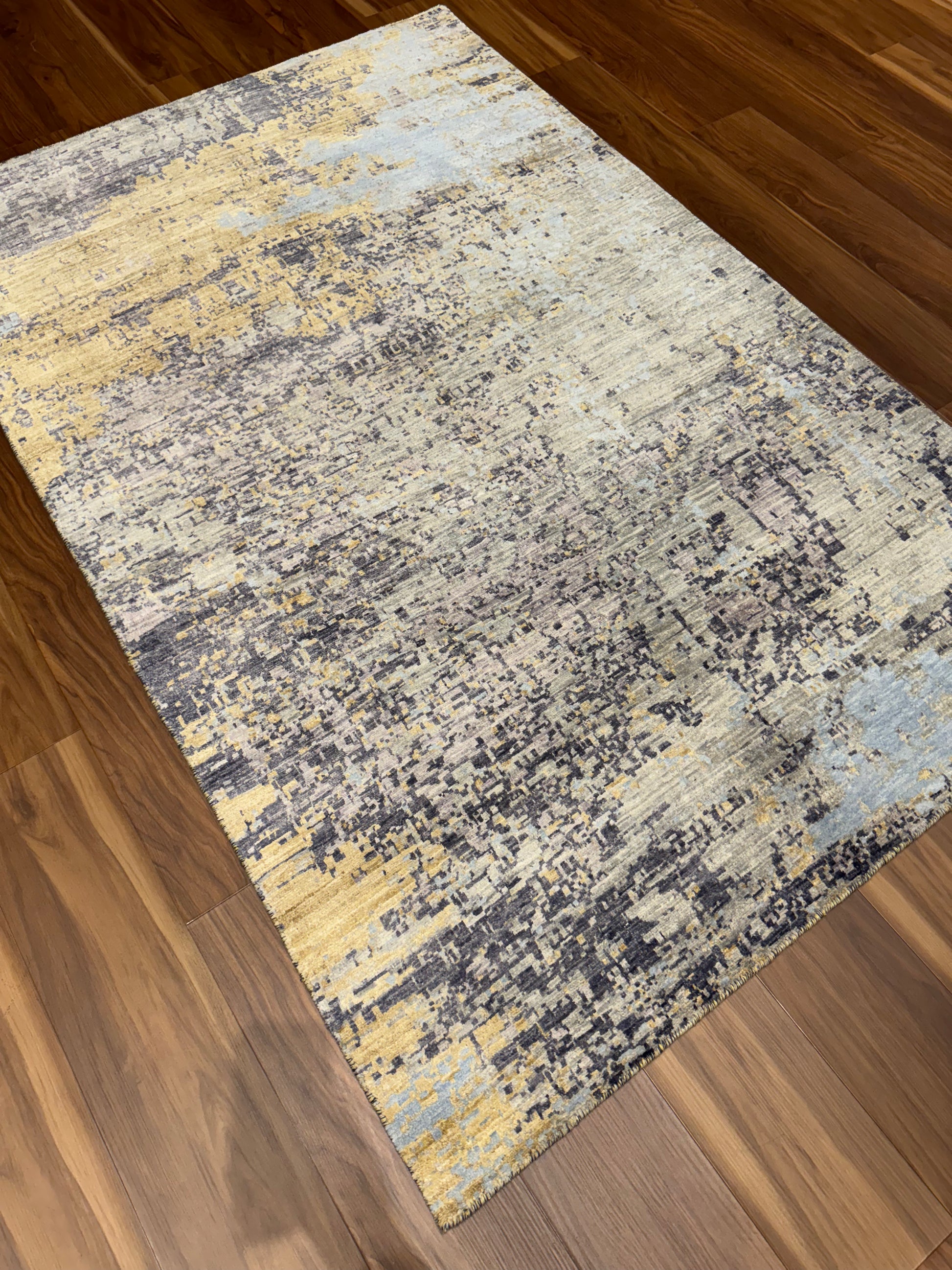 This exquisite rug features a harmonious blend of gold, beige, and gray shades, creating a sophisticated and contemporary aesthetic. Its abstract design resembles a unique weathered surface, reminiscent of artistic murals or aged patinas. Expertly handcrafted from a luxurious blend of wool and silk, this rug promises a soft texture and a subtle sheen, enhancing its elegant appearance. Suitable for various interior themes, it serves as a statement piece that effortlessly anchors any space with its modern allure and high-quality materials.