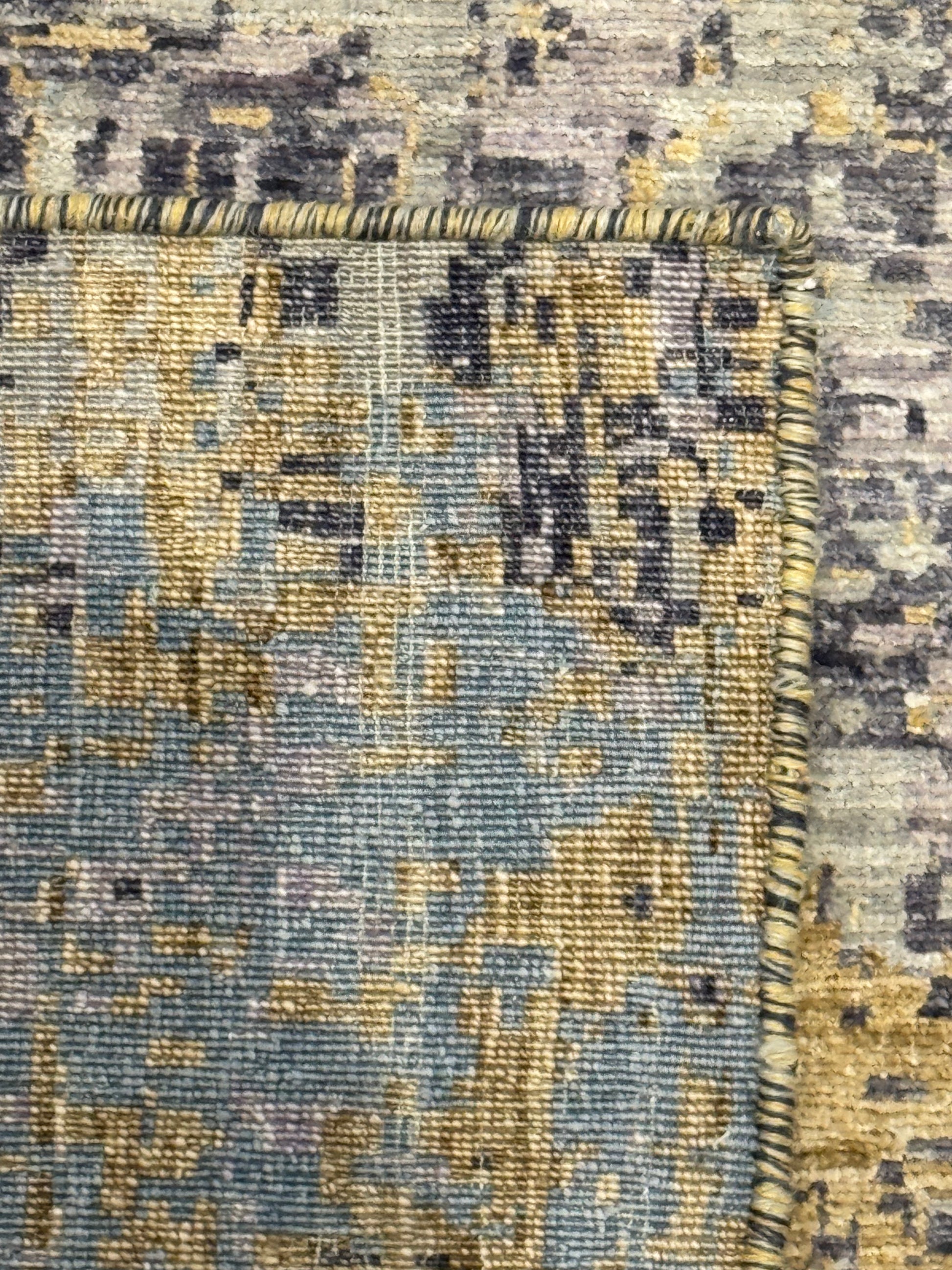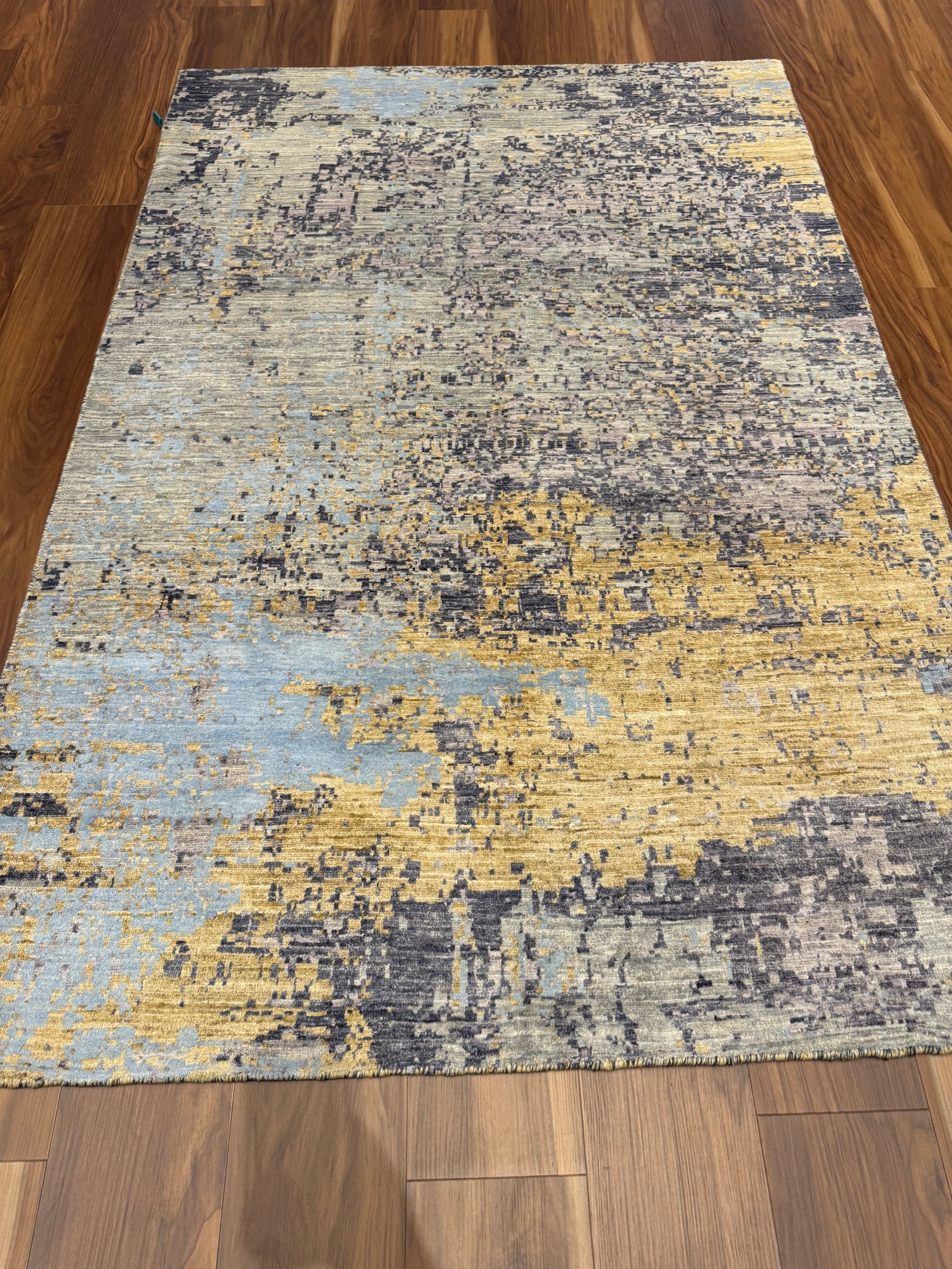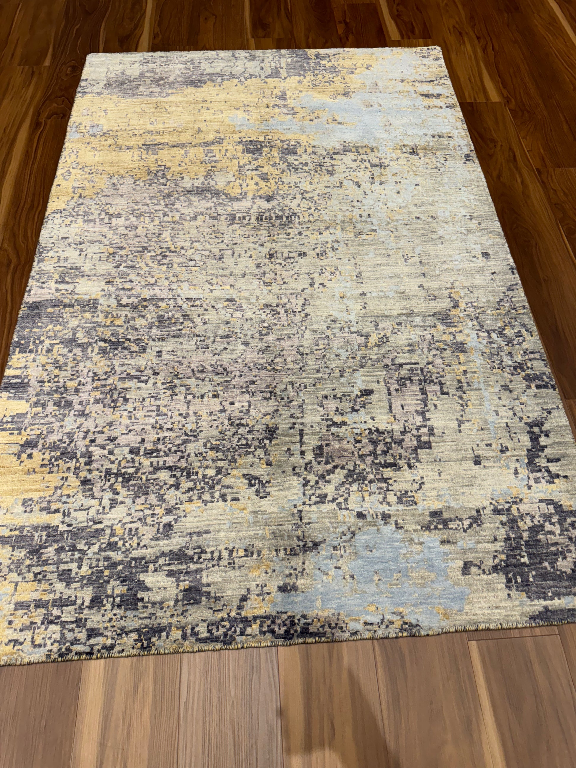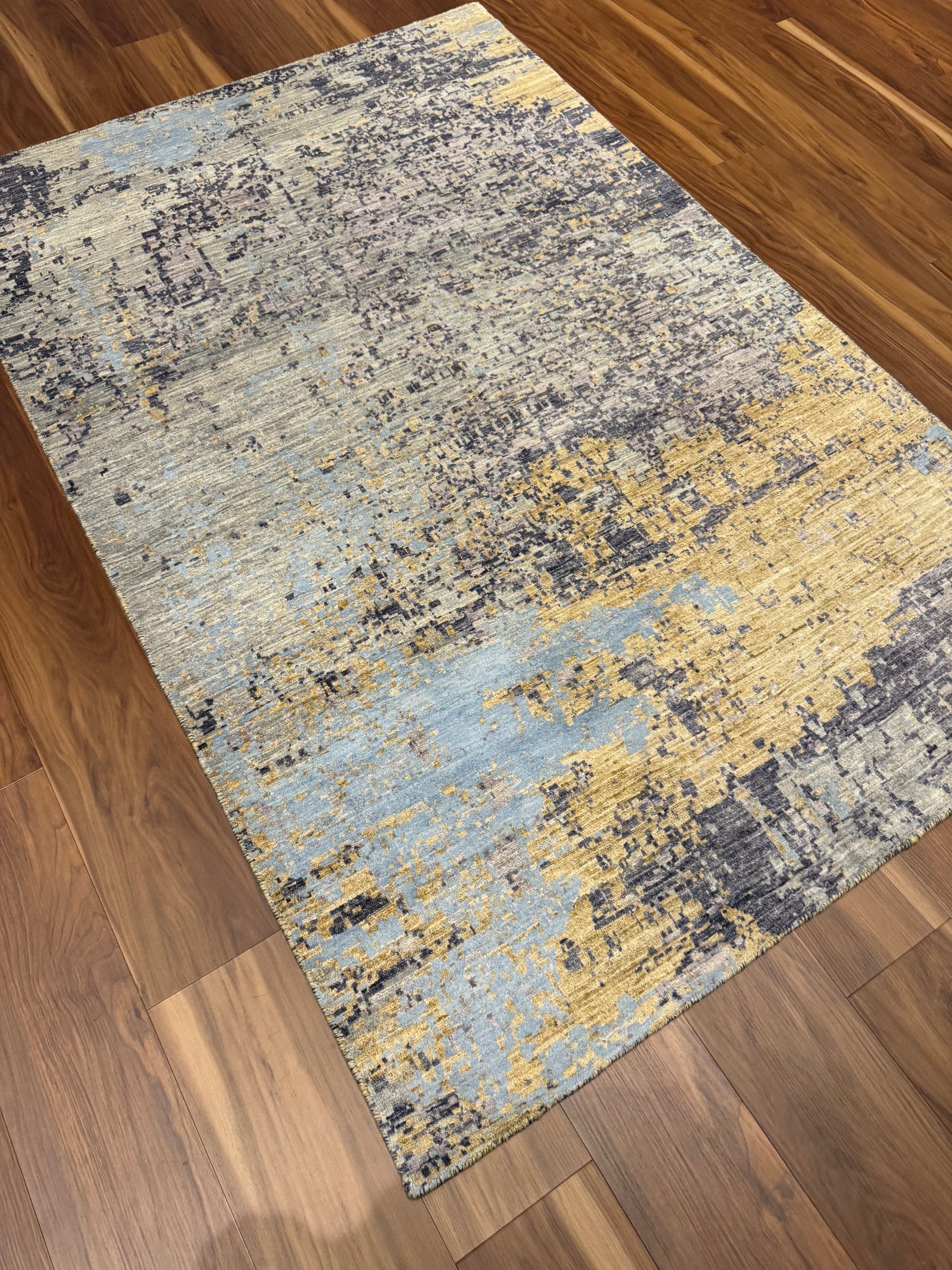 This exquisite rug features a harmonious blend of gold, beige, and gray shades, creating a sophisticated and contemporary aesthetic. Its abstract design resembles a unique weathered surface, reminiscent of artistic murals or aged patinas. Expertly handcrafted from a luxurious blend of wool and silk, this rug promises a soft texture and a subtle sheen, enhancing its elegant appearance. Suitable for various interior themes, it serves as a statement piece that effortlessly anchors any space with its modern allure and high-quality materials.