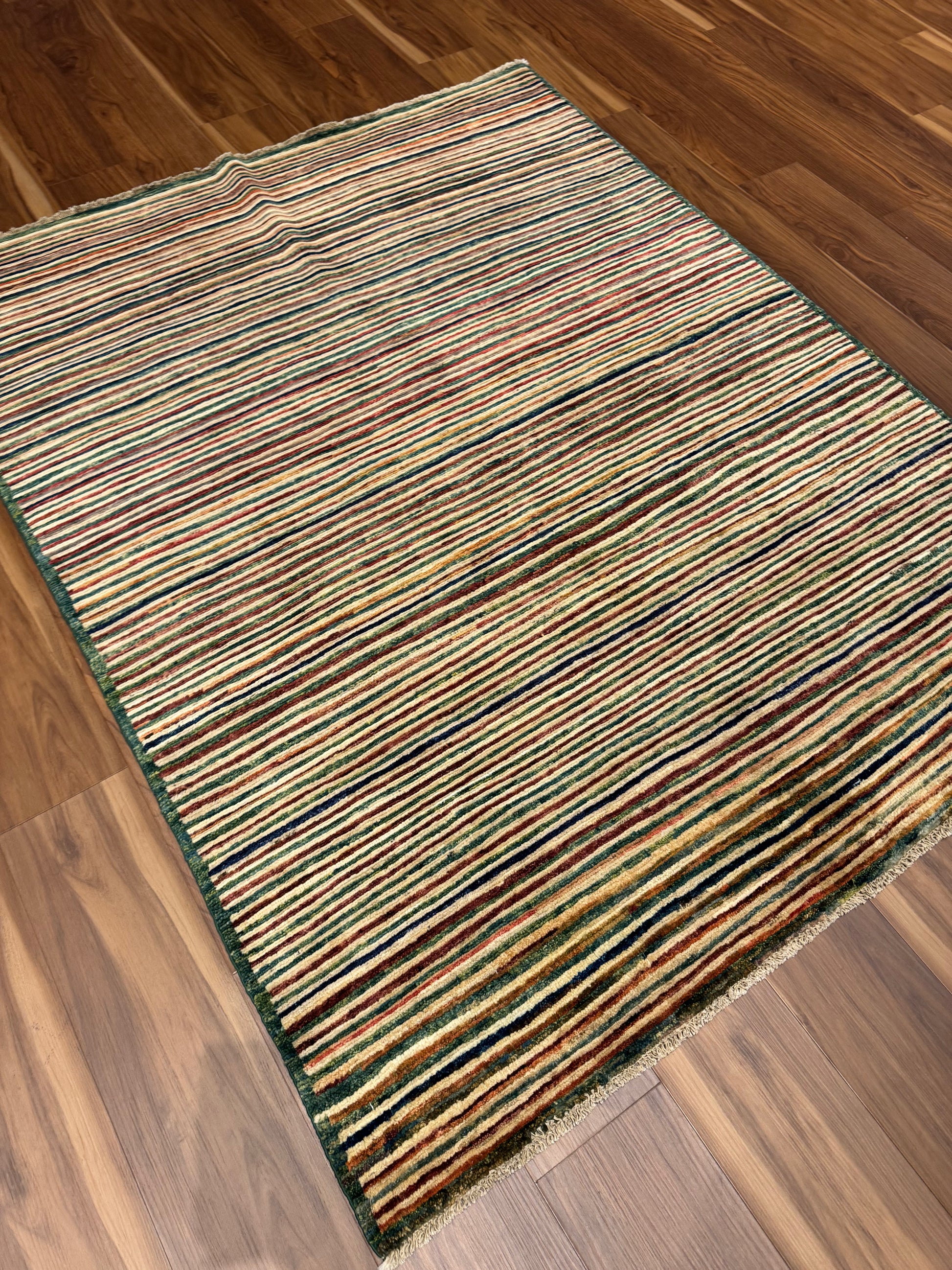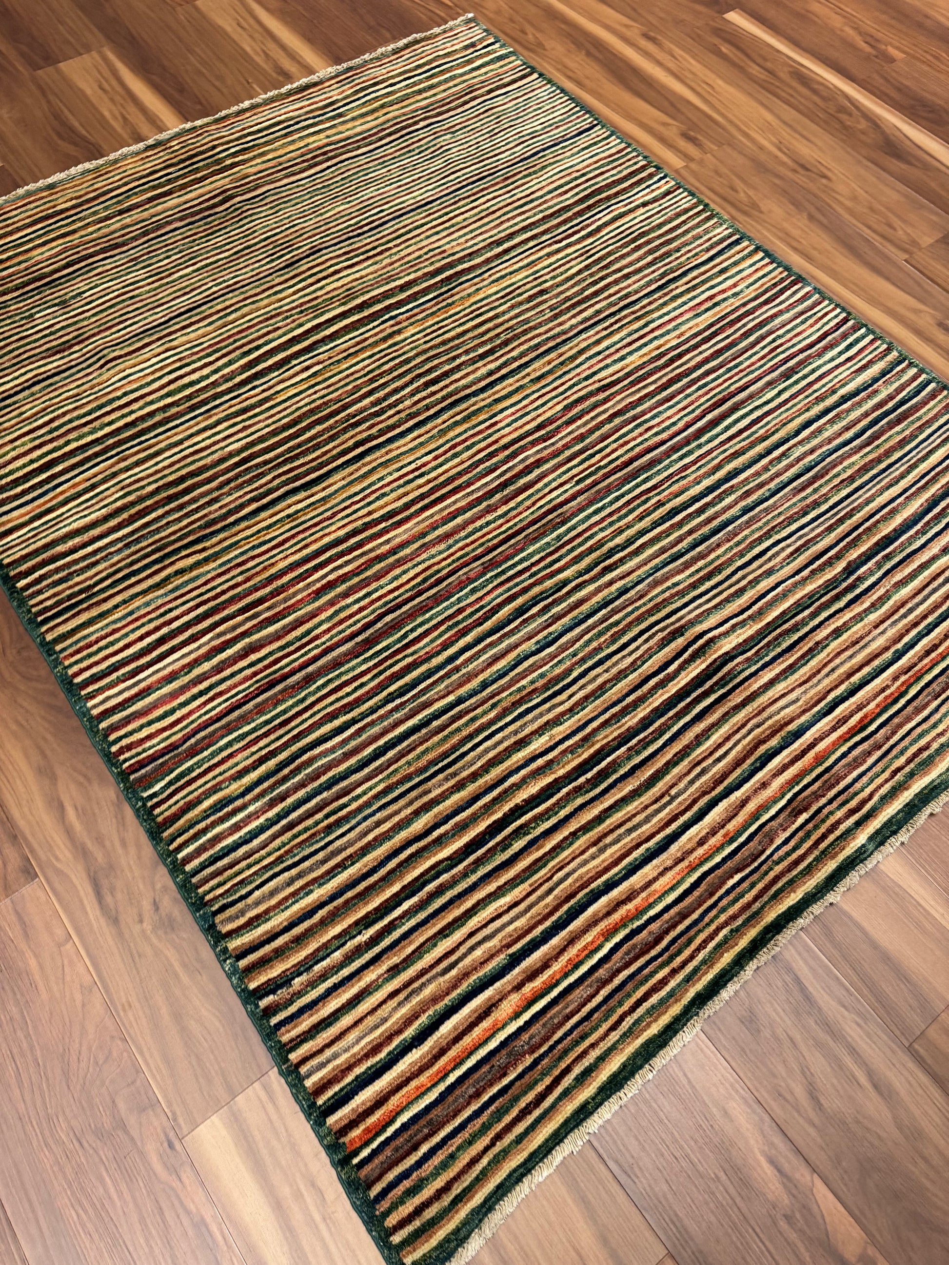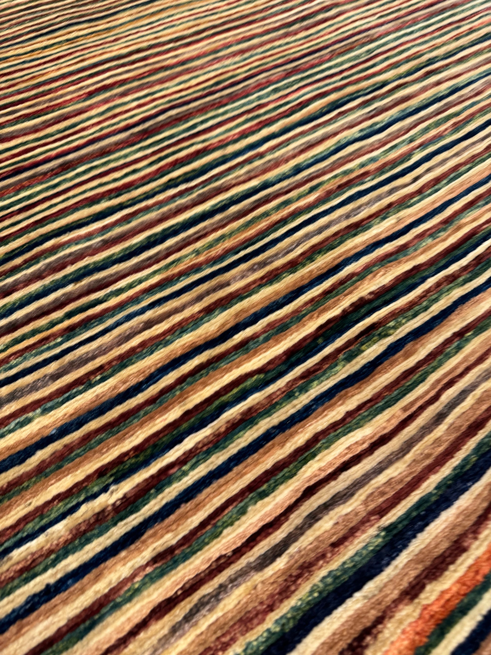 This modern wool rug presents a multicolor striped pattern that balances subtle elegance with contemporary design. The linear motif evokes a sense of motion, with the rich earth tones creating a warm, inviting atmosphere. Handcrafted from the highest quality wool, it offers both comfort and durability, making it an exceptional choice for any modern living space.