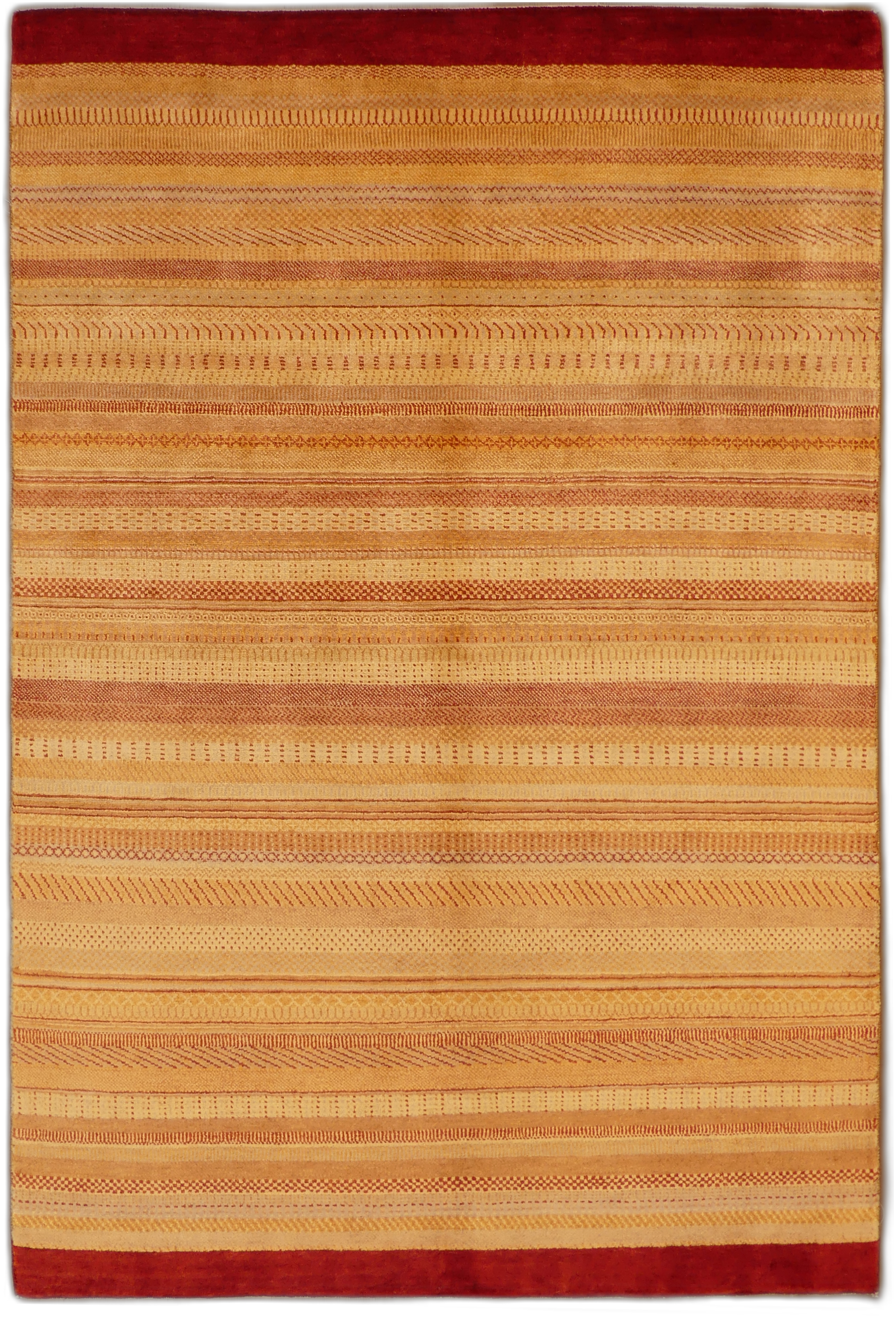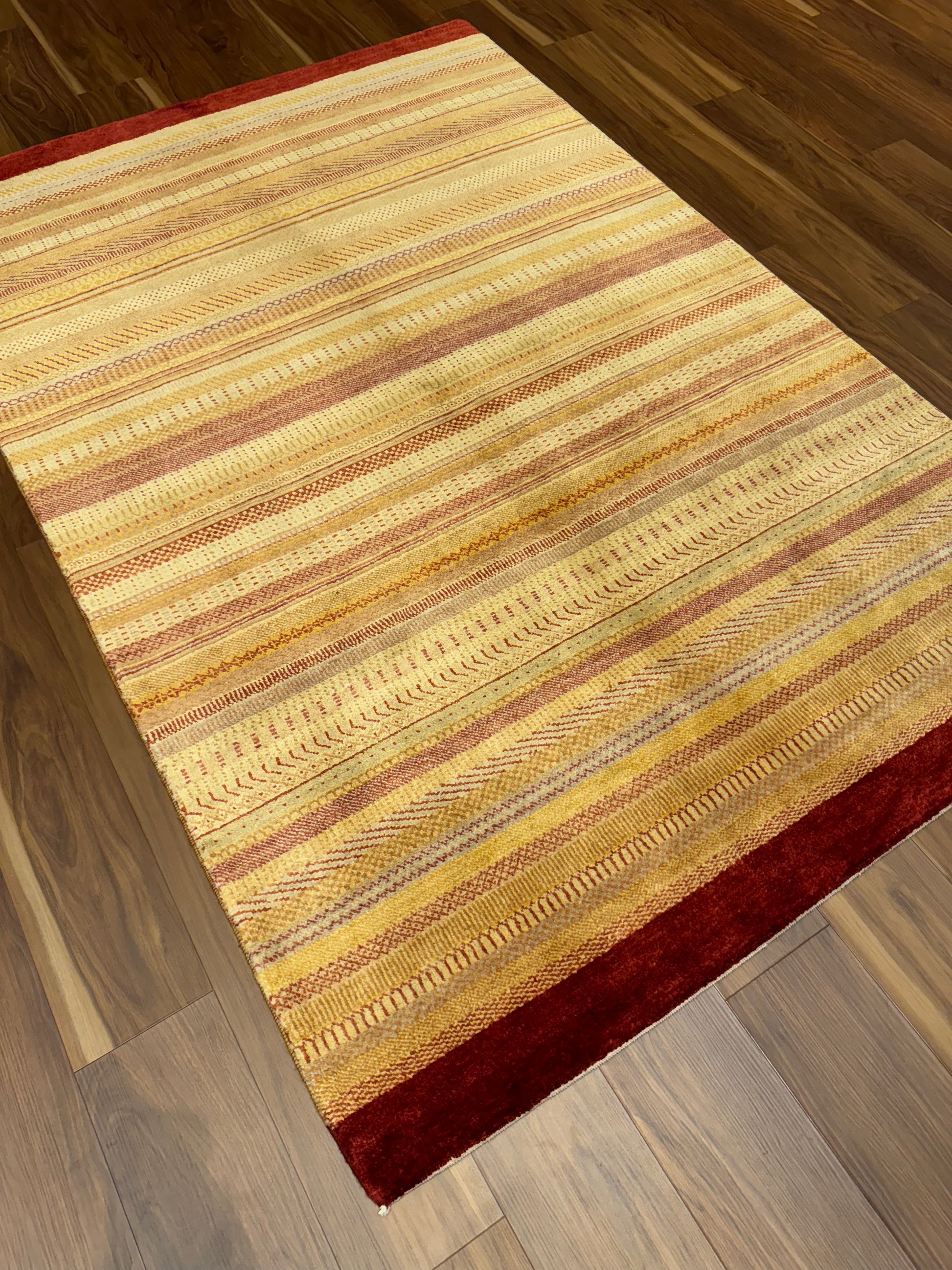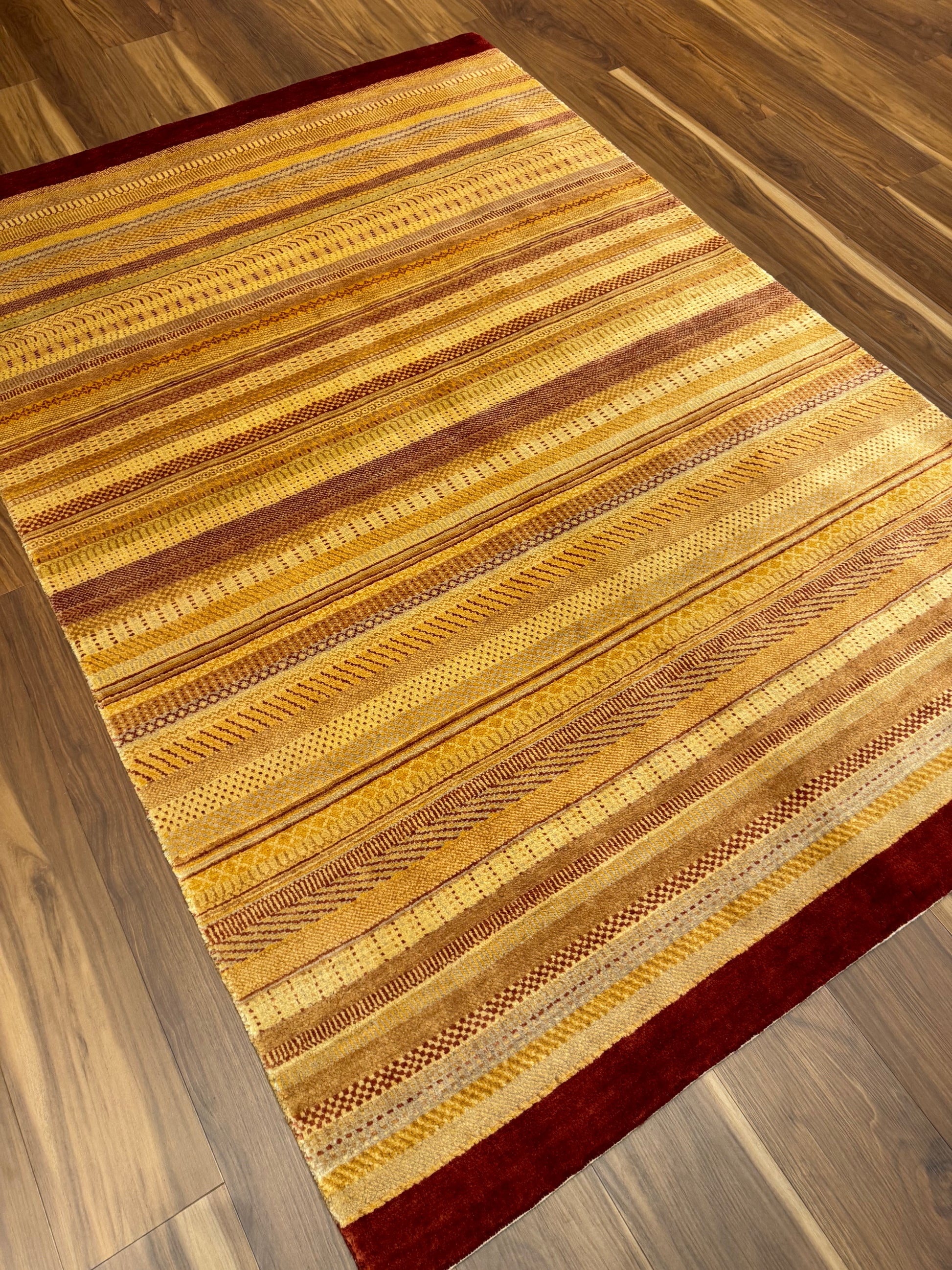 This exquisite rug showcases a modern design featuring horizontal bands in varying shades of gold and beige with rich burgundy borders. The texture and subtle patterns within the bands incorporate a blend of contemporary and traditional motifs, offering a versatile piece for any decor. Handwoven from premium wool, this rug promises durability and comfort, making it an ideal choice for bringing warmth and sophistication to living spaces.