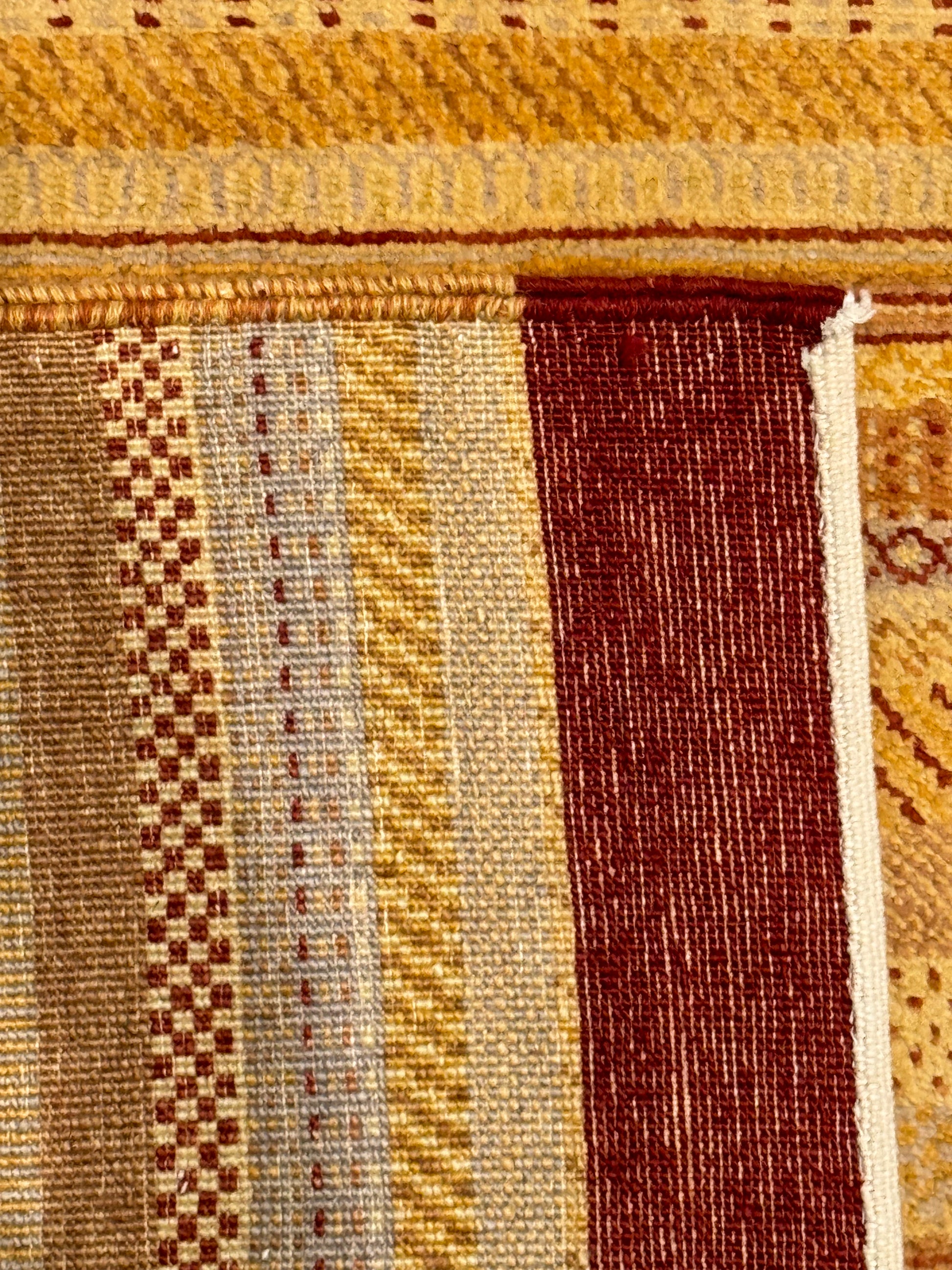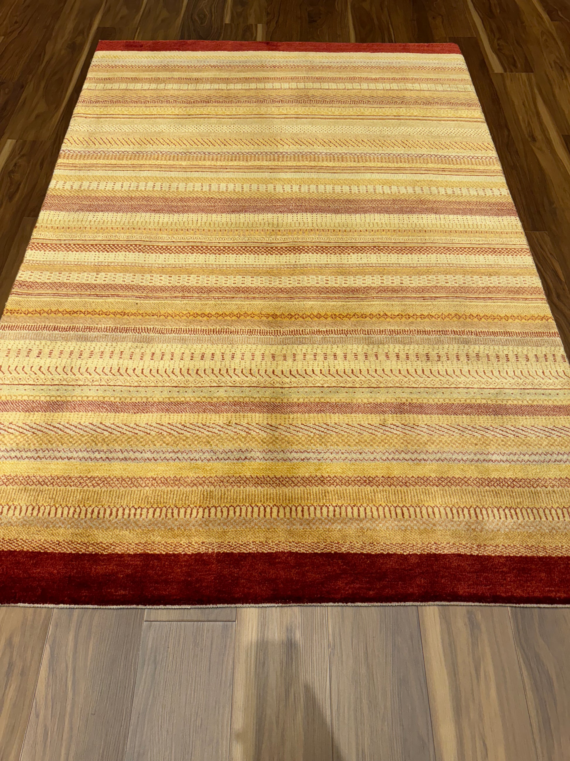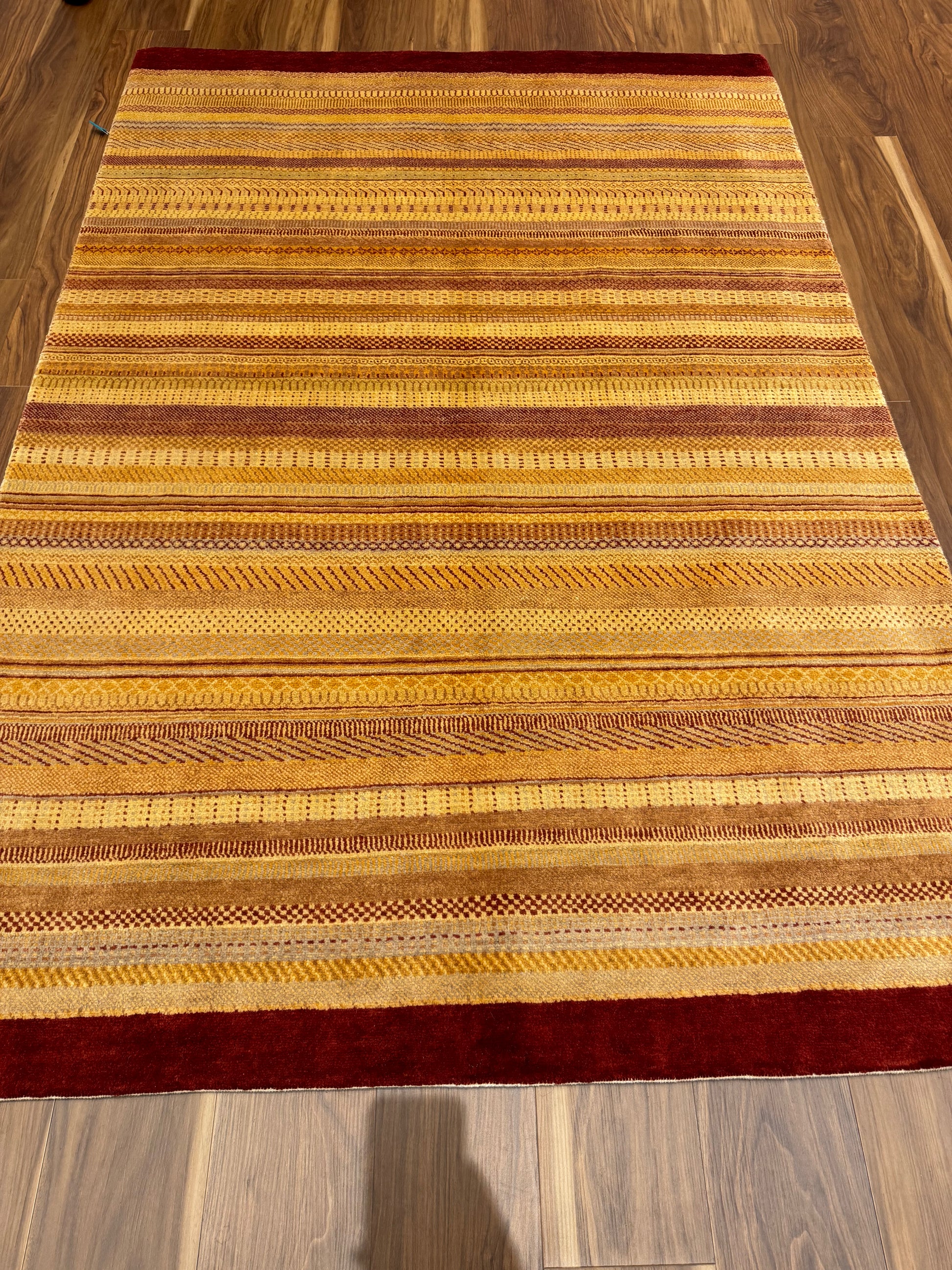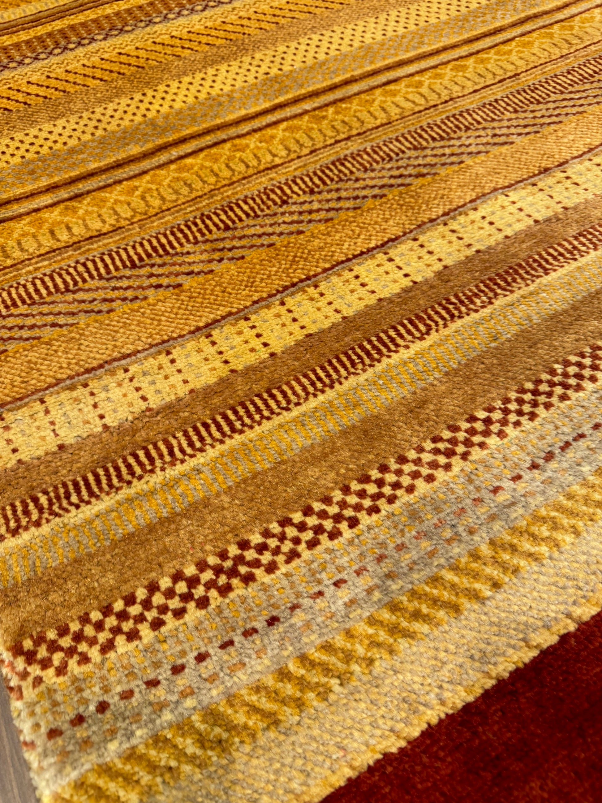 This exquisite rug showcases a modern design featuring horizontal bands in varying shades of gold and beige with rich burgundy borders. The texture and subtle patterns within the bands incorporate a blend of contemporary and traditional motifs, offering a versatile piece for any decor. Handwoven from premium wool, this rug promises durability and comfort, making it an ideal choice for bringing warmth and sophistication to living spaces.