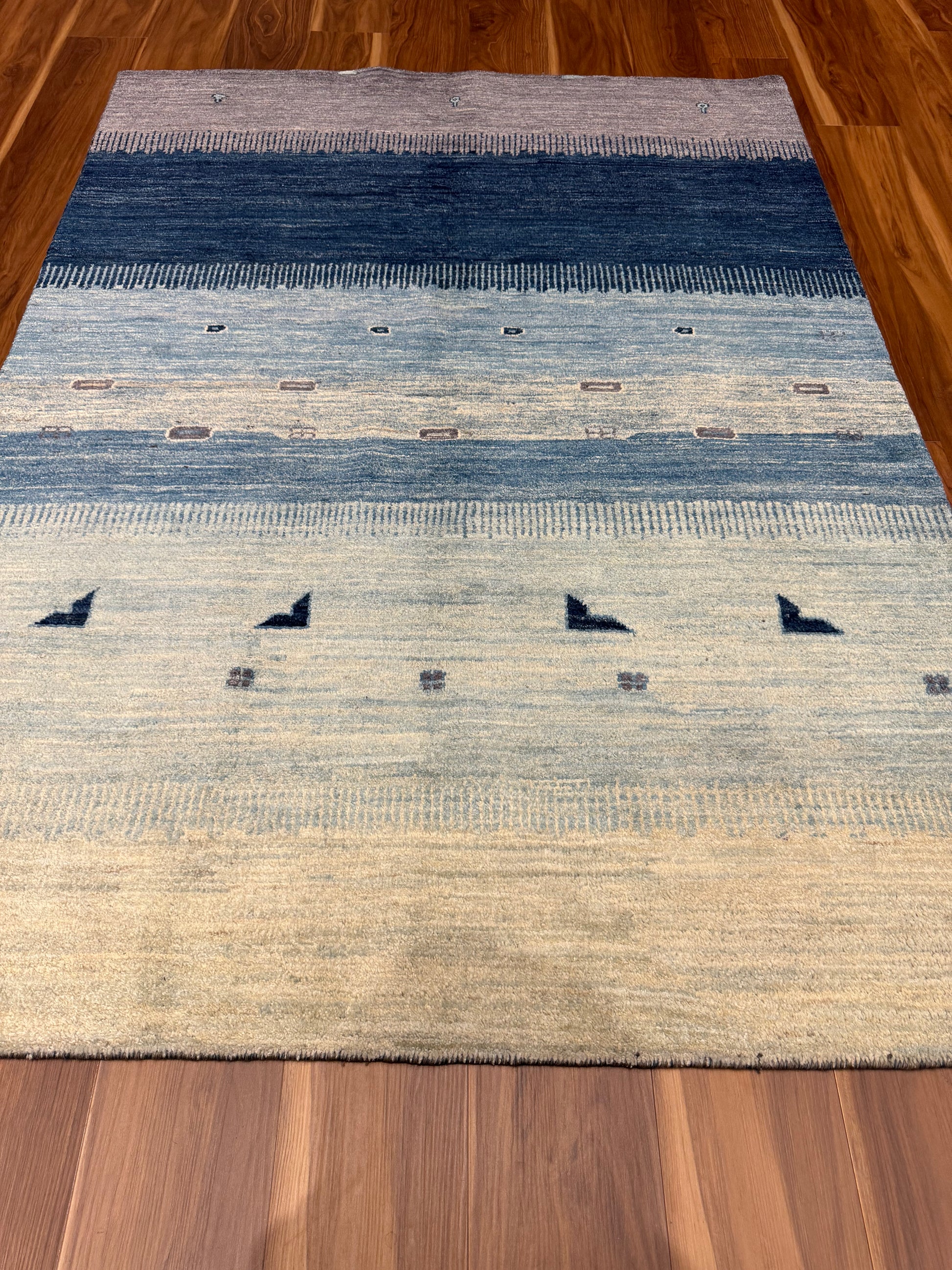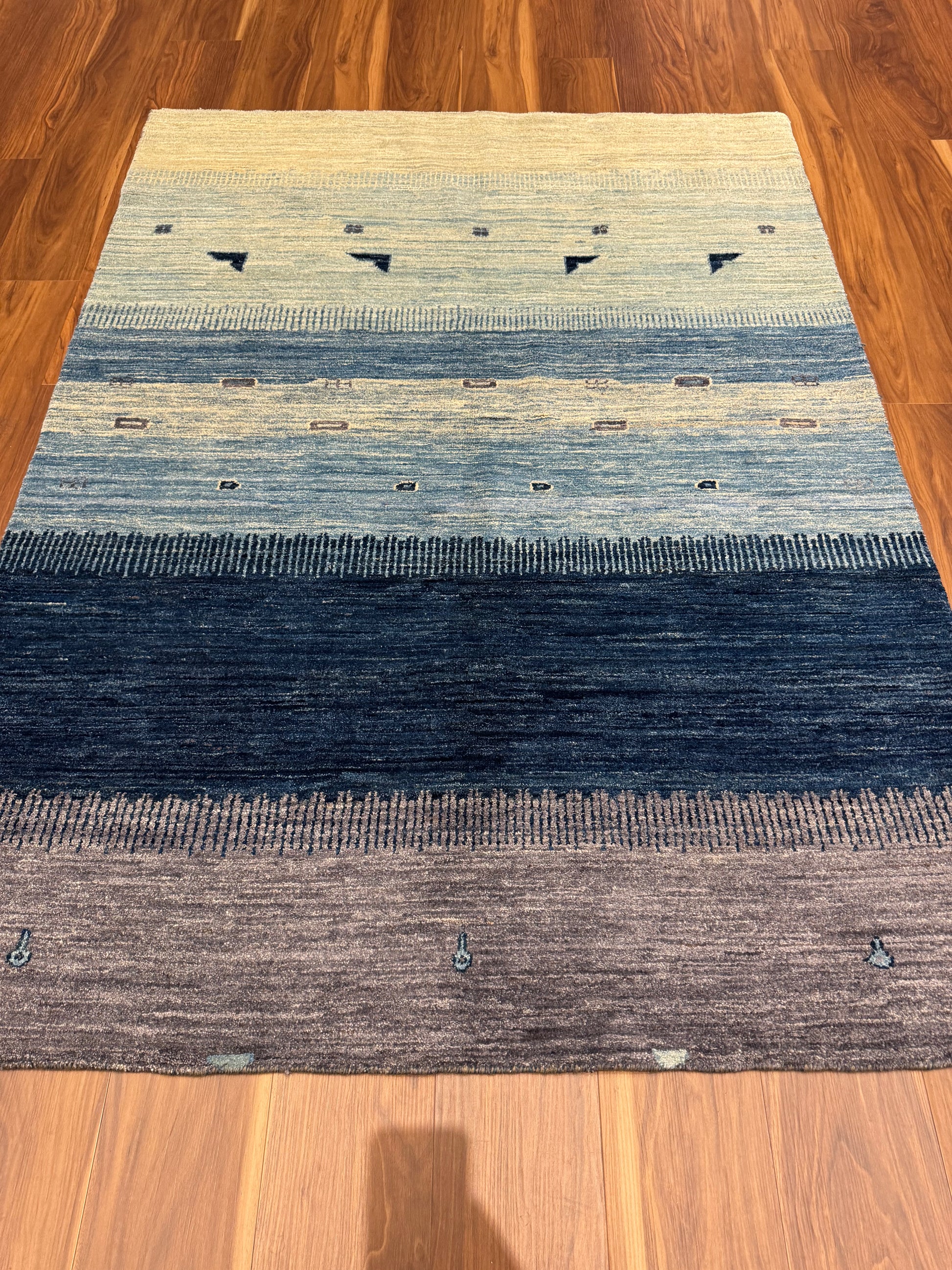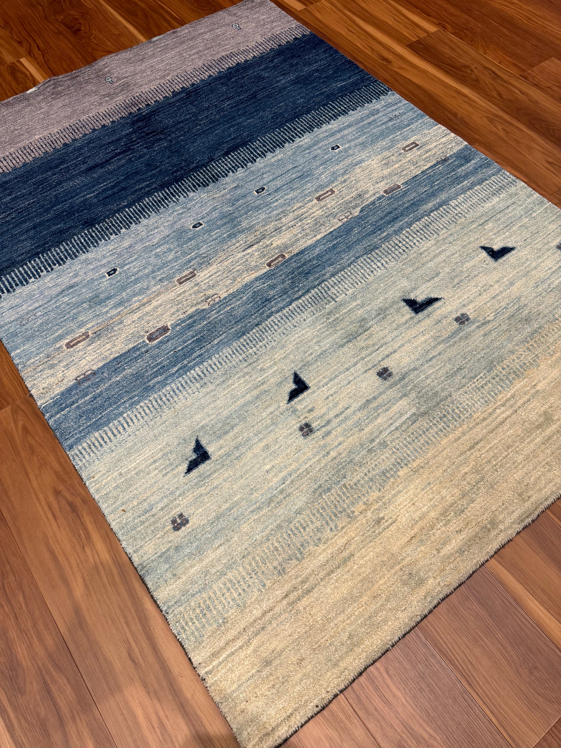 This exquisite Modern rug is a masterpiece of contemporary design, merging a blend of beige, navy blue, and earthy tones. Crafted from high-quality wool, it showcases an abstract theme that features minimalist patterns and organic motifs. The rug’s gradient effect combined with linear elements and subtle geometric symbols imparts a sense of depth and modern sophistication. This elegantly understated piece will bring a touch of quiet opulence to any space, harmonizing with both modern and traditional decor.