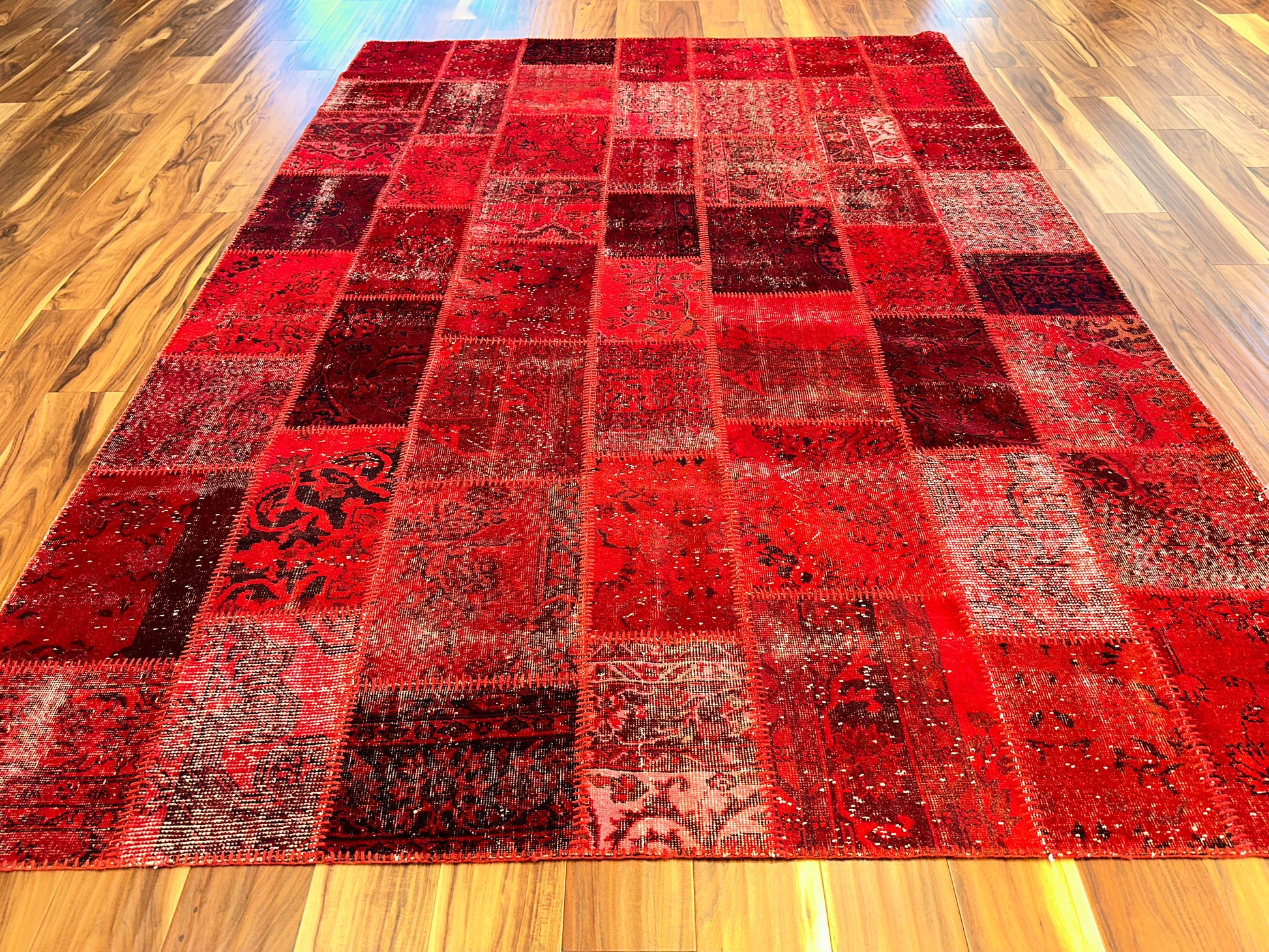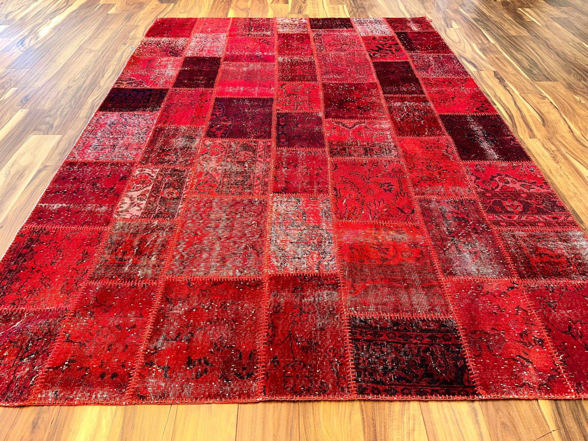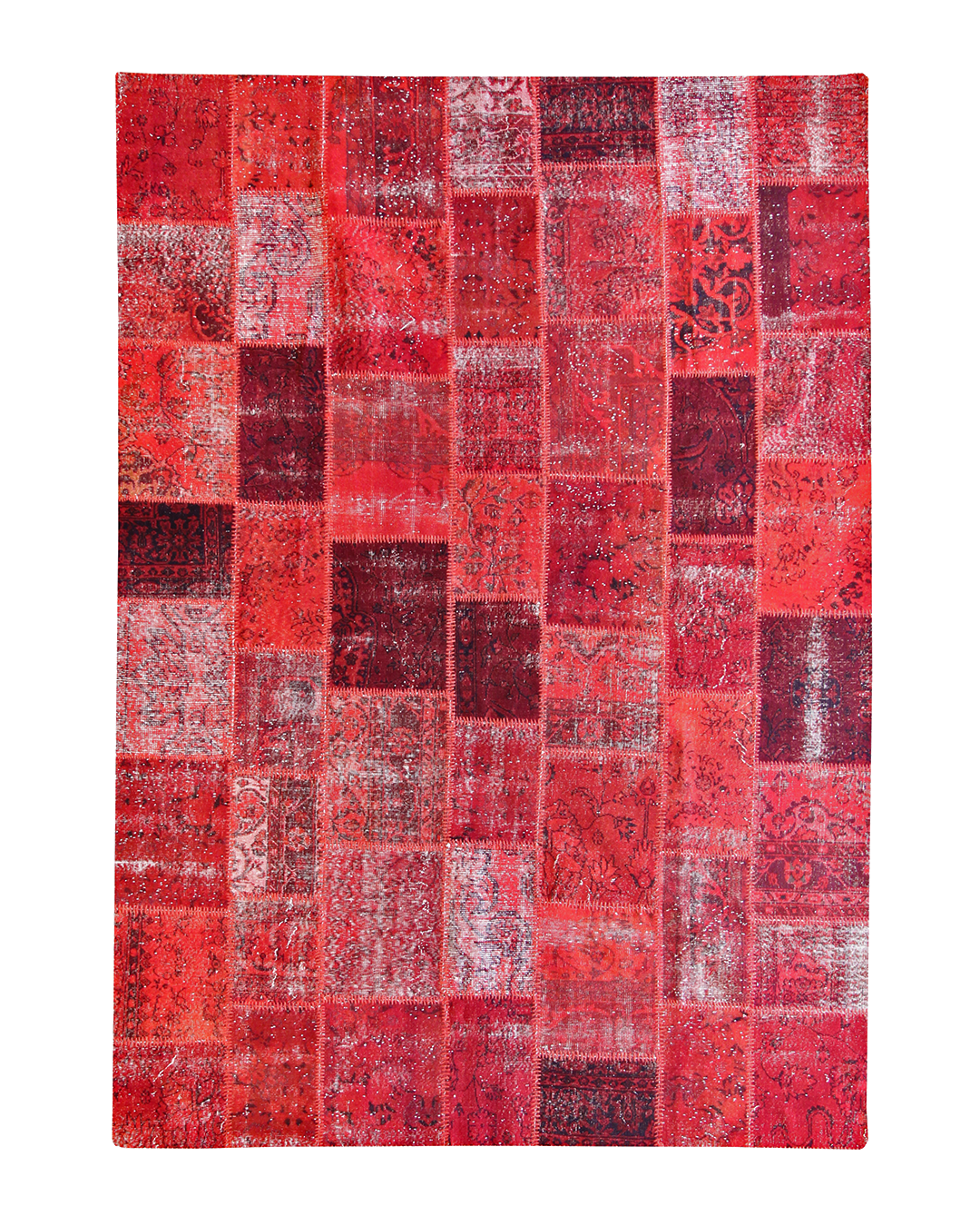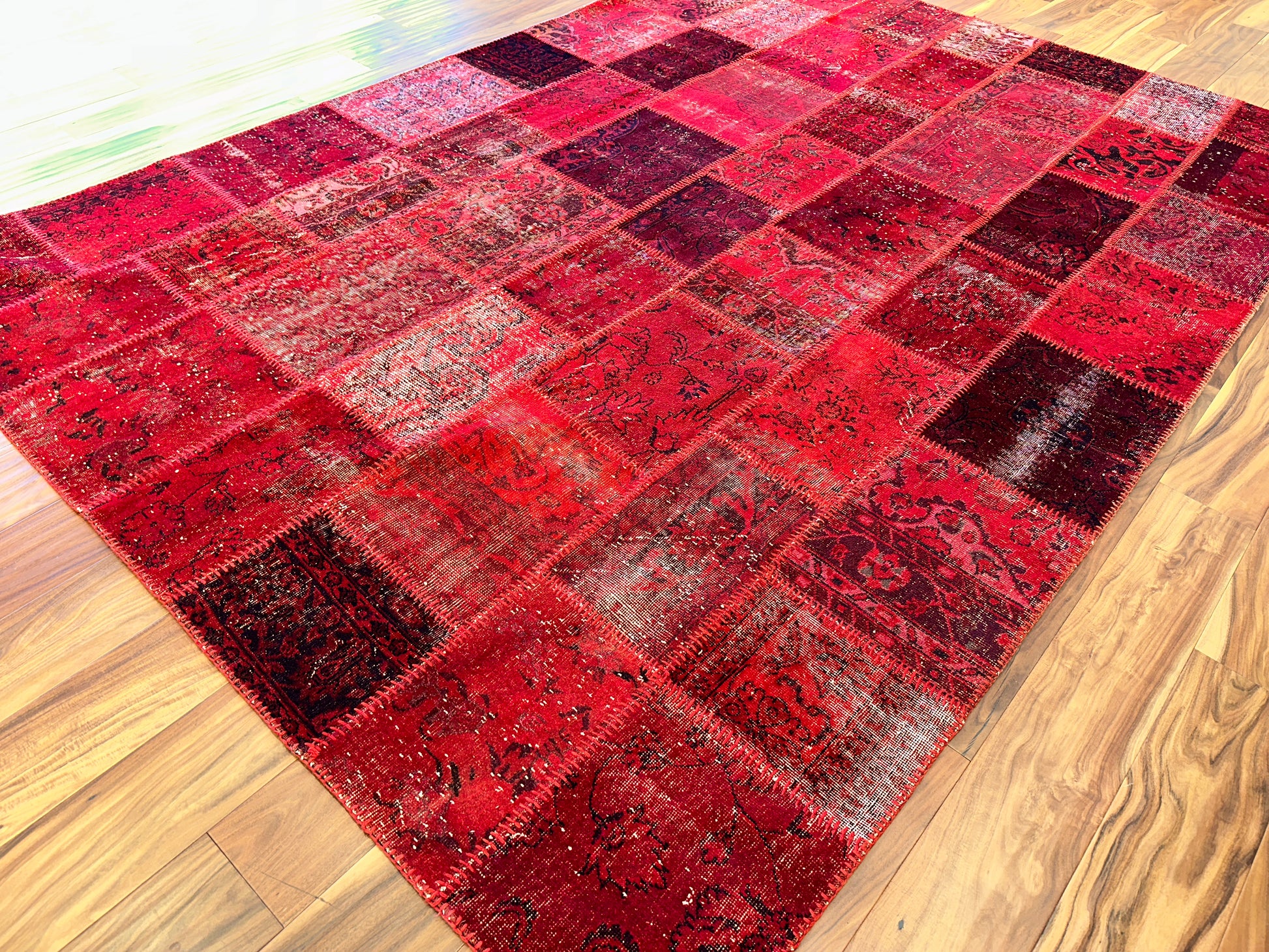 This radiant hand-knotted patchwork rug dazzles with a rich spectrum of red tones—from scarlet to deep burgundy—woven together in a striking mosaic of vintage fragments. Traditional floral and medallion motifs peek through the worn textures, unified by meticulous over-dyeing and exposed stitching that celebrates the craftsmanship behind each piece. The result is bold yet nostalgic, ideal for spaces that embrace passion, artistry, and warmth.