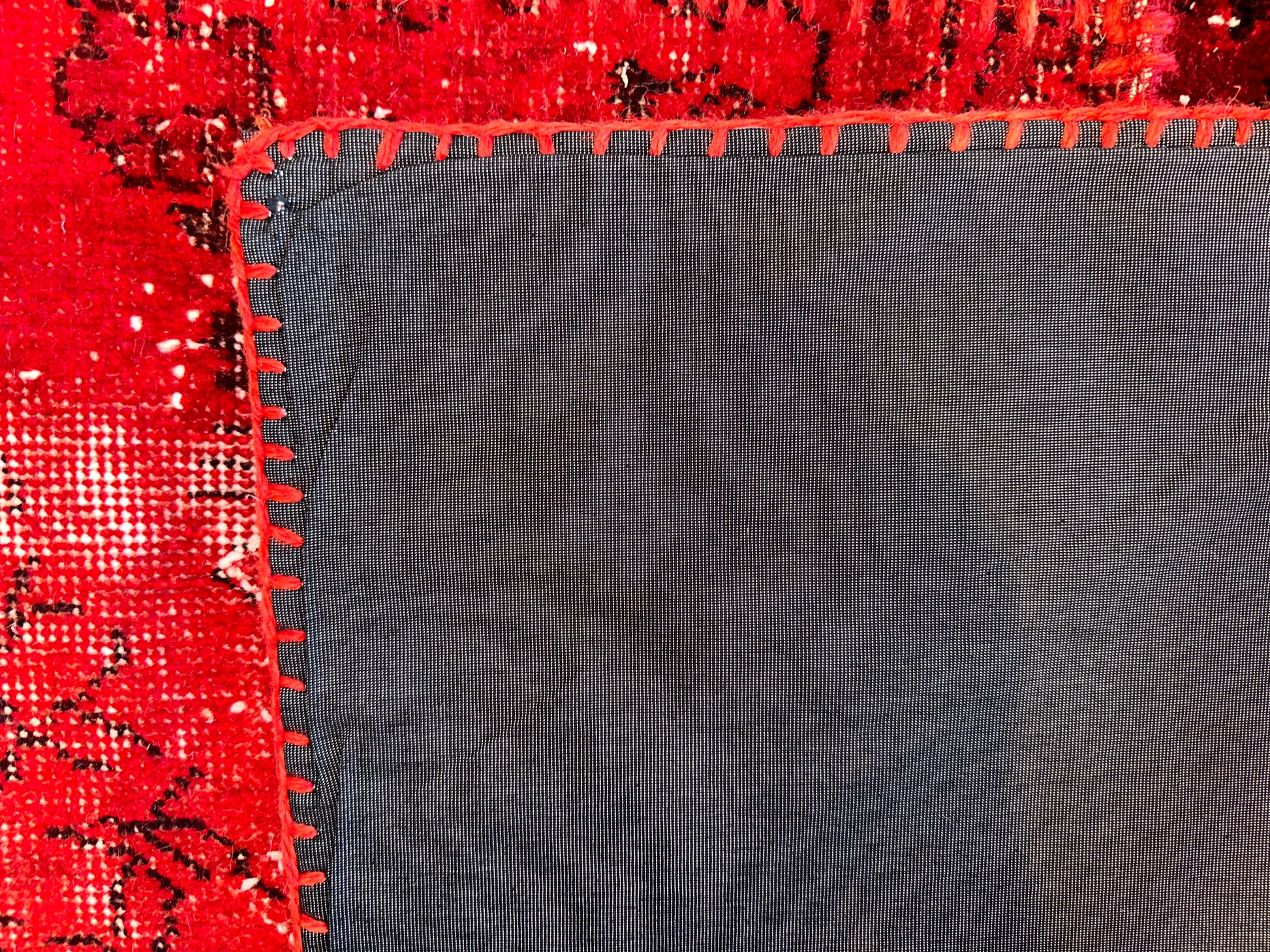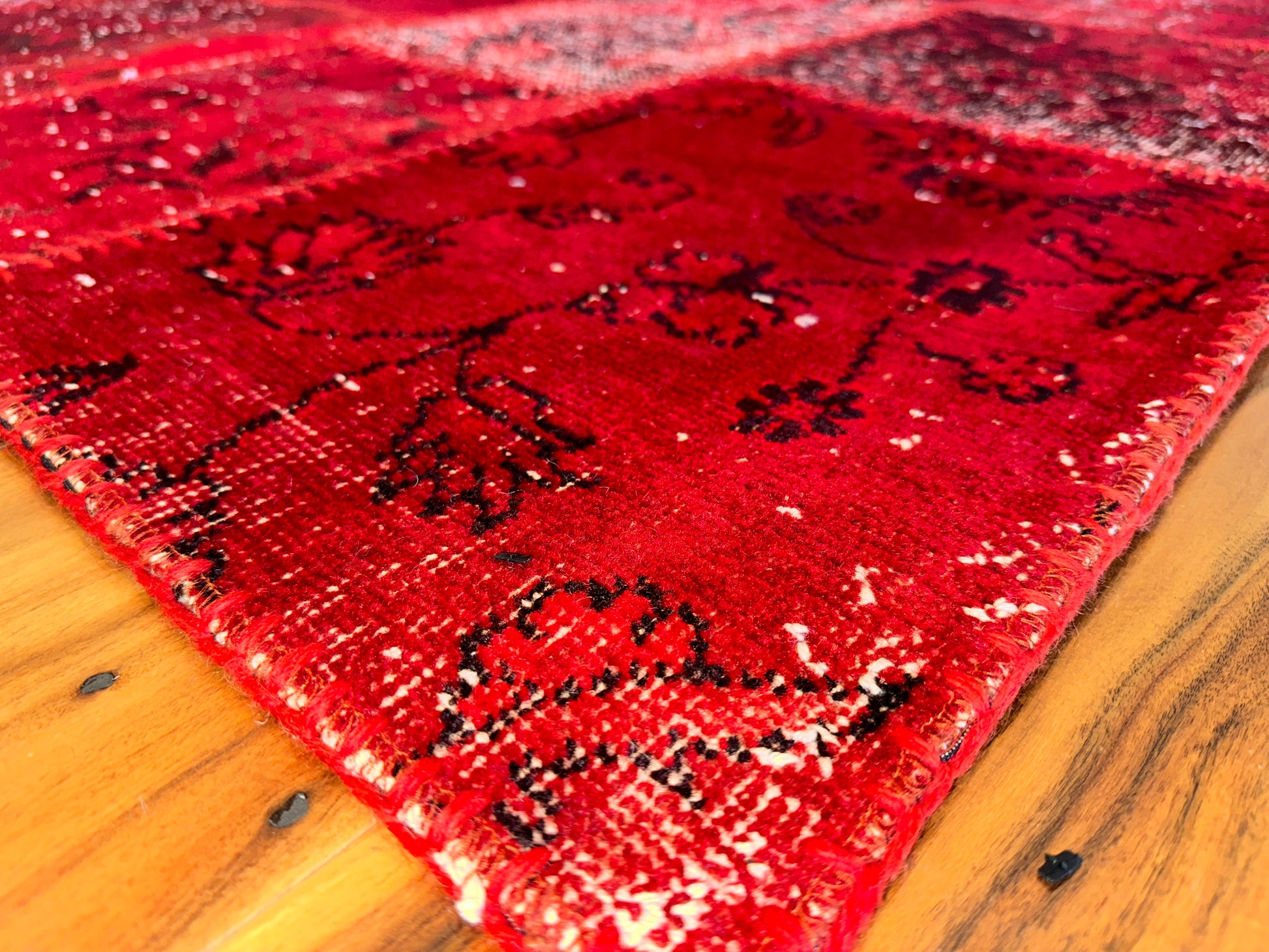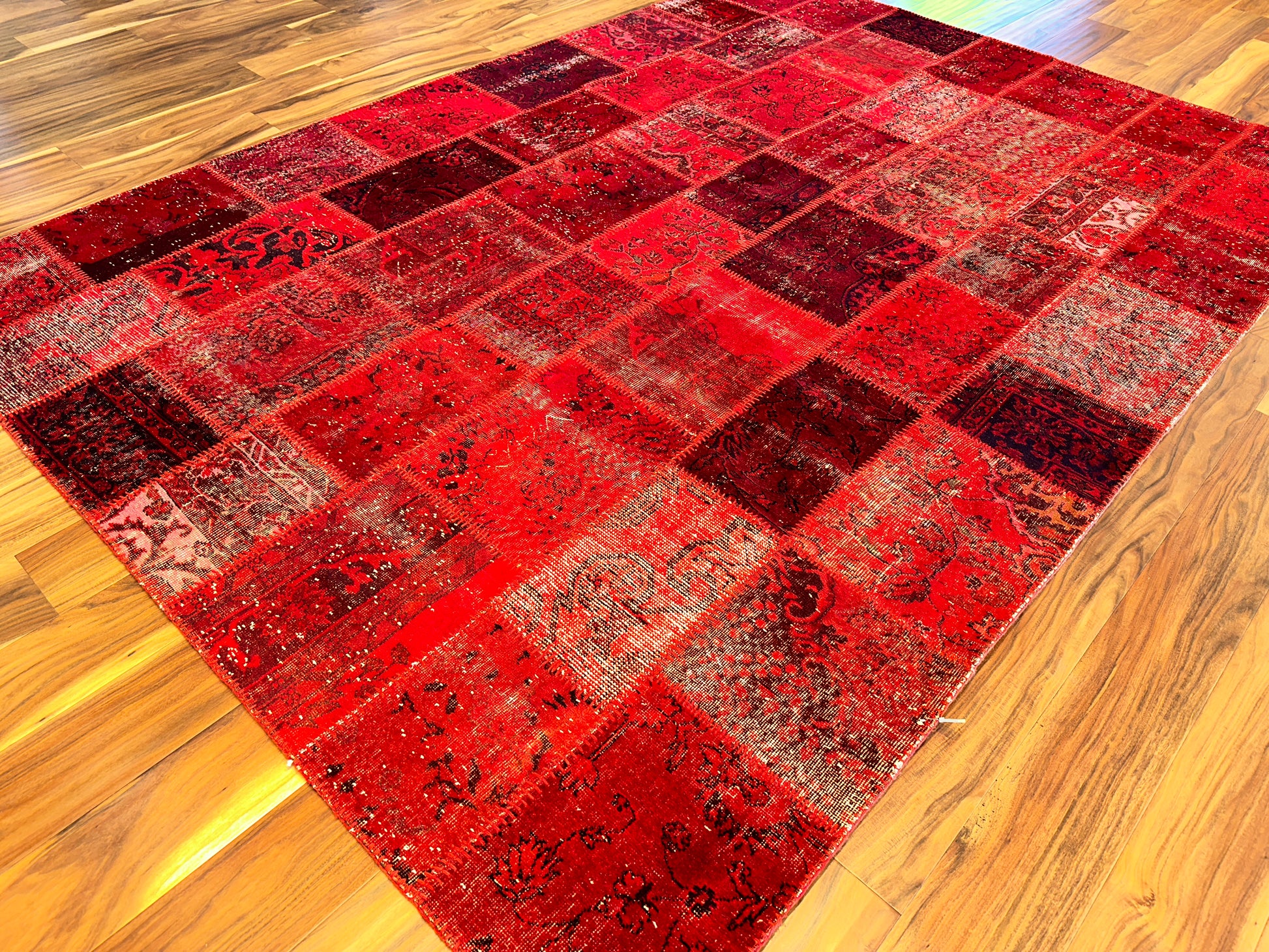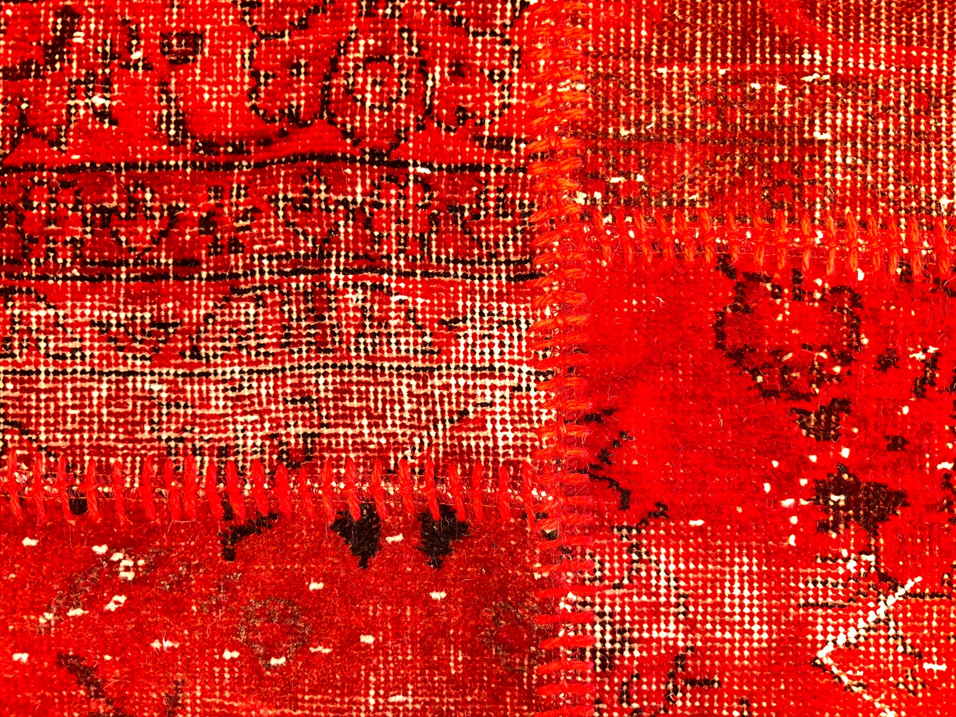 This radiant hand-knotted patchwork rug dazzles with a rich spectrum of red tones—from scarlet to deep burgundy—woven together in a striking mosaic of vintage fragments. Traditional floral and medallion motifs peek through the worn textures, unified by meticulous over-dyeing and exposed stitching that celebrates the craftsmanship behind each piece. The result is bold yet nostalgic, ideal for spaces that embrace passion, artistry, and warmth.