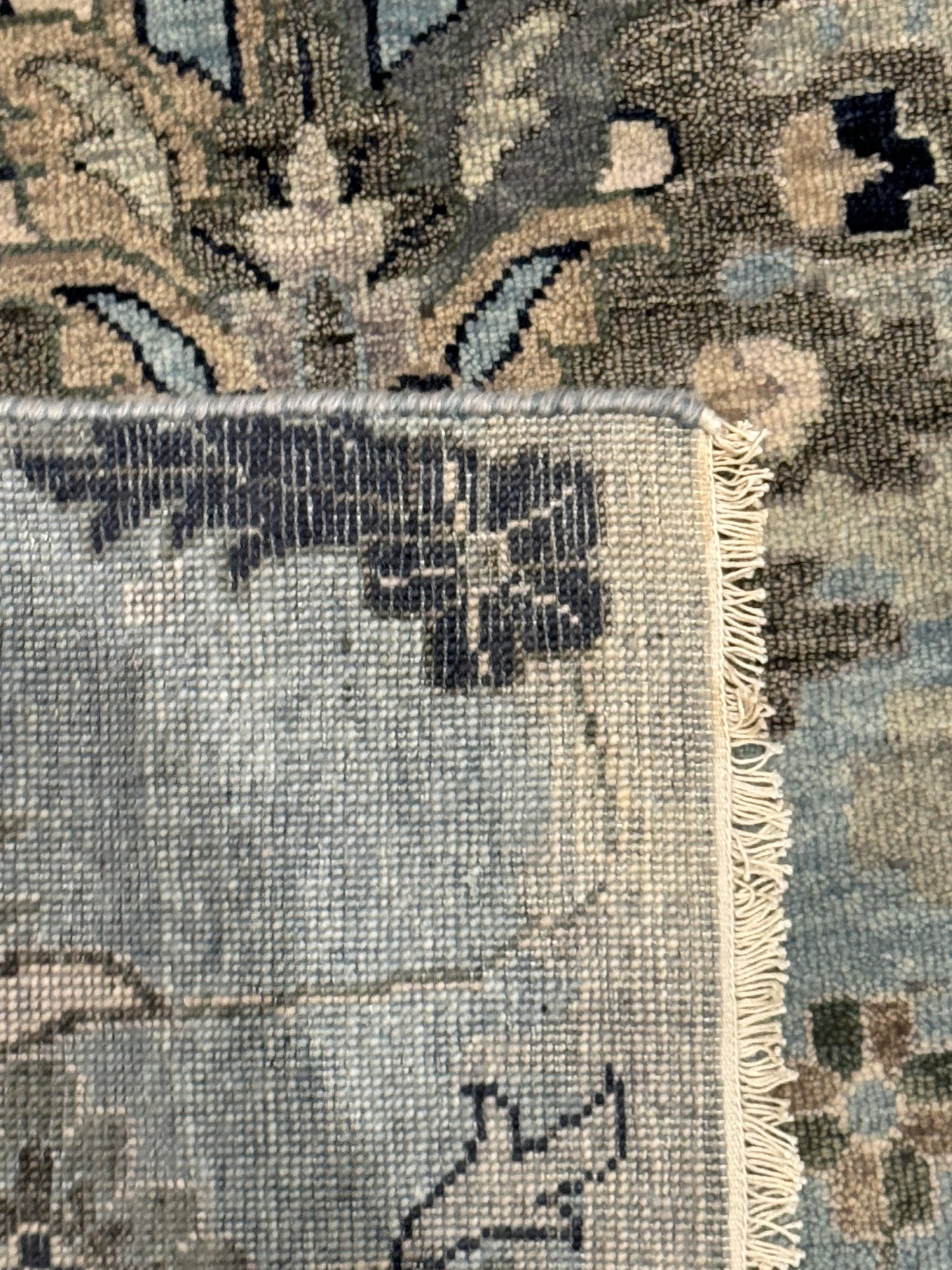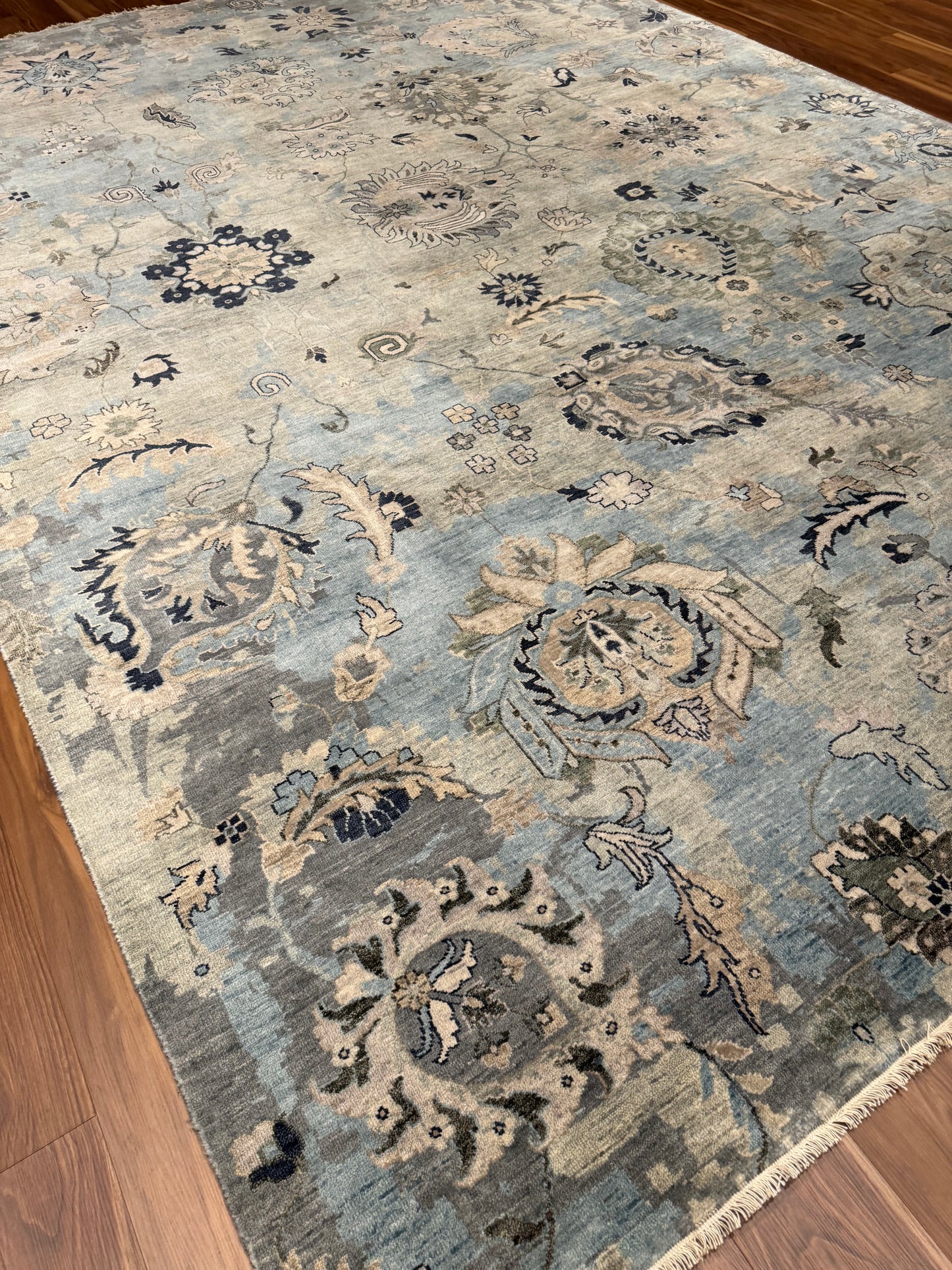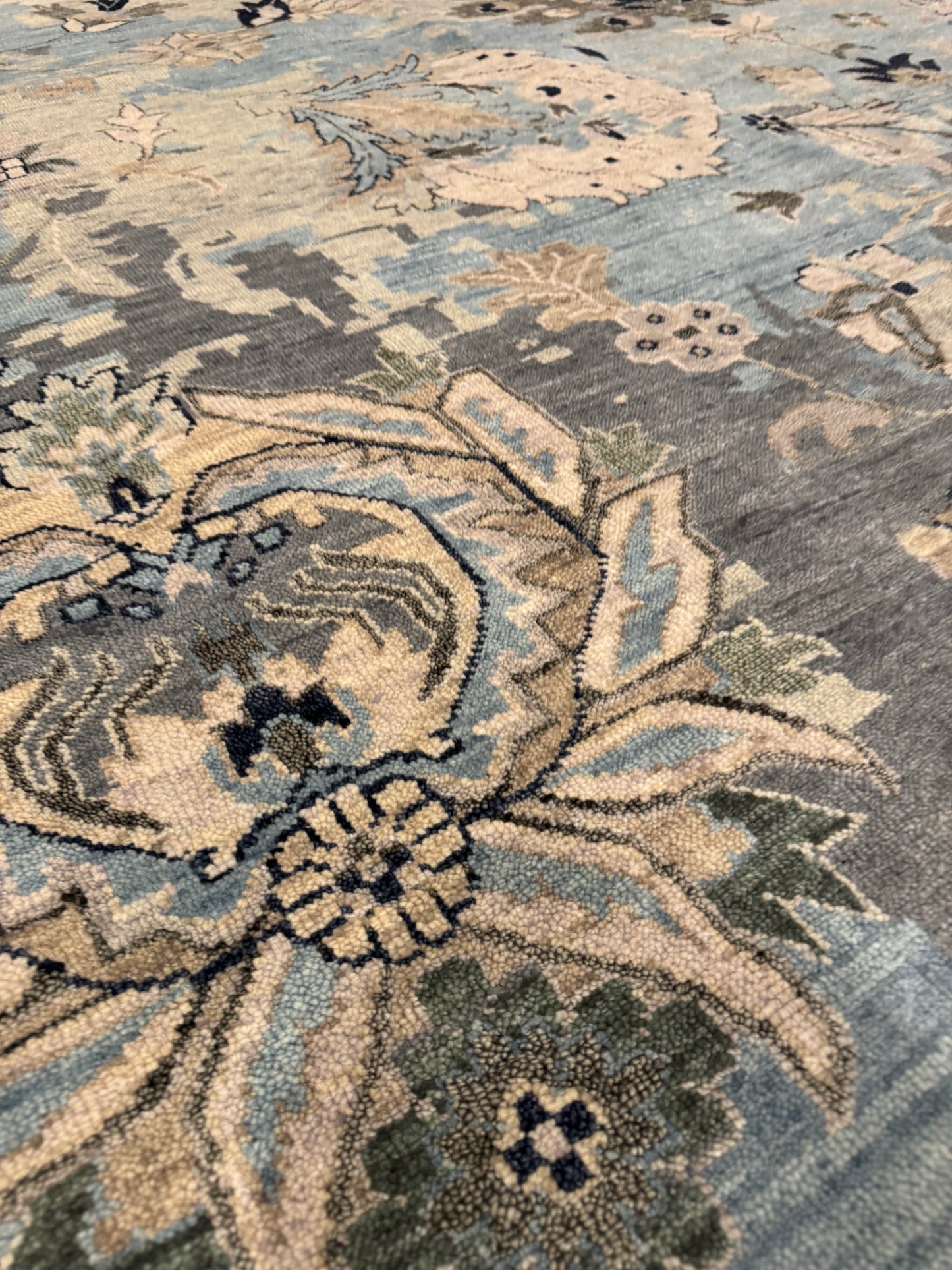 This exquisite Modern Serapi rug showcases a fusion of time-honored design and contemporary color palette. The piece features intricate floral and botanical motifs evenly dispersed across a muted beige and taupe field. Handcrafted from a blend of wool and silk, the rug offers luxurious softness and a subtle sheen that enhances its sophisticated aesthetic. Its durability and plush texture make it ideal for adding warmth and elegance to any living space.