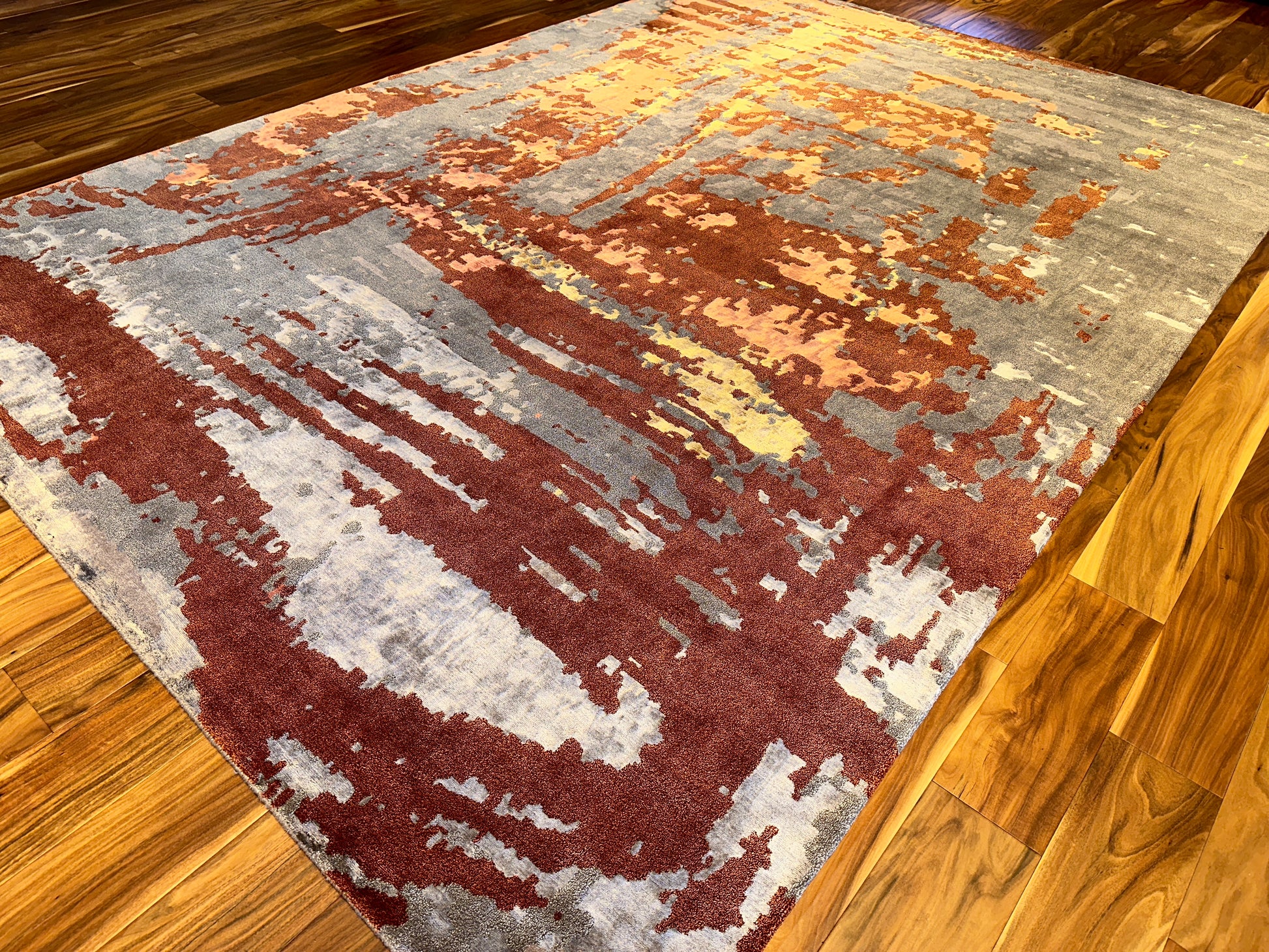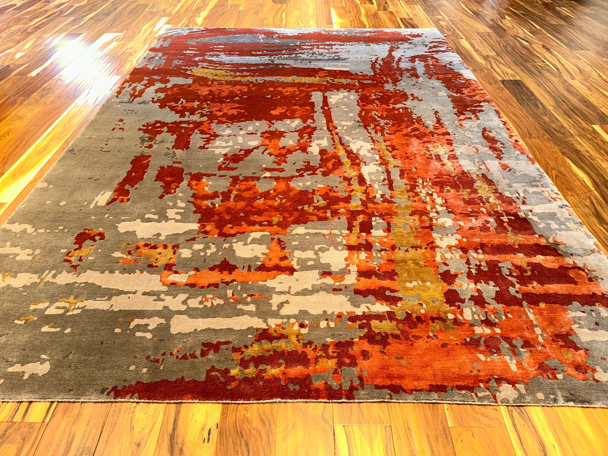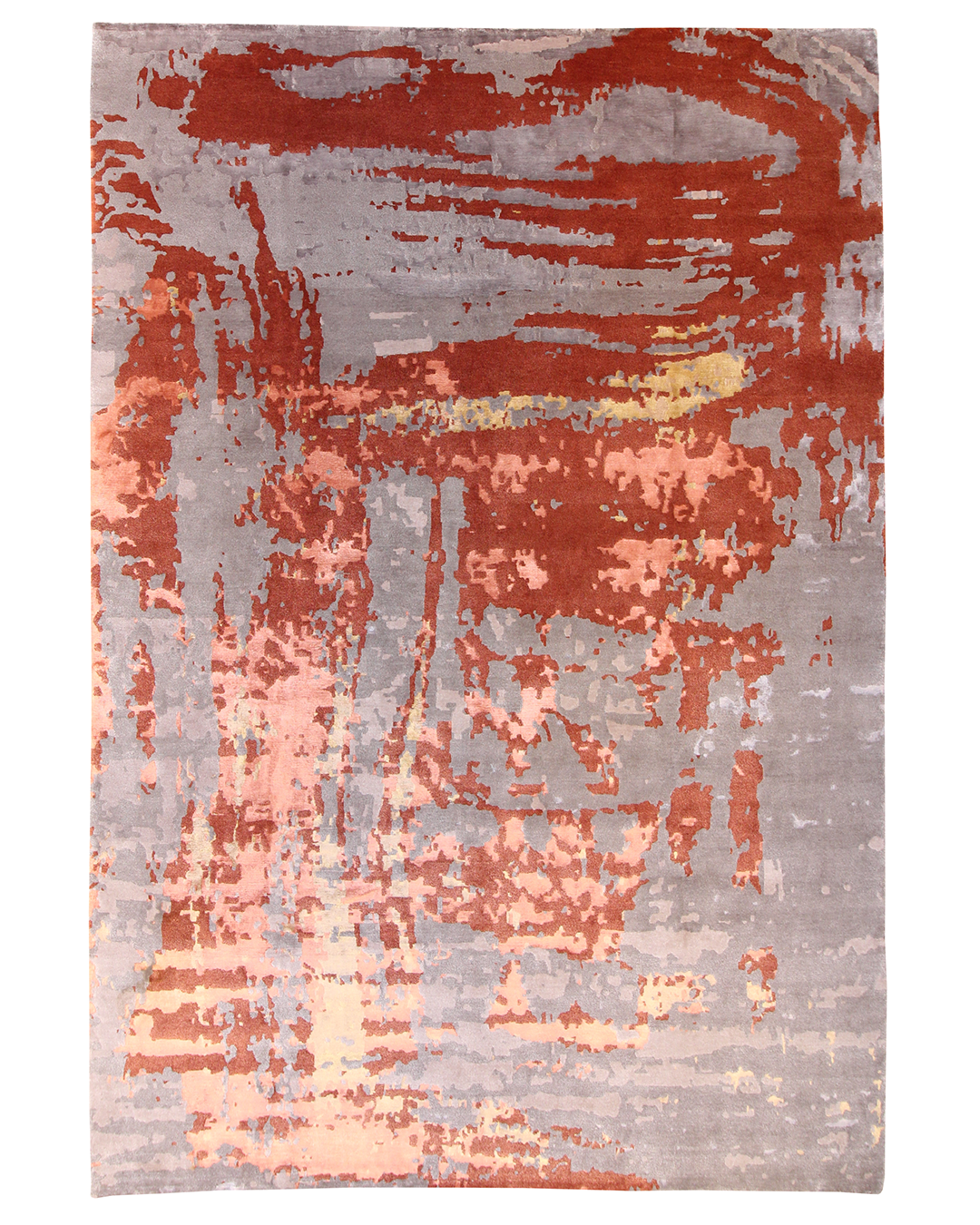 A bold yet balanced statement piece, this handwoven rug captivates with a sweeping display of fiery rust, smoky grey, soft coral, and hints of golden ochre. Its abstract, painterly design mimics the movement of wind and brushstroke across canvas, imbuing a sense of energy while maintaining a refined elegance. Perfect for grounding a contemporary room with warmth and texture.