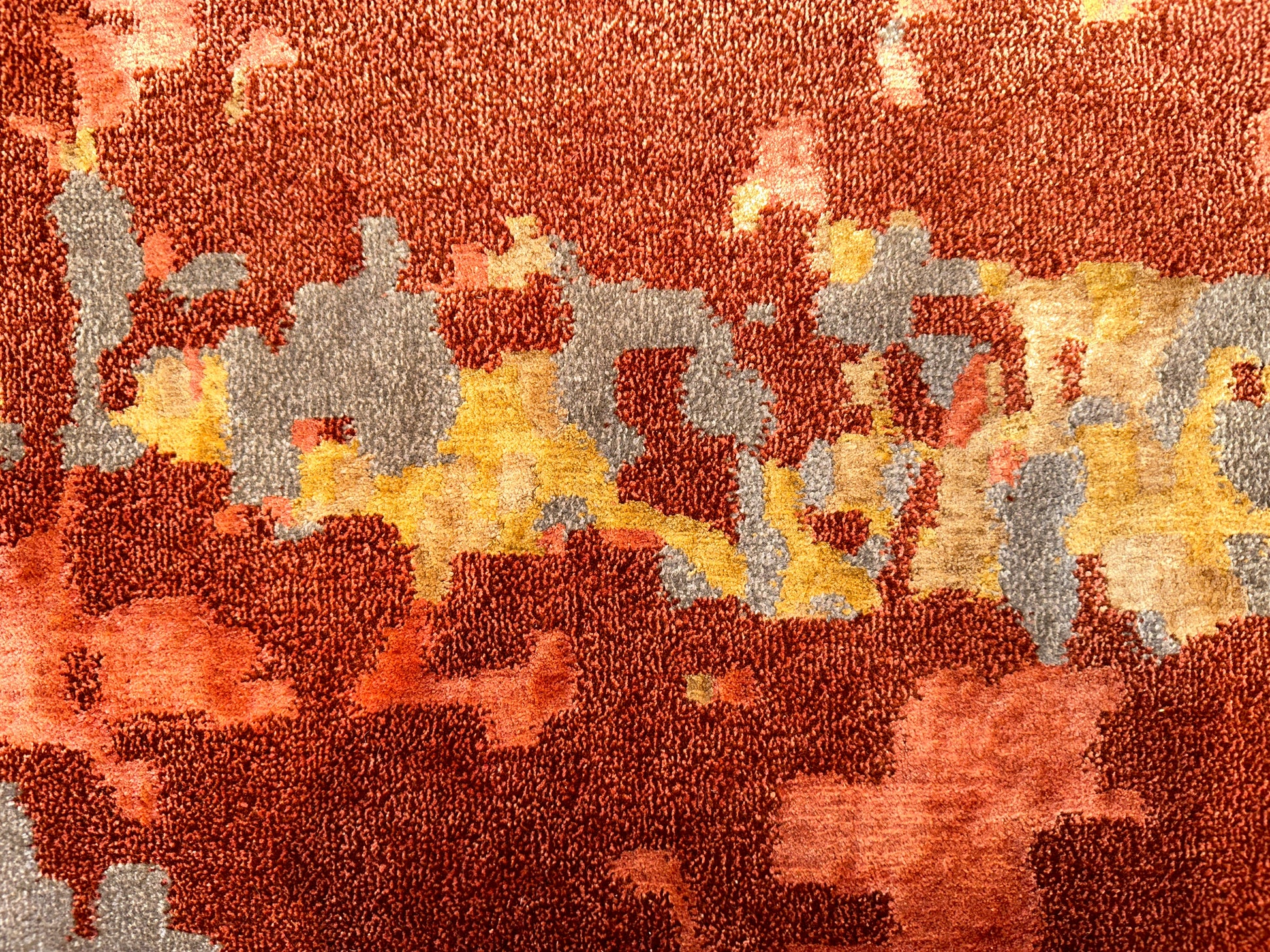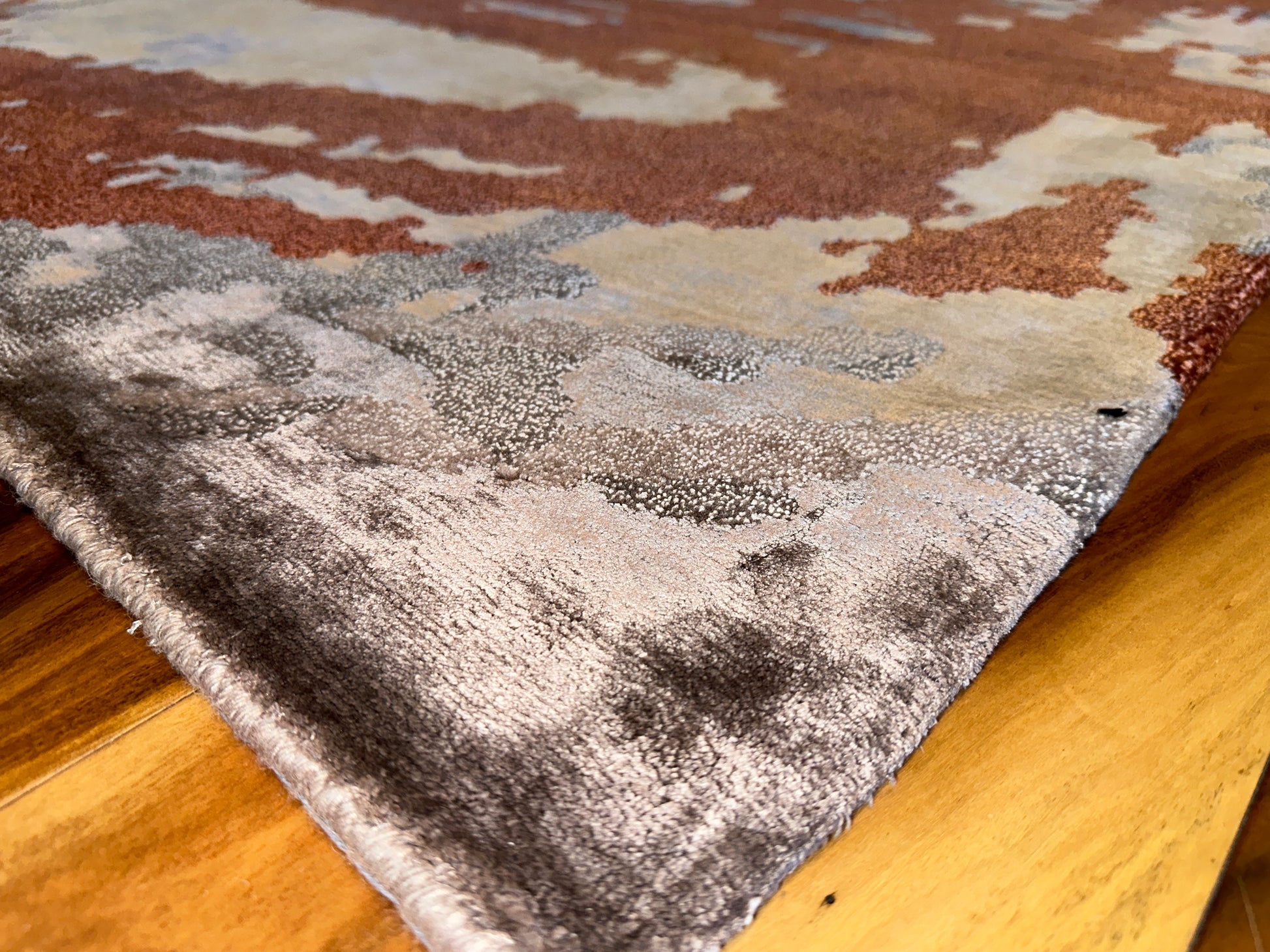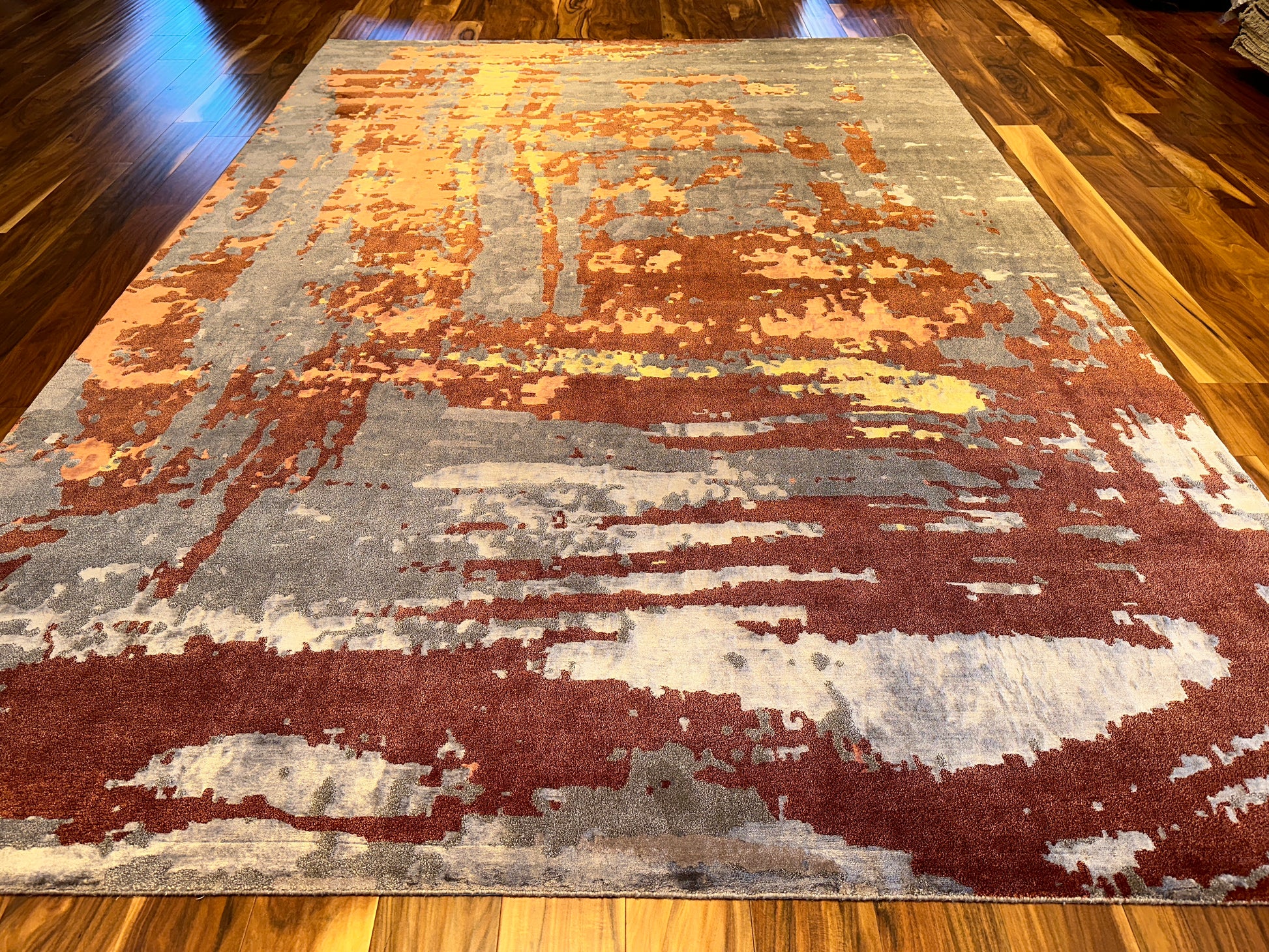 A bold yet balanced statement piece, this handwoven rug captivates with a sweeping display of fiery rust, smoky grey, soft coral, and hints of golden ochre. Its abstract, painterly design mimics the movement of wind and brushstroke across canvas, imbuing a sense of energy while maintaining a refined elegance. Perfect for grounding a contemporary room with warmth and texture.