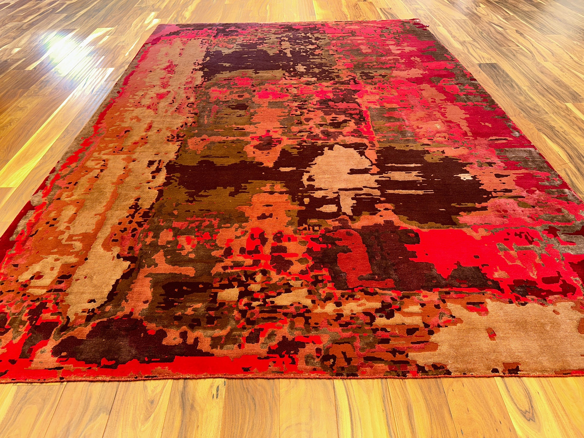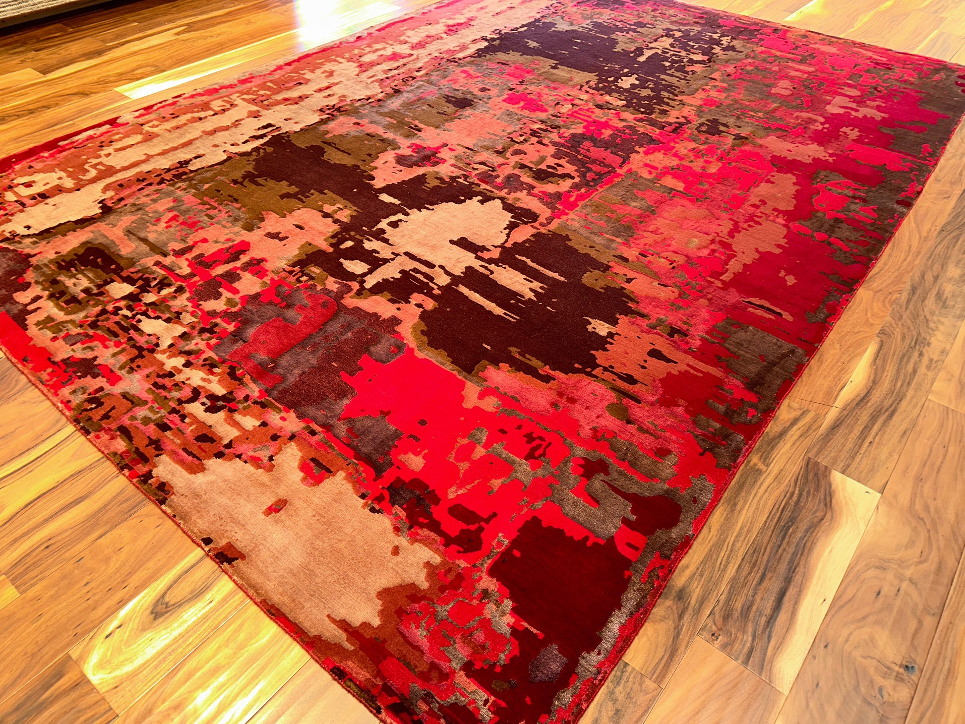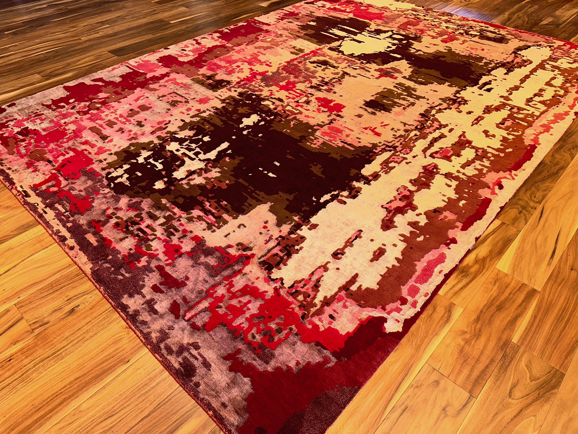 This bold, expressive handwoven rug brings a vibrant surge of energy to any space with its painterly blend of crimson, deep burgundy, clay, blush, and sandstone. The abstract composition flows with layered brushstroke textures, creating a dynamic, almost molten visual rhythm that feels both contemporary and organic. Its rich tones and tonal movement make it a captivating centerpiece, especially suited for modern interiors seeking warmth, depth, and dramatic presence.