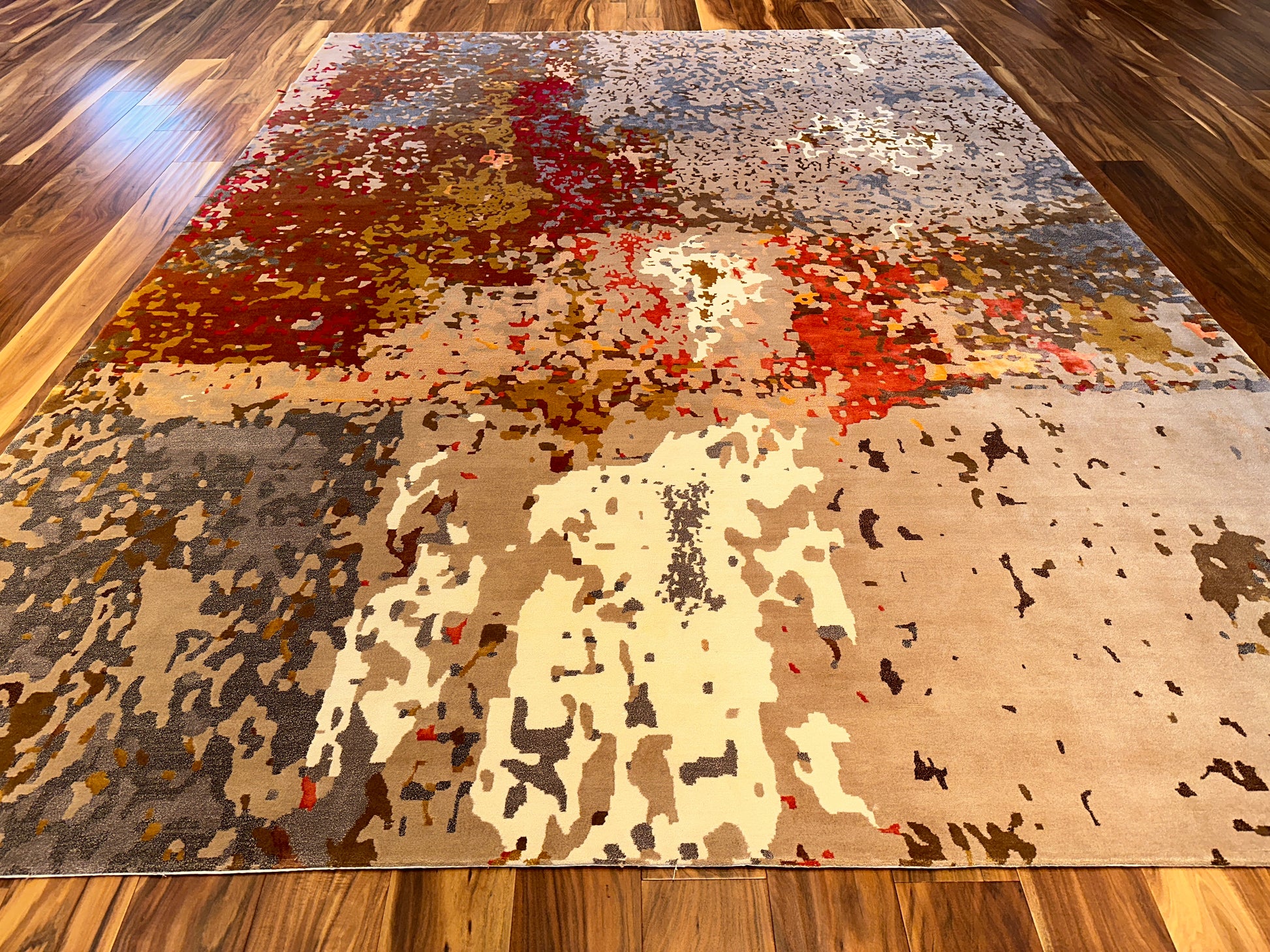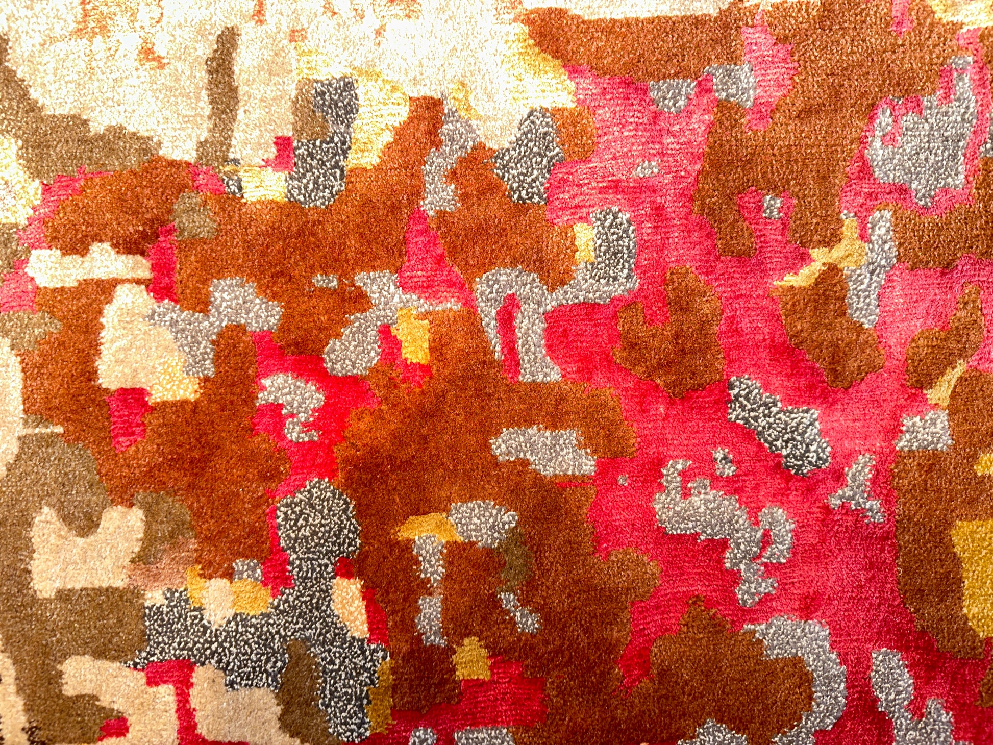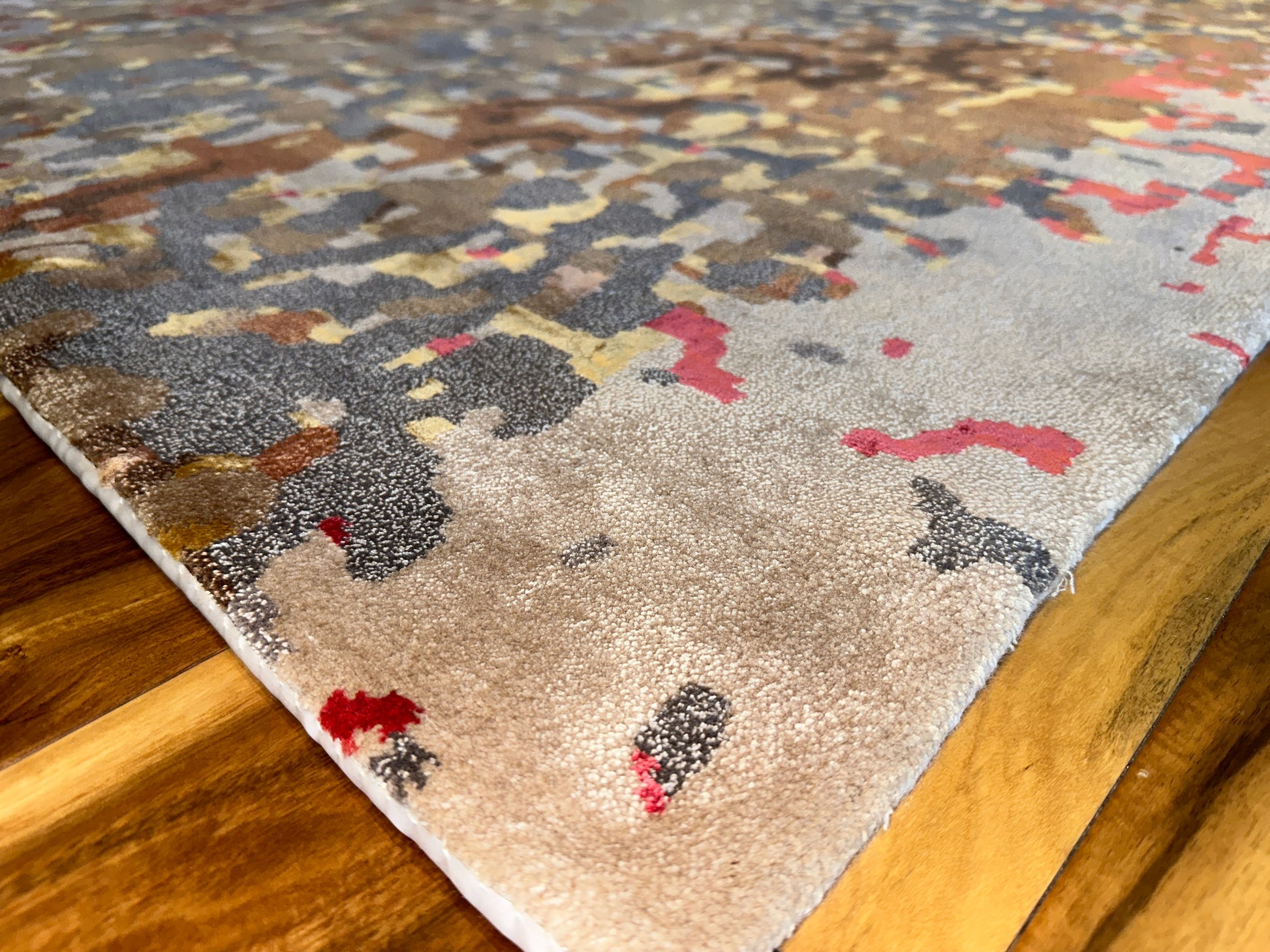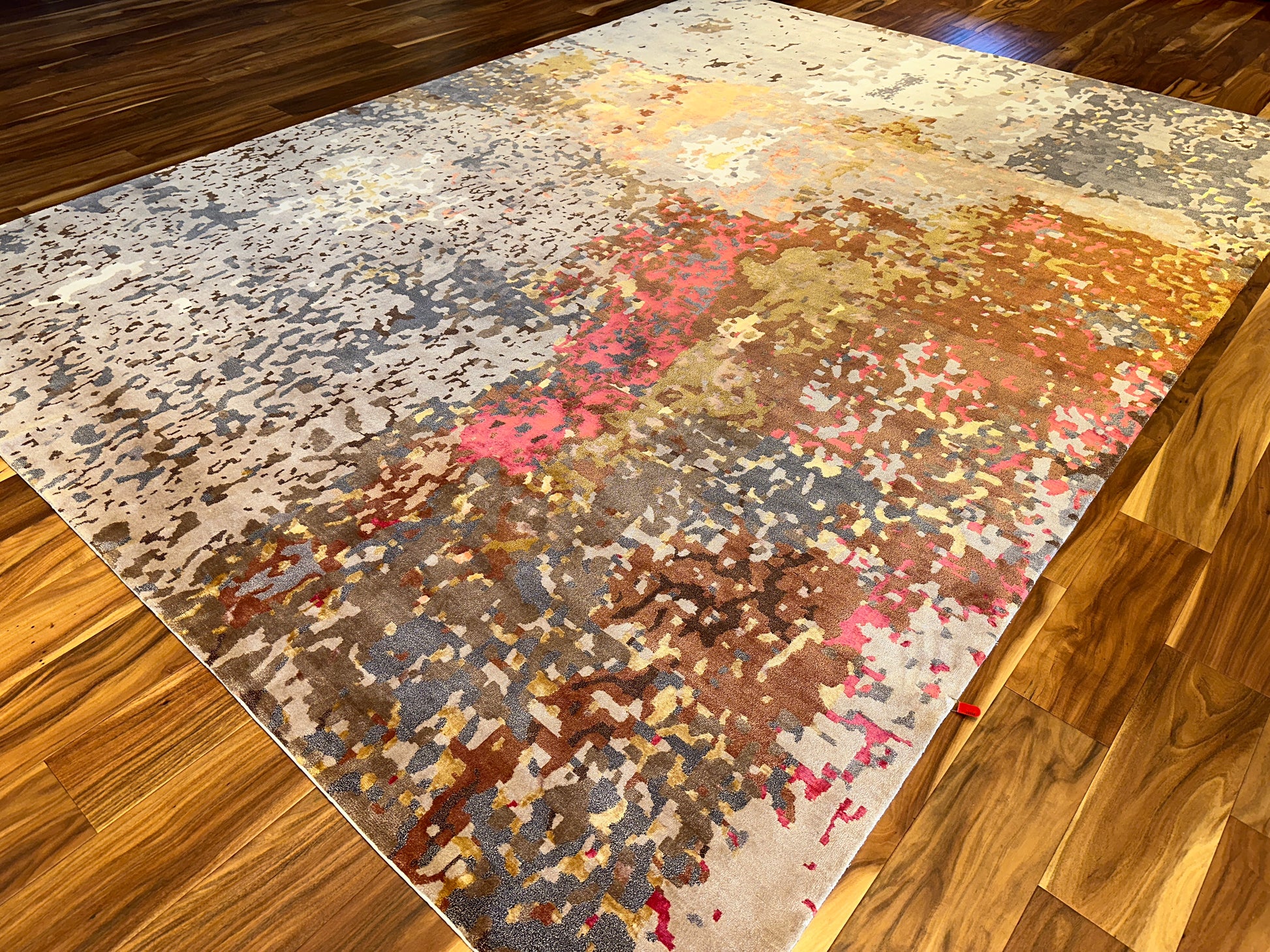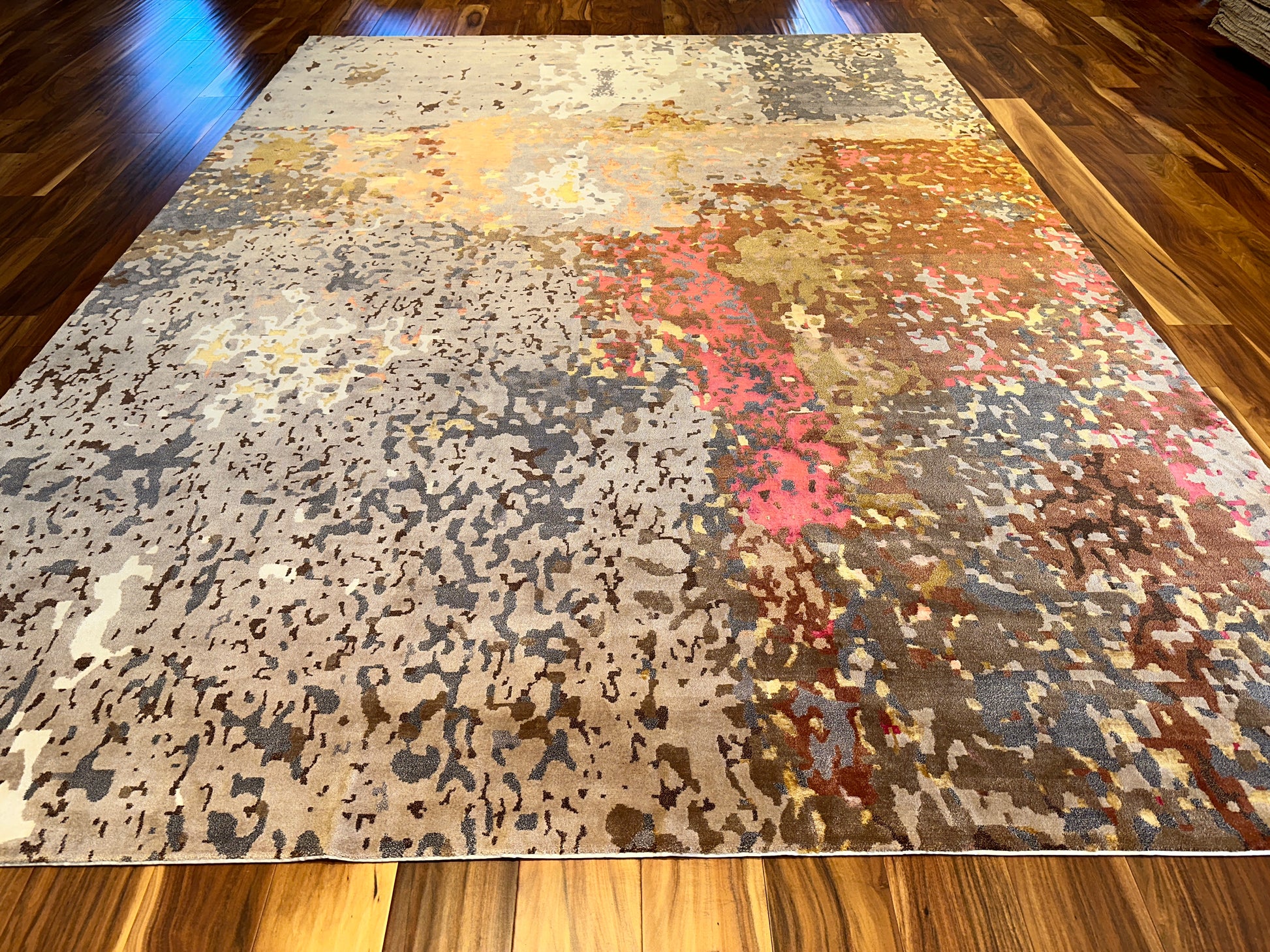 Alive with vibrant energy, this contemporary rug radiates a sense of movement through its layered abstract composition. Bursts of coral, saffron, ochre, and smoke blue ripple across a soft neutral base, giving the appearance of dynamic color play caught in motion. Its painterly quality adds drama while maintaining elegance, perfect for anchoring modern interiors with personality and warmth.