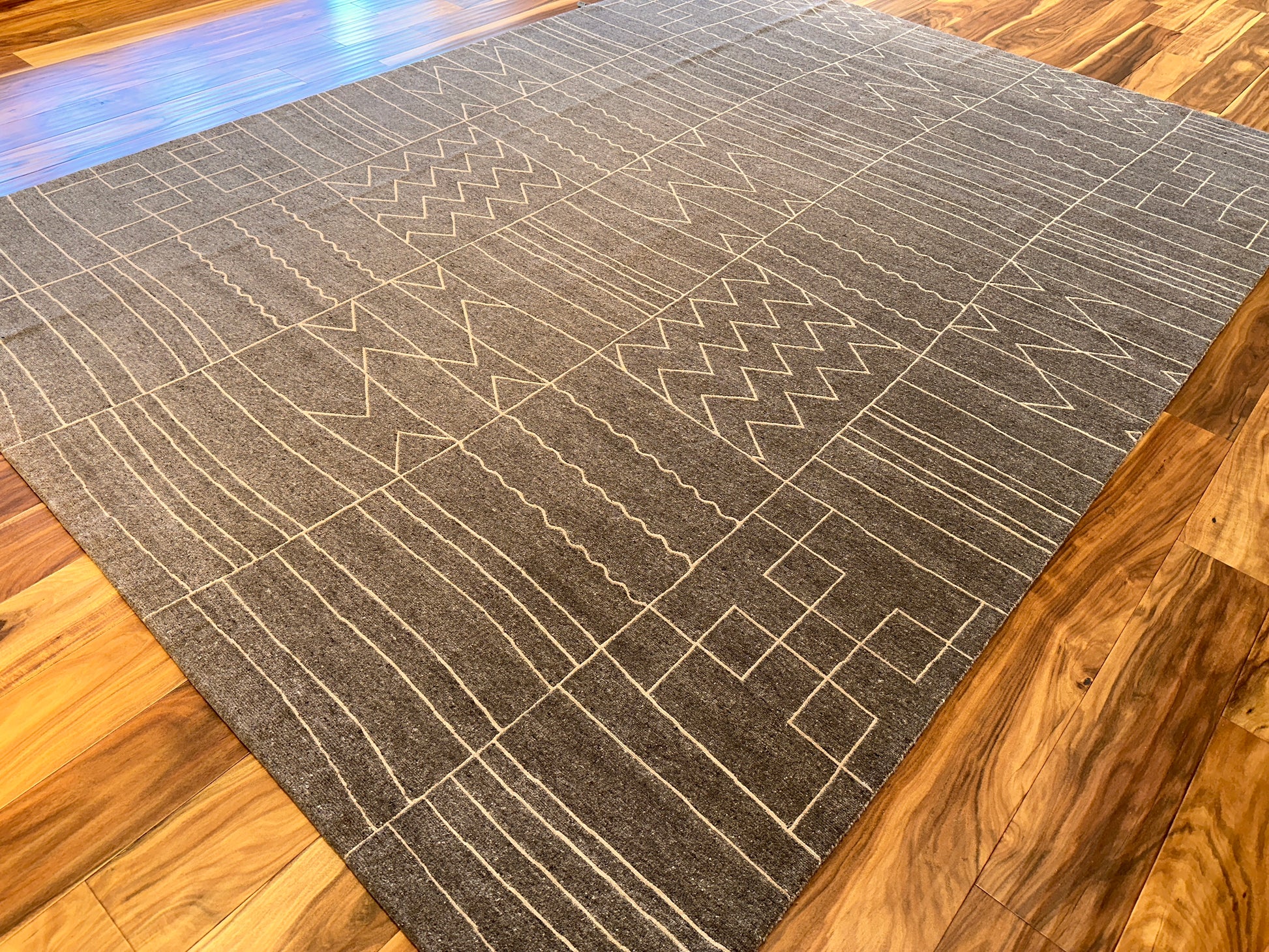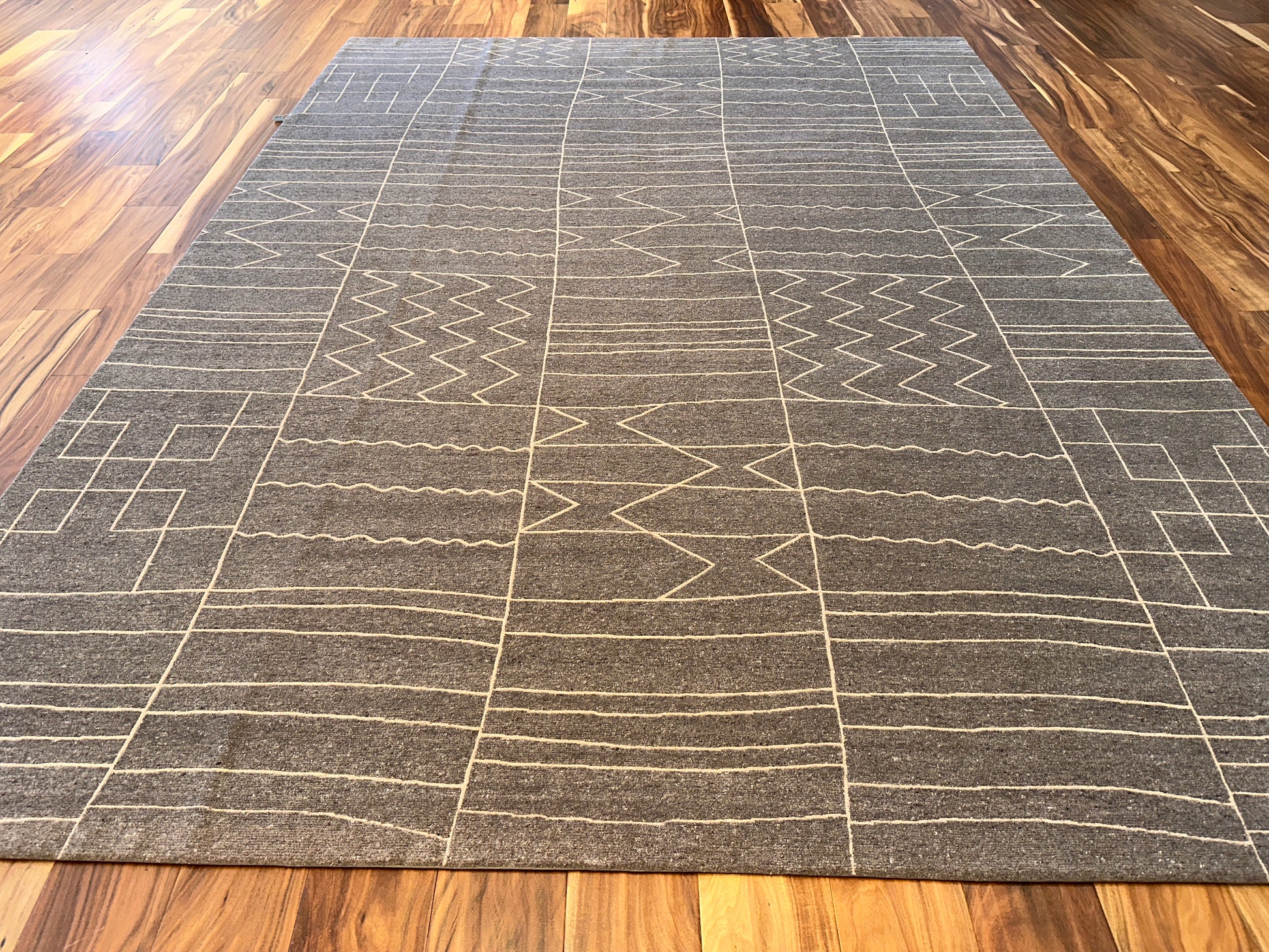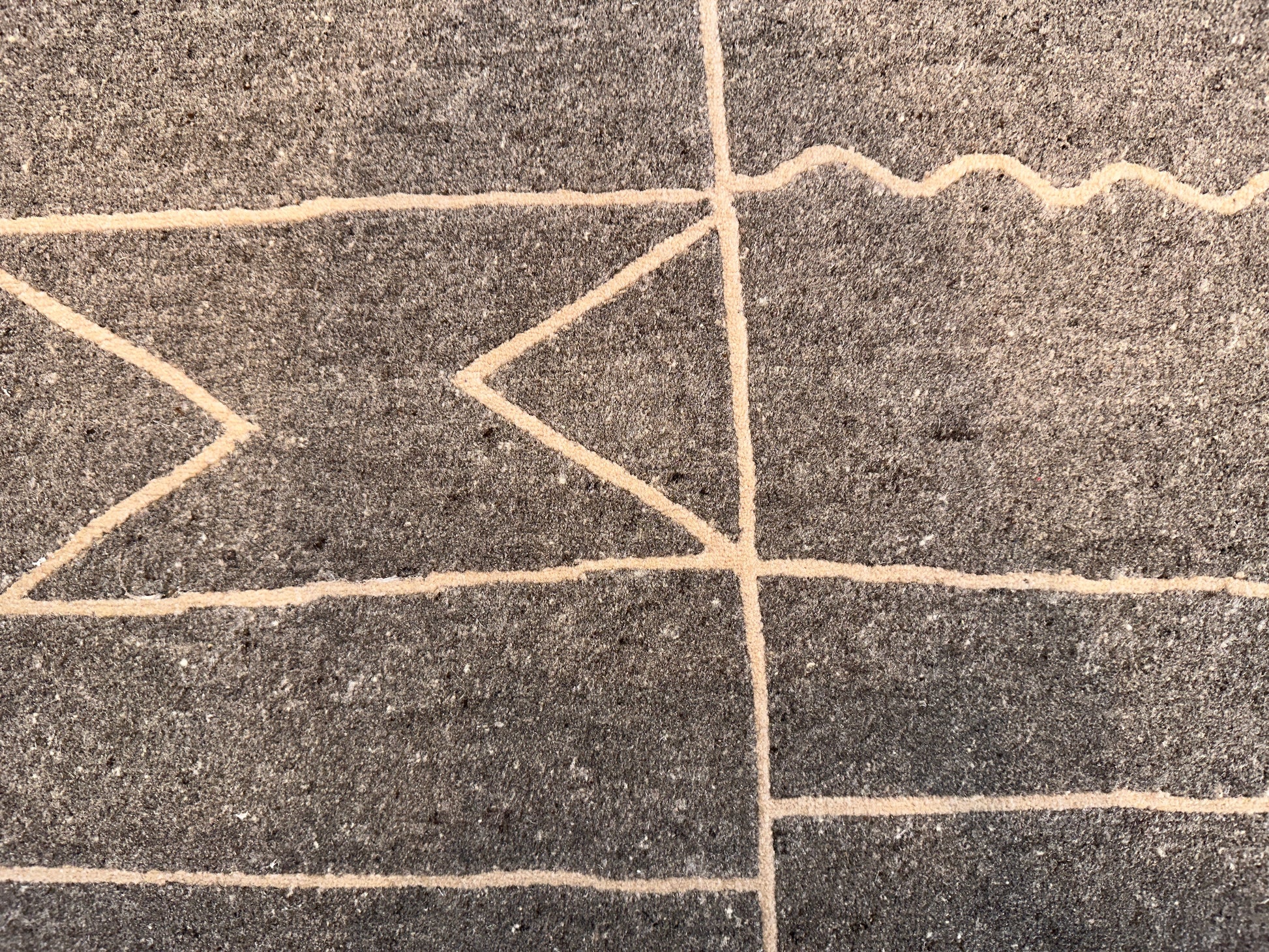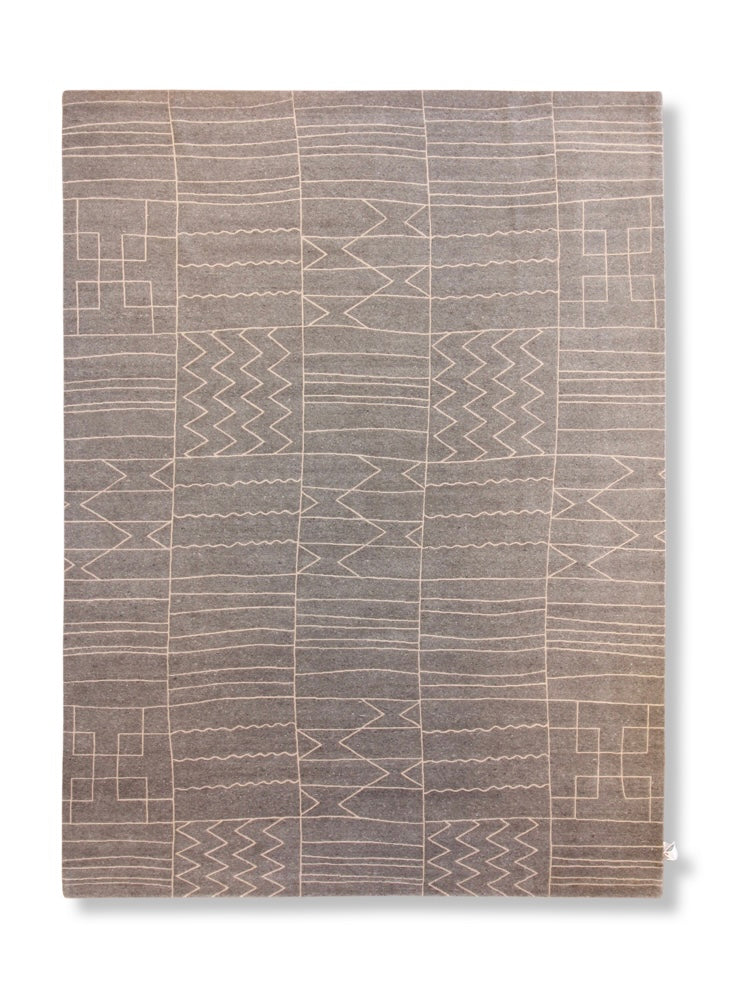 This rug brings modern rhythm to your space with its minimalist geometric grid. It features an abstract pattern of zigzags, waves, and arrows etched across a muted charcoal field. The natural texture of wool enhances its clean, architectural look while adding warmth and softness underfoot.