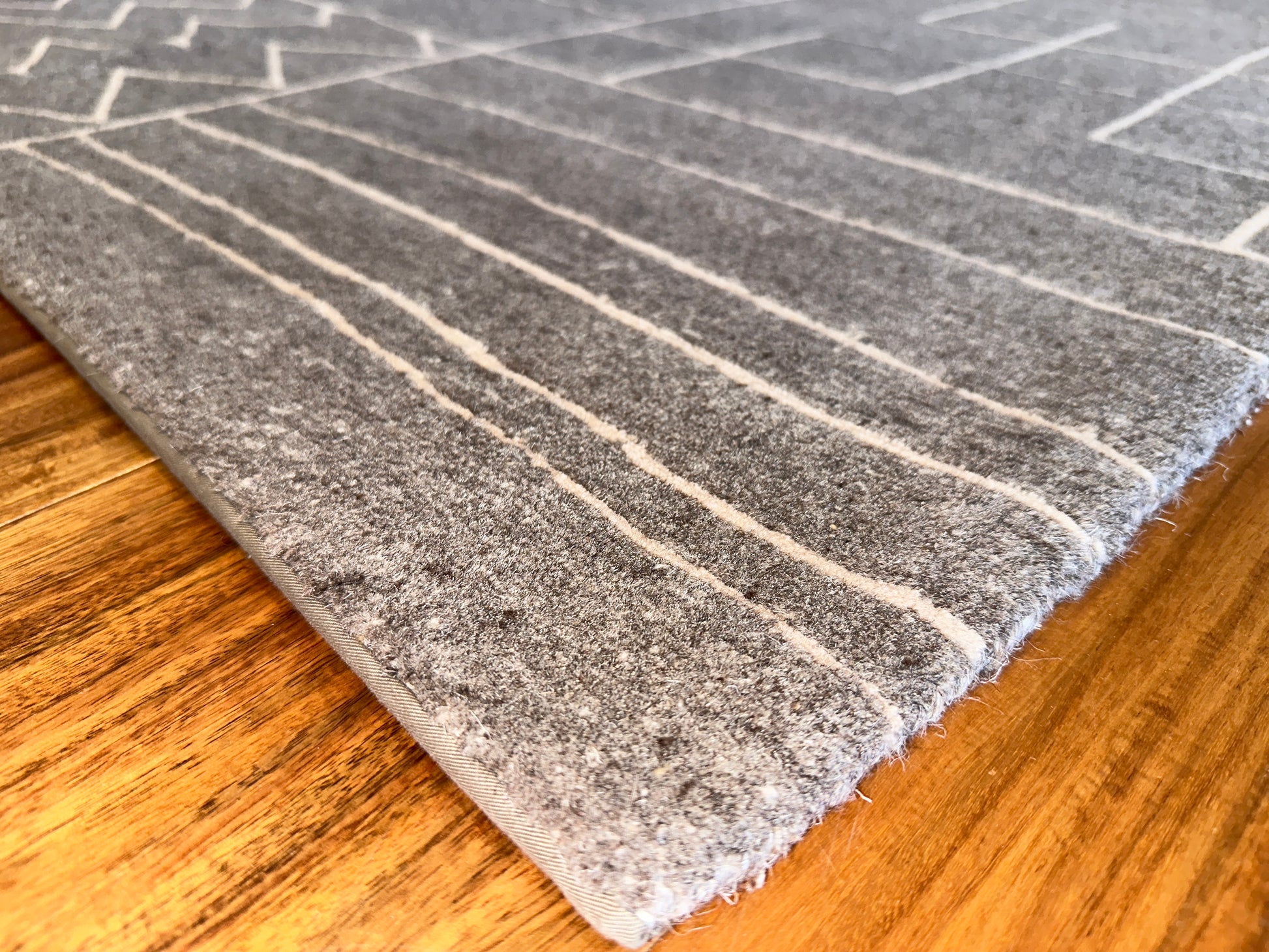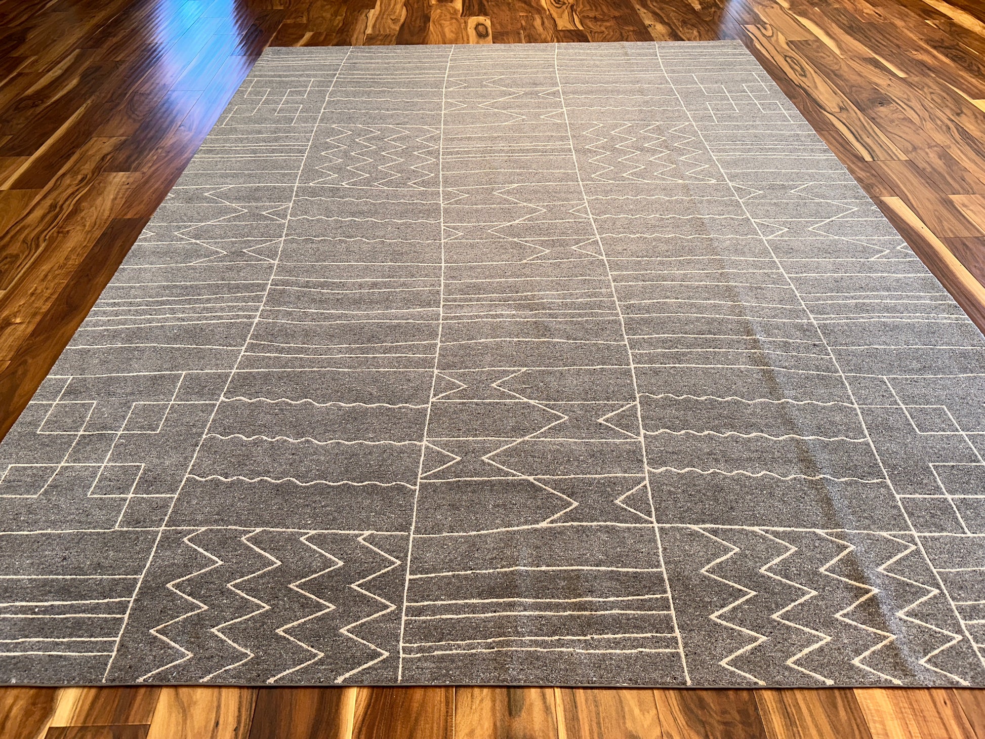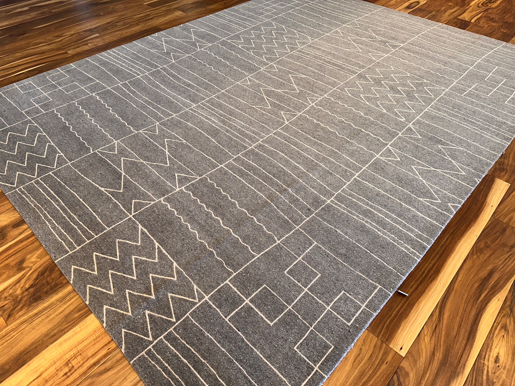 This rug brings modern rhythm to your space with its minimalist geometric grid. It features an abstract pattern of zigzags, waves, and arrows etched across a muted charcoal field. The natural texture of wool enhances its clean, architectural look while adding warmth and softness underfoot.