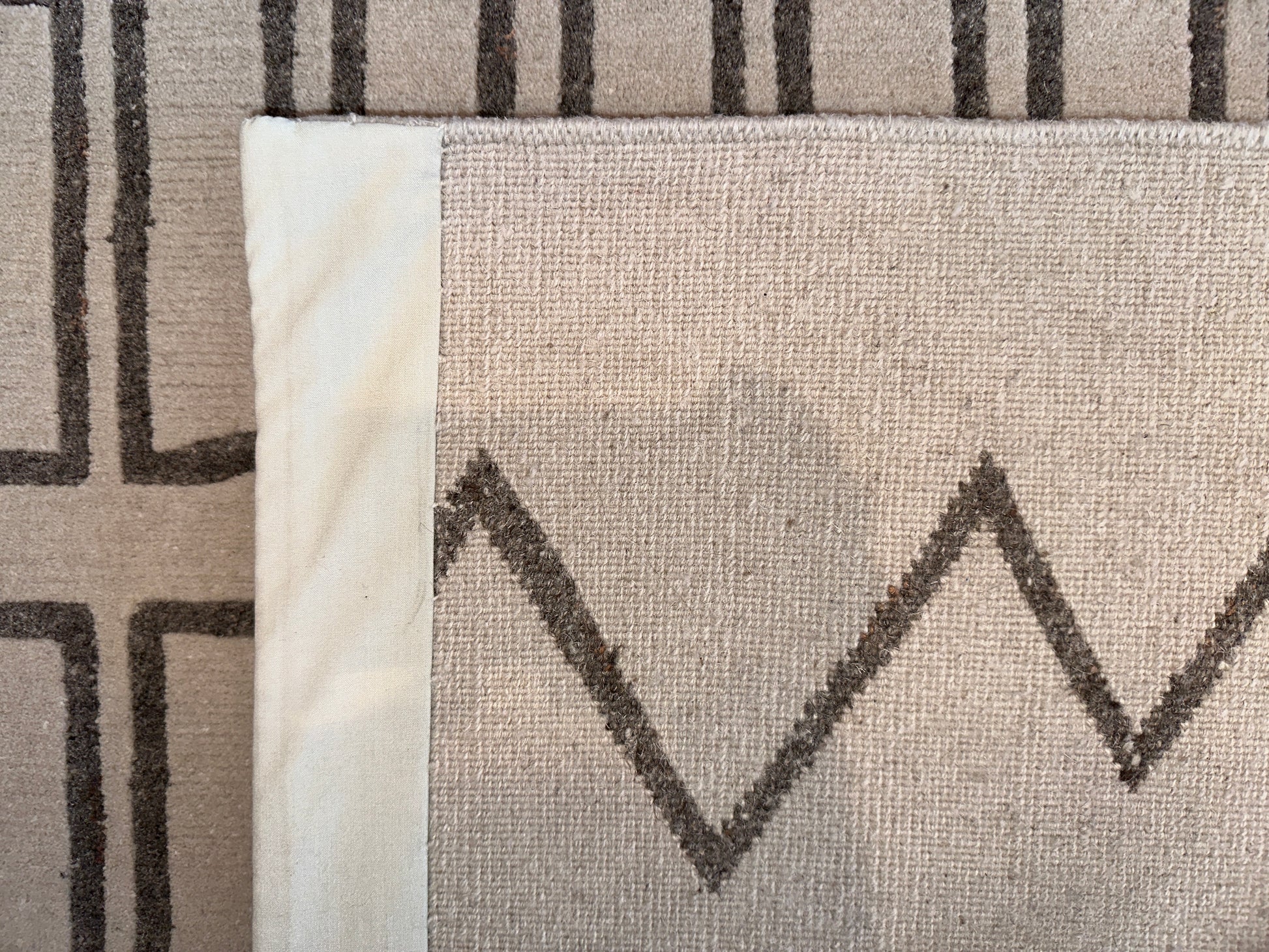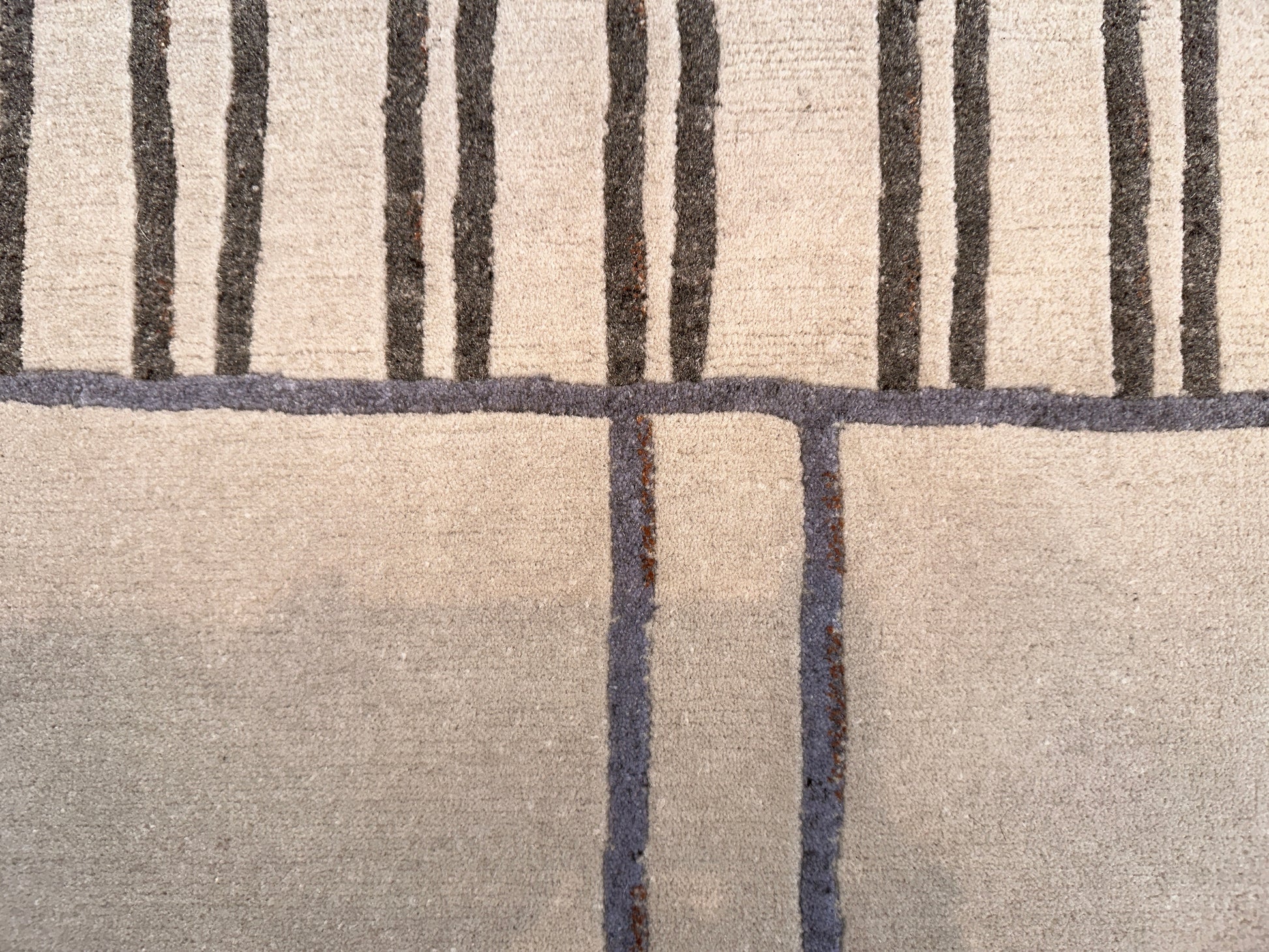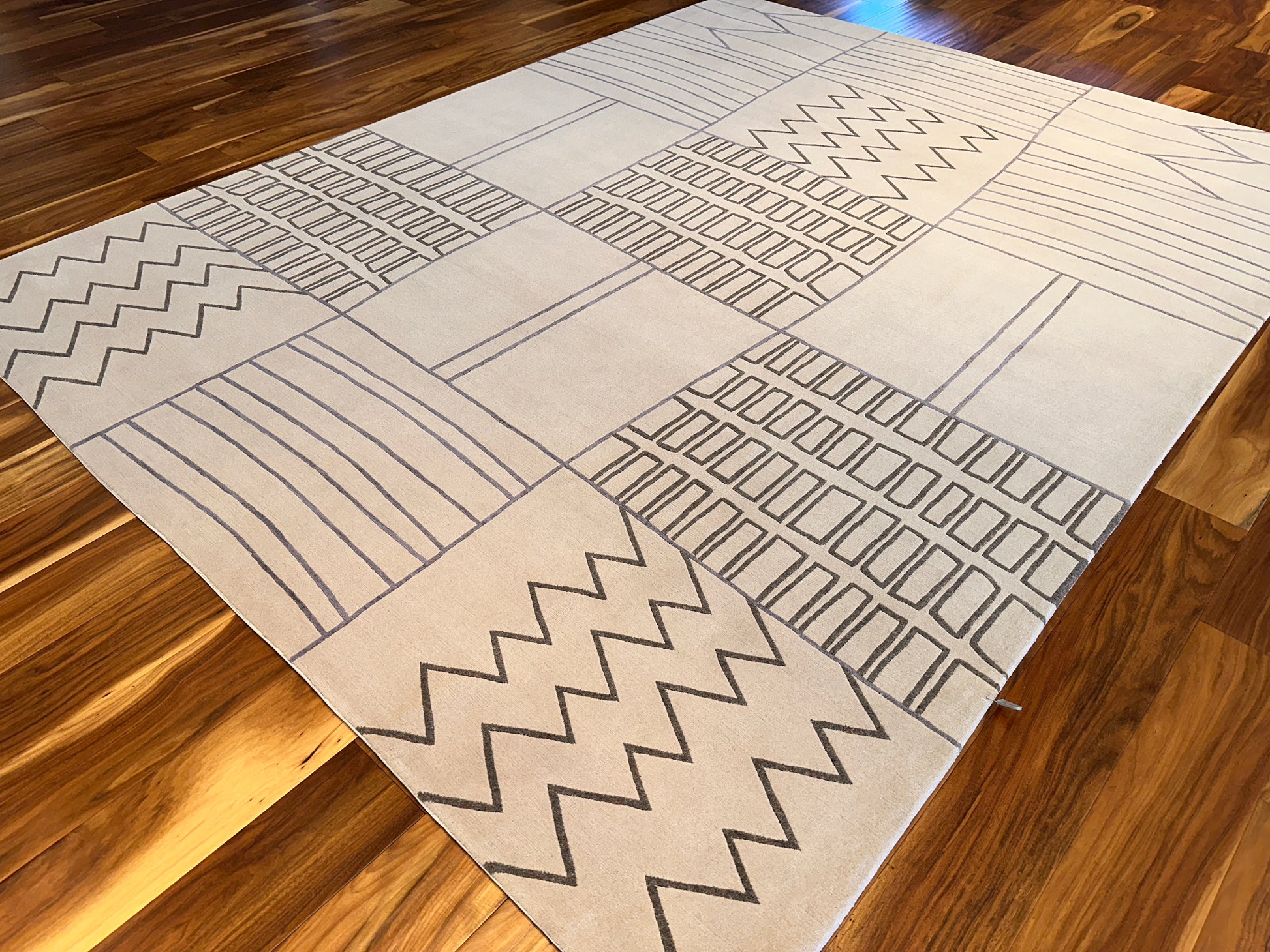 Playful yet composed, this rug features a collage of linear motifs arranged in a gentle patchwork that feels at once rhythmic and relaxed. Hand-drawn lines—some zigzag, some arched, others squared—bring a whimsical edge to the structured layout, while the soft neutral ground keeps the overall feel grounded and serene. A beautiful balance of graphic charm and modern calm.