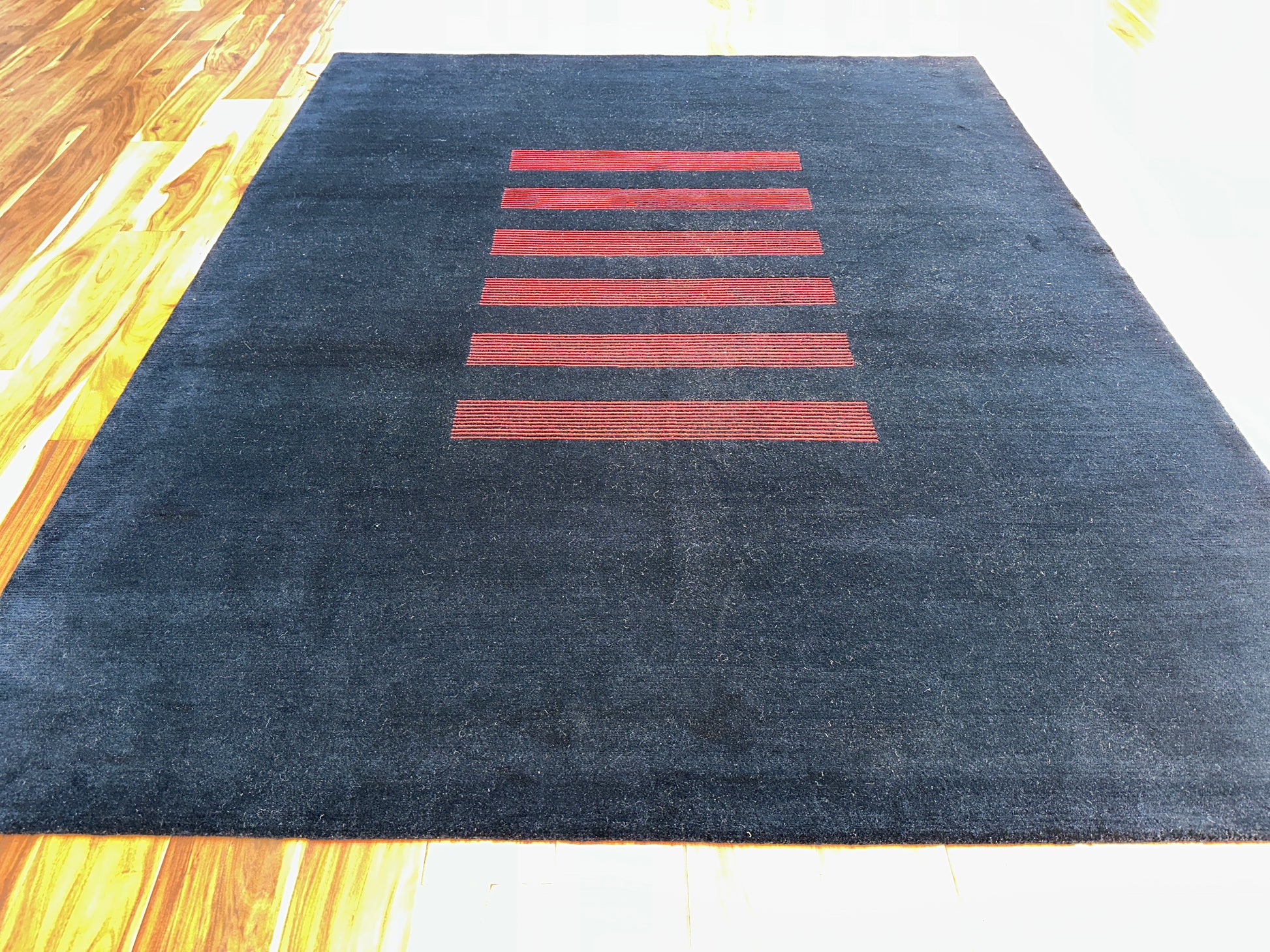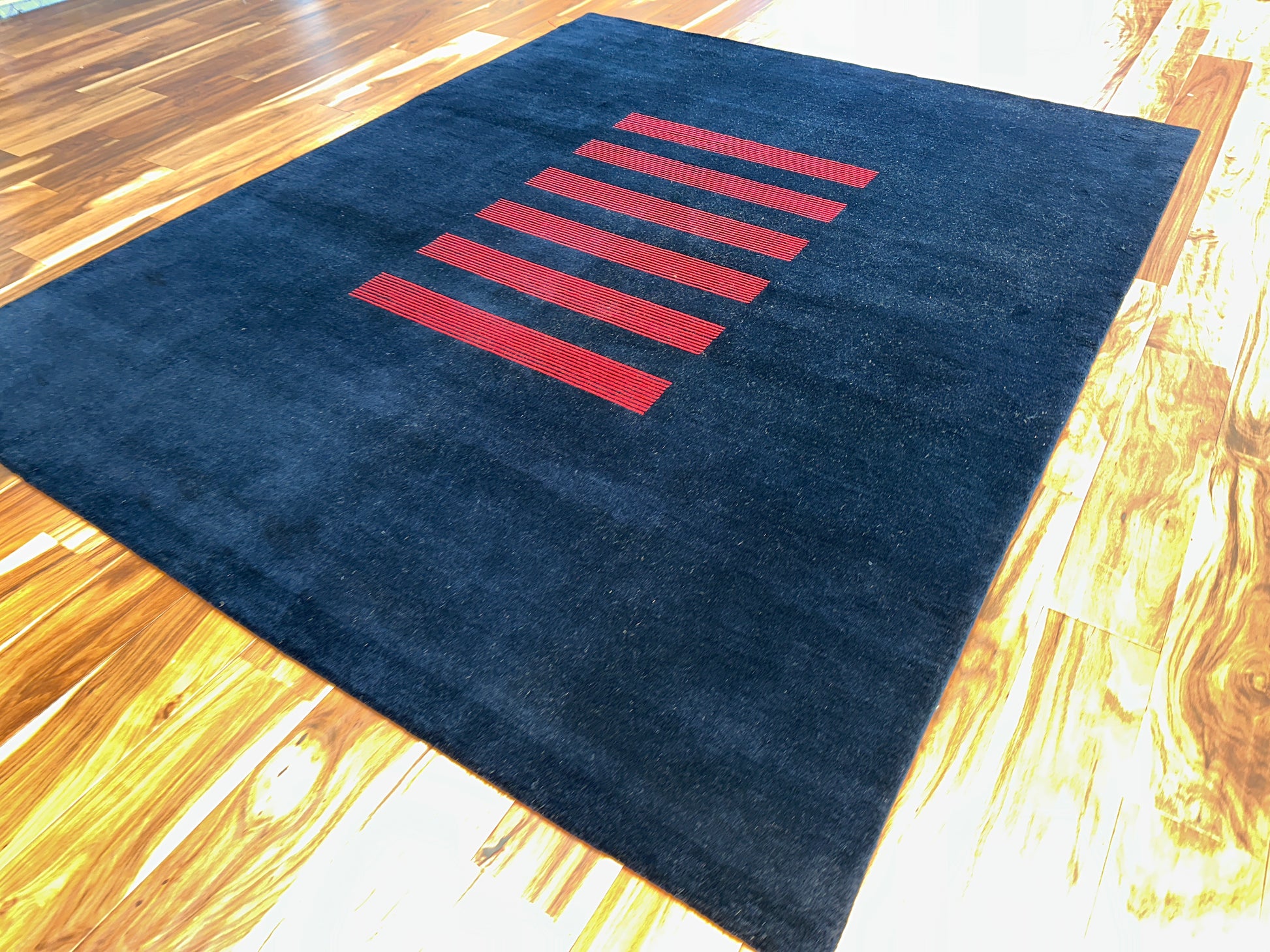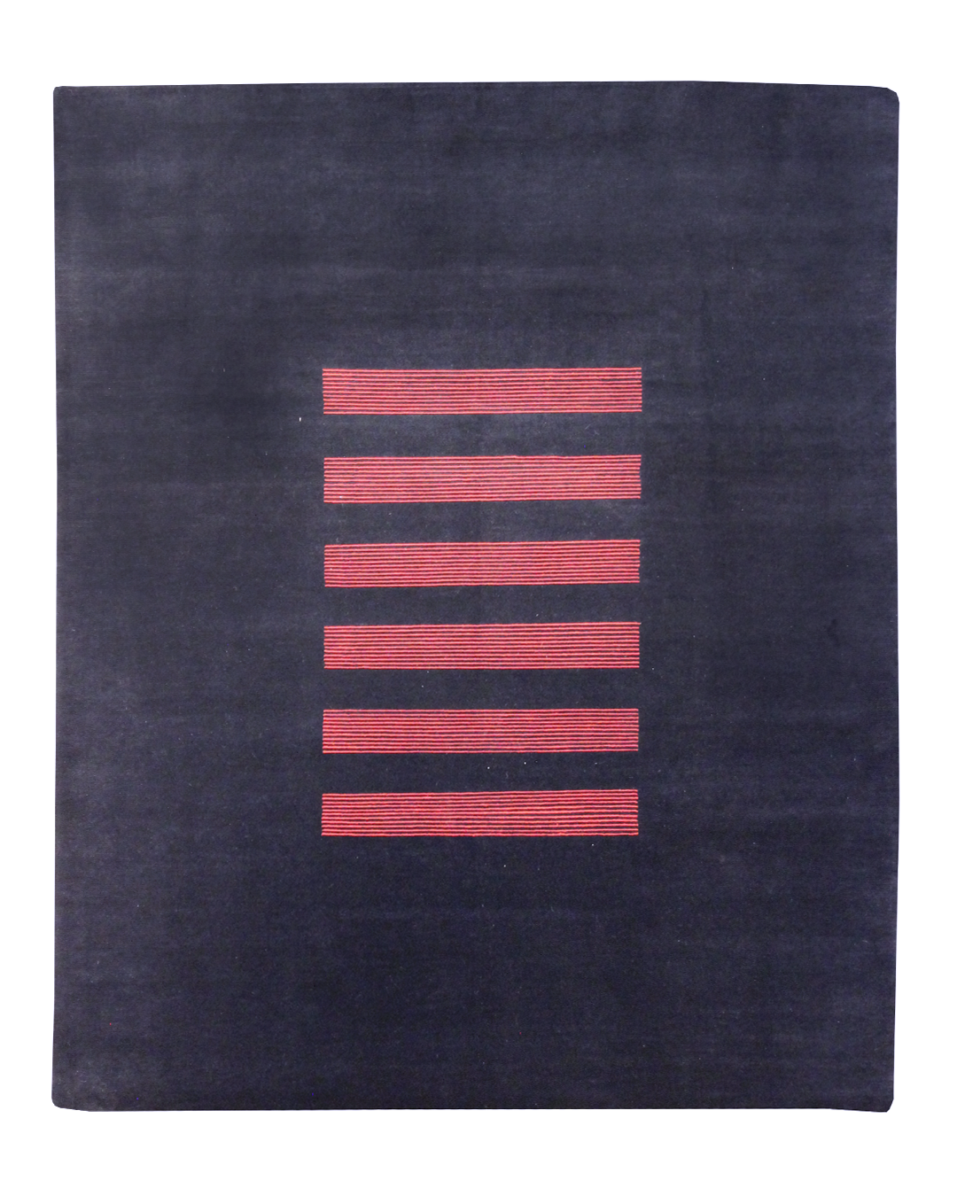Bold and minimalist, this handwoven rug commands attention with its deep blue field interrupted by a central stack of fine red stripes—precise, rhythmic, and striking in their restraint. The composition feels both modernist and meditative, perfect for anchoring a space with powerful simplicity.