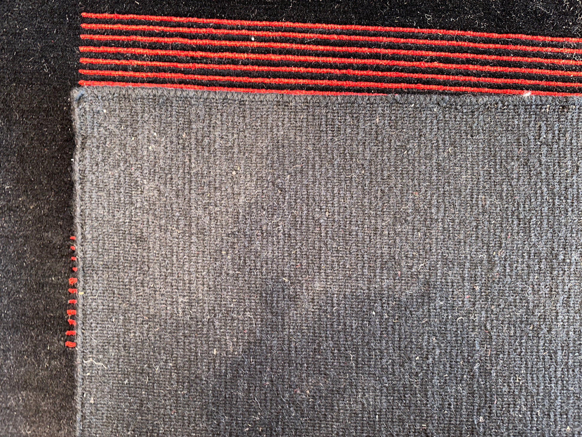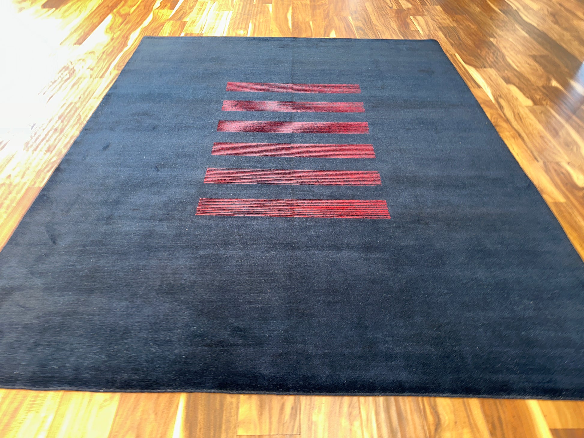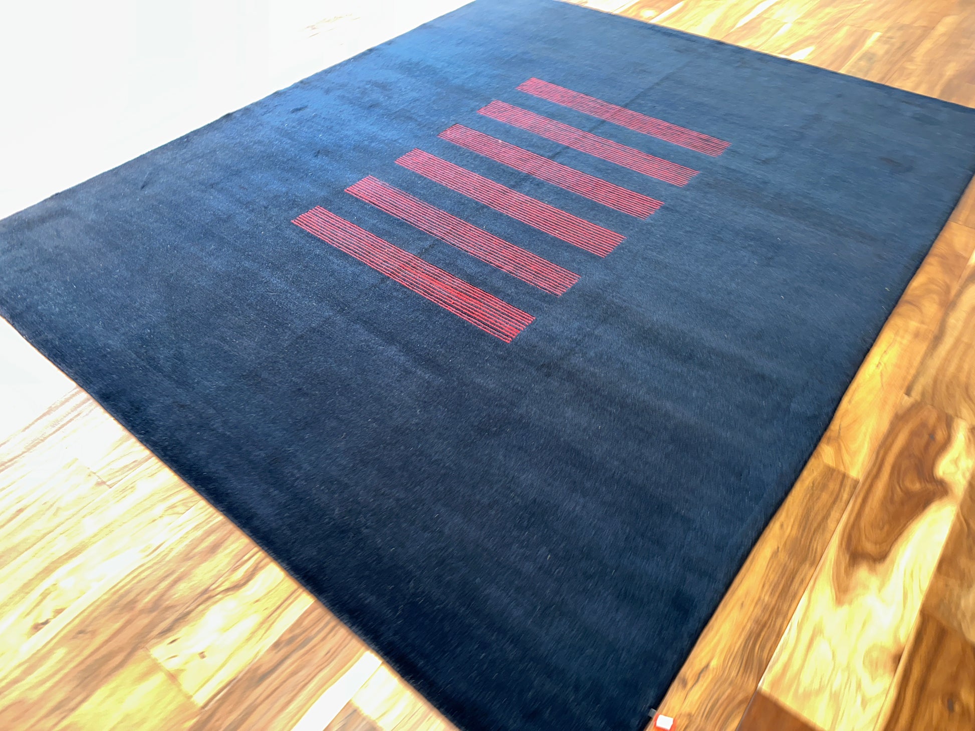 Bold and minimalist, this handwoven rug commands attention with its deep blue field interrupted by a central stack of fine red stripes—precise, rhythmic, and striking in their restraint. The composition feels both modernist and meditative, perfect for anchoring a space with powerful simplicity.