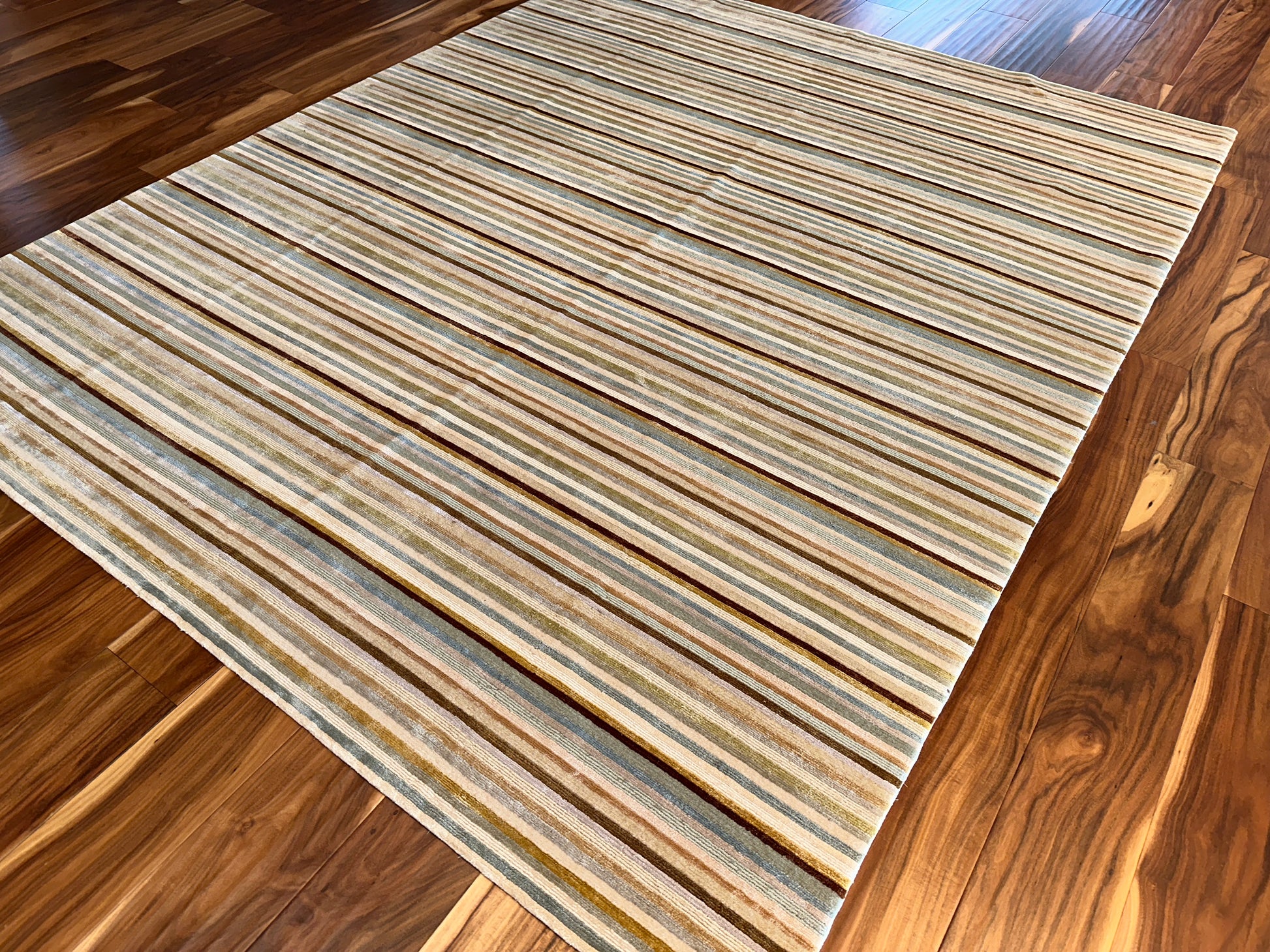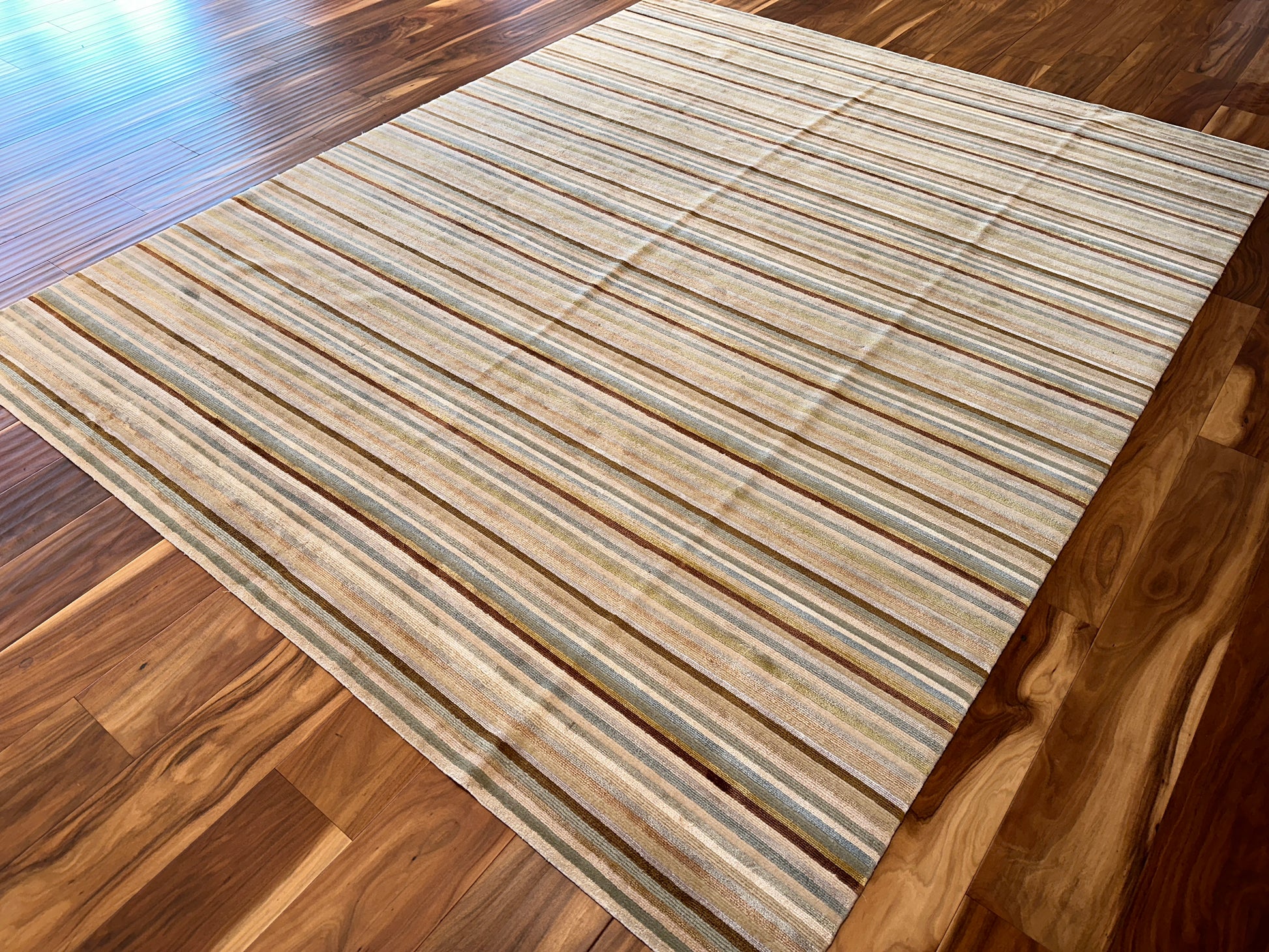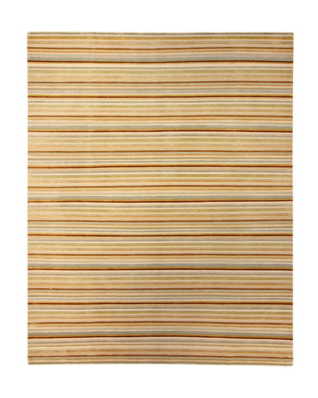 This handwoven rug brings a serene rhythm to any space with its soft linear composition in warm neutrals and cool hues. Bands of ivory, sand, misty blue, and golden ochre shift gently across the surface, creating a calming sense of movement. The fine striping adds visual texture while keeping the overall effect light and balanced.