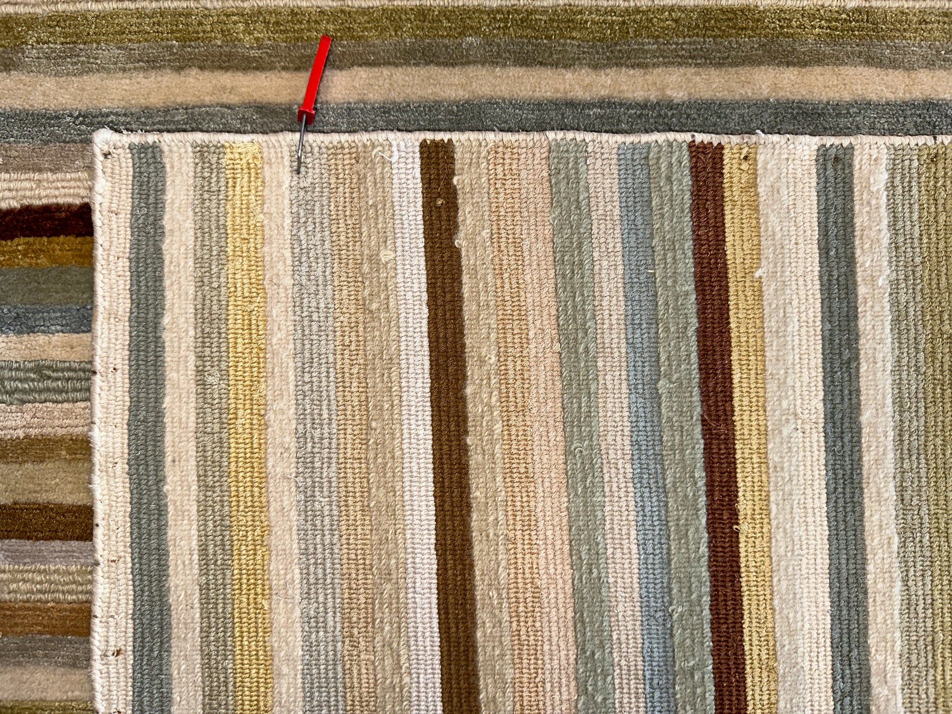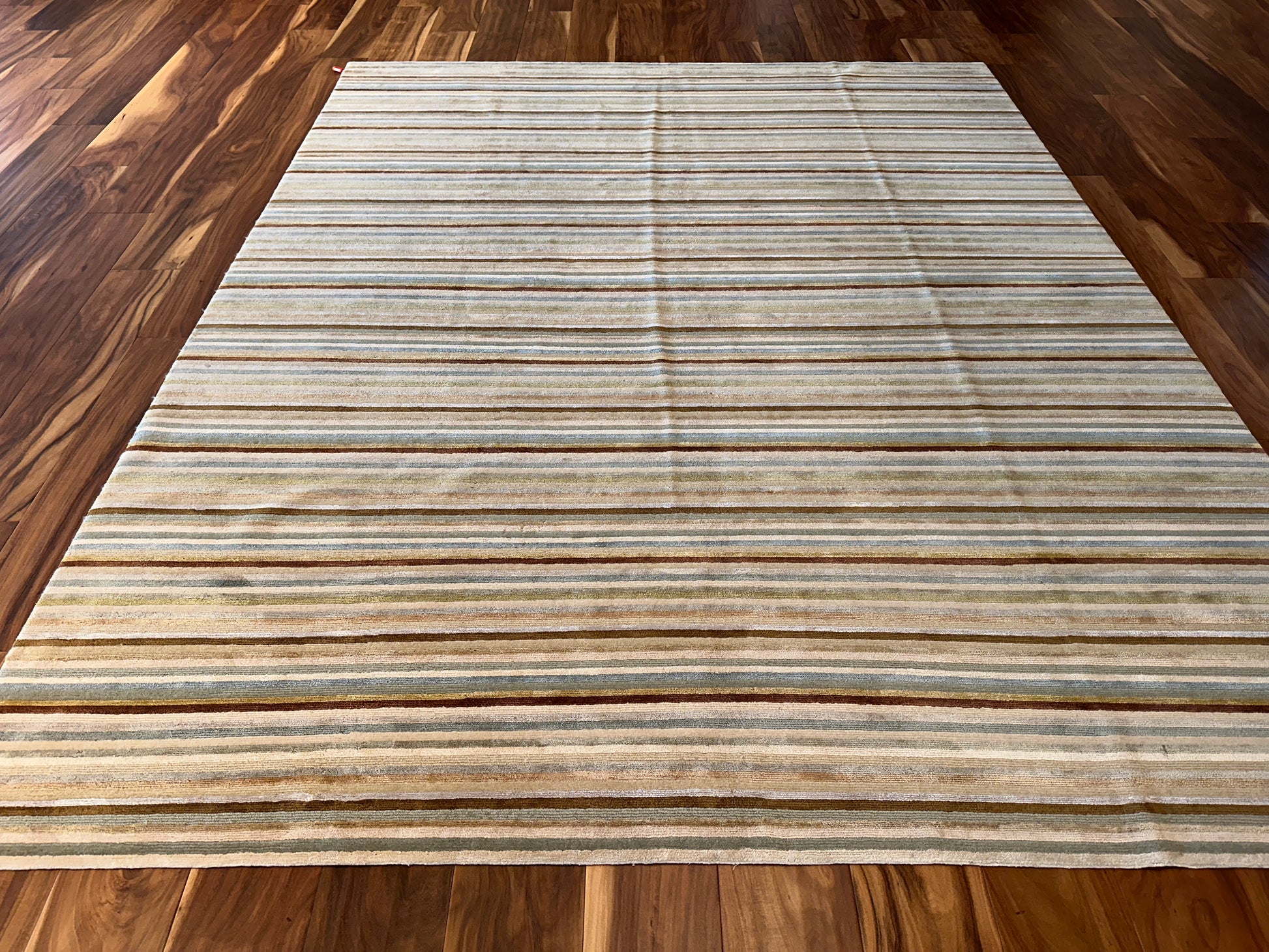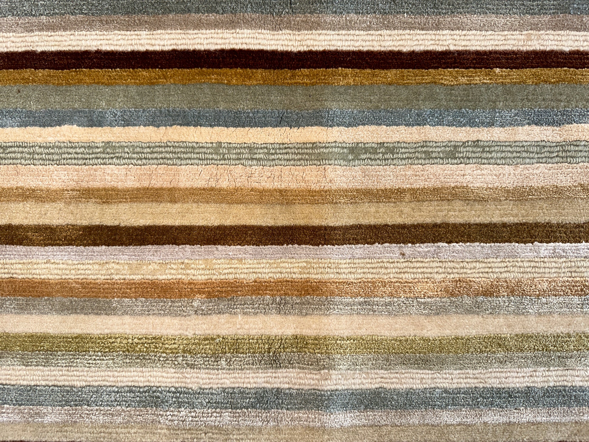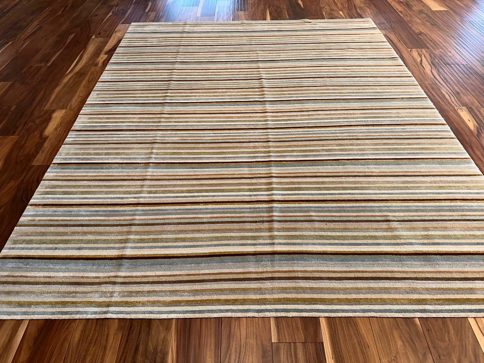 This handwoven rug brings a serene rhythm to any space with its soft linear composition in warm neutrals and cool hues. Bands of ivory, sand, misty blue, and golden ochre shift gently across the surface, creating a calming sense of movement. The fine striping adds visual texture while keeping the overall effect light and balanced.