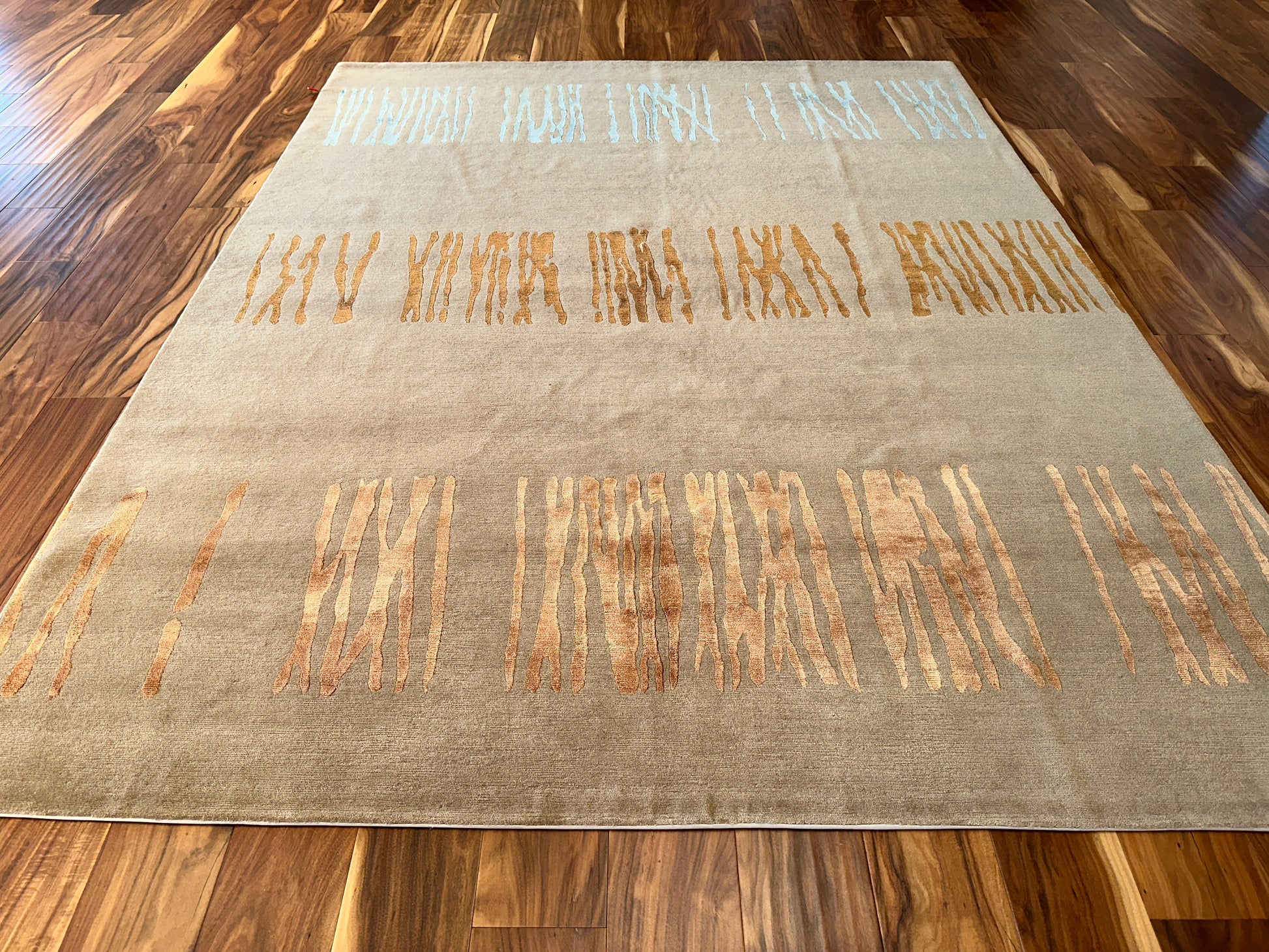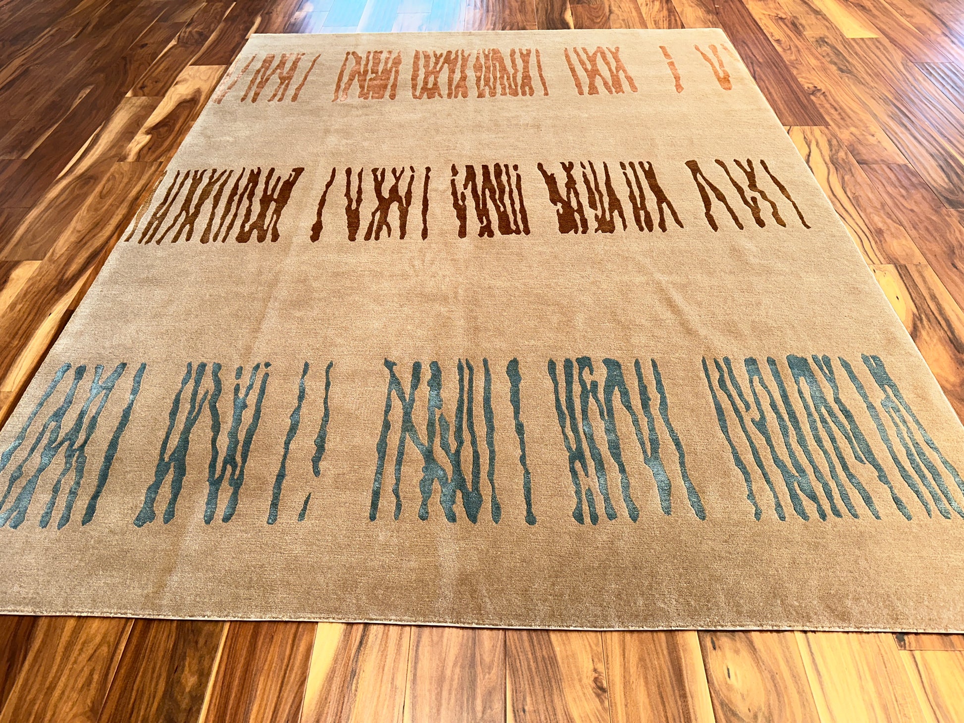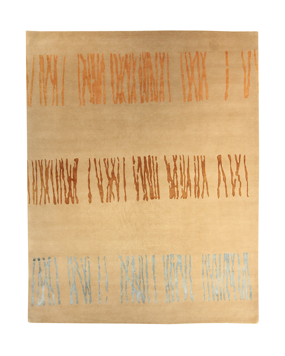 This contemporary handwoven rug captures a minimalist yet expressive spirit, with vertical streaks in rust, ochre, and pale blue subtly dancing across a warm, sandy background. Its painterly composition evokes a sense of rhythm and movement, offering a refined and modern touch to open, airy interiors.