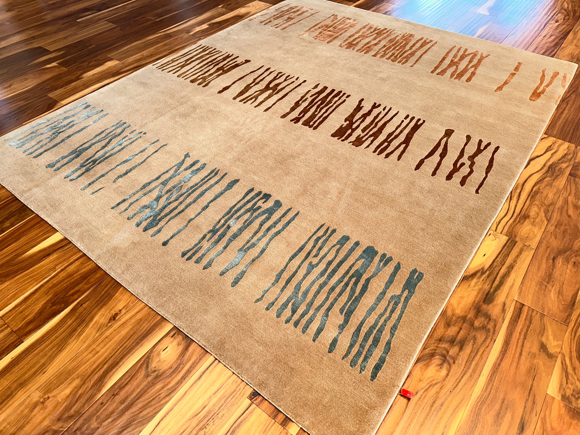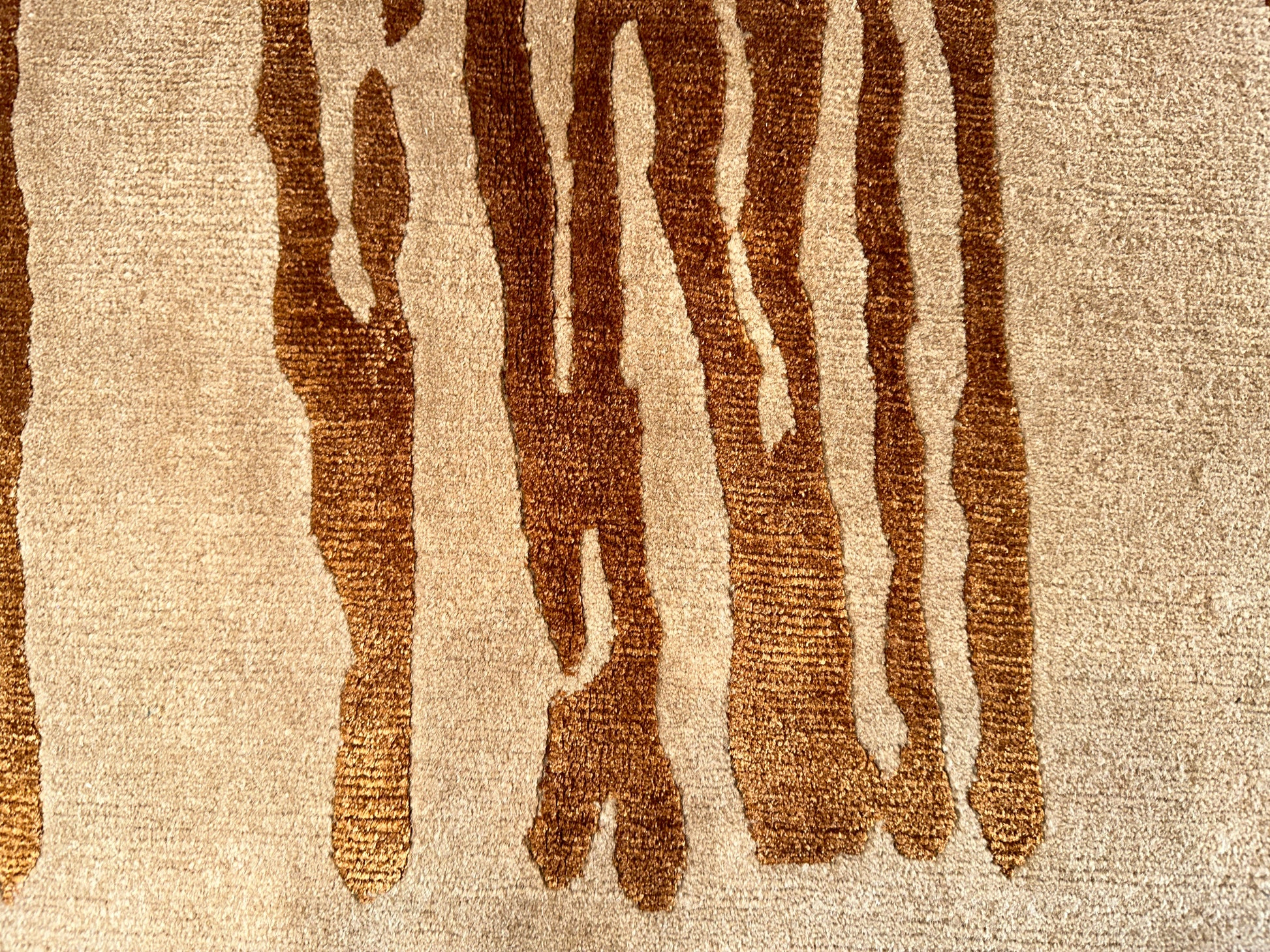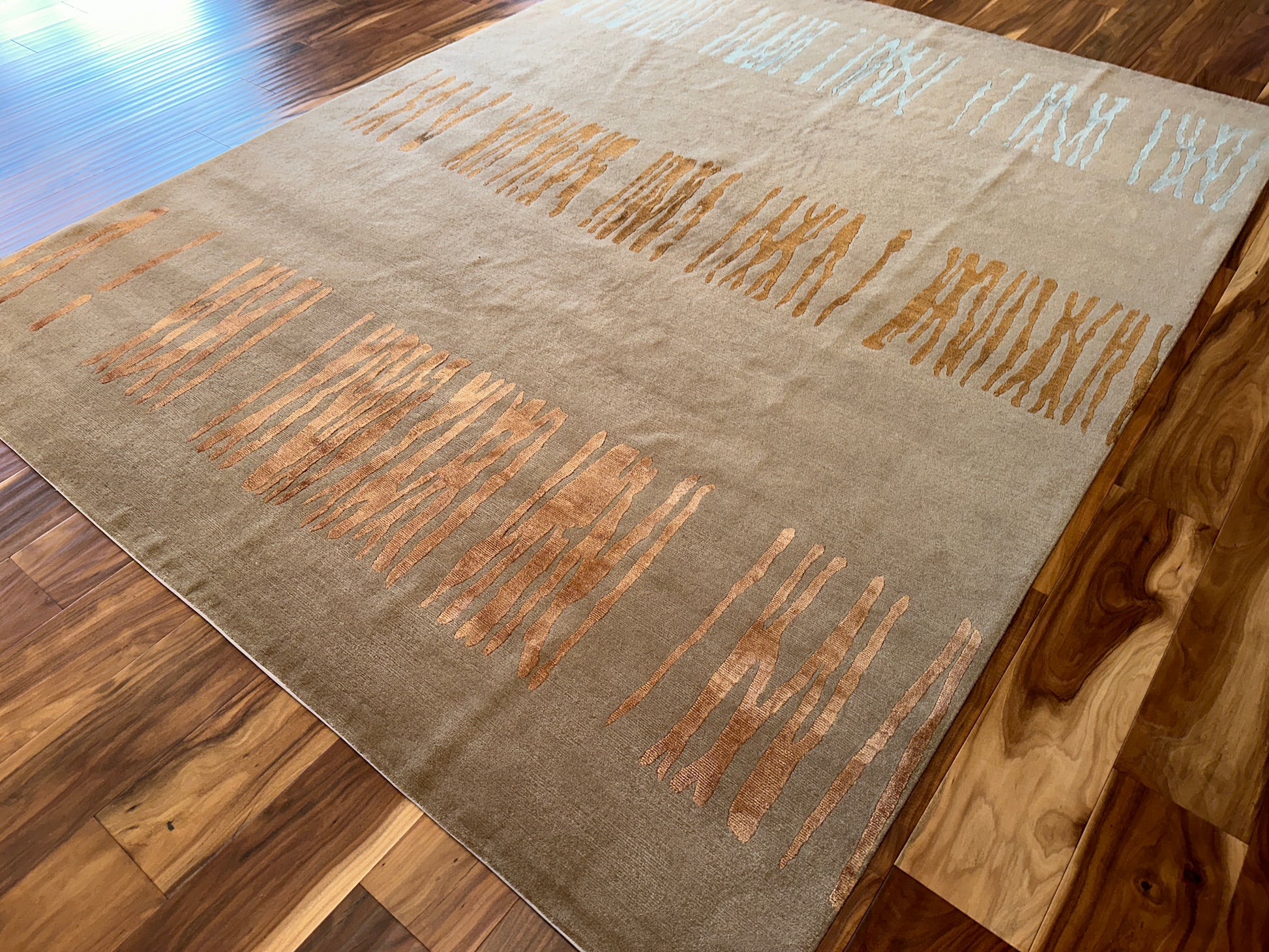 This contemporary handwoven rug captures a minimalist yet expressive spirit, with vertical streaks in rust, ochre, and pale blue subtly dancing across a warm, sandy background. Its painterly composition evokes a sense of rhythm and movement, offering a refined and modern touch to open, airy interiors.
