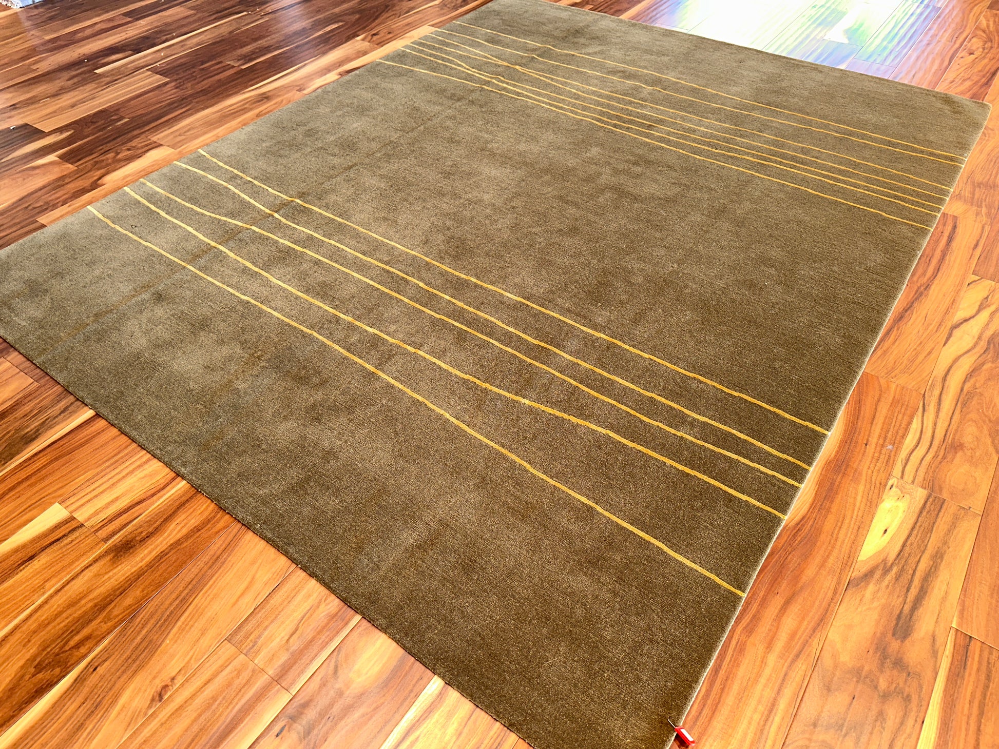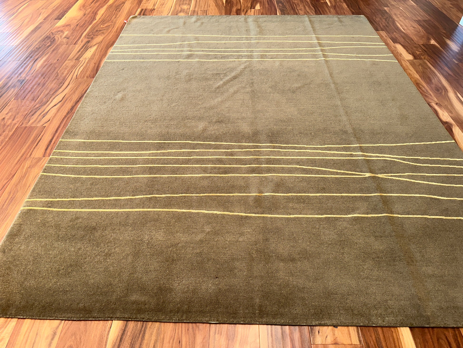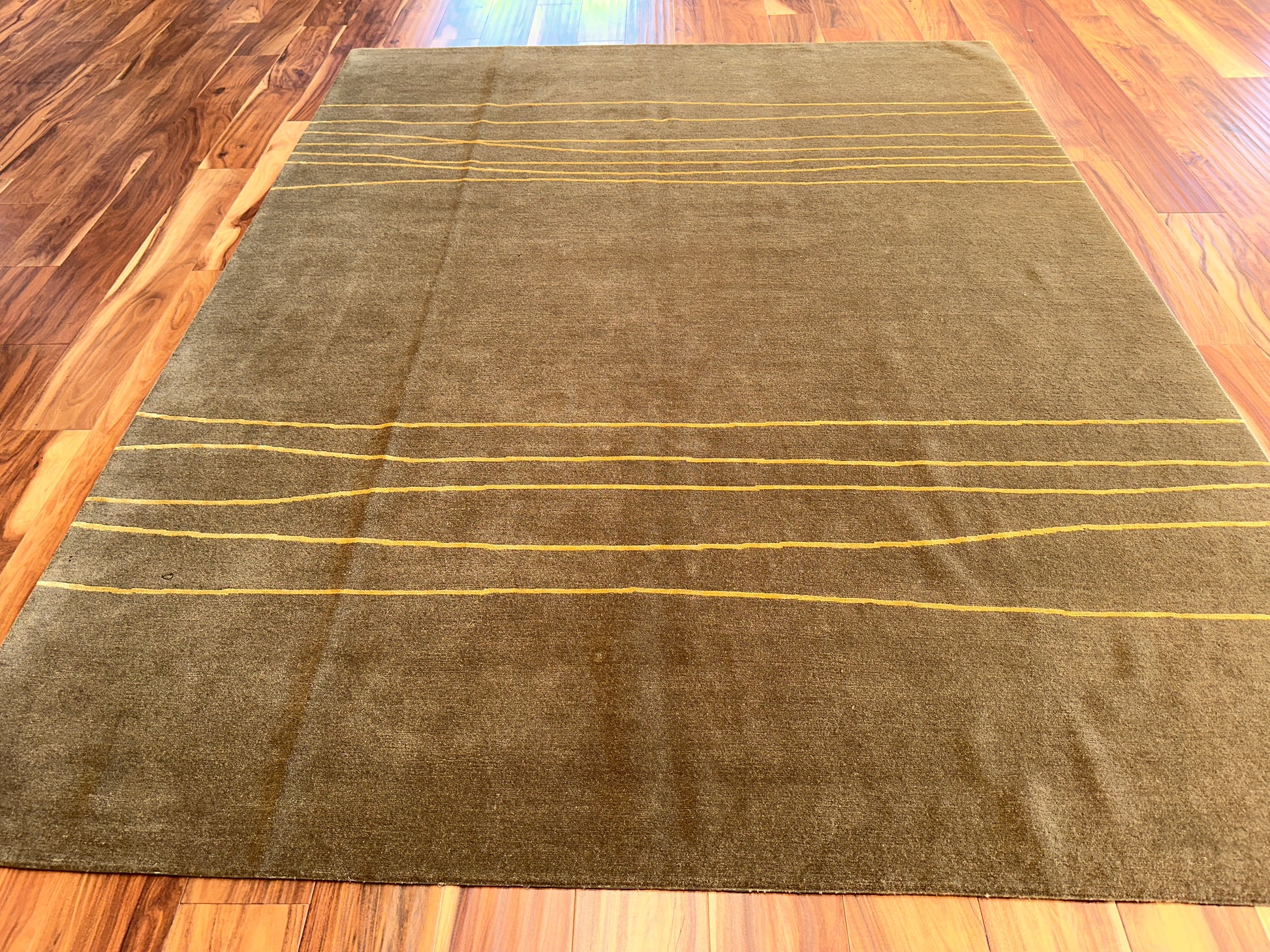 This elegant handwoven rug brings minimalist beauty to your space, with soft olive tones and delicate yellow silk linear accents that seem to drift gently across the field. The placement of the lines creates a subtle rhythm that feels balanced yet spontaneous, perfect for anchoring a room with quiet sophistication and warmth.