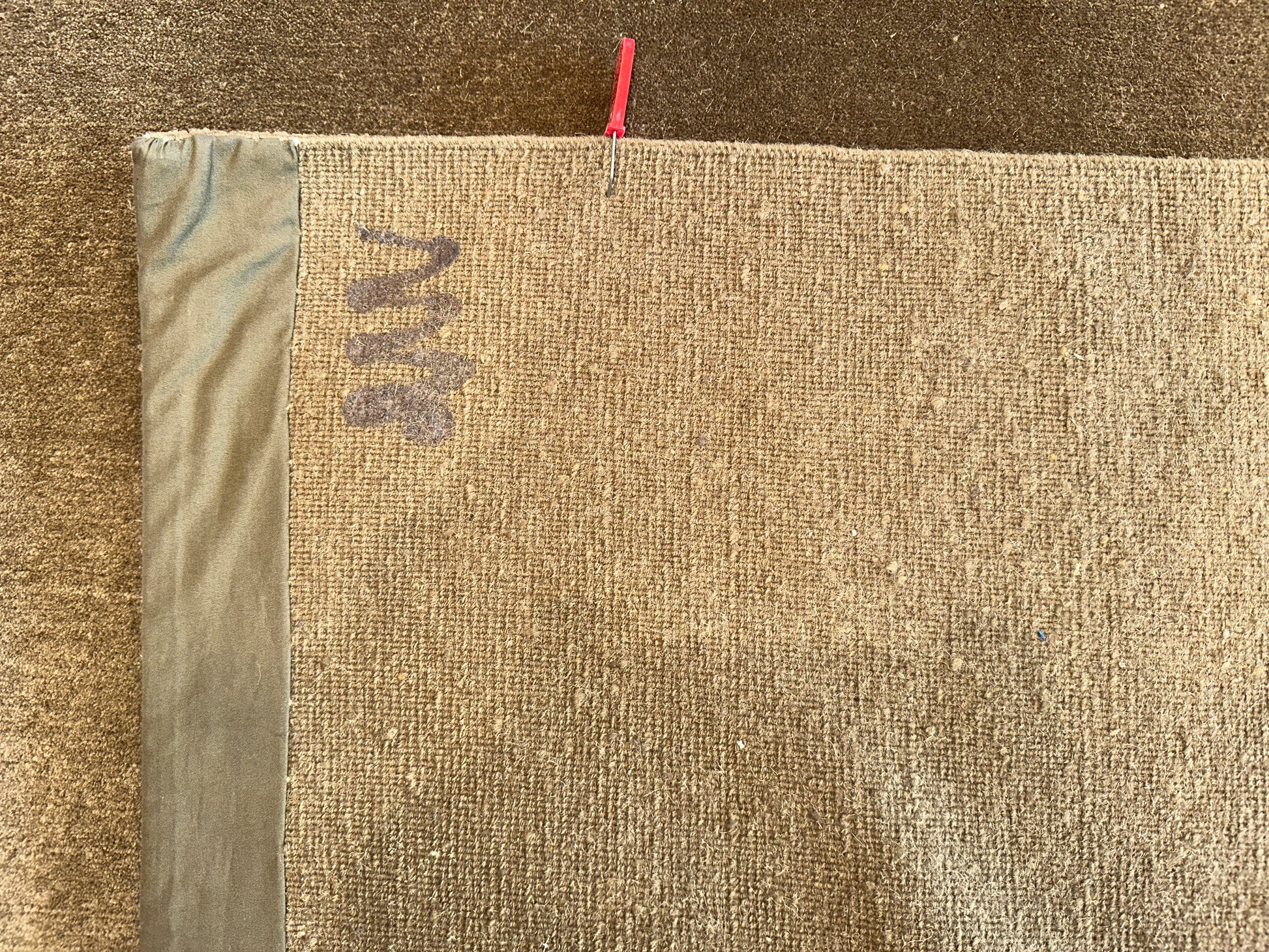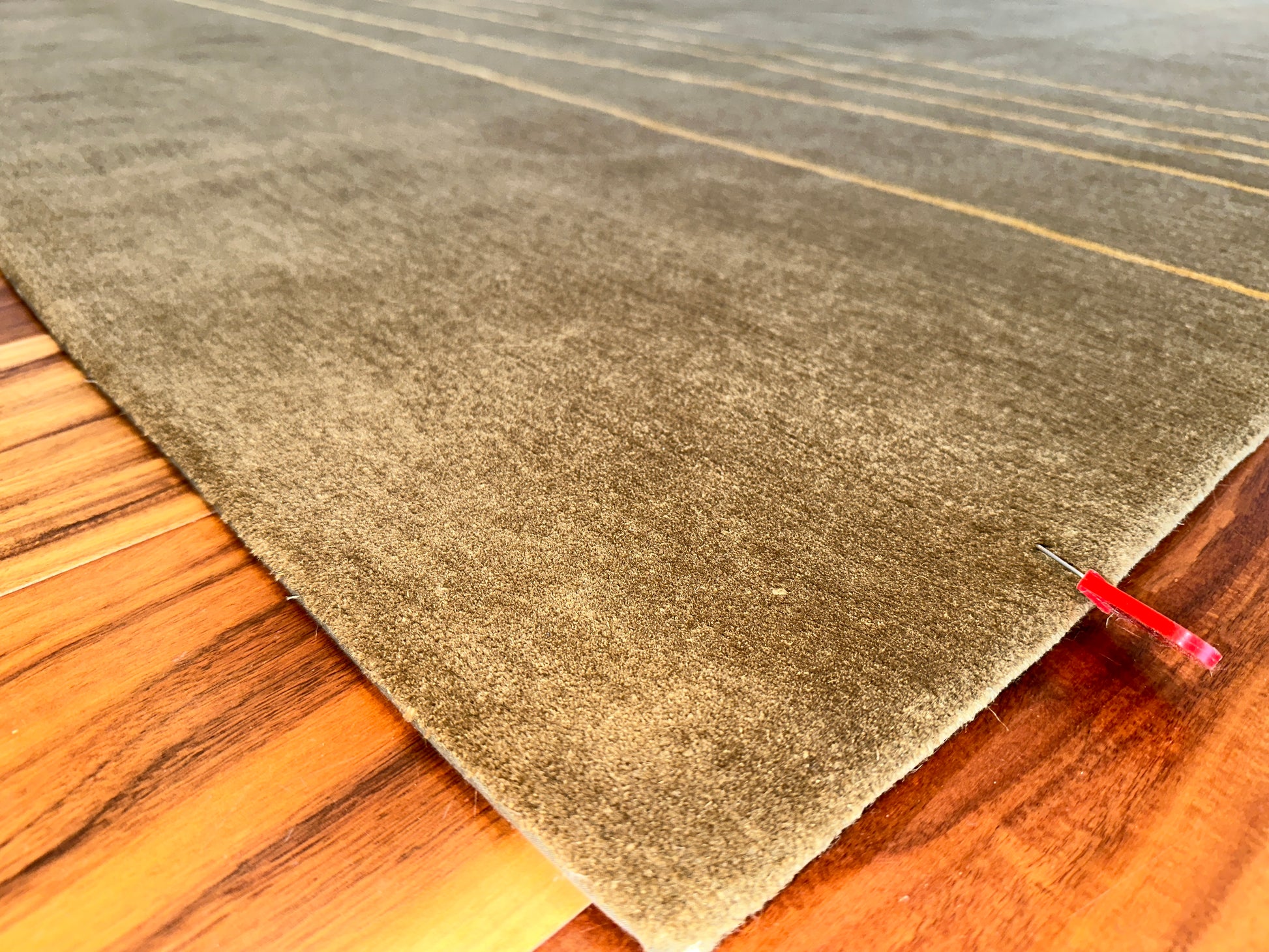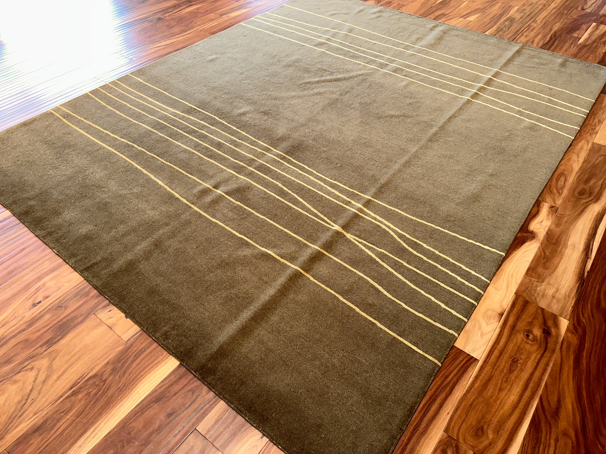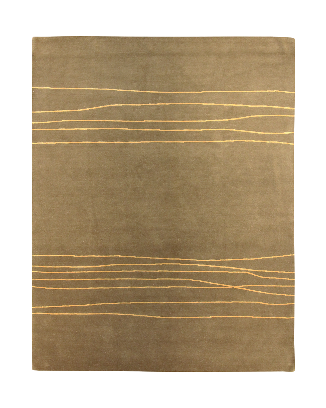 This elegant handwoven rug brings minimalist beauty to your space, with soft olive tones and delicate yellow silk linear accents that seem to drift gently across the field. The placement of the lines creates a subtle rhythm that feels balanced yet spontaneous, perfect for anchoring a room with quiet sophistication and warmth.
