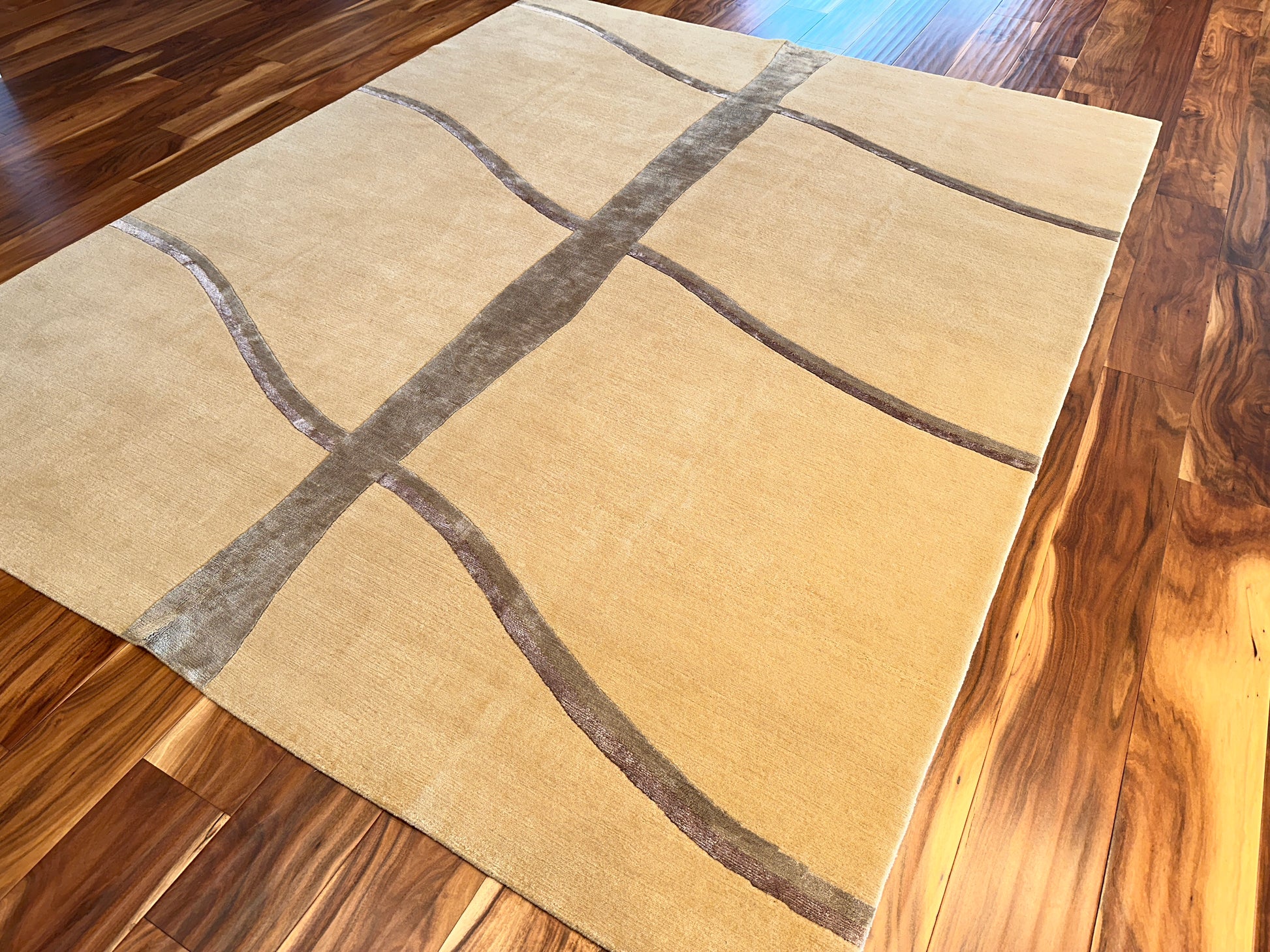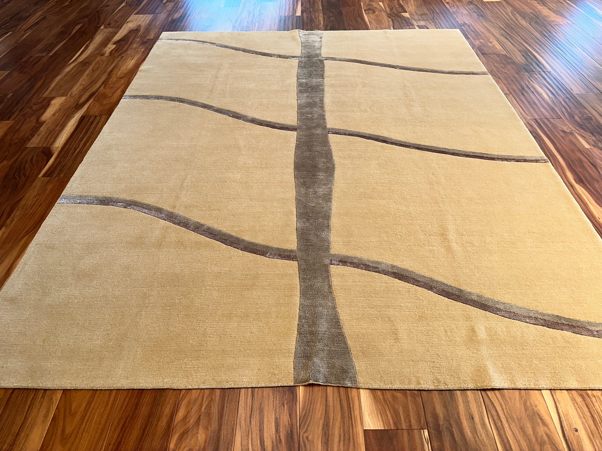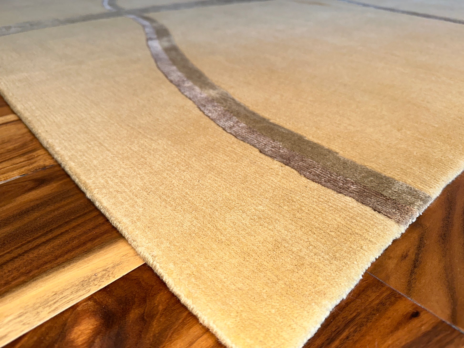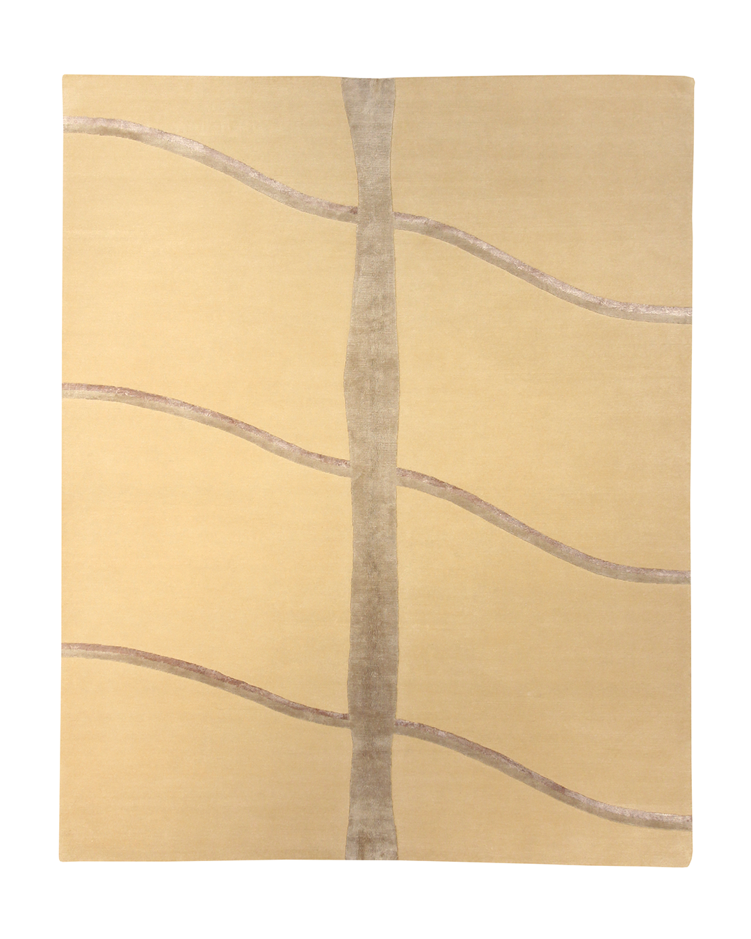 This handwoven rug brings a graceful minimalism to the floor with its soft golden backdrop and flowing, branch-like lines in muted grey. The asymmetrical design evokes the quiet rhythm of nature, like a tree trunk with outstretched limbs or gently meandering paths. Its subtle texture and refined simplicity make it ideal for serene, modern interiors.