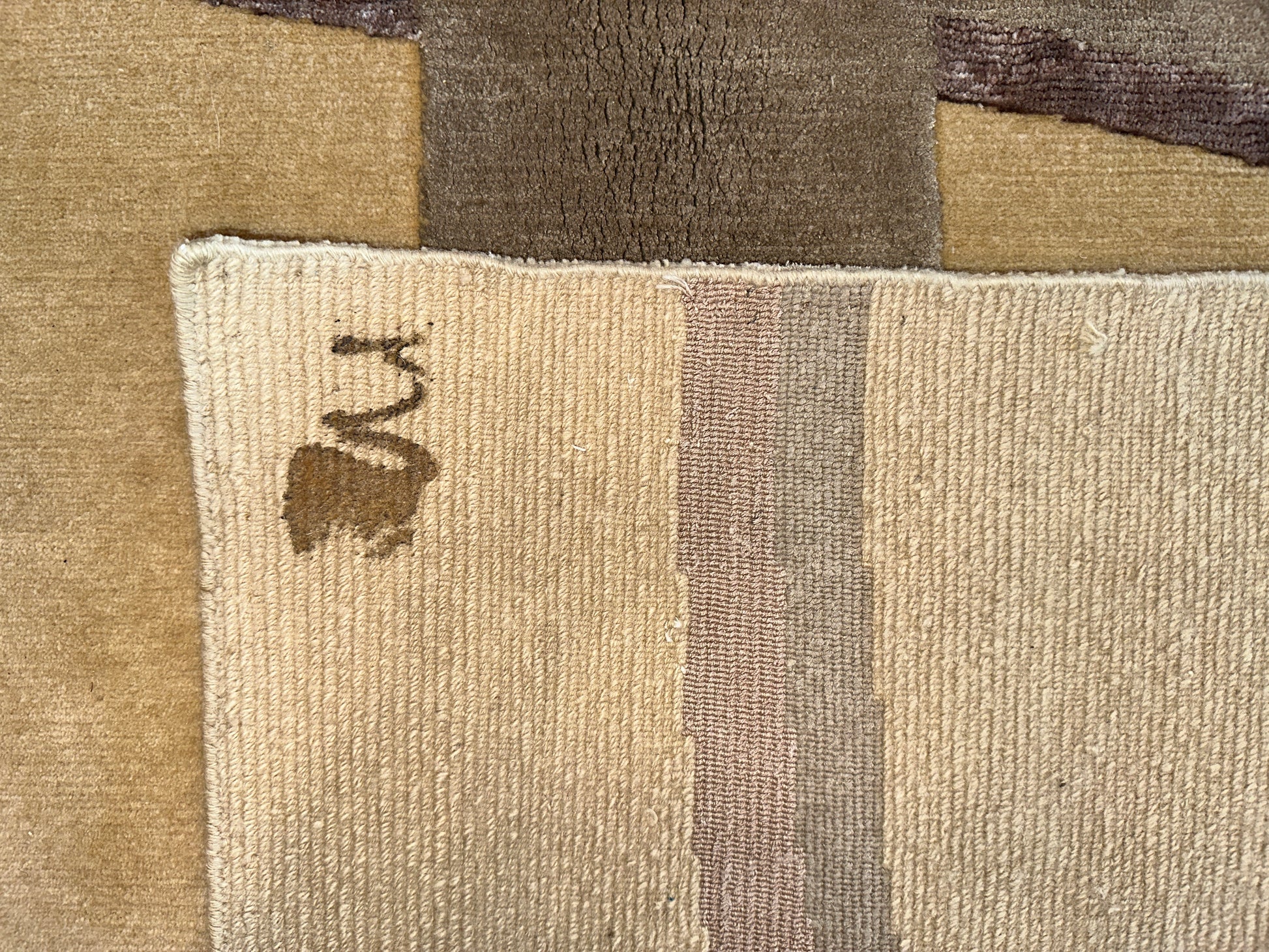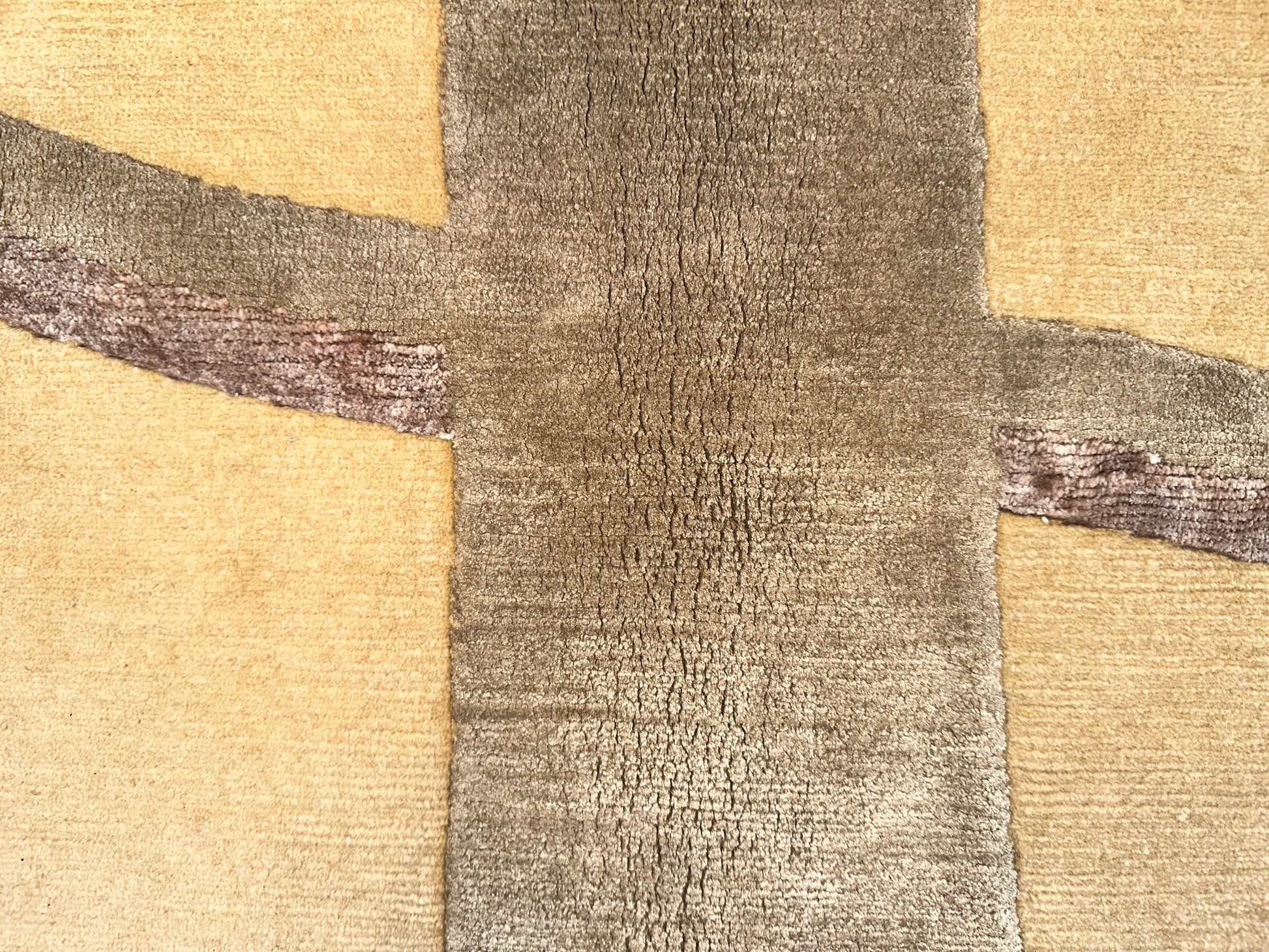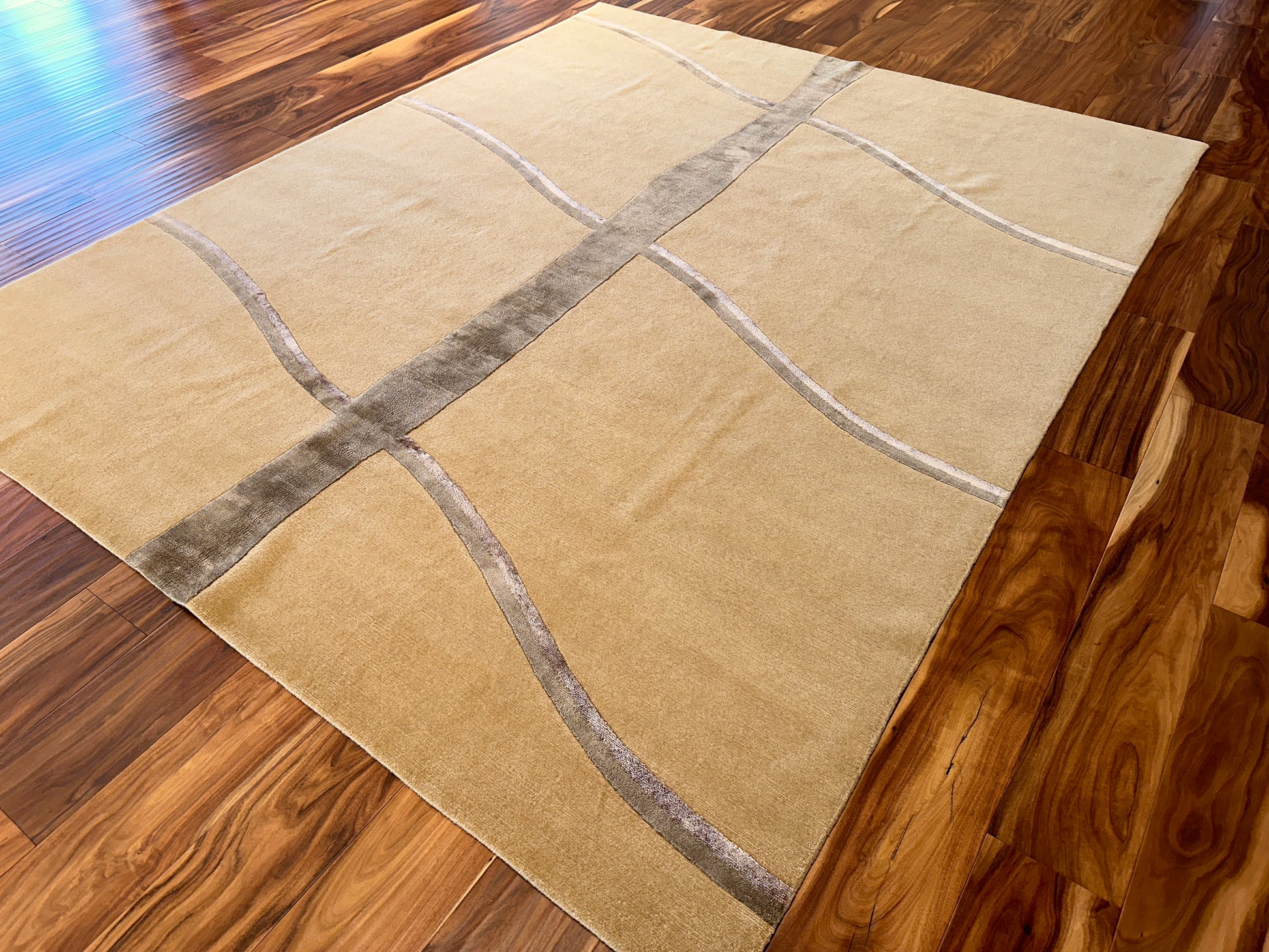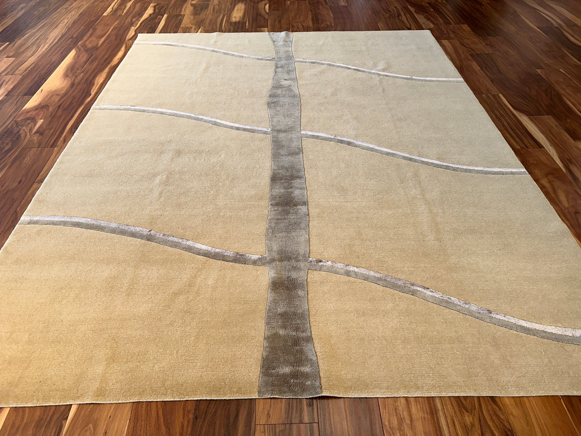 This handwoven rug brings a graceful minimalism to the floor with its soft golden backdrop and flowing, branch-like lines in muted grey. The asymmetrical design evokes the quiet rhythm of nature, like a tree trunk with outstretched limbs or gently meandering paths. Its subtle texture and refined simplicity make it ideal for serene, modern interiors.