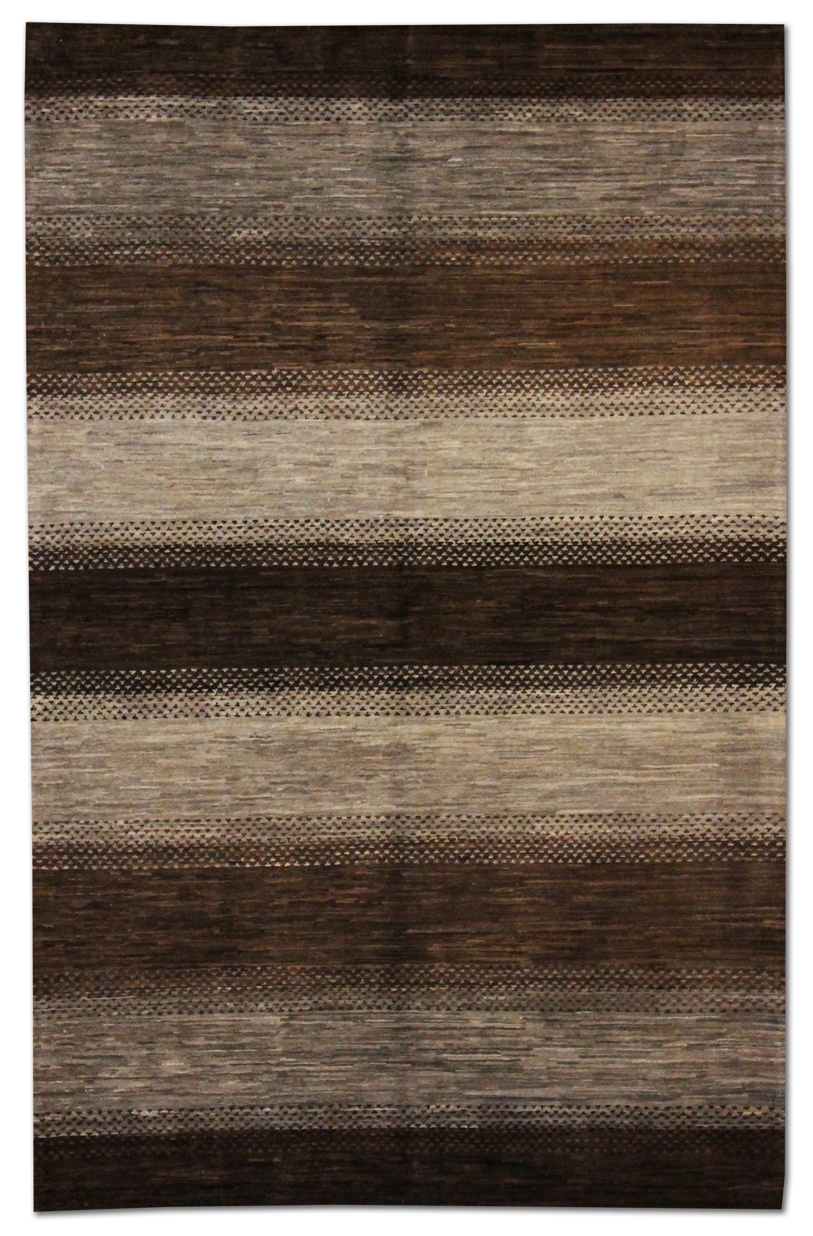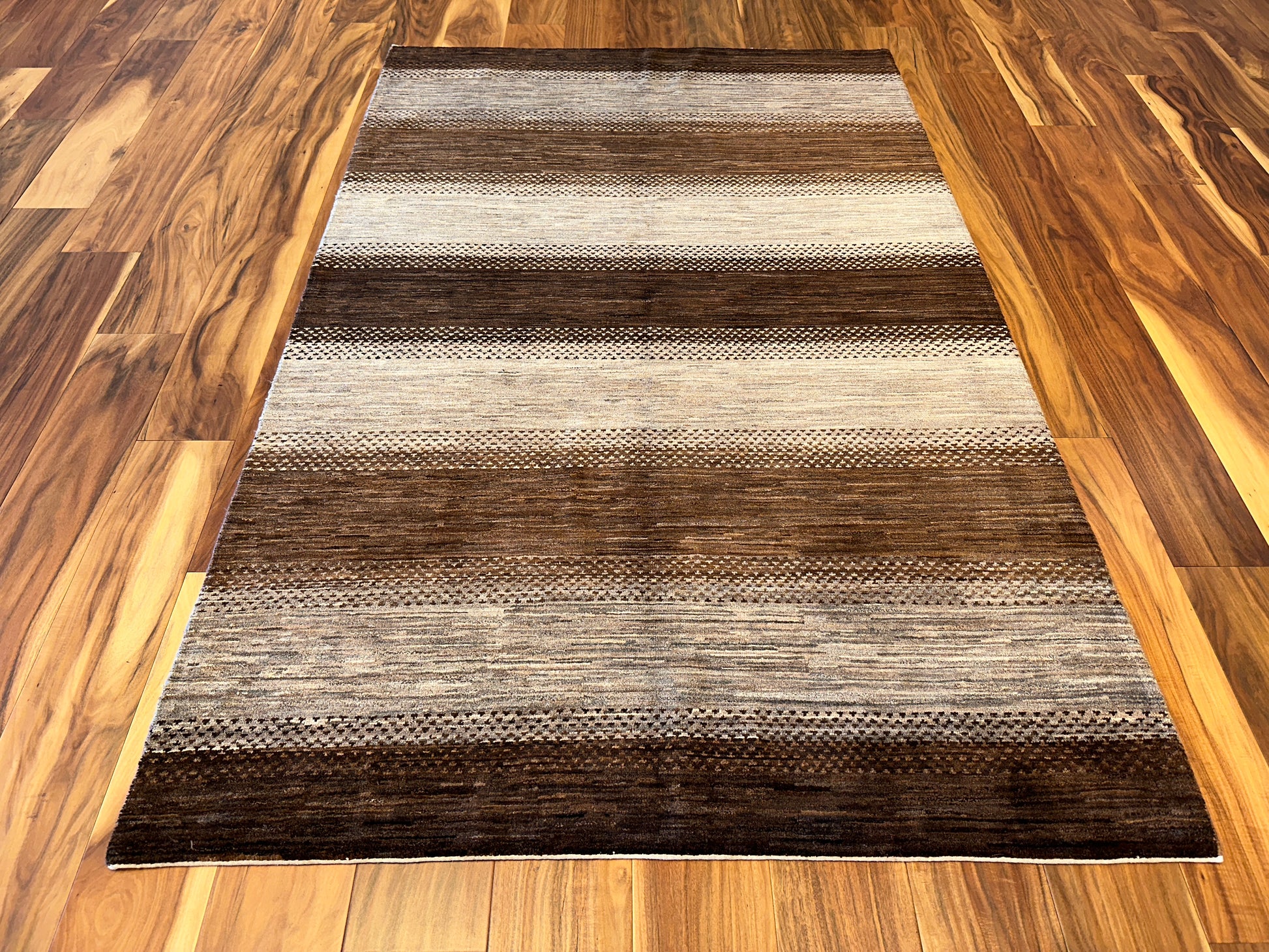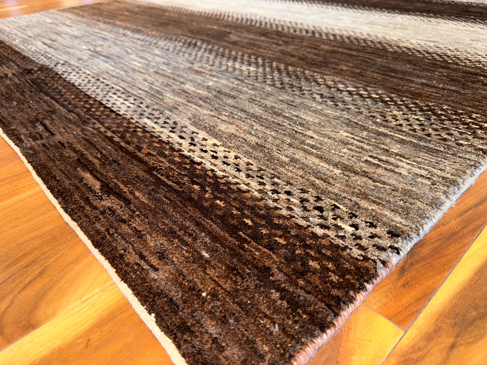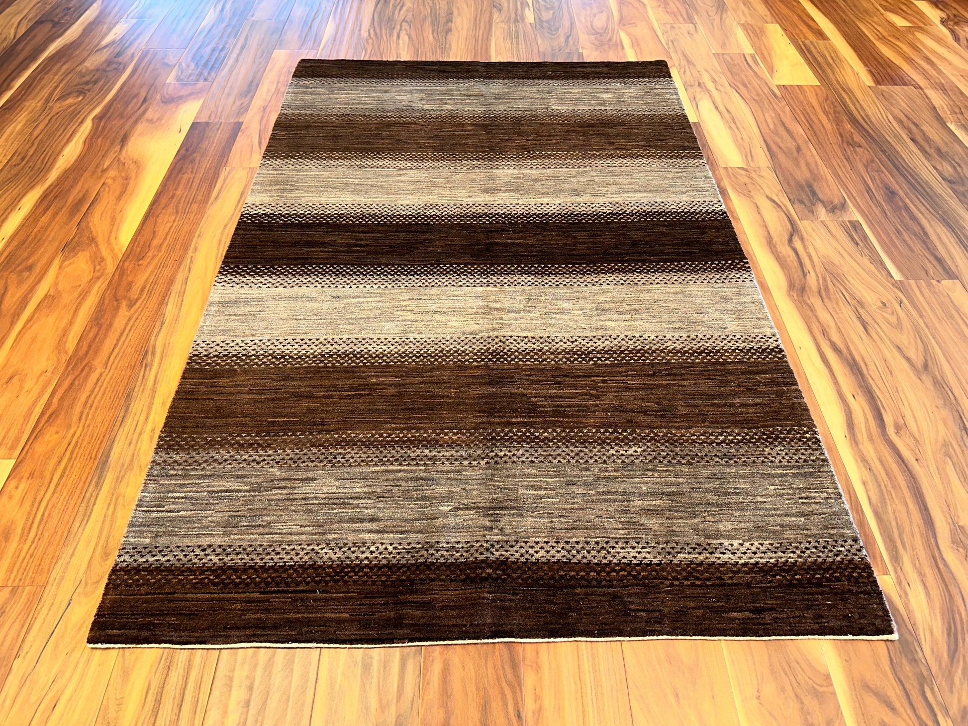 A warm, grounding presence defines this hand-knotted rug, woven in a sequence of earthy horizontal bands that blend deep brown, beige, and subtle gray tones. The variation in texture and tone creates a gentle rhythm across the surface, enhanced by fine woven accents that add dimension without overwhelming the design. Its understated elegance makes it a seamless fit for relaxed, organic interiors.