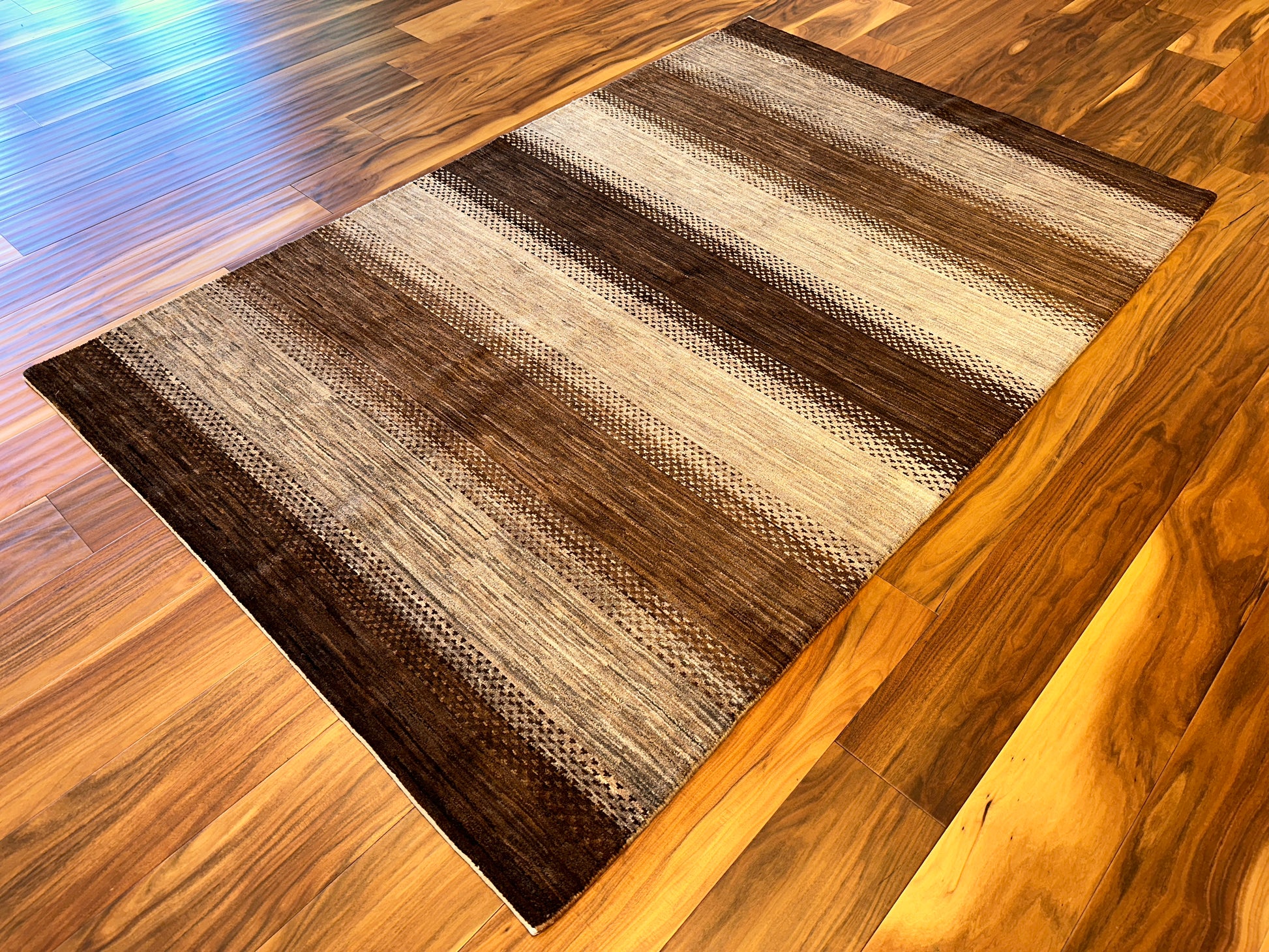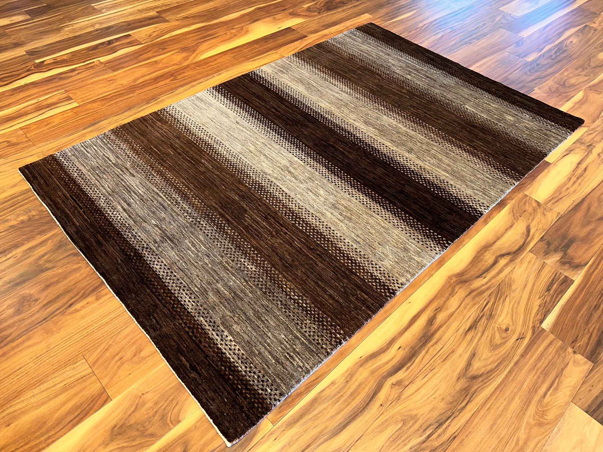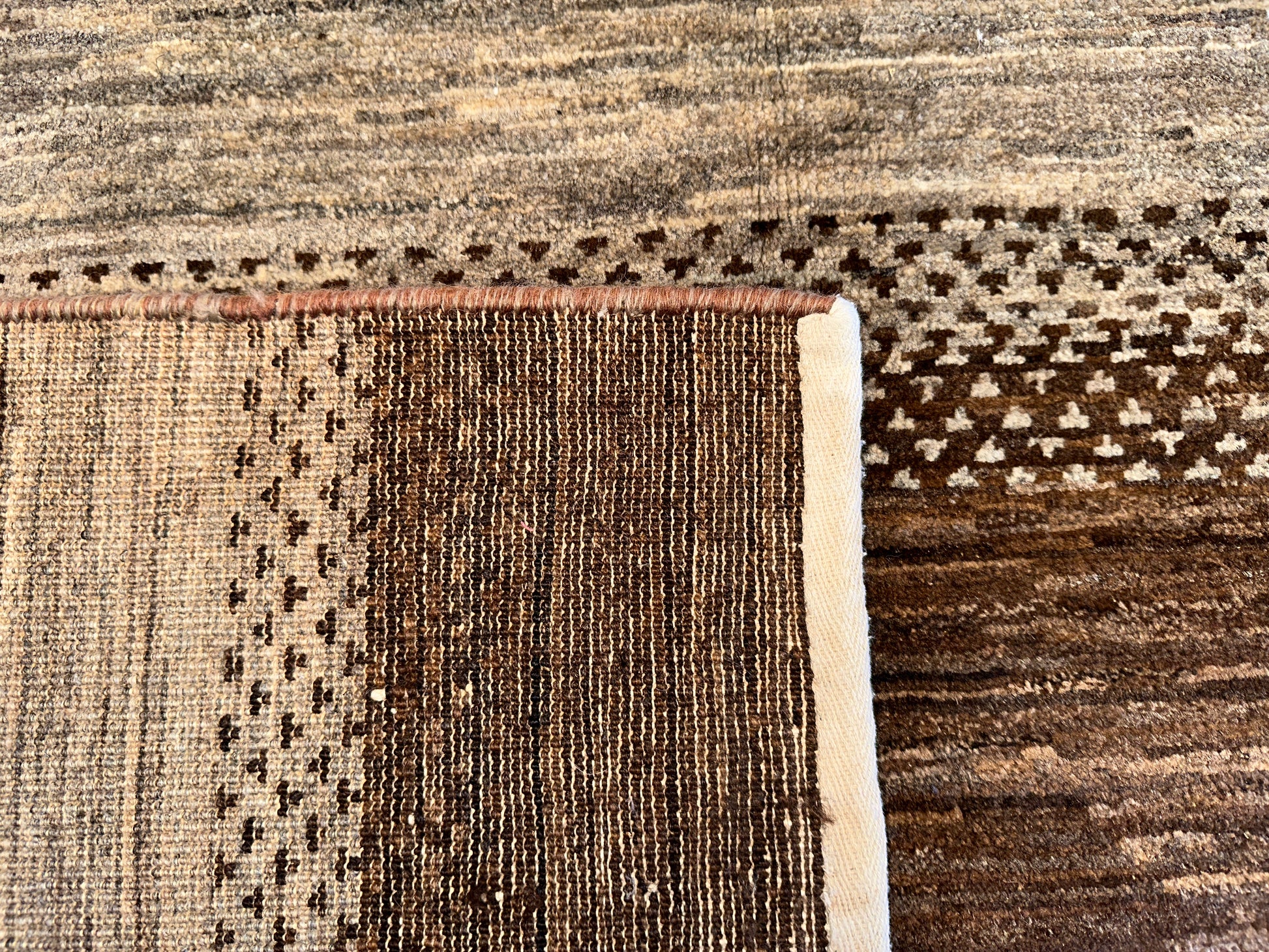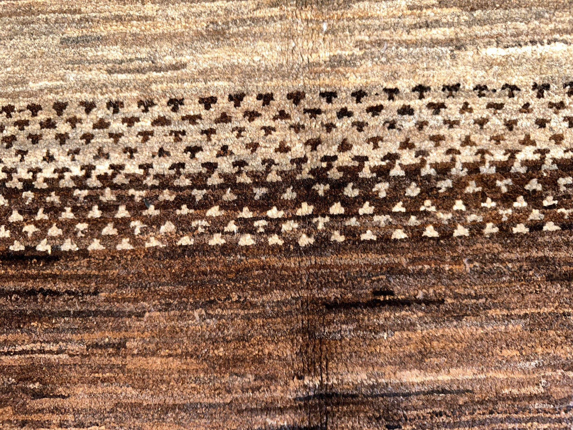 A warm, grounding presence defines this hand-knotted rug, woven in a sequence of earthy horizontal bands that blend deep brown, beige, and subtle gray tones. The variation in texture and tone creates a gentle rhythm across the surface, enhanced by fine woven accents that add dimension without overwhelming the design. Its understated elegance makes it a seamless fit for relaxed, organic interiors.
