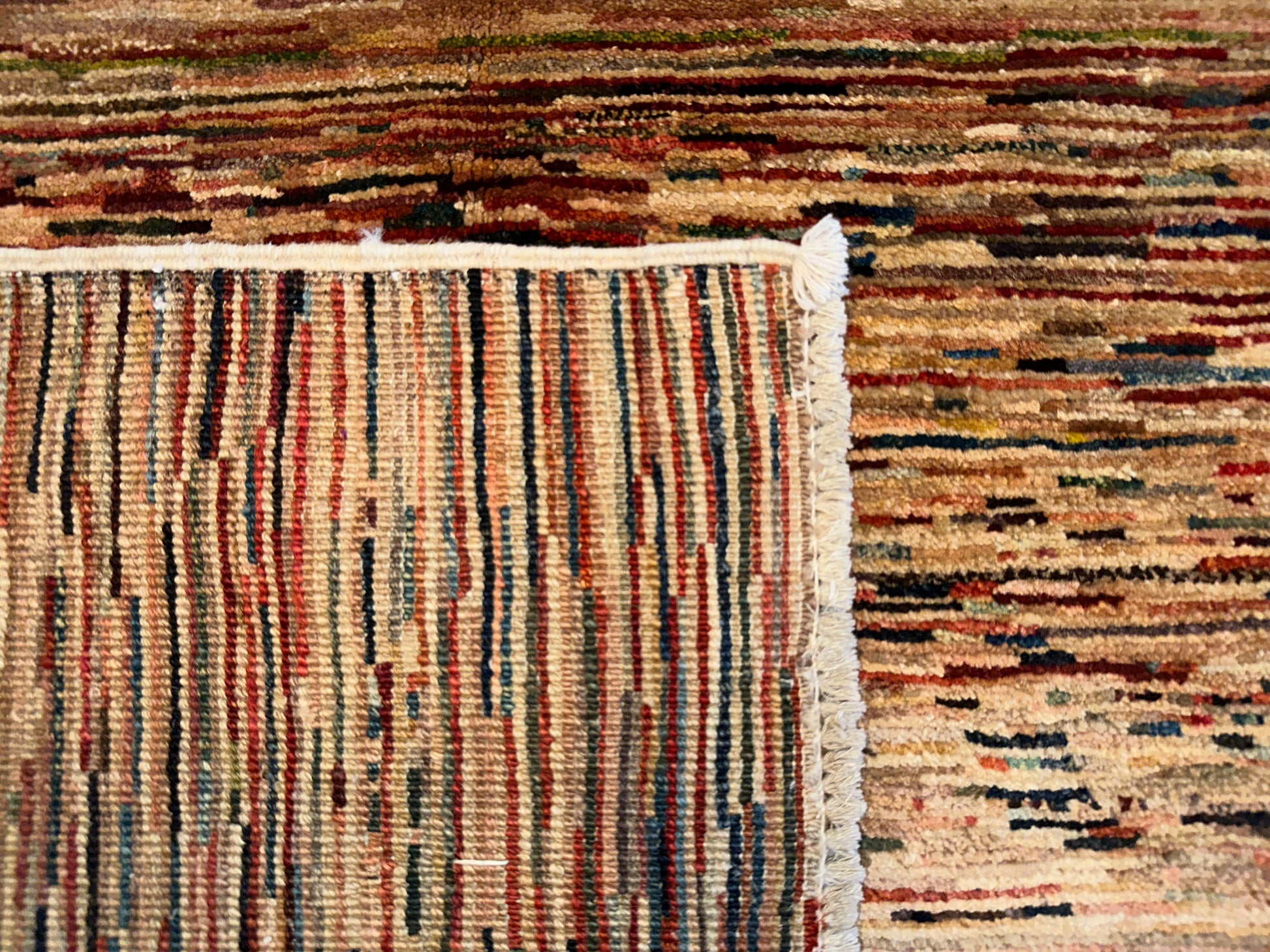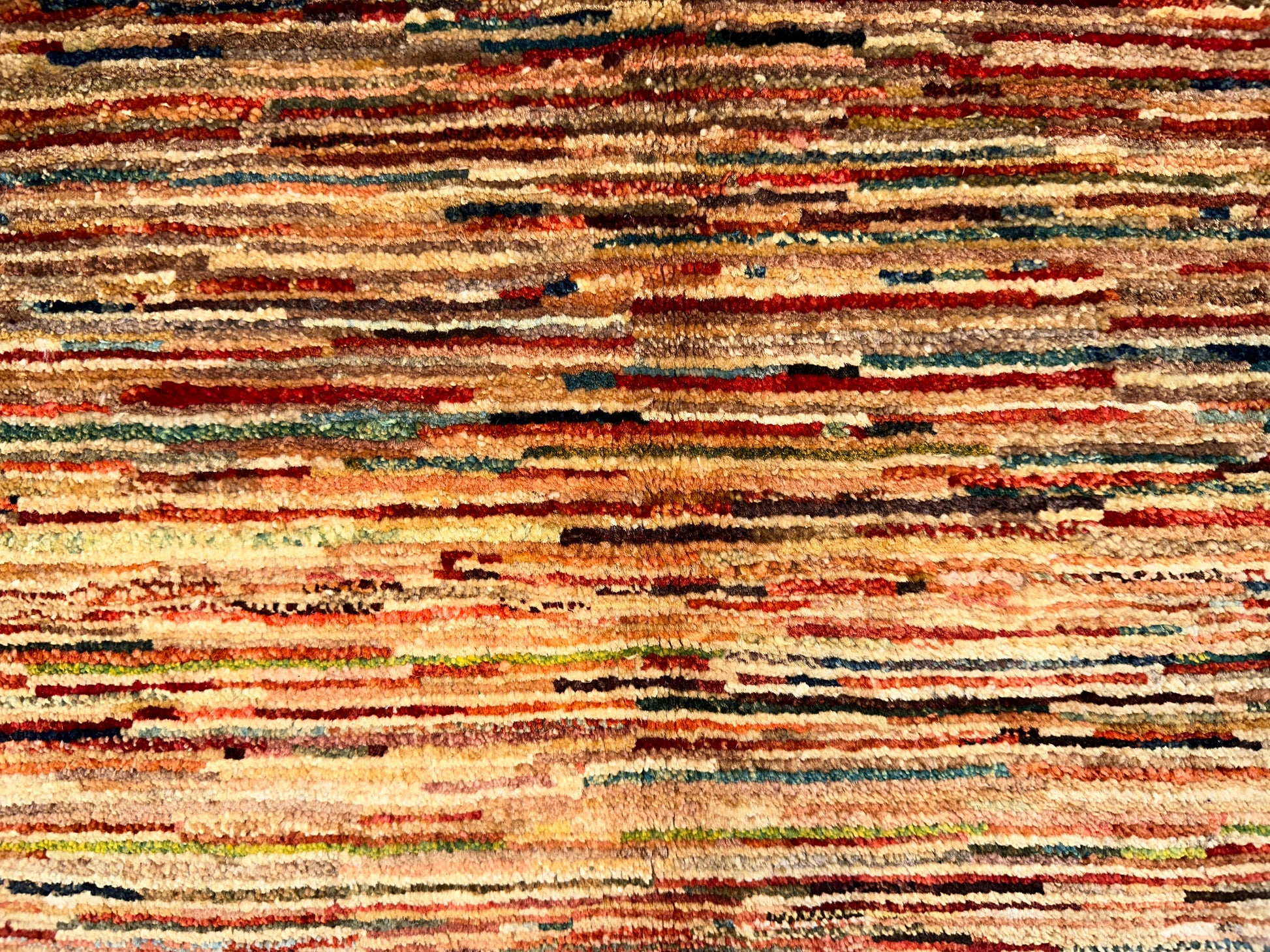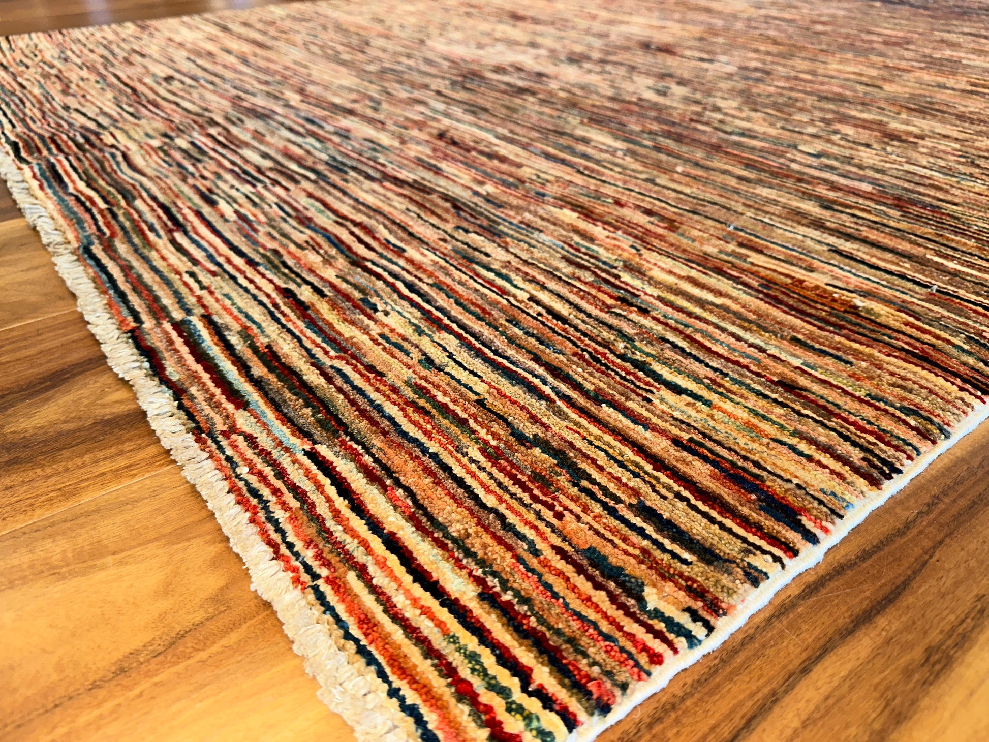 A softly radiant palette of earth tones flows across this hand-knotted rug in gently shifting horizontal striations, giving the piece a dynamic yet grounded feel. Variations of rust, beige, ochre, and muted green evoke natural landscapes, while the linear rhythm creates subtle movement. Its minimalist composition makes it especially versatile and easy to layer in a range of settings.