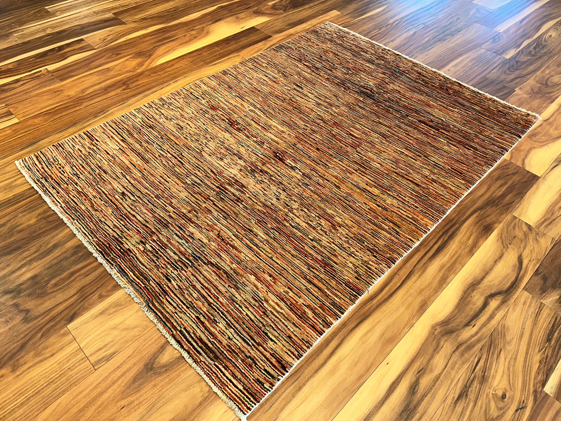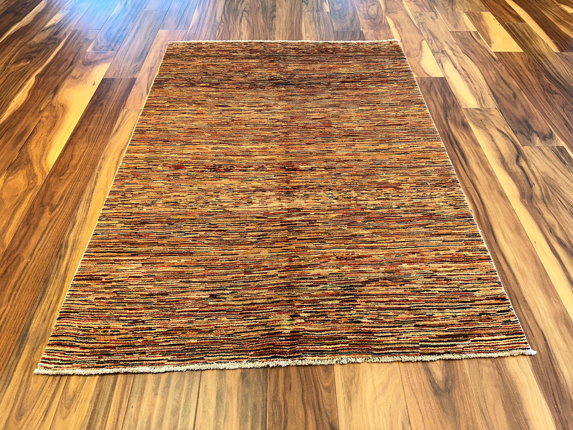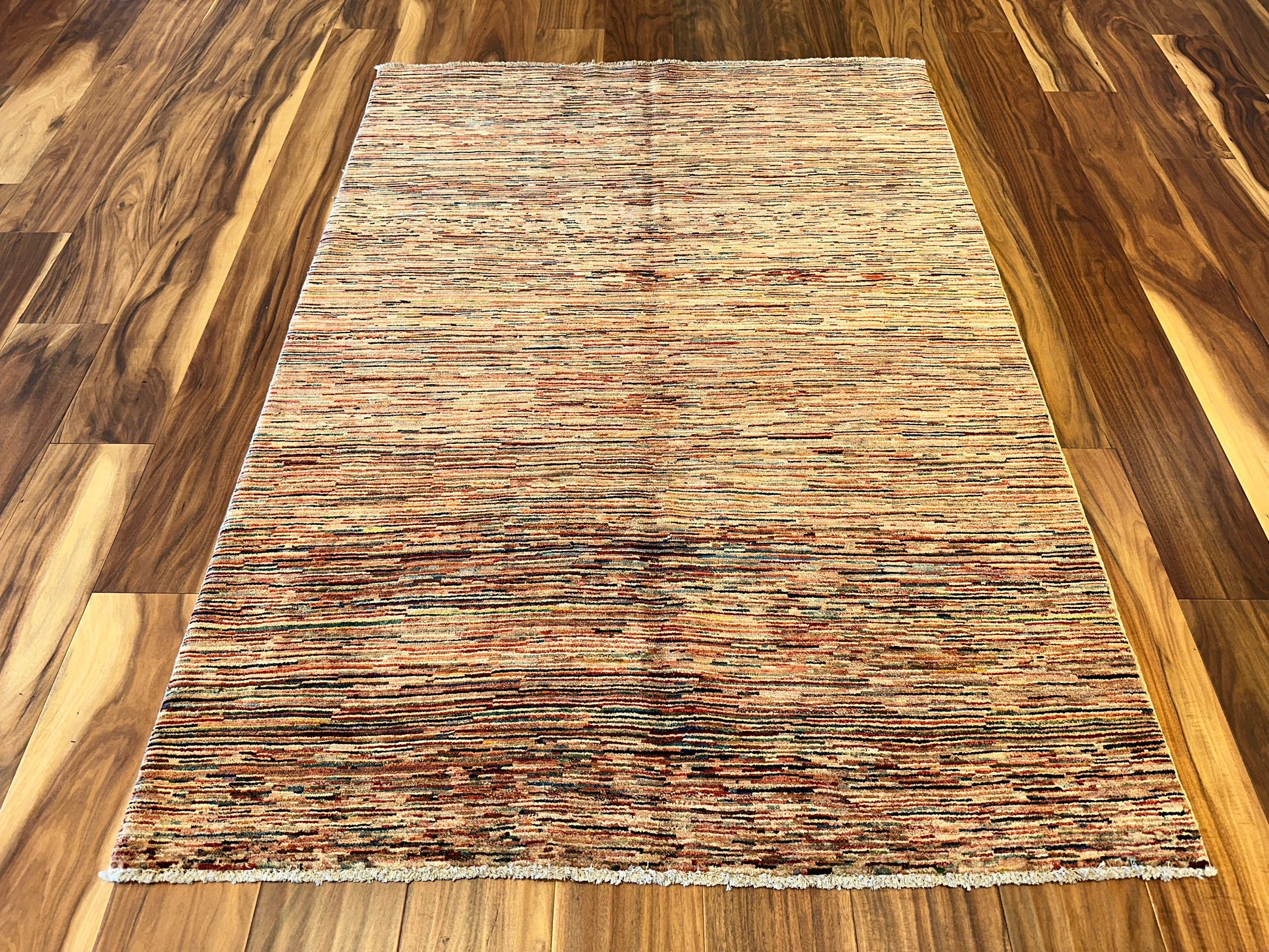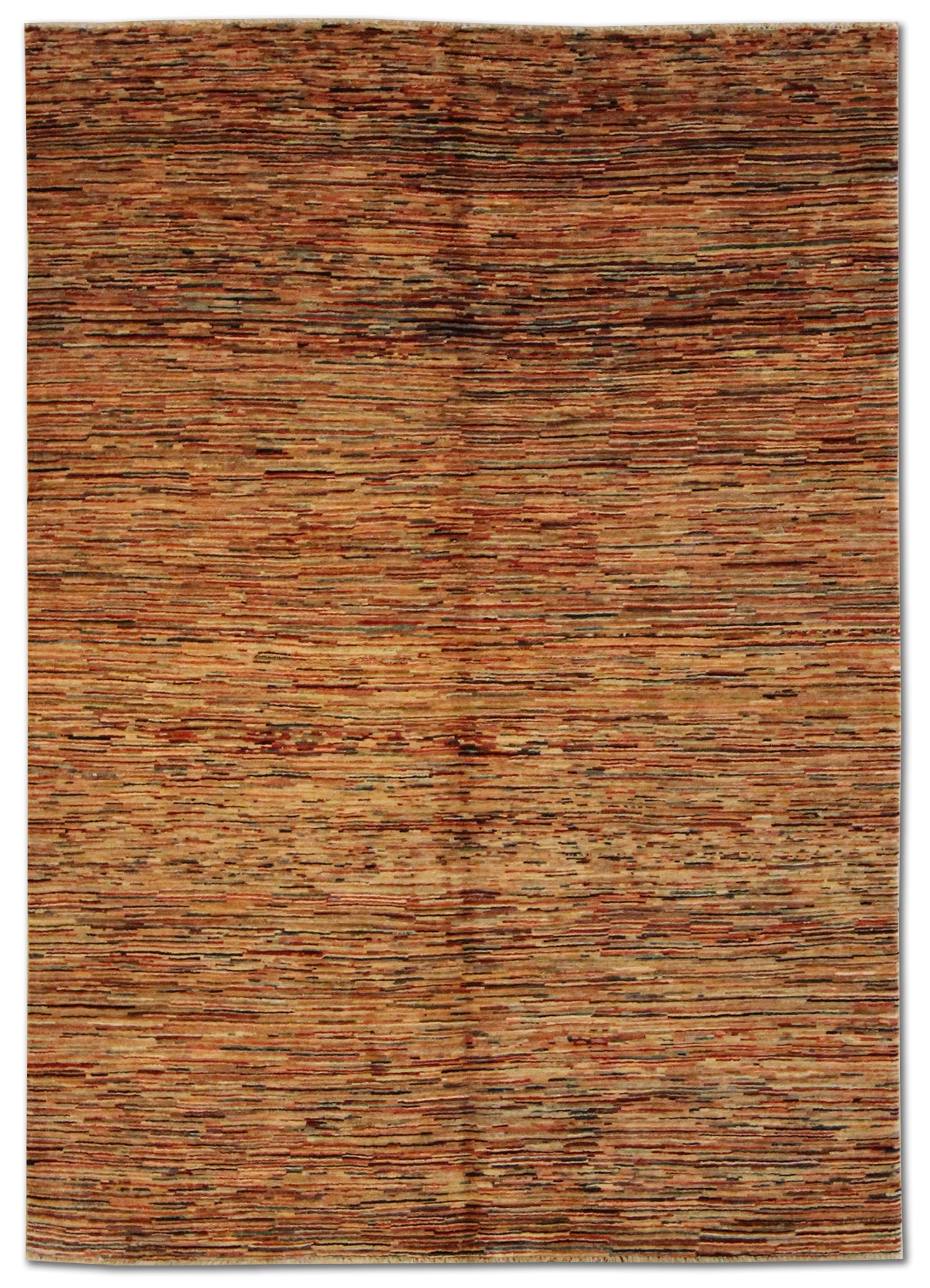 A softly radiant palette of earth tones flows across this hand-knotted rug in gently shifting horizontal striations, giving the piece a dynamic yet grounded feel. Variations of rust, beige, ochre, and muted green evoke natural landscapes, while the linear rhythm creates subtle movement. Its minimalist composition makes it especially versatile and easy to layer in a range of settings.