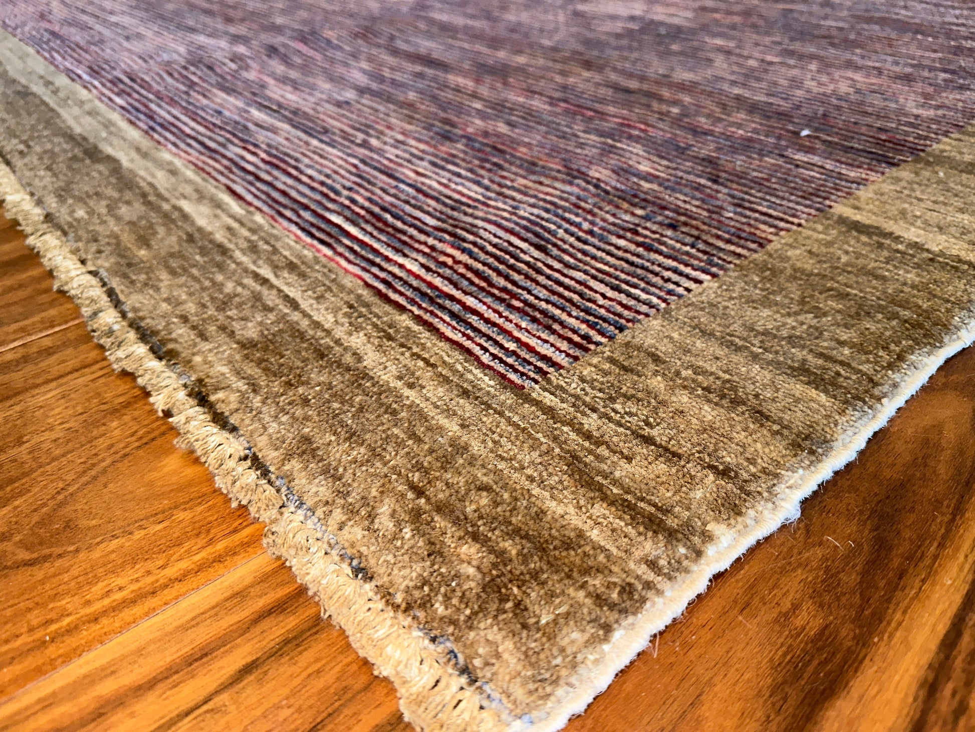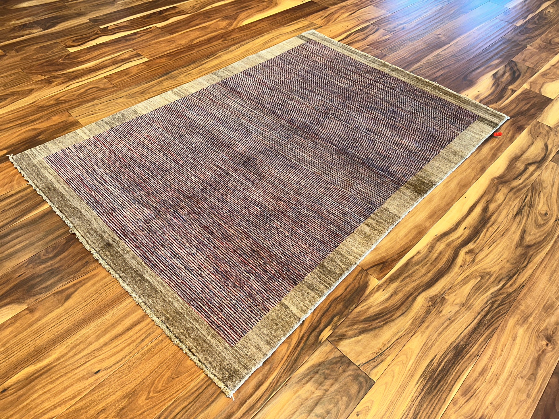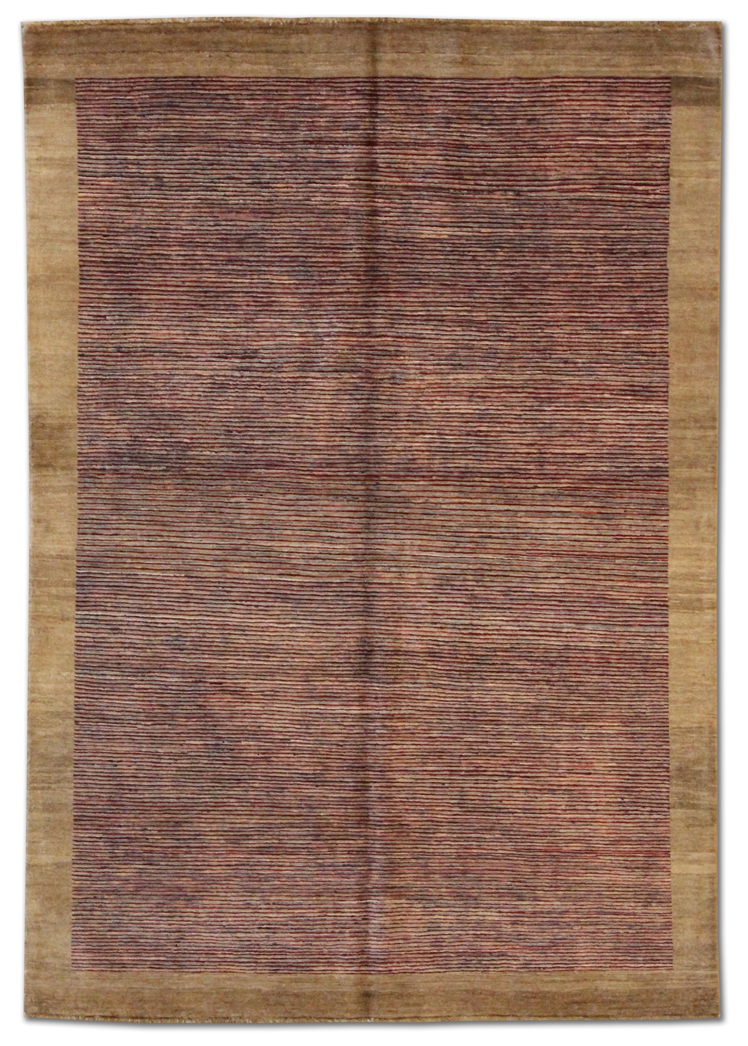 Fine rows of hand-knotted lines in soft plum, violet, and rust rise across the field of this modern rug, quietly shifting in tone as they move inward from the pale beige border. The result is elegant yet minimal, with a restrained use of color and texture that creates a subtle visual rhythm.