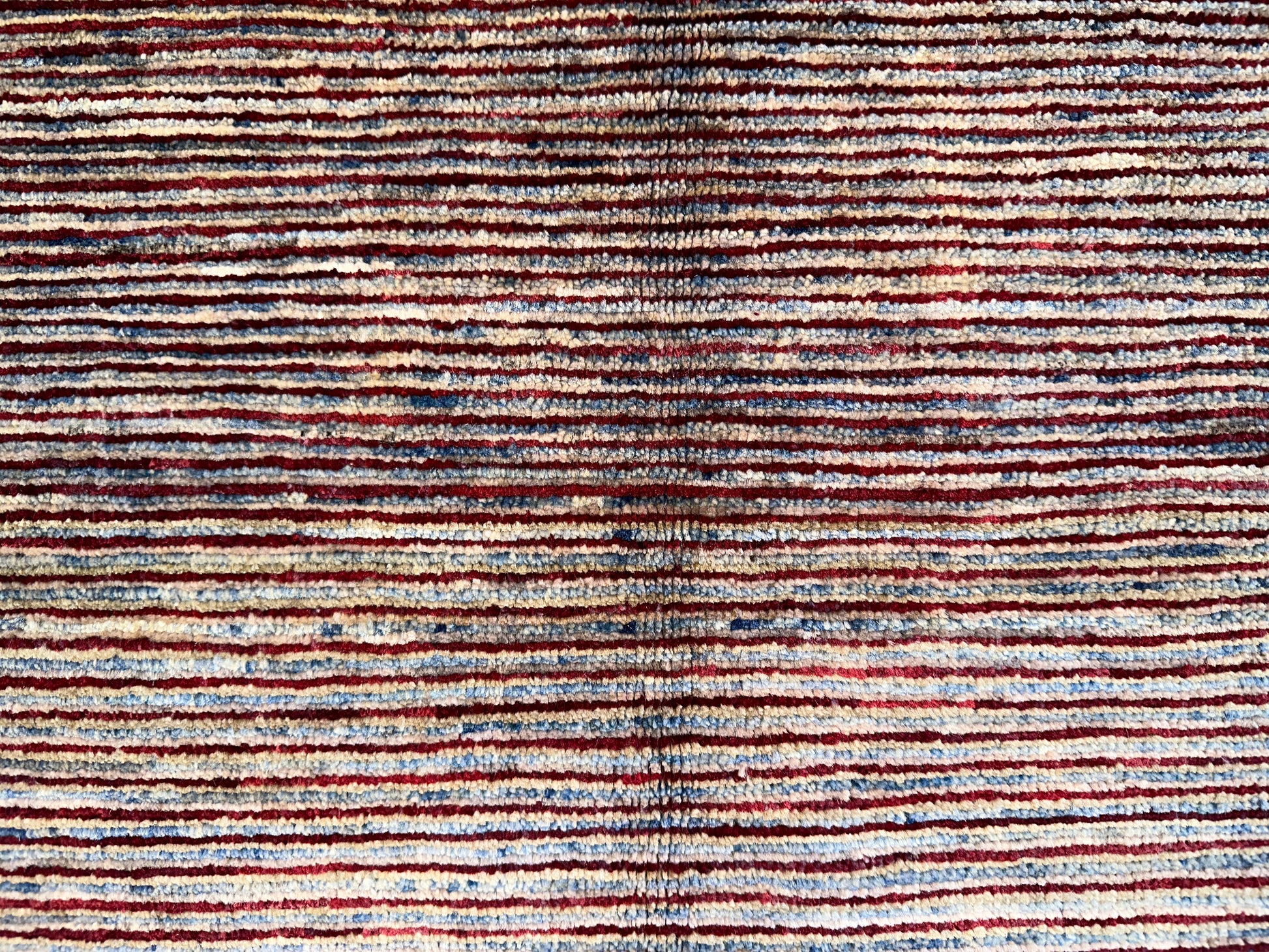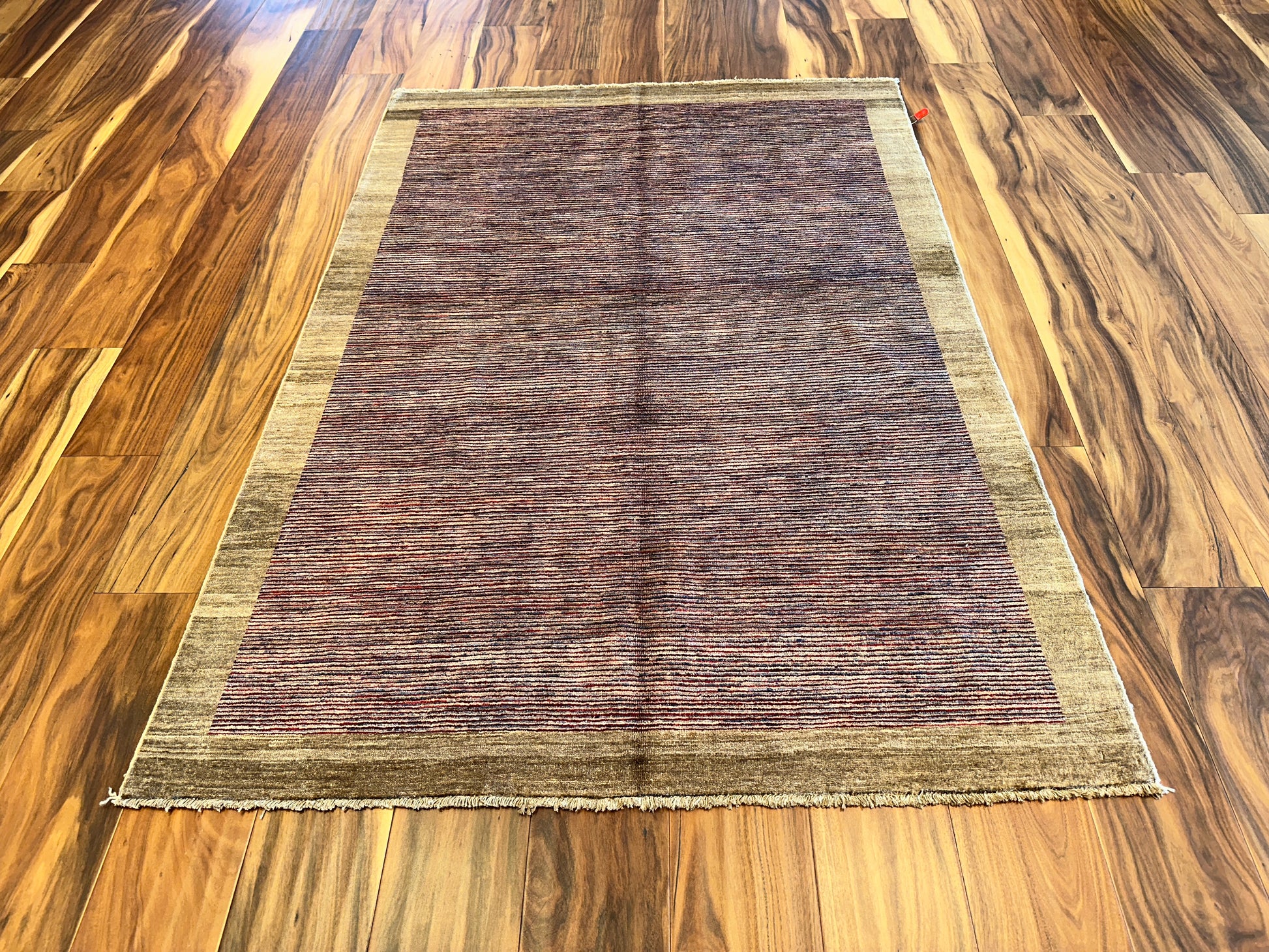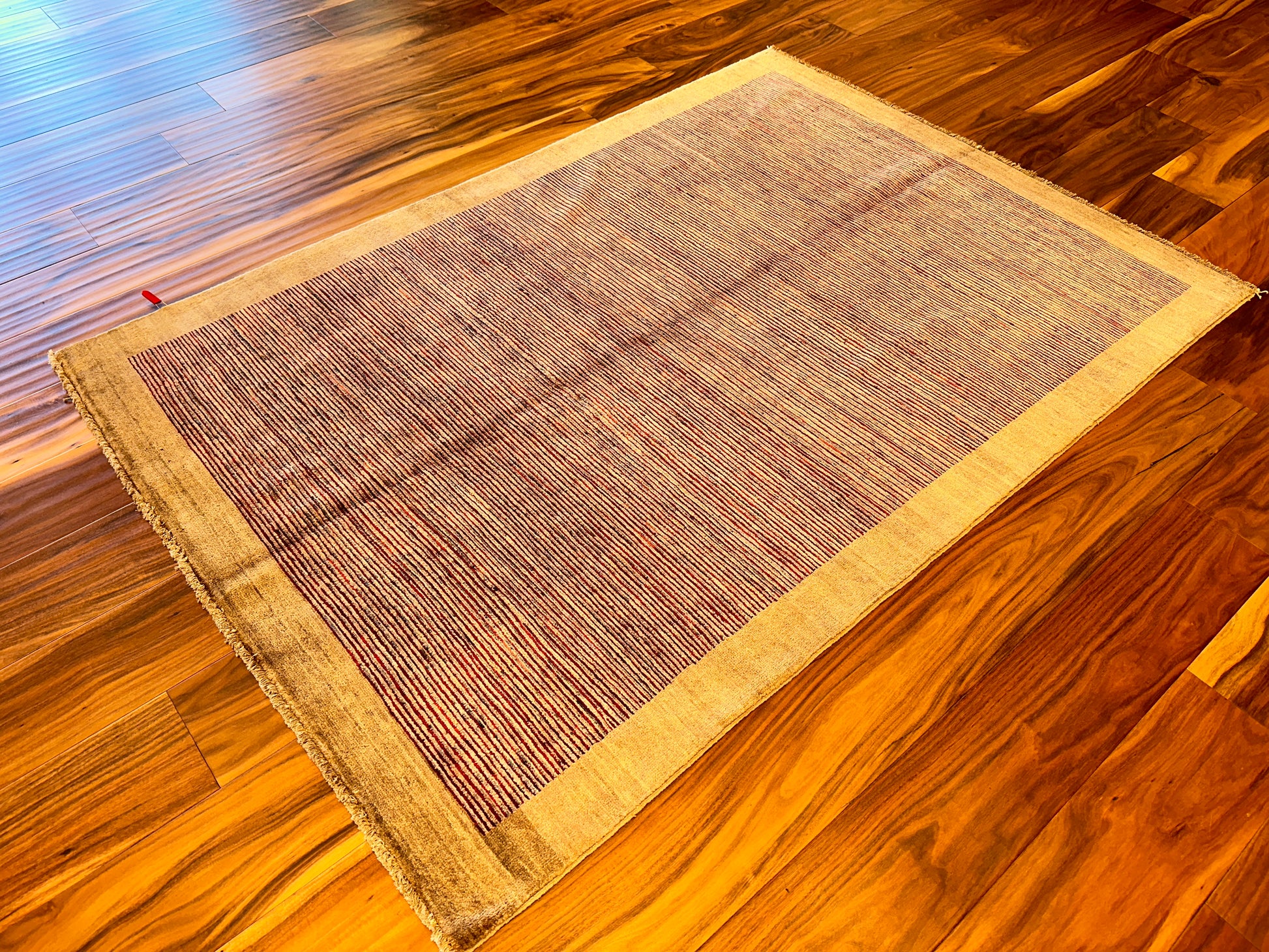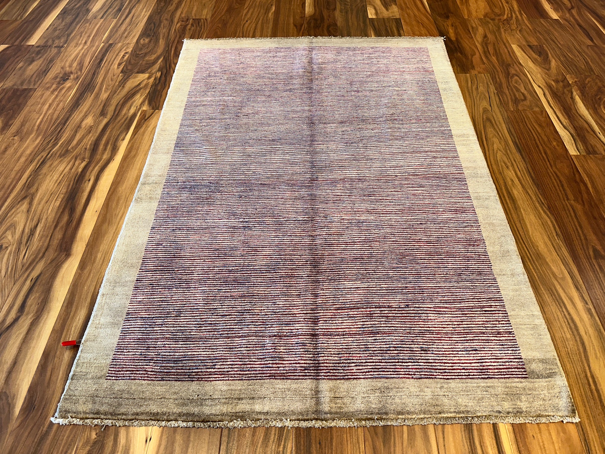 Fine rows of hand-knotted lines in soft plum, violet, and rust rise across the field of this modern rug, quietly shifting in tone as they move inward from the pale beige border. The result is elegant yet minimal, with a restrained use of color and texture that creates a subtle visual rhythm.