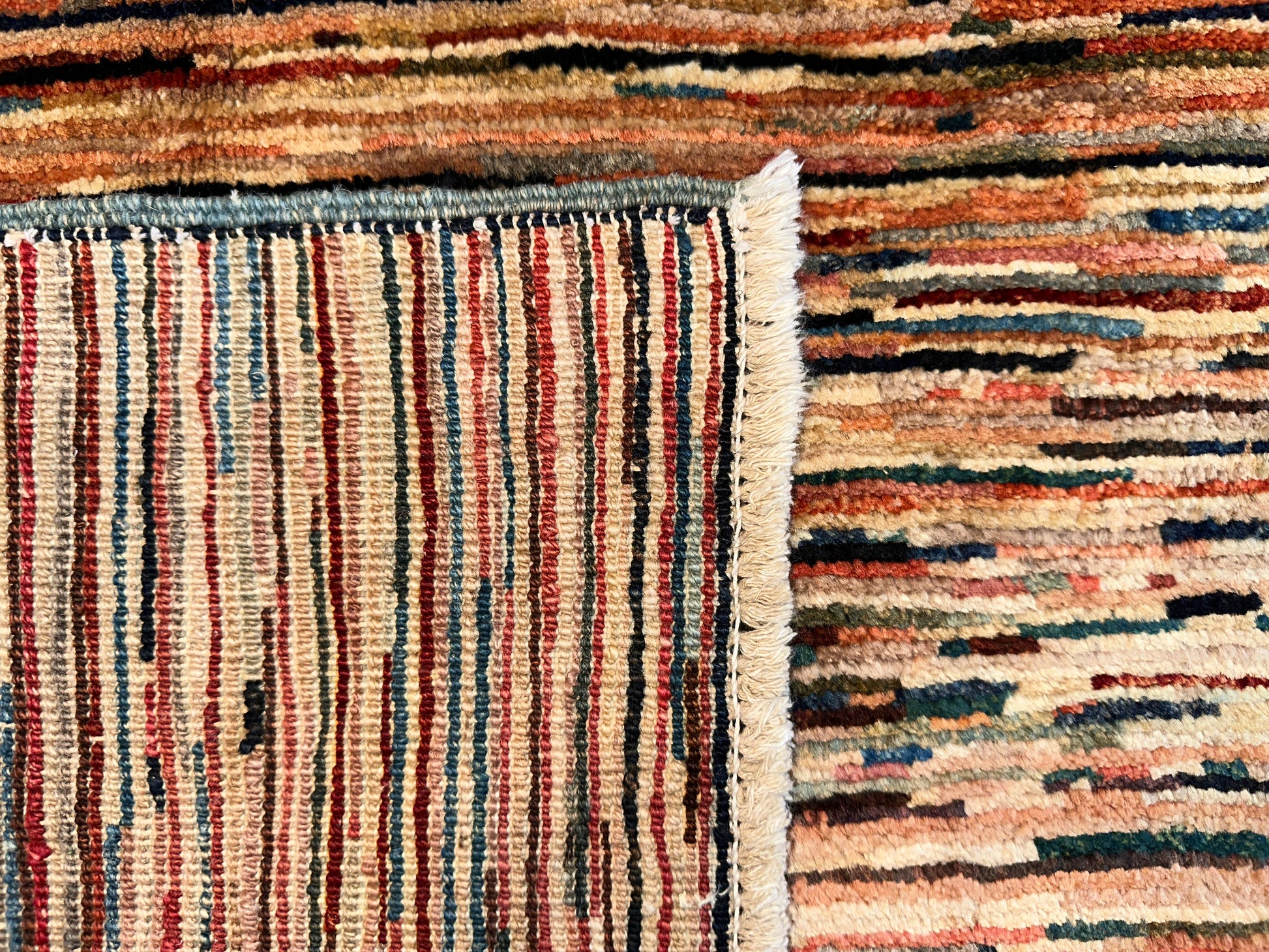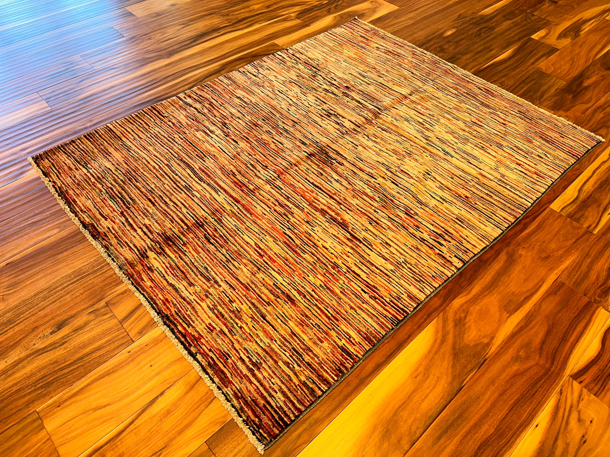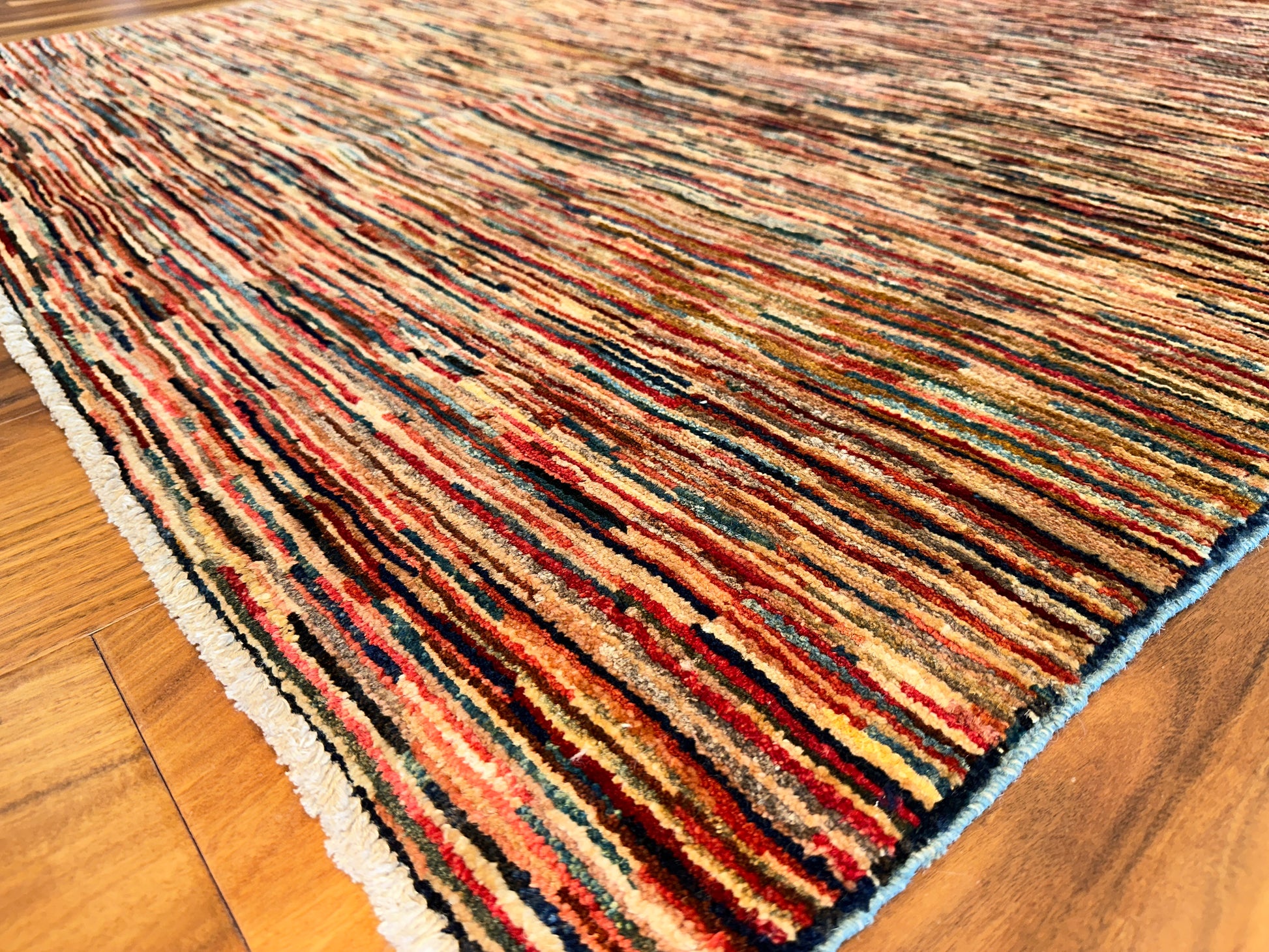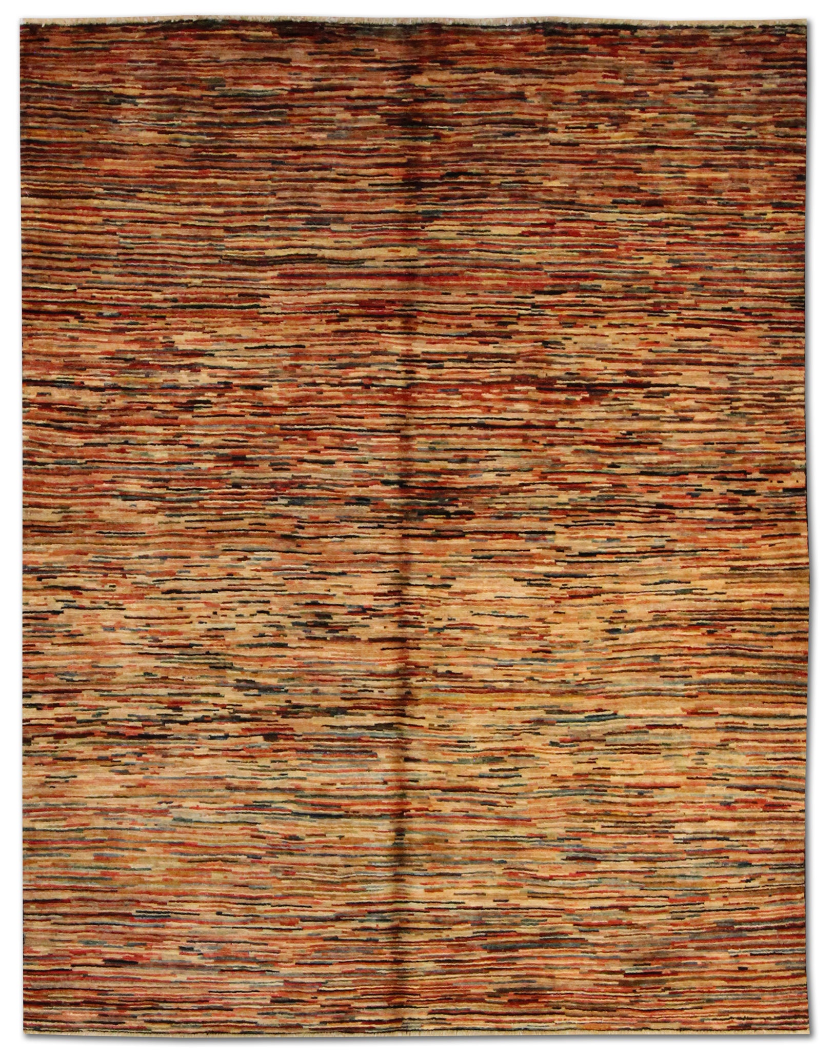 This radiant hand-knotted rug features a cascade of fine horizontal striations, shifting seamlessly through shades of burnt orange, sand, walnut, and pale amber. The linear pattern mimics the movement of sunset across a desert plain, offering warmth and rhythm to any room. Its painterly variation and soft texture make it a versatile choice for spaces in need of color and calm.
