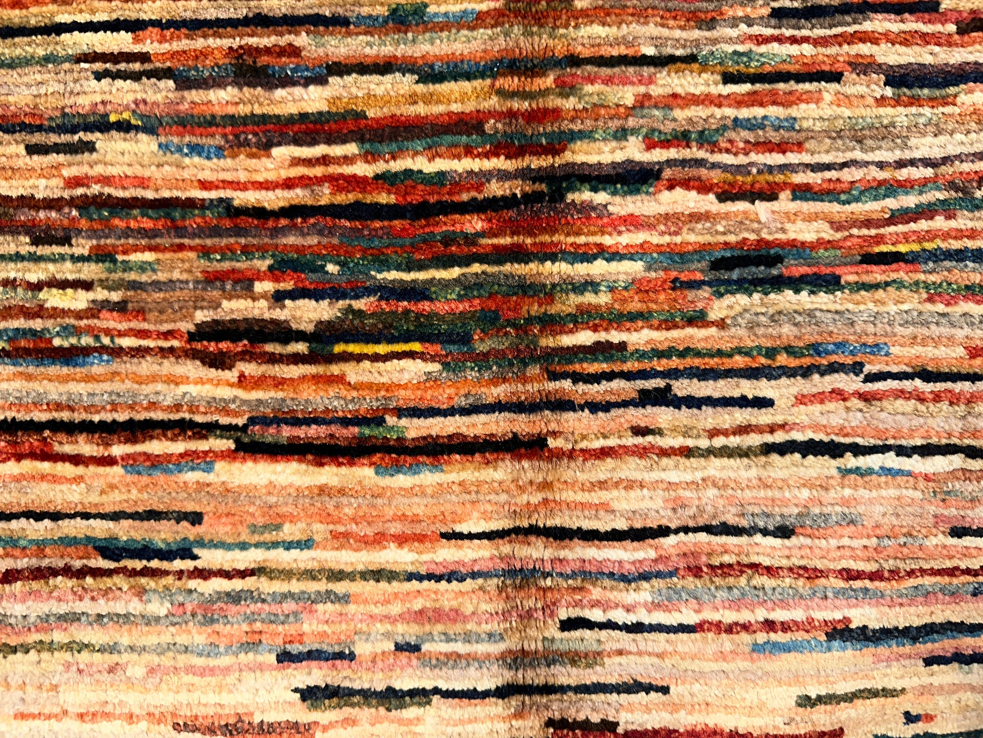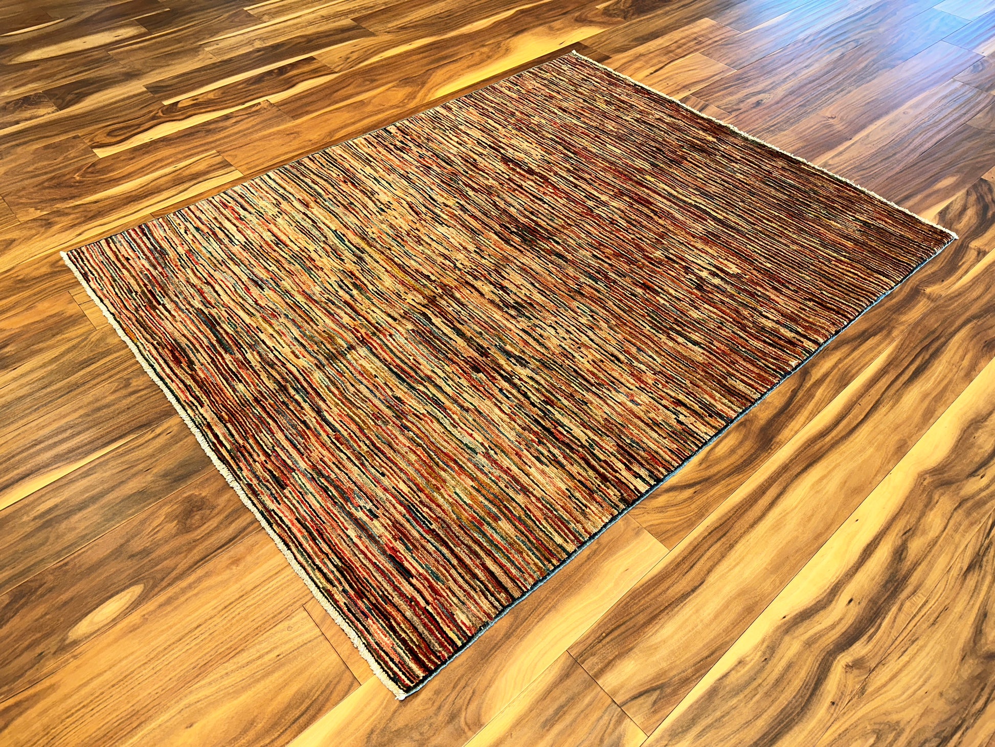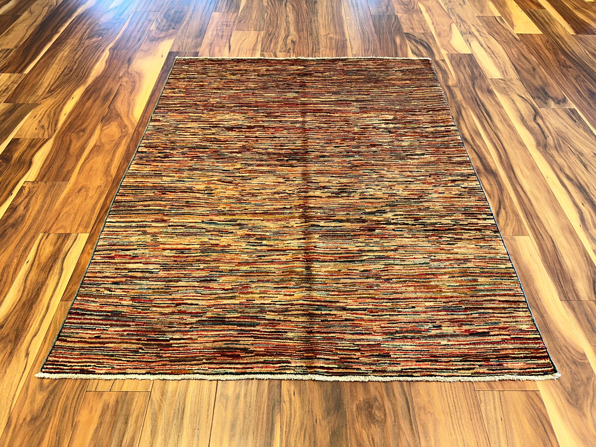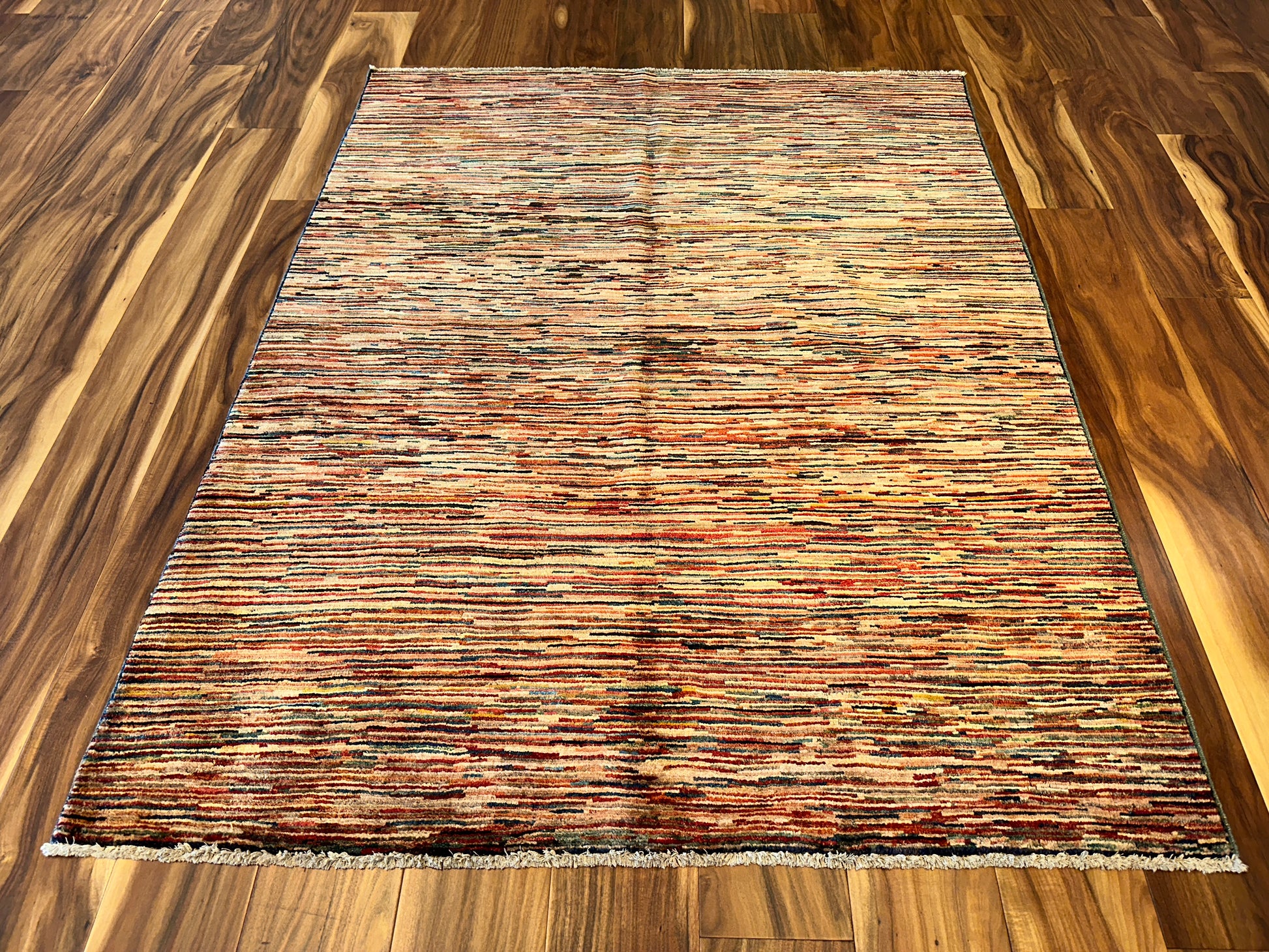 This radiant hand-knotted rug features a cascade of fine horizontal striations, shifting seamlessly through shades of burnt orange, sand, walnut, and pale amber. The linear pattern mimics the movement of sunset across a desert plain, offering warmth and rhythm to any room. Its painterly variation and soft texture make it a versatile choice for spaces in need of color and calm.