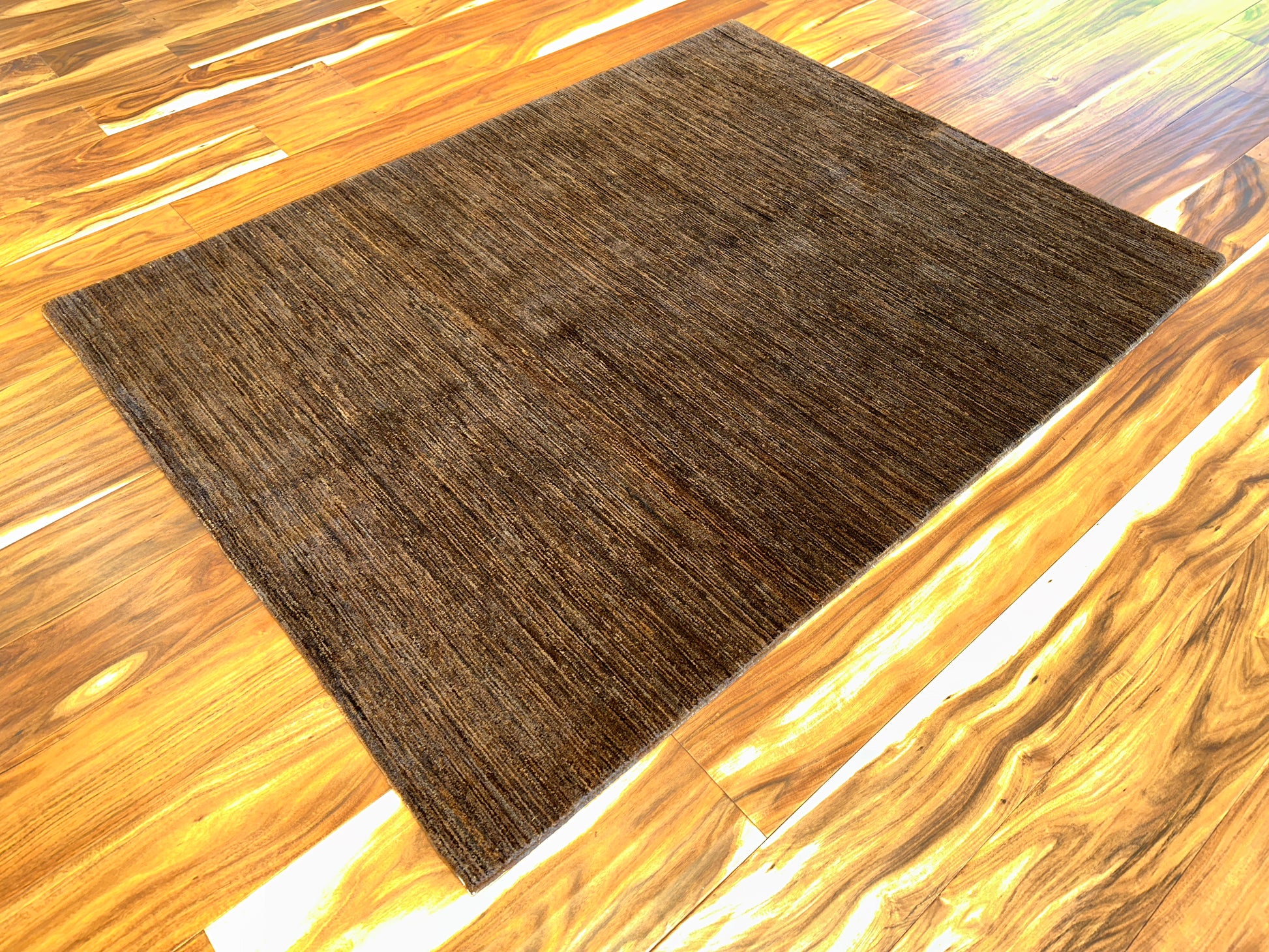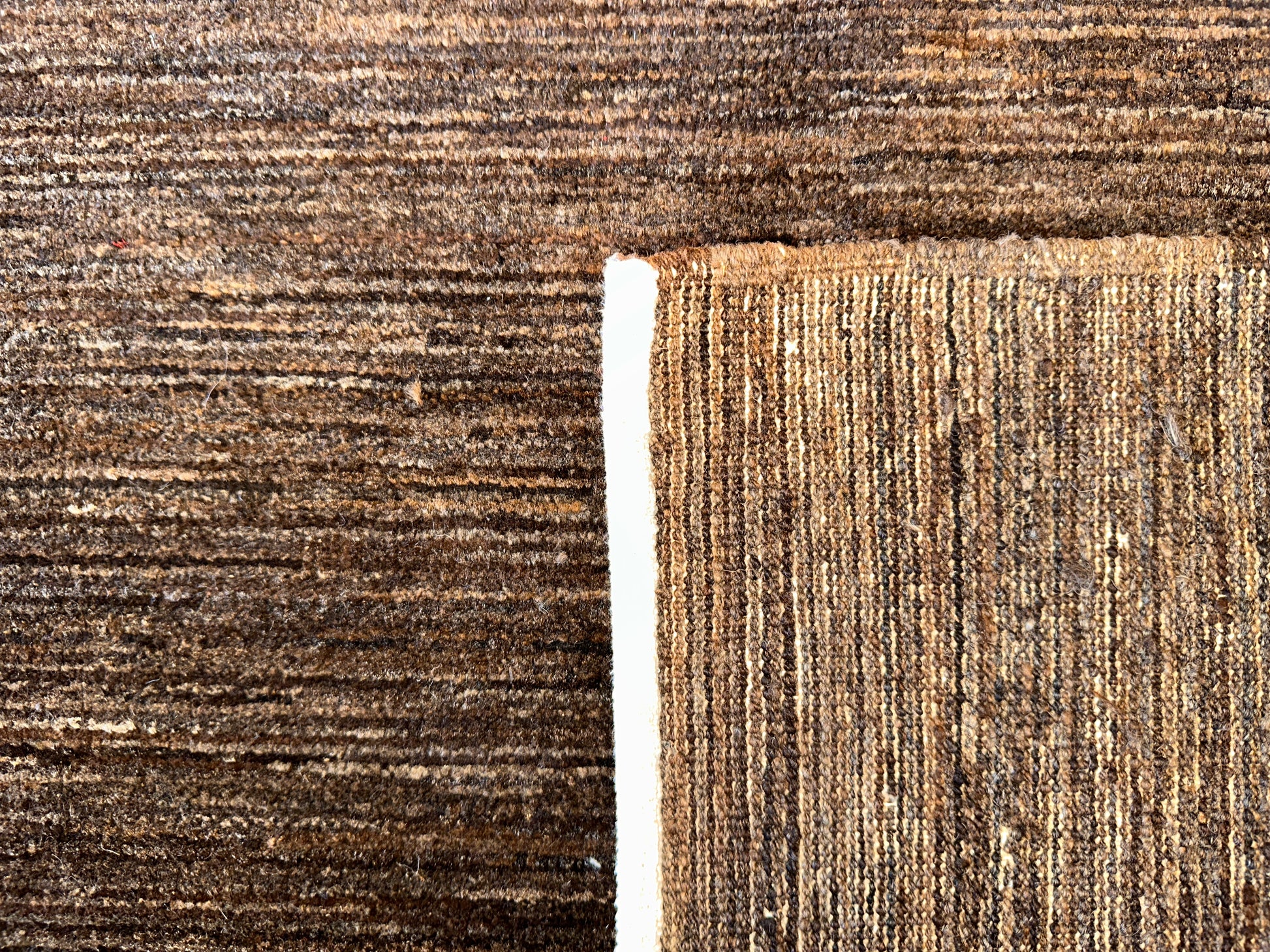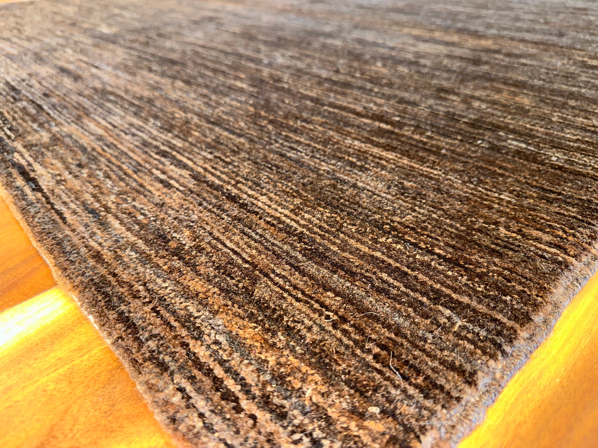 This rug offers a richly minimalist take on modern design, with deep, tonal brown striations giving it quiet depth and warmth. The overall look is restrained but full of texture, making it ideal for layering into a neutral interior or grounding a richly styled room.