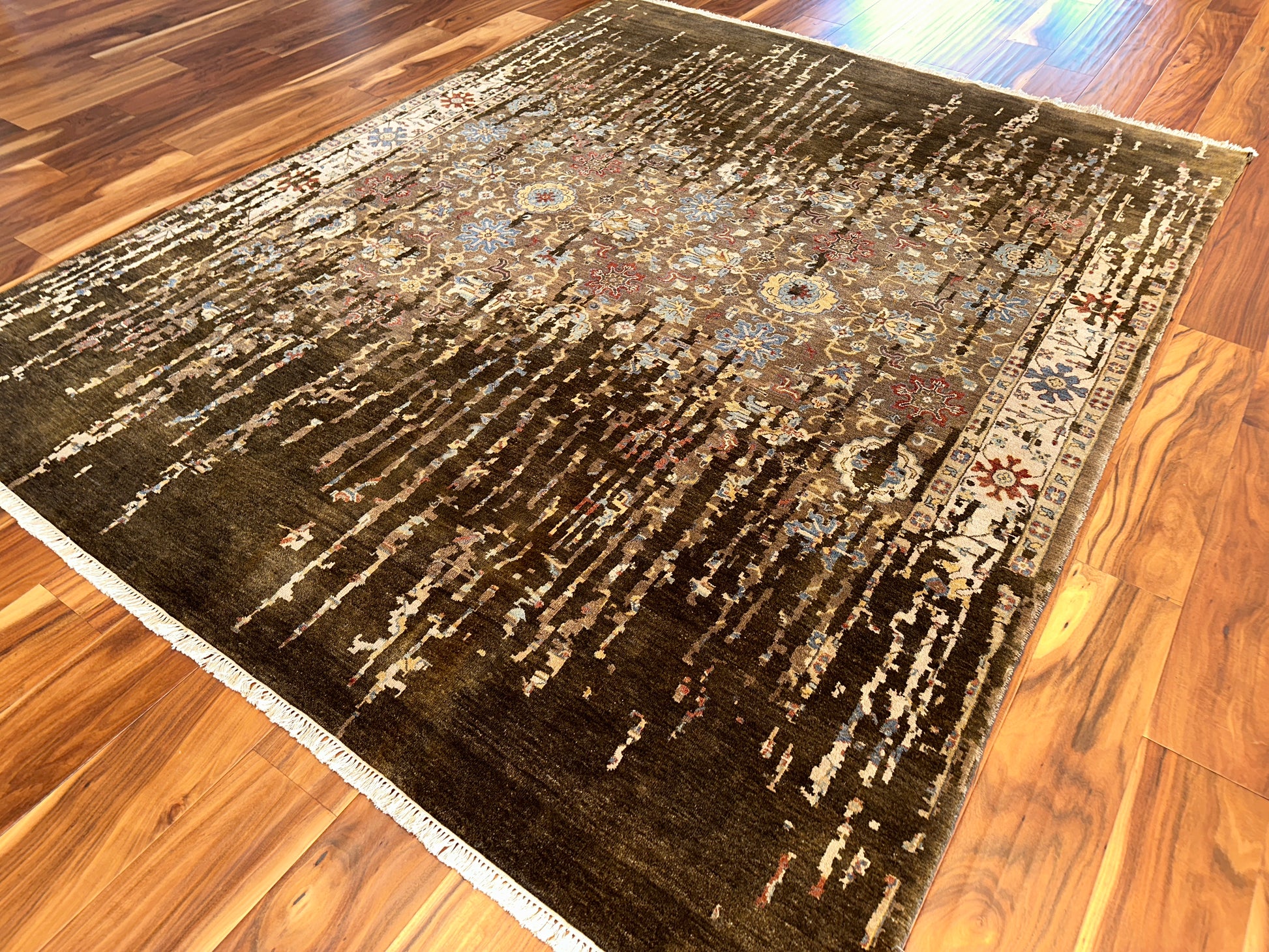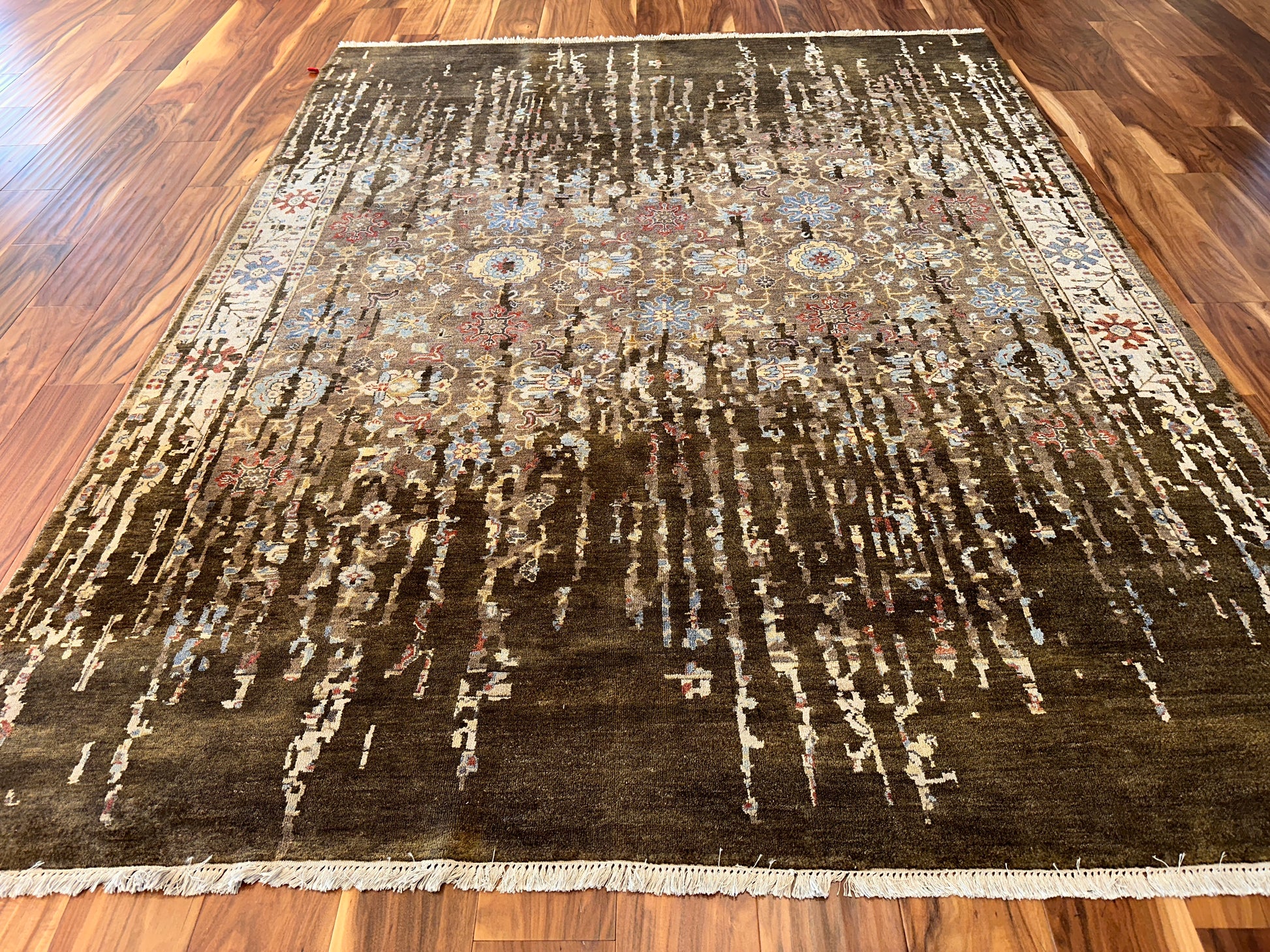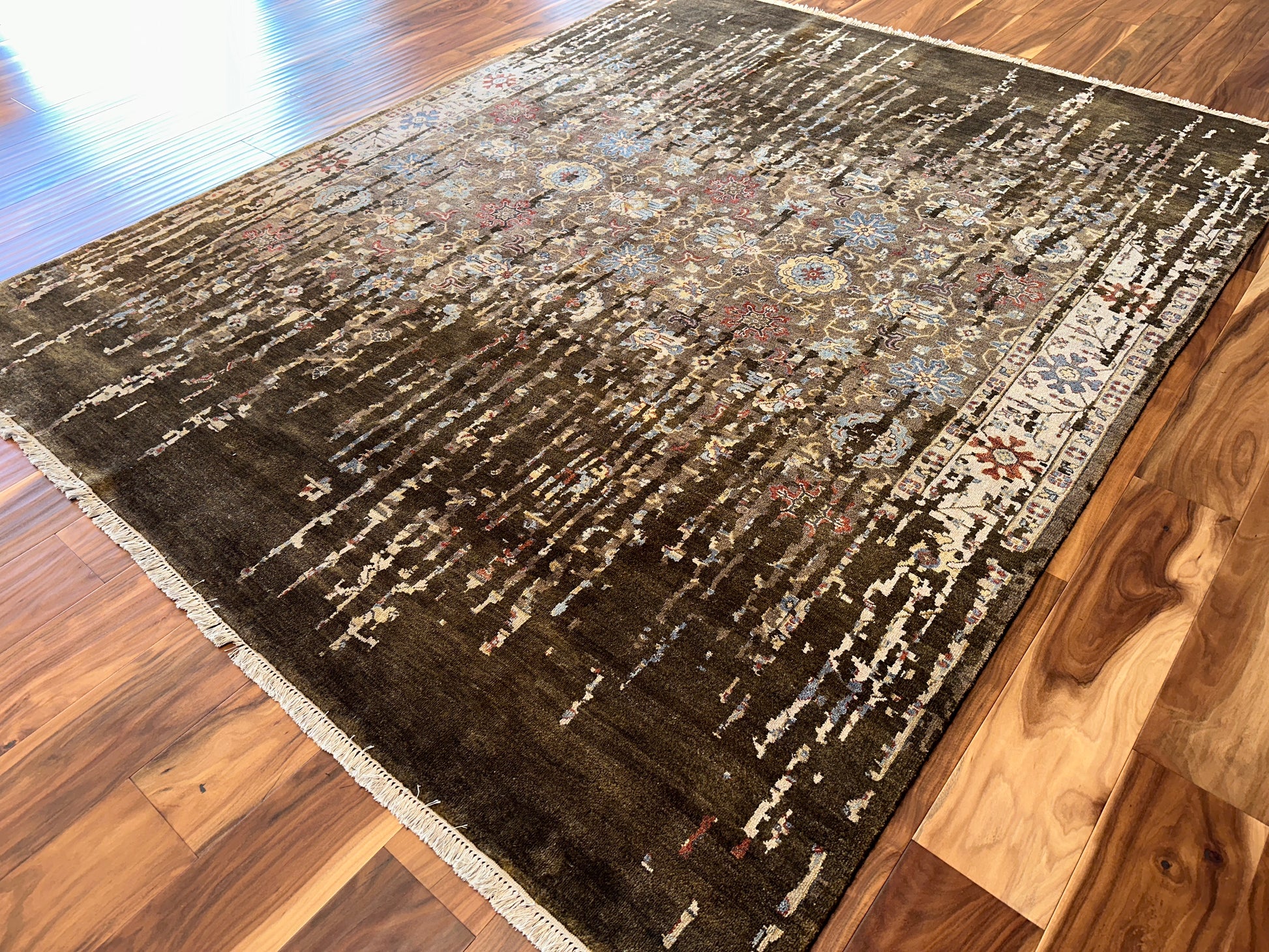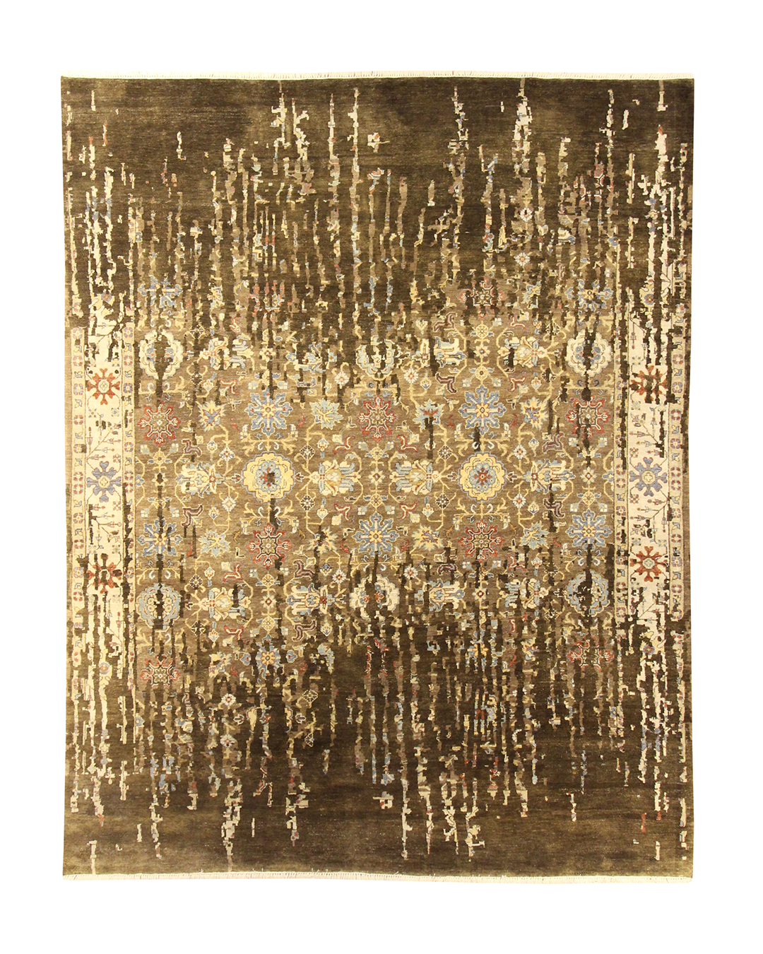 With its artful deconstruction of a traditional floral medallion pattern, this rug evokes the feeling of an ancient textile slowly dissolving into a soft, earthen mist. Muted golds, faded reds, and powder blues emerge gently through a rich field of olive brown, creating a layered composition that feels both aged and avant-garde. It adds soulful warmth to rooms that blend old and new.