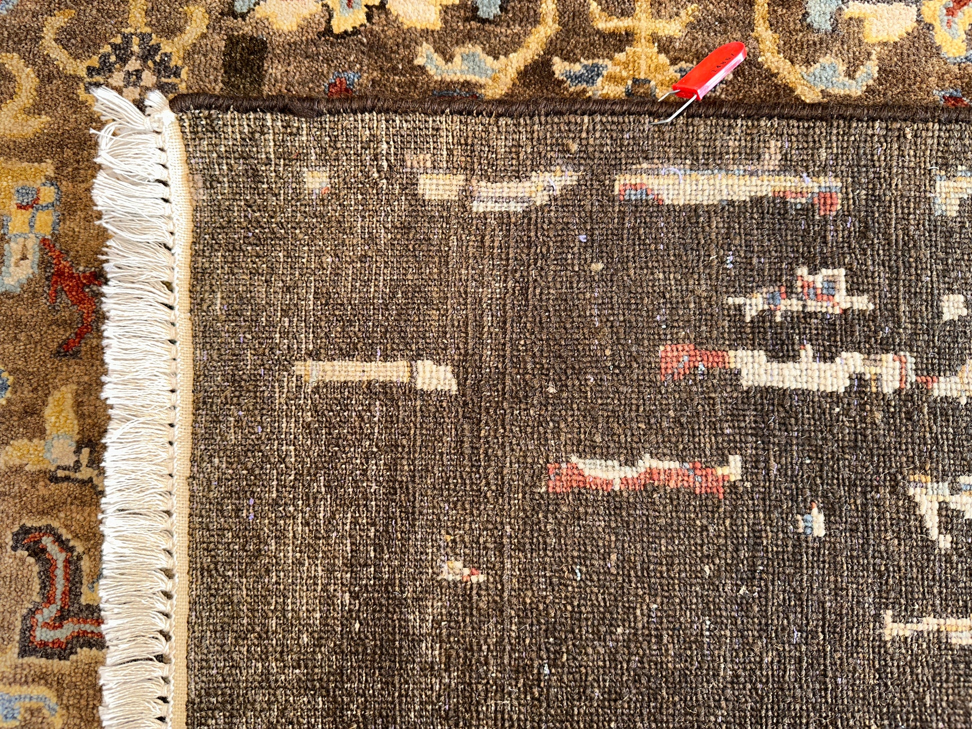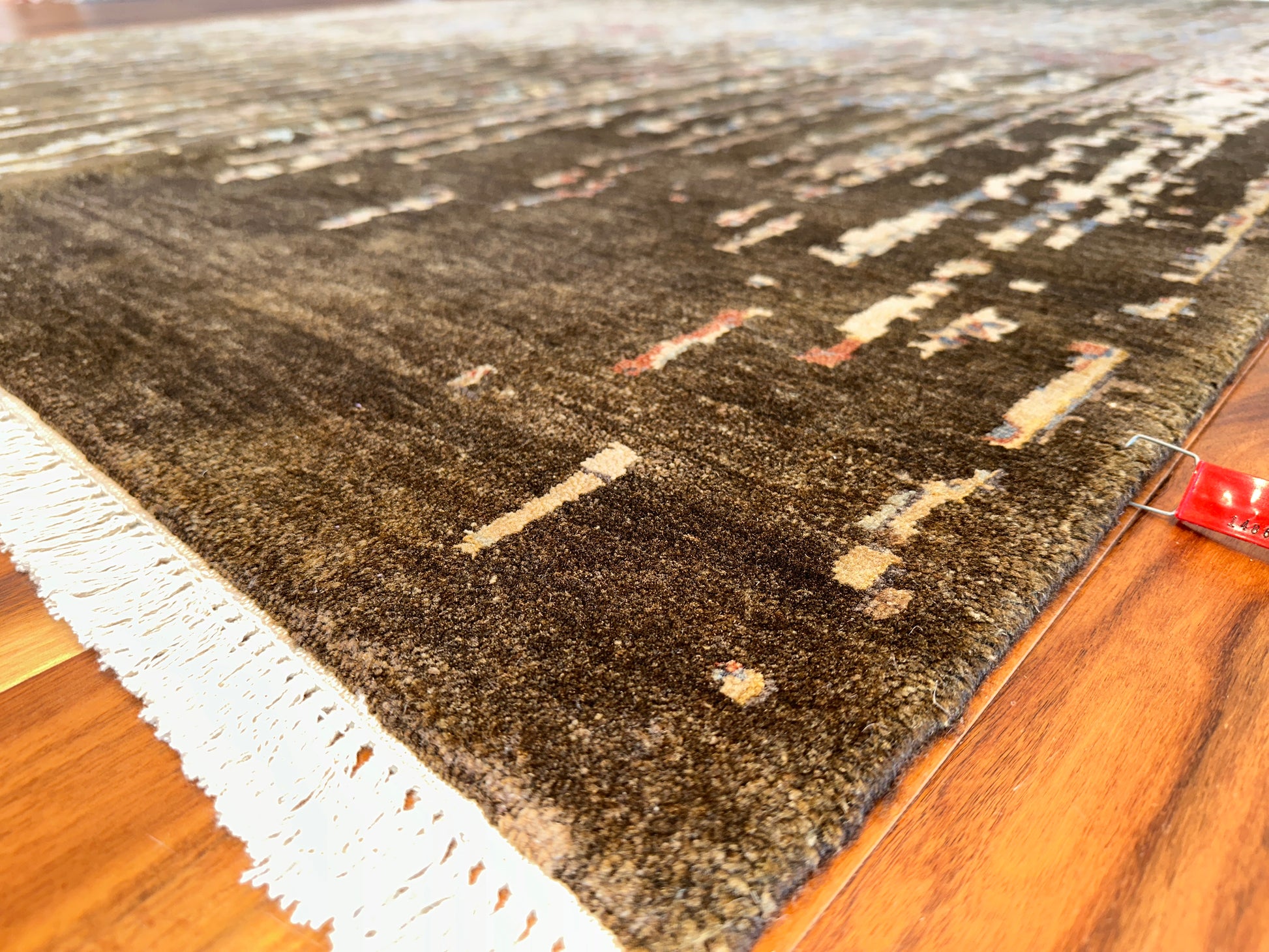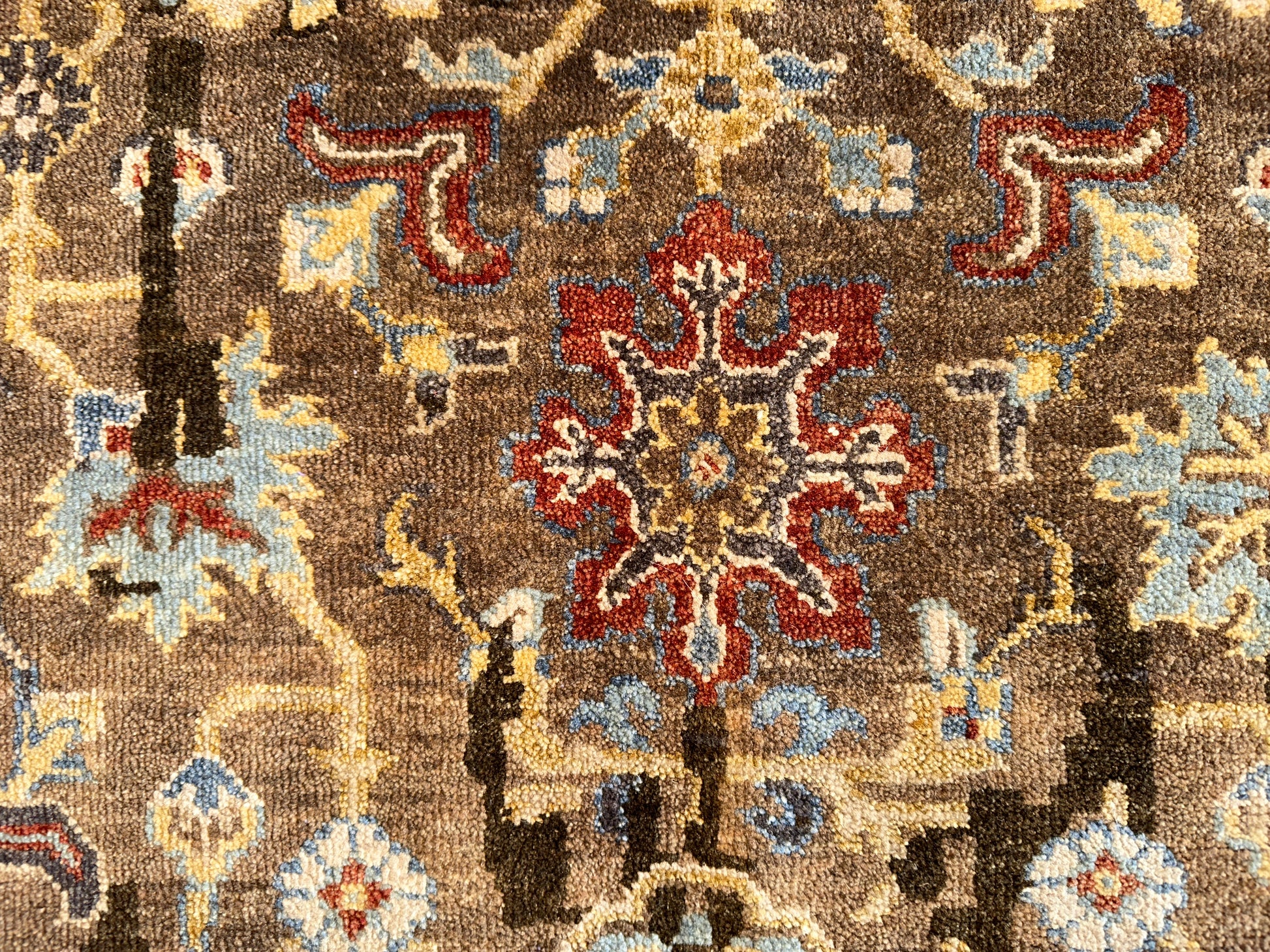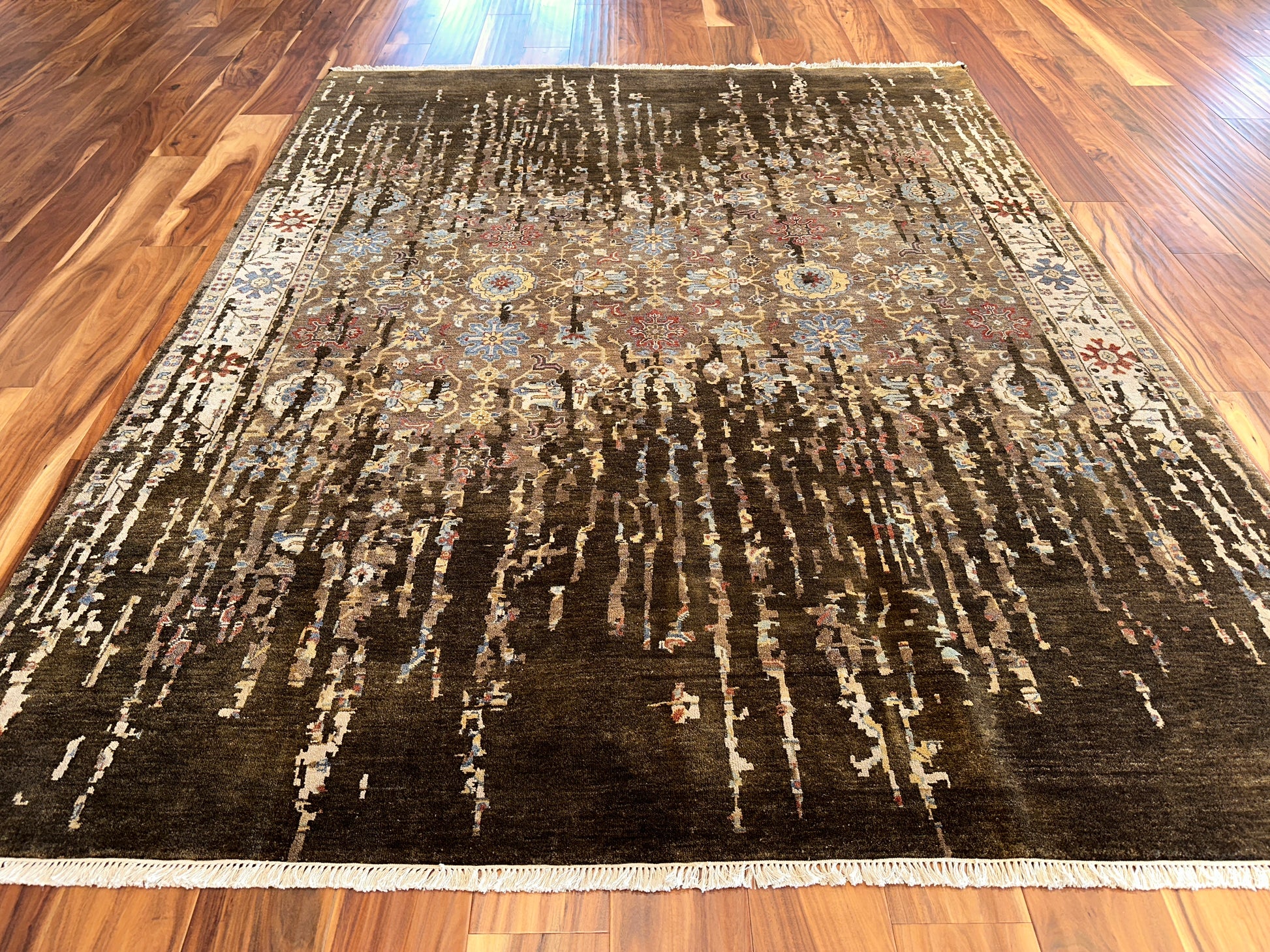 With its artful deconstruction of a traditional floral medallion pattern, this rug evokes the feeling of an ancient textile slowly dissolving into a soft, earthen mist. Muted golds, faded reds, and powder blues emerge gently through a rich field of olive brown, creating a layered composition that feels both aged and avant-garde. It adds soulful warmth to rooms that blend old and new.