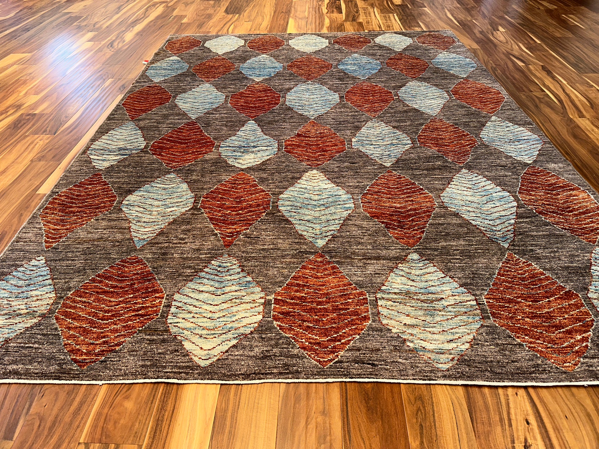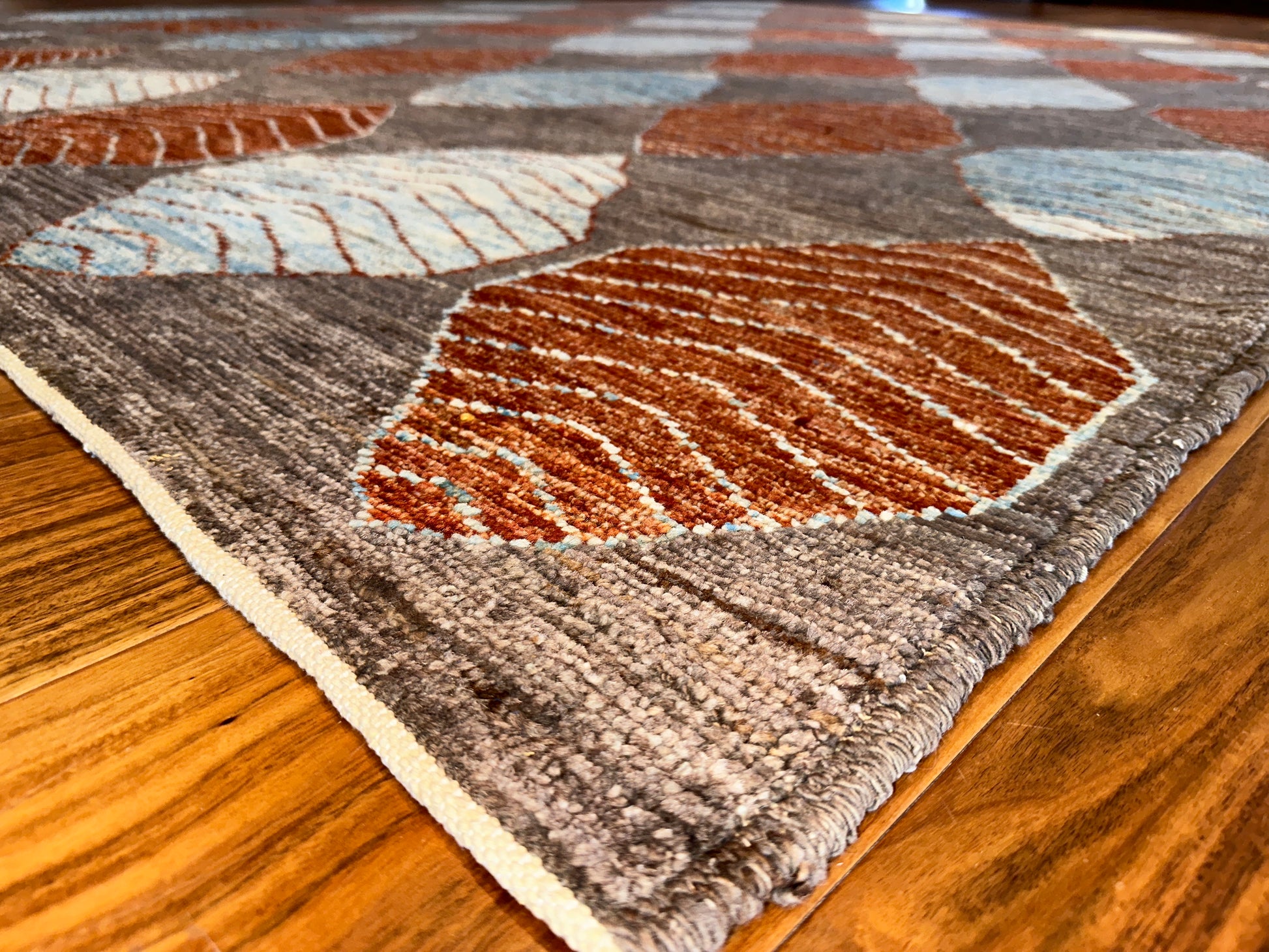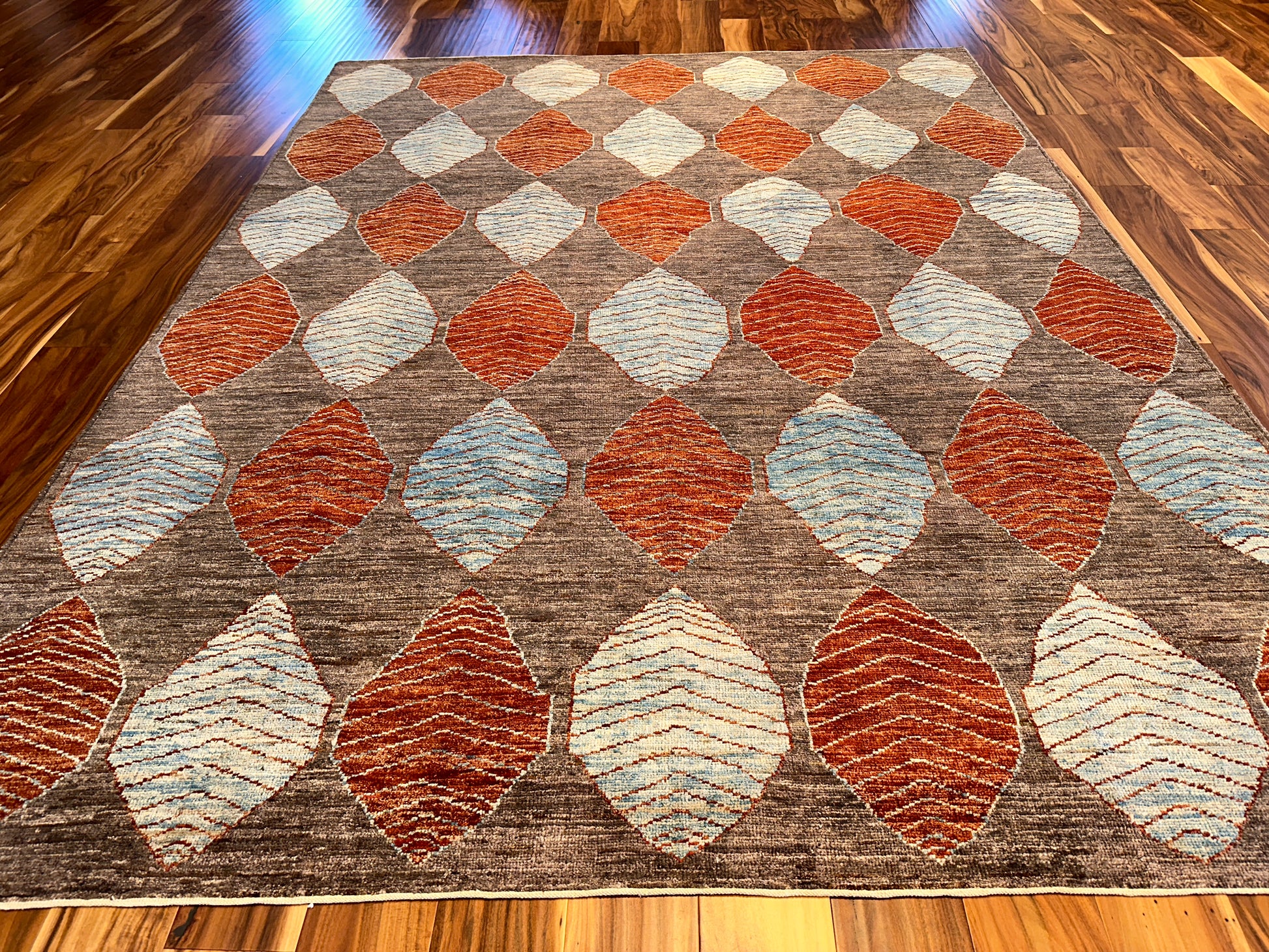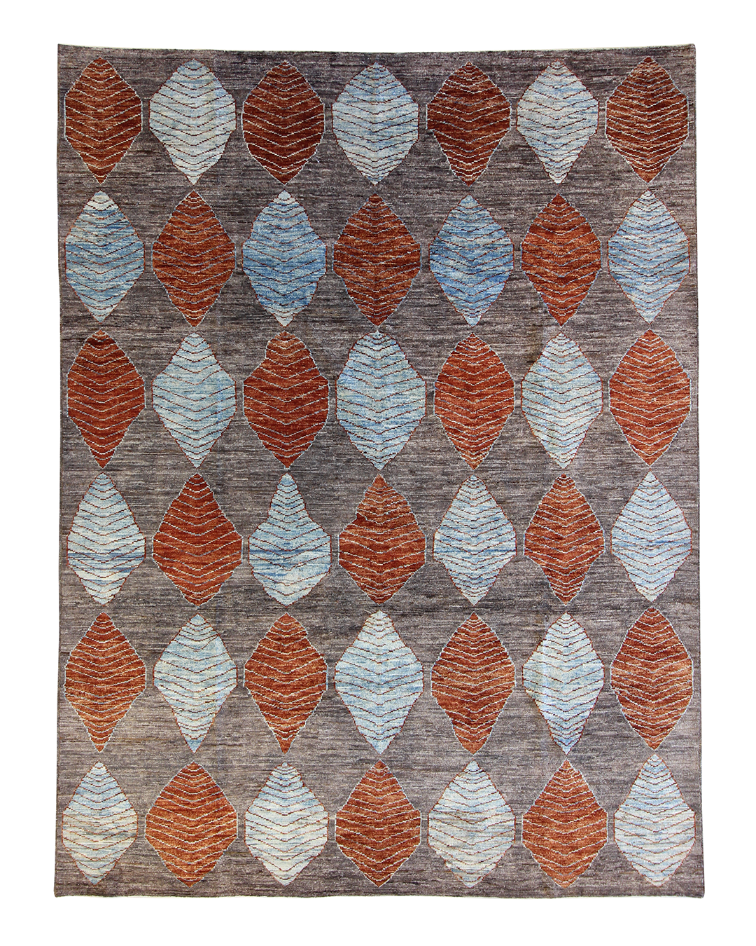 Bold and sculptural, this Moroccan-style rug makes a confident statement with its rhythmic pattern of alternating leaf-like medallions. Rich rust and soft blue motifs sit atop a smoky gray background, each shape subtly textured with fine linear detailing. It’s a perfect blend of symmetry and softness, ideal for anchoring contemporary spaces with a sense of grounded elegance.